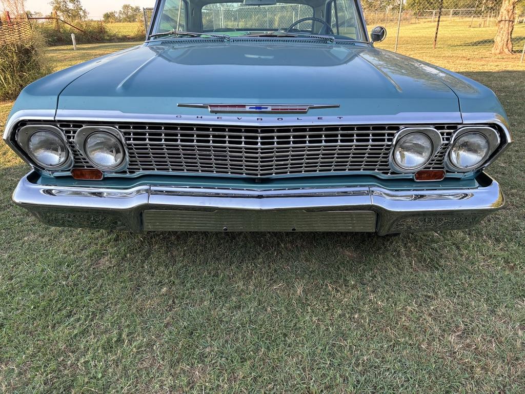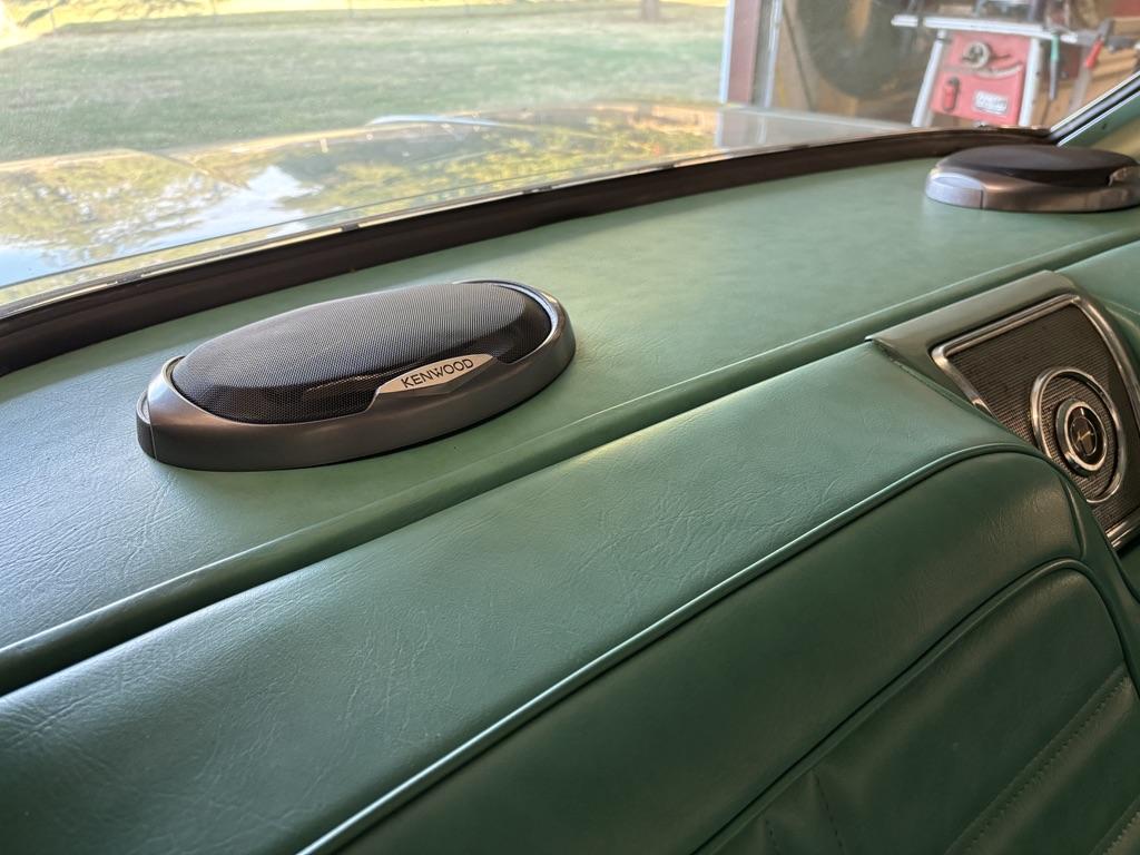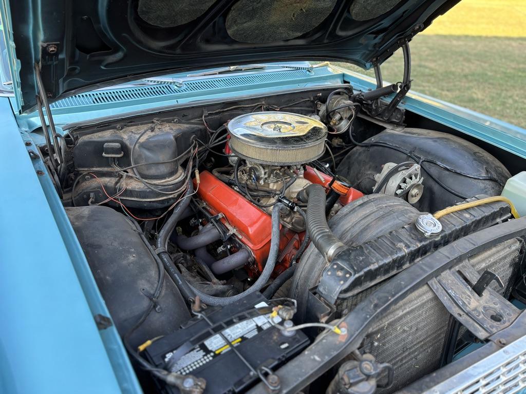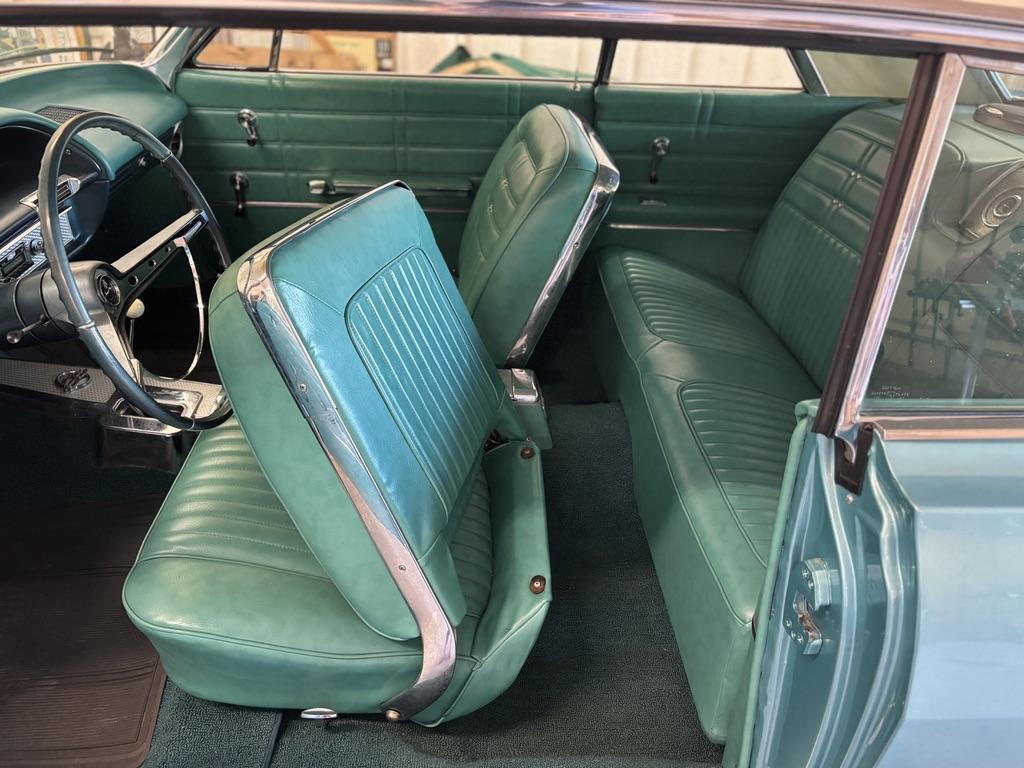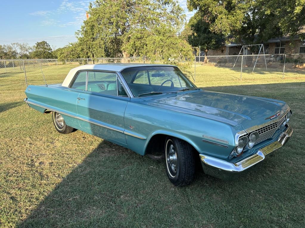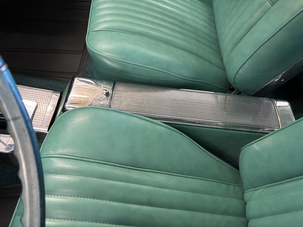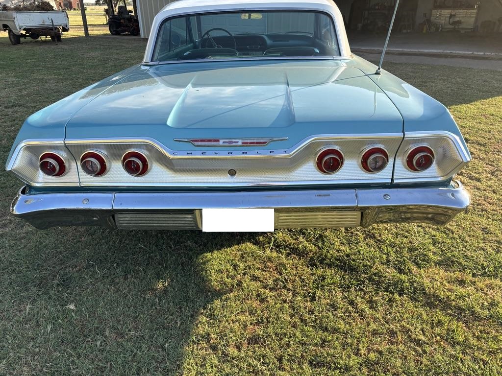 This 1963 Chevrolet Impala SS Sport Coupe was fitted with a replacement 327ci V8 and work since has involved overhauling the two-speed Powerglide automatic transmission and repainting the car in aqua with a white roof. A revised camshaft, MSD ignition, and an Edelbrock carburetor and intake manifold are installed. The car rides on 14″ wheels with triple-finned covers and has power steering, front bucket seats trimmed in aqua, and a retro-look head unit linked to Kenwood speakers.
