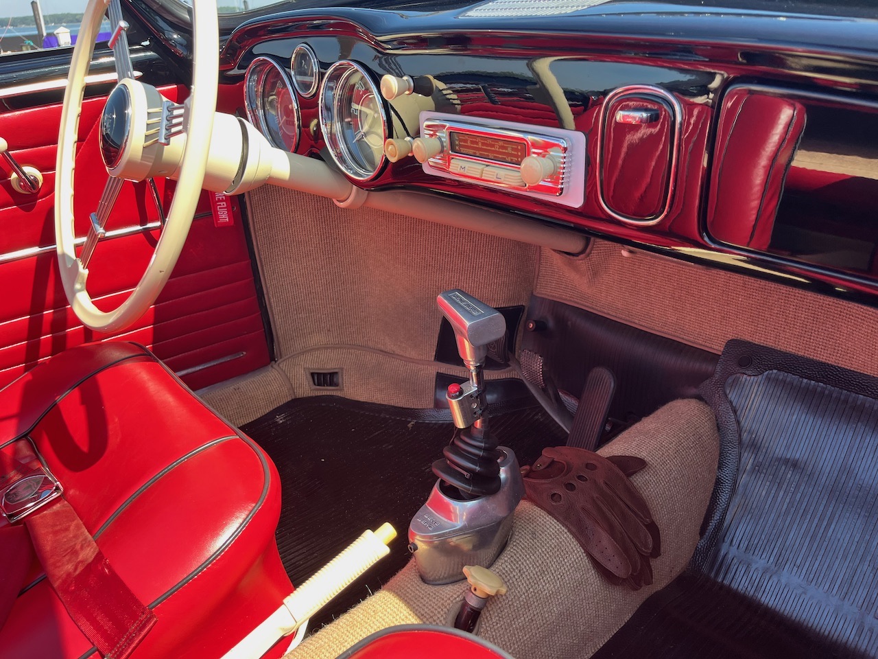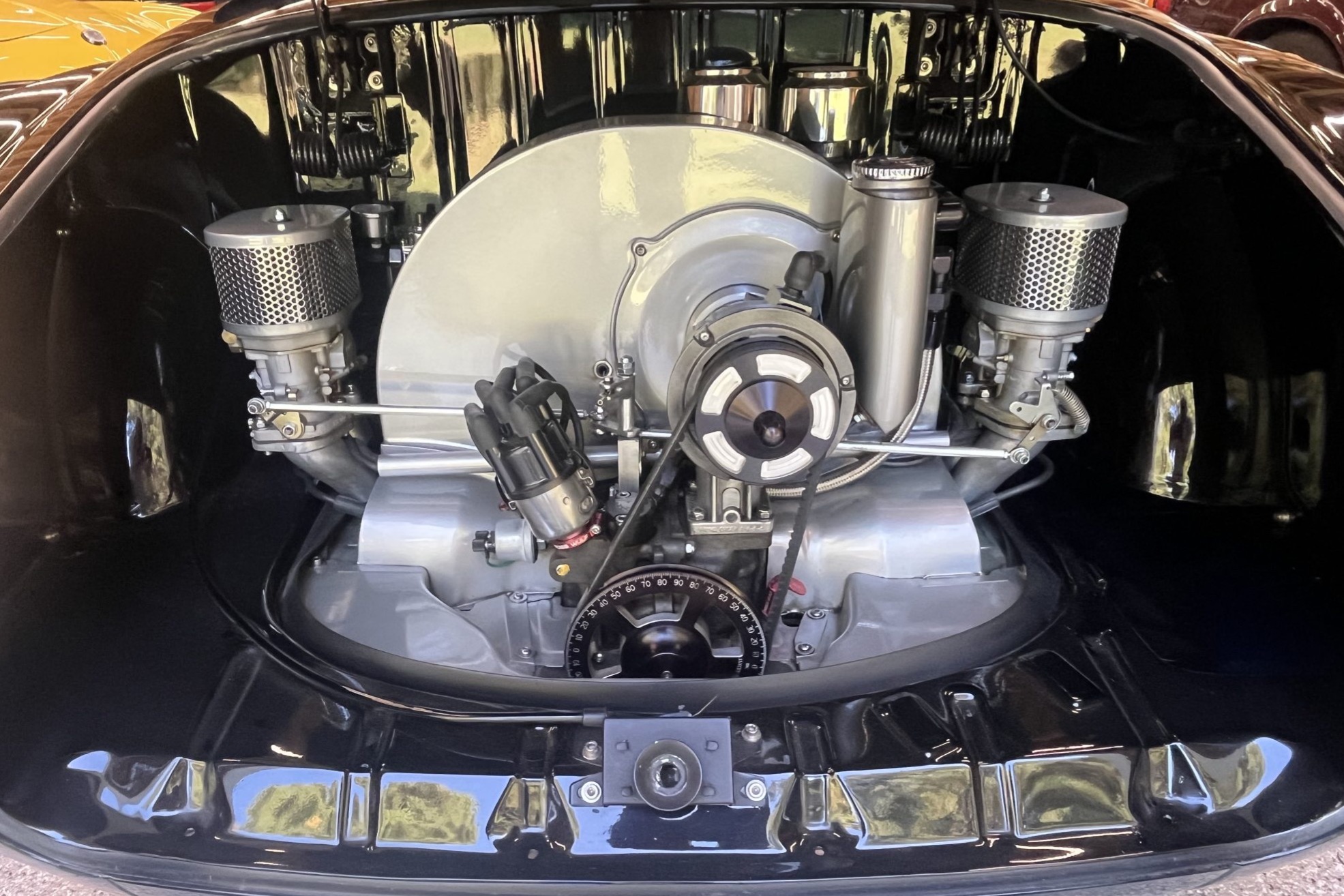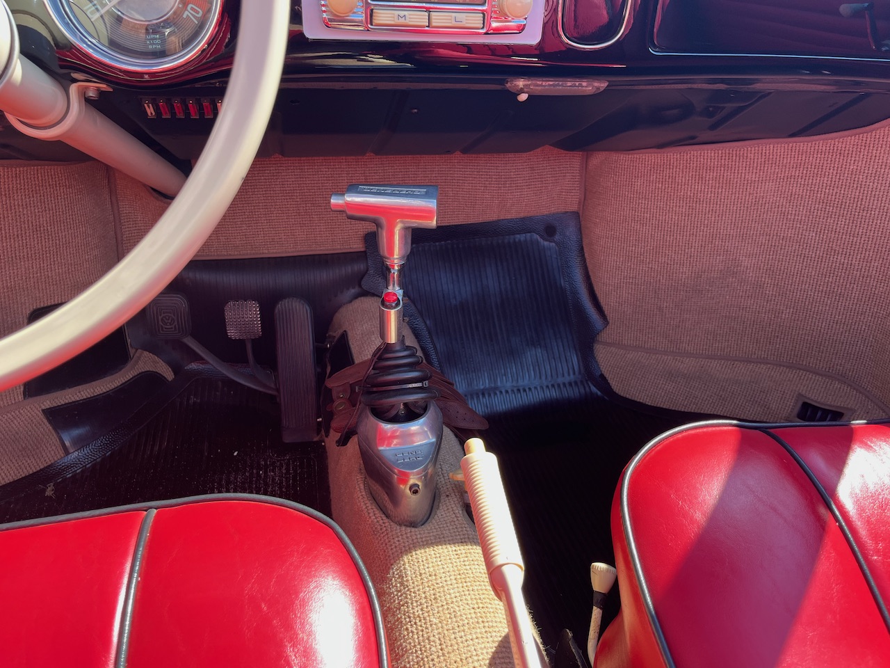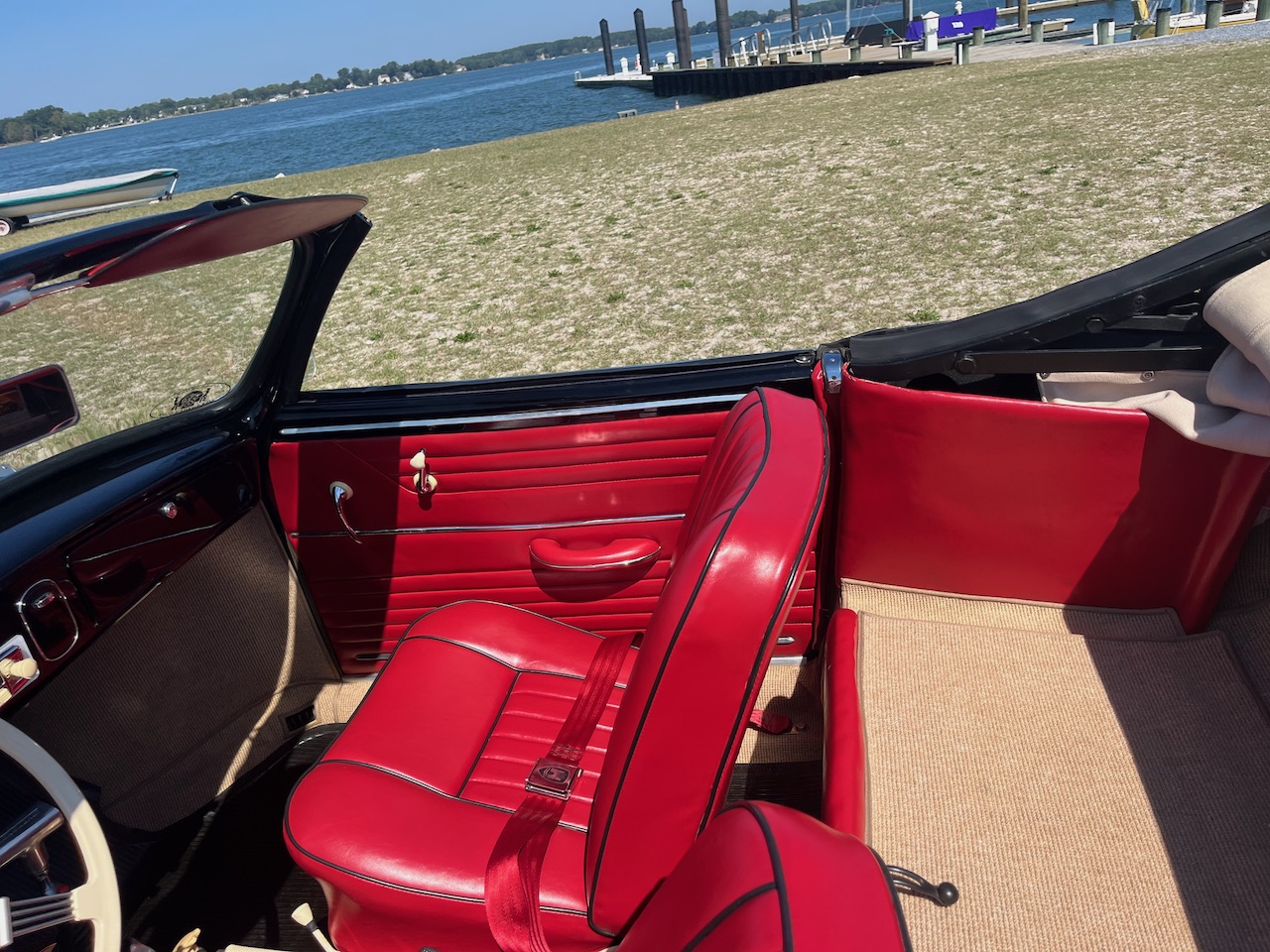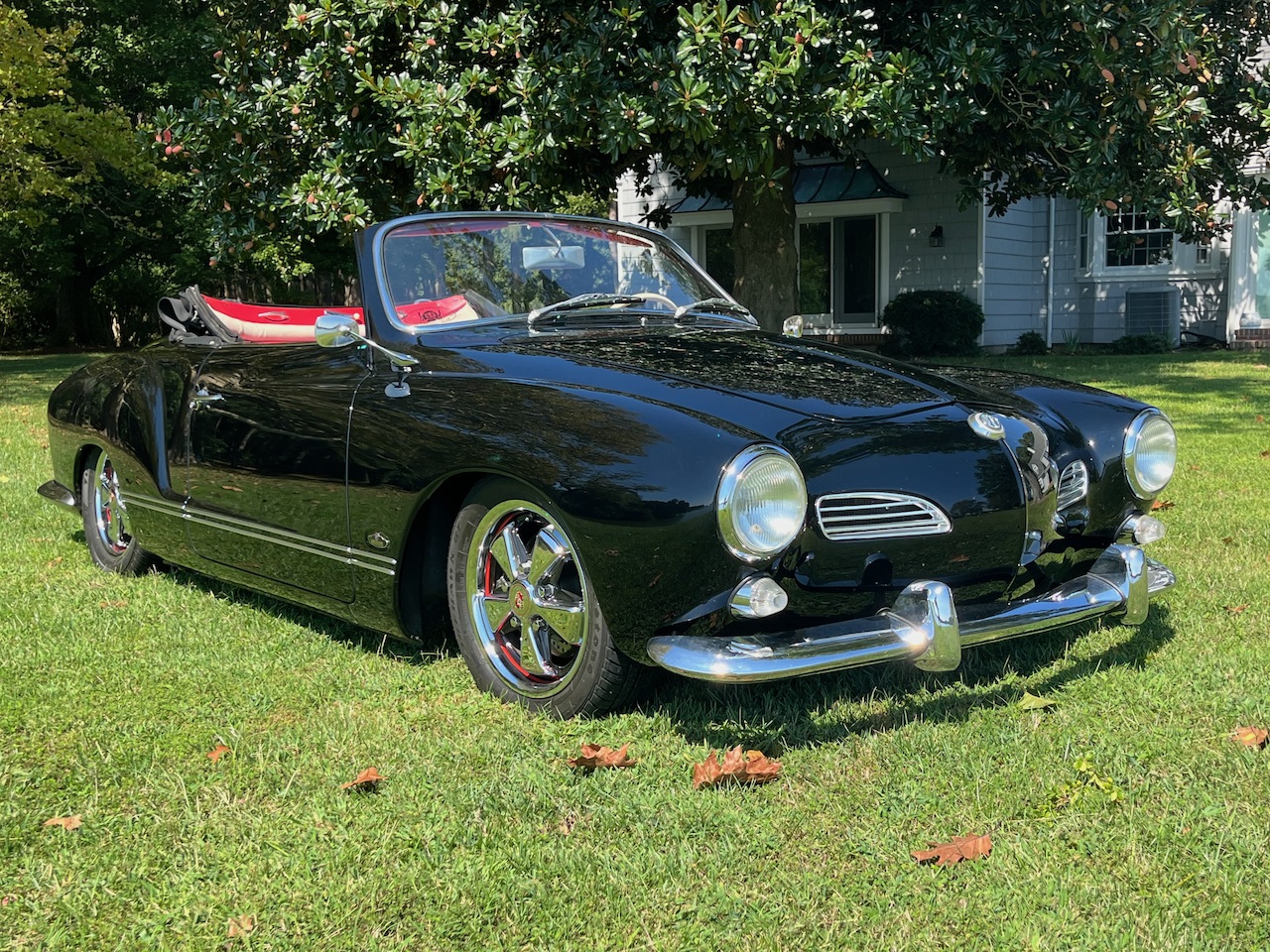 This 1963 Volkswagen Karmann Ghia convertible was refurbished and modified and work included the installation of an air-cooled 1,914cc flat-four equipped with Clyde Berg cylinder heads, an Engle camshaft, and an A-1 sidewinder exhaust system. The car is finished in black with a black soft top over red vinyl upholstery and is equipped with a four-speed manual transaxle, 15″ Fuchs-style wheels, four-wheel disc brakes, a two-inch narrowed axle beam, a Gene Berg shifter, a 12-volt electrical system, dual EMPI carburetors, a banjo-style steering wheel, and heated front seats.