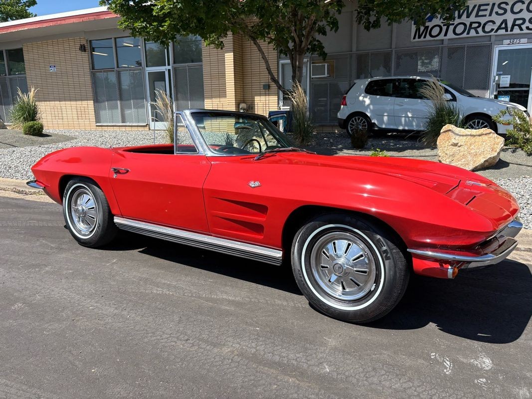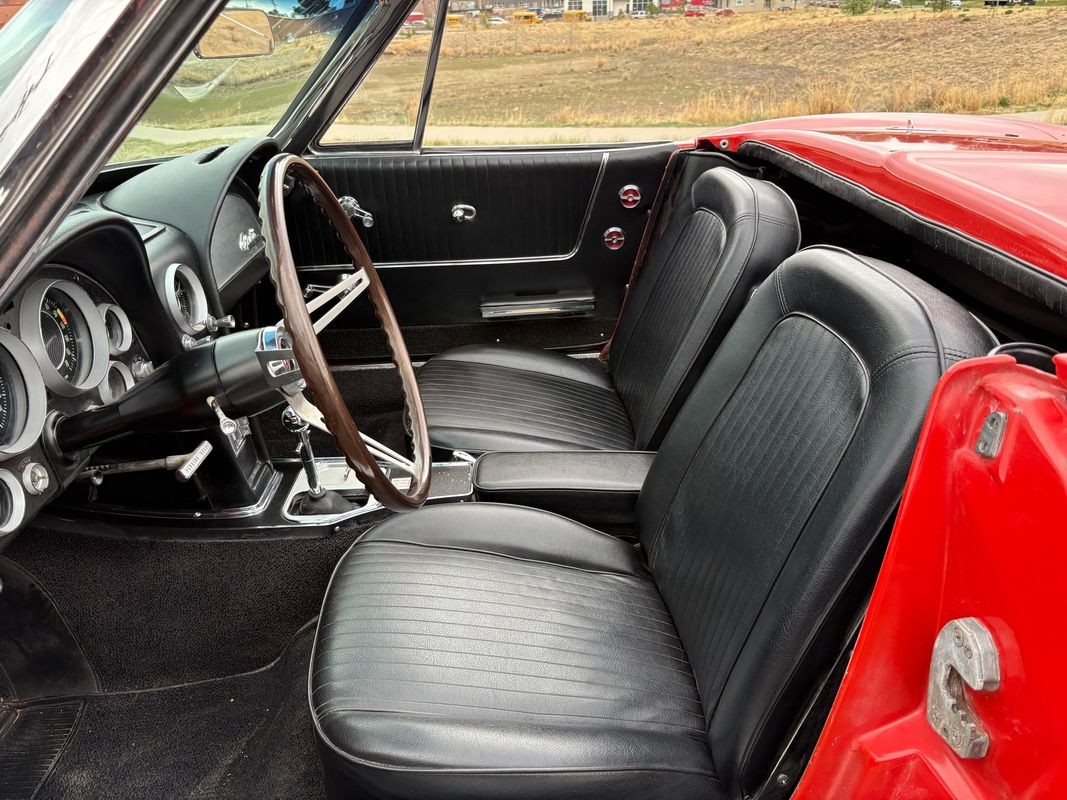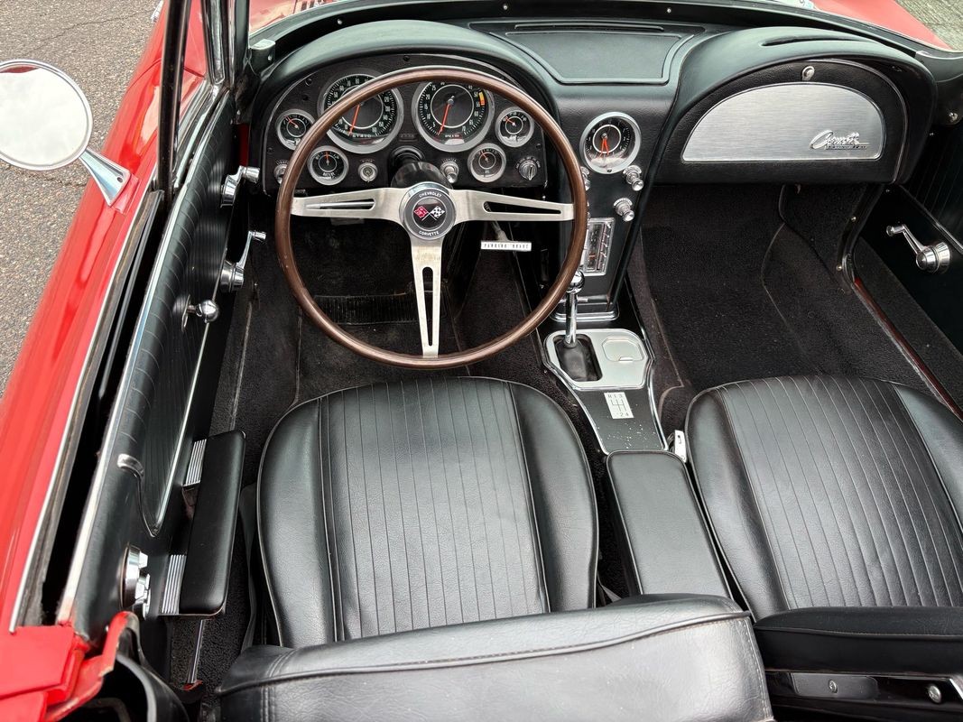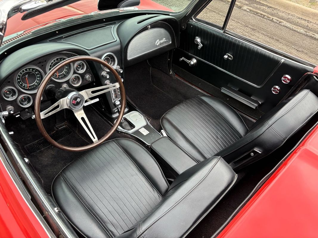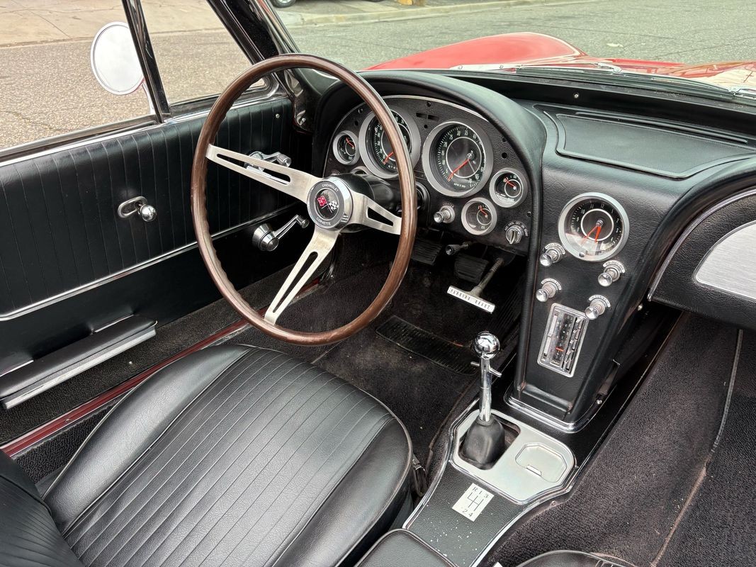 1964 Chevrolet Corvette convertible finished inrally red exterior over a black soft top with black leather interior. This Corvette is equipped with the numbers matching 327CI 300HP V8 with a 4-speed manual gear box. The black soft top looks to have been recently replaced as the plastic back window is in very nice condition. The interior is finished in black with black carpeting and is in very nice.