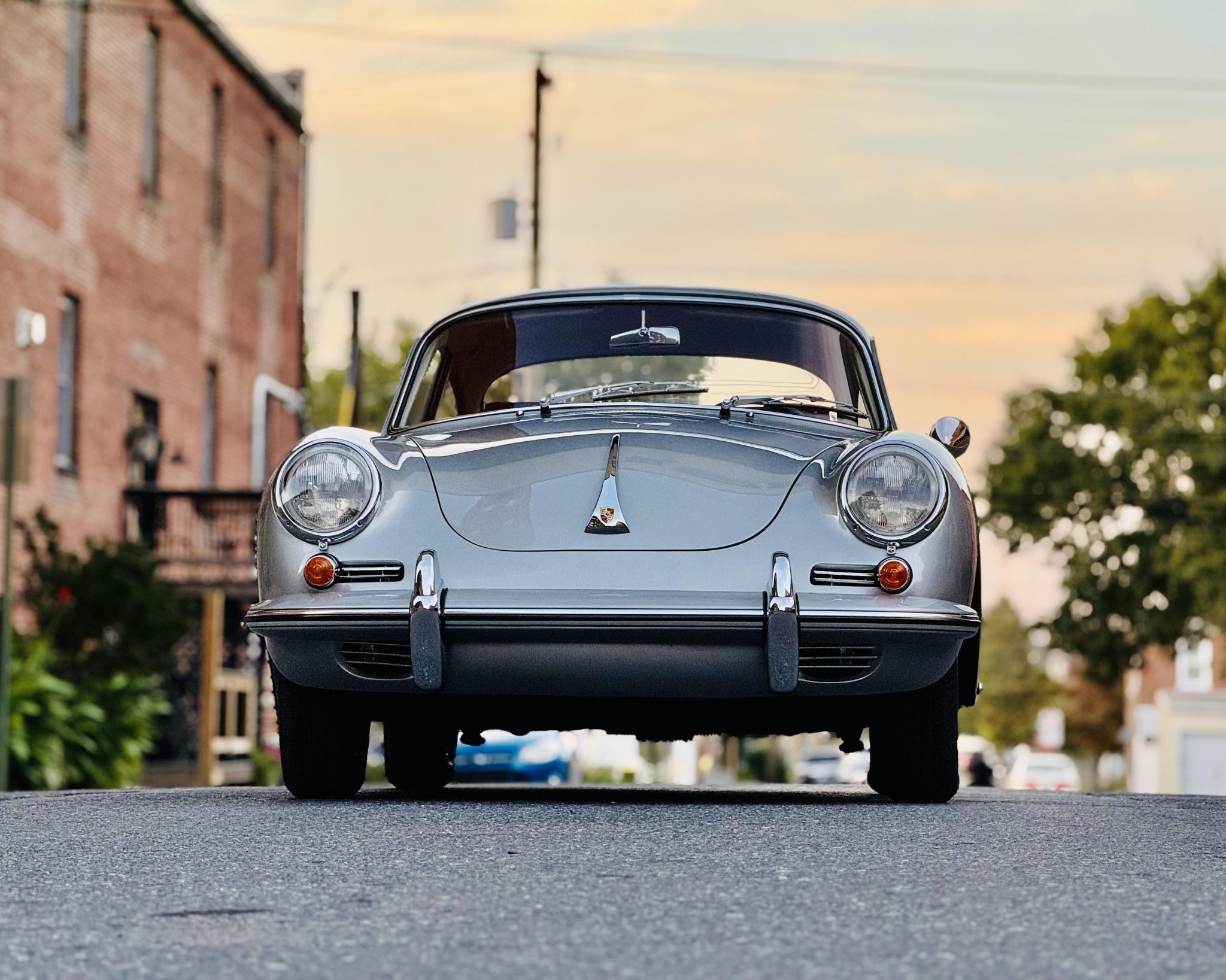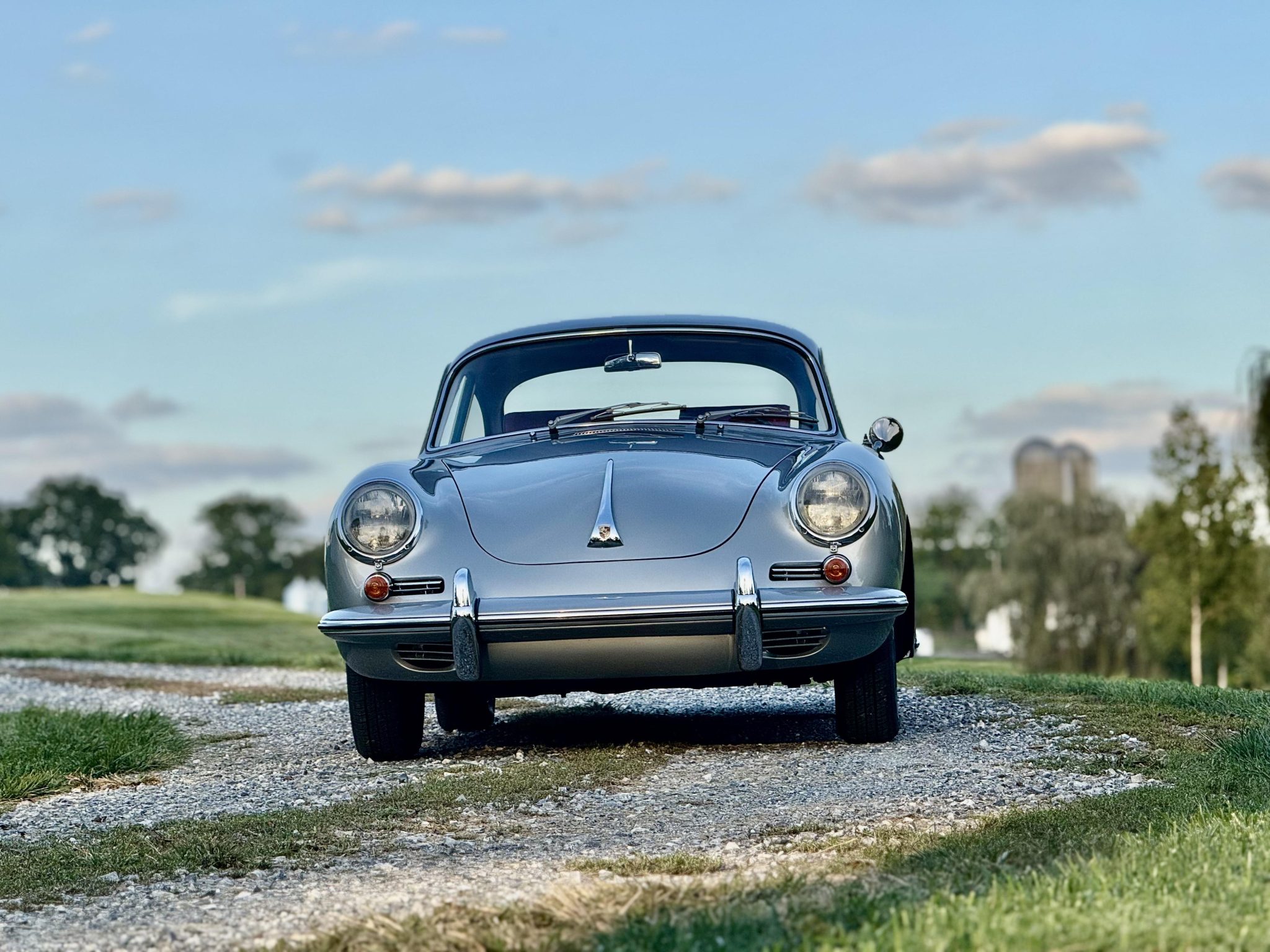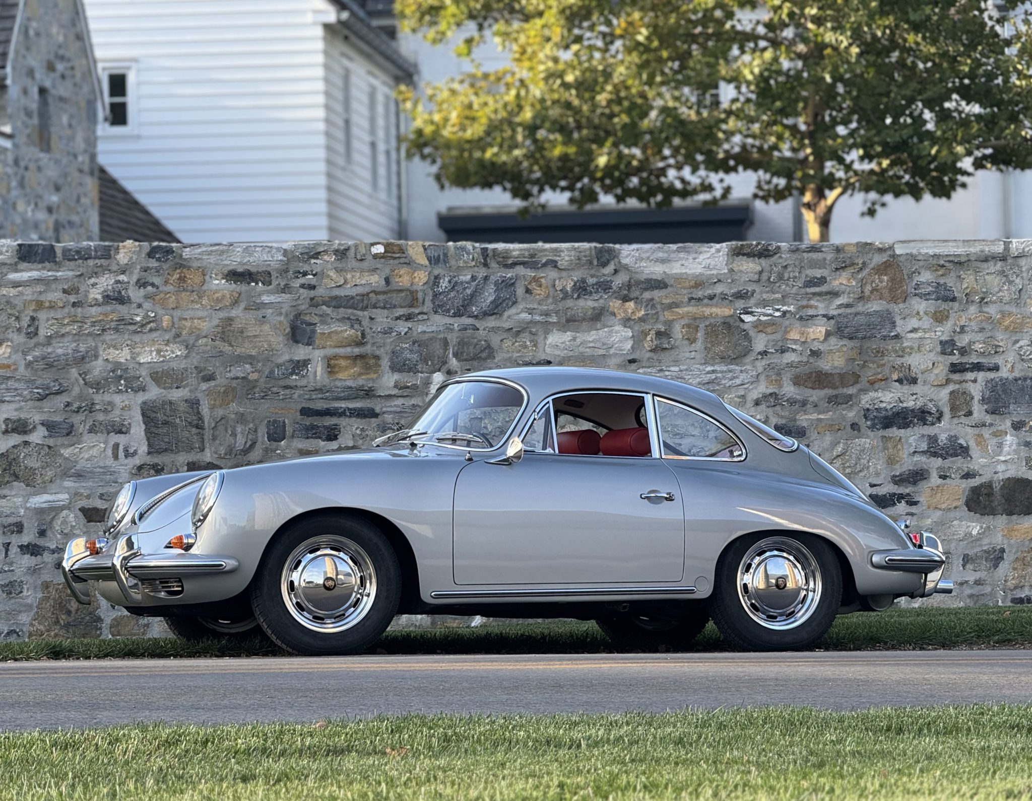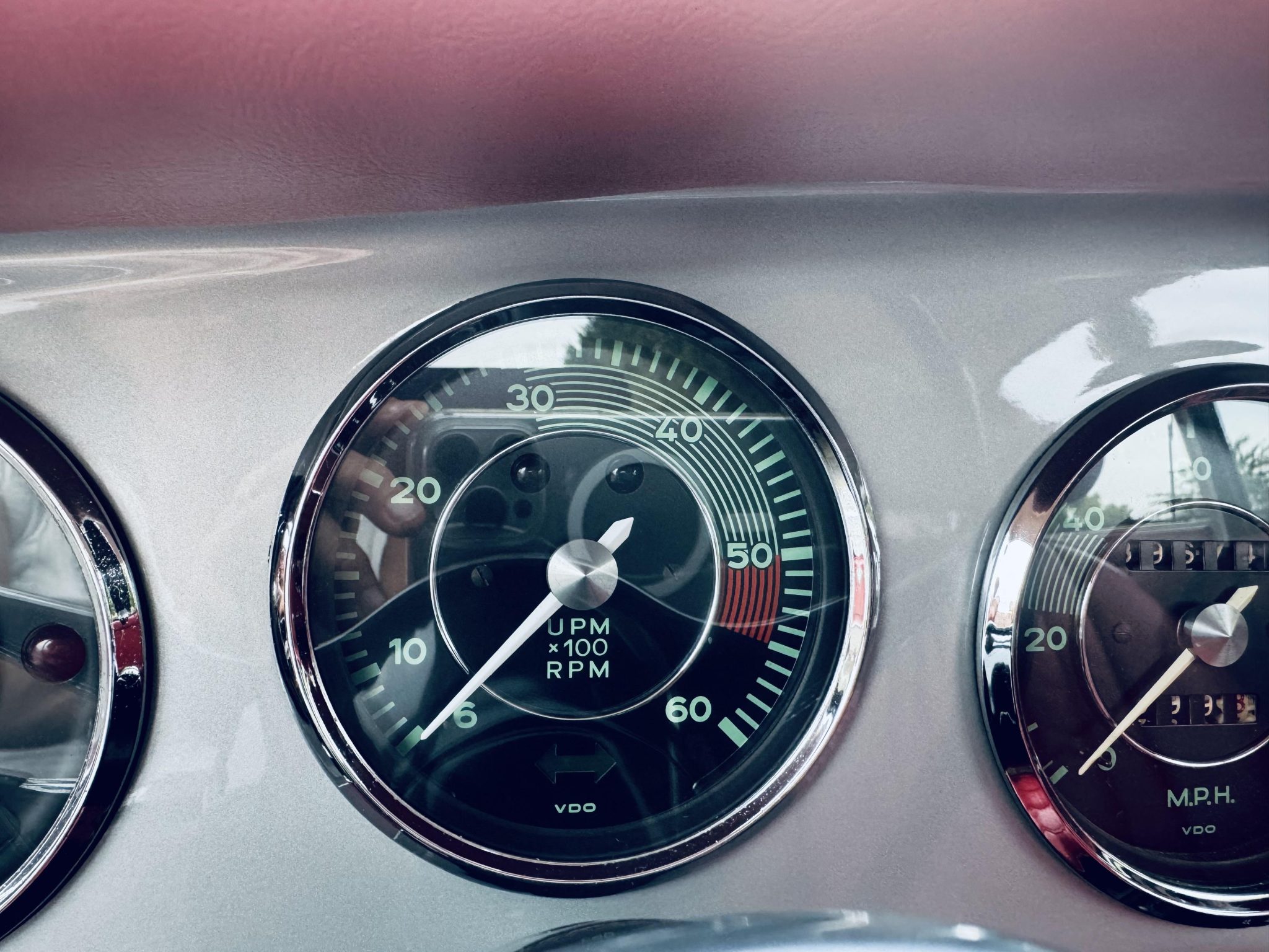repainted in Silver Metallic during a refurbishment in the mid-2000s. The car is powered by a replacement 1.6-liter flat-four paired with a four-speed manual transaxle, and features include red leather upholstery, 15″ steel wheels, disc brakes, body-color bumpers, twin engine grilles, front bucket seats, an AM/FM radio, and an analog clock.