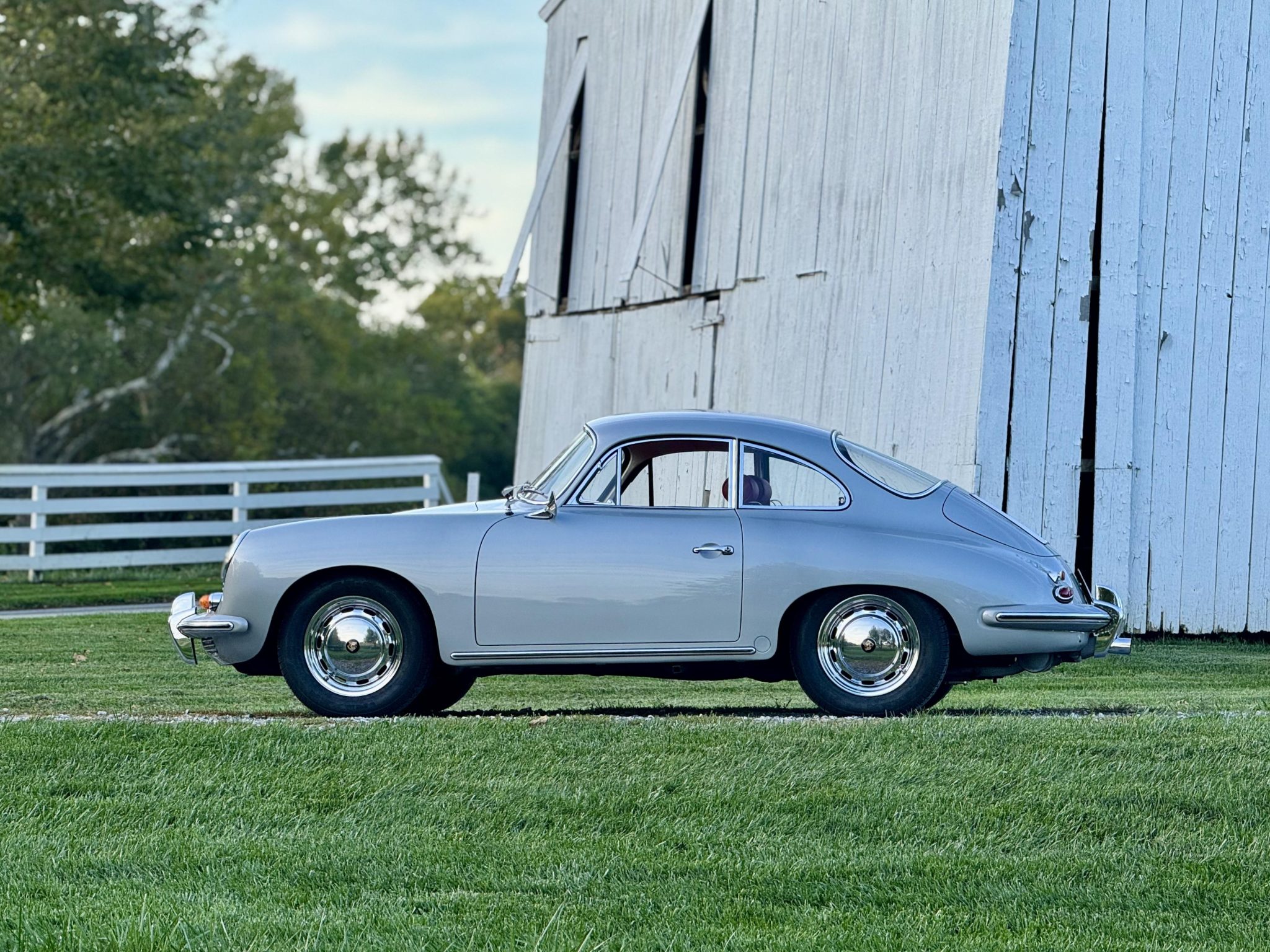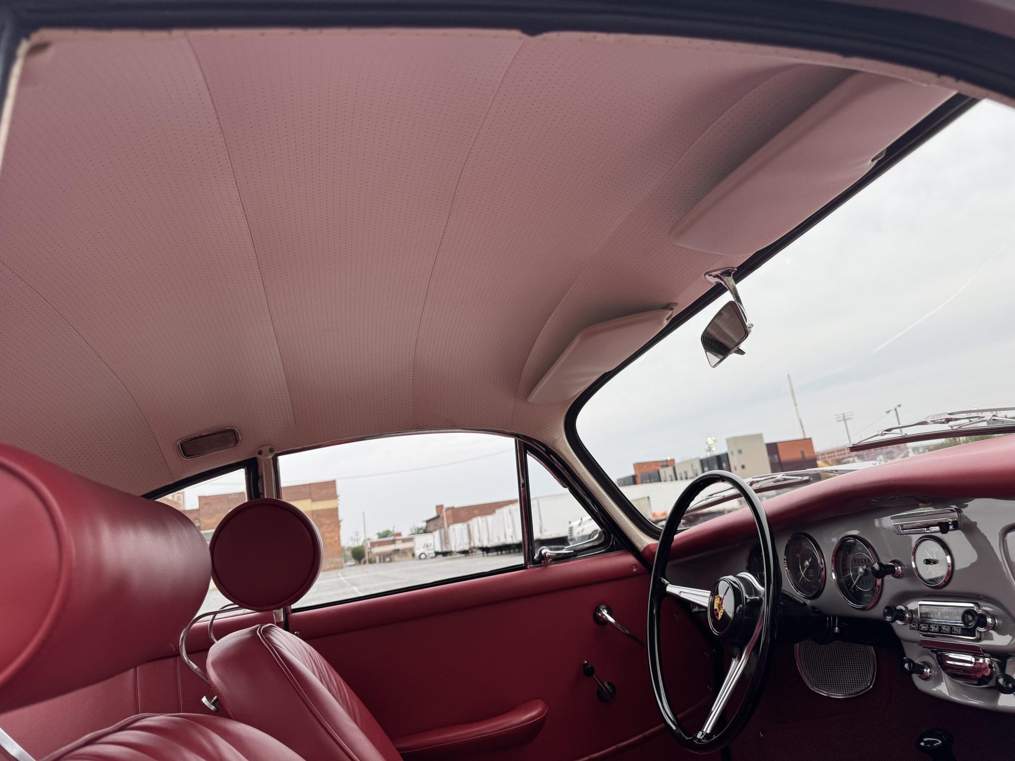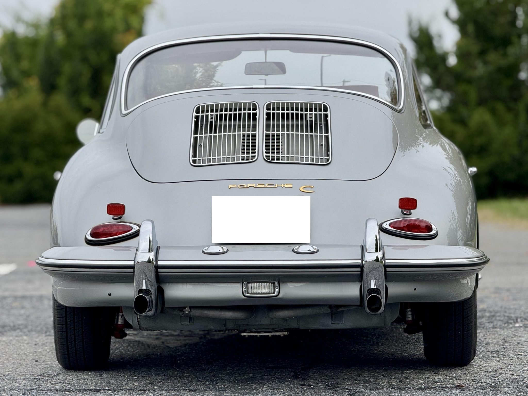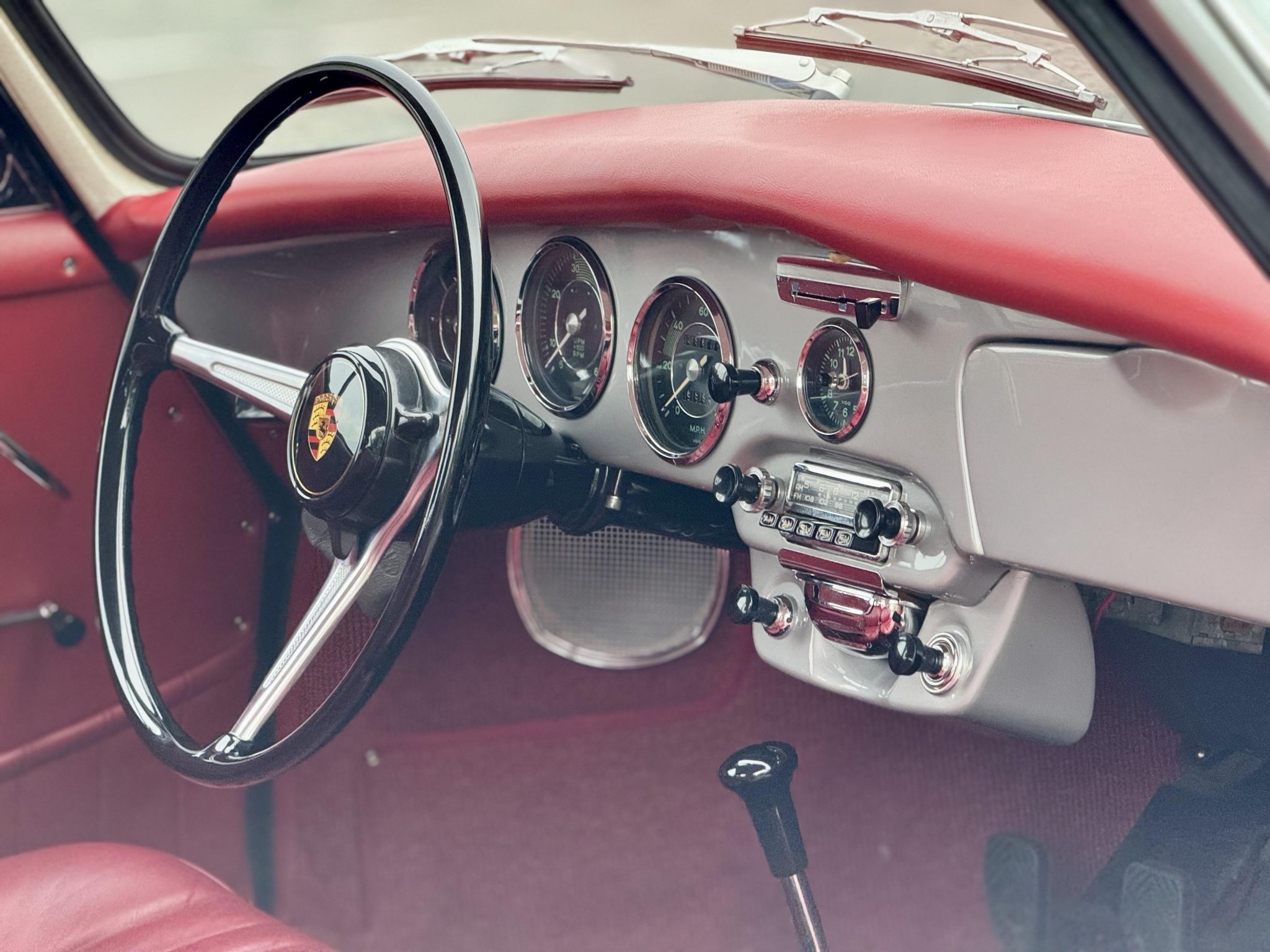 repainted in Silver Metallic during a refurbishment in the mid-2000s. The car is powered by a replacement 1.6-liter flat-four paired with a four-speed manual transaxle, and features include red leather upholstery, 15″ steel wheels, disc brakes, body-color bumpers, twin engine grilles, front bucket seats, an AM/FM radio, and an analog clock.