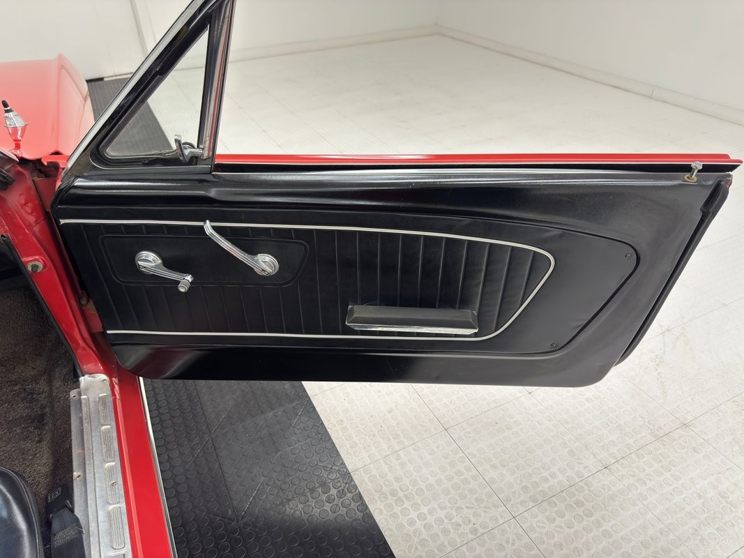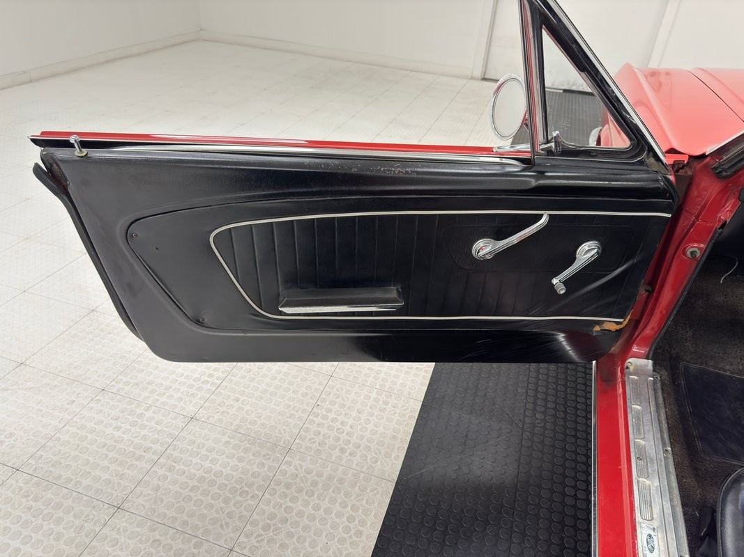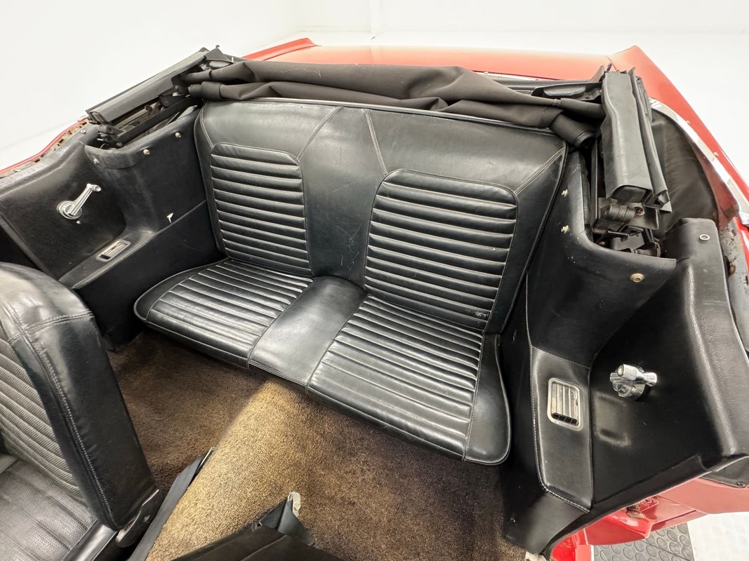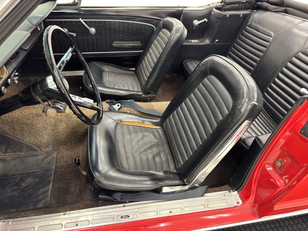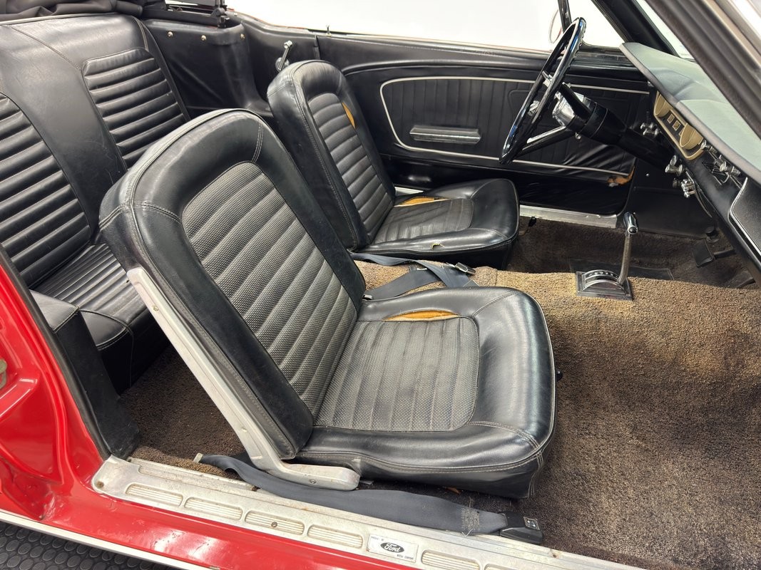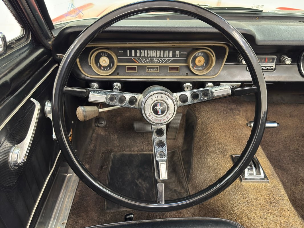 Rangoon Red paint drapes the straight steel panels of this car with plenty of polished single stage shine still reflecting our indoor lights. A black pinstripe accents the side panels, bordering the infamous Mustang body line, here with no ornamental duct at the rear. Up front, flanking the galloping Mustang badge are the single headlights in the faux vented inserts. Decklid gaps are well minded and the rear fascia with its distinctive tail lights lacks reverse lights in the smooth roll pan under the chrome bumper. With shiny standard issues 14-inch Under the hood we see an original looking, driver quality 200ci inline 6 cylinder topped by a 1-barrel carburetor and rated at 120 horsepower. On back is a C4 3-speed automatic transmission which sends power to a 7.25" rear axle wrapping 3.20 gears.