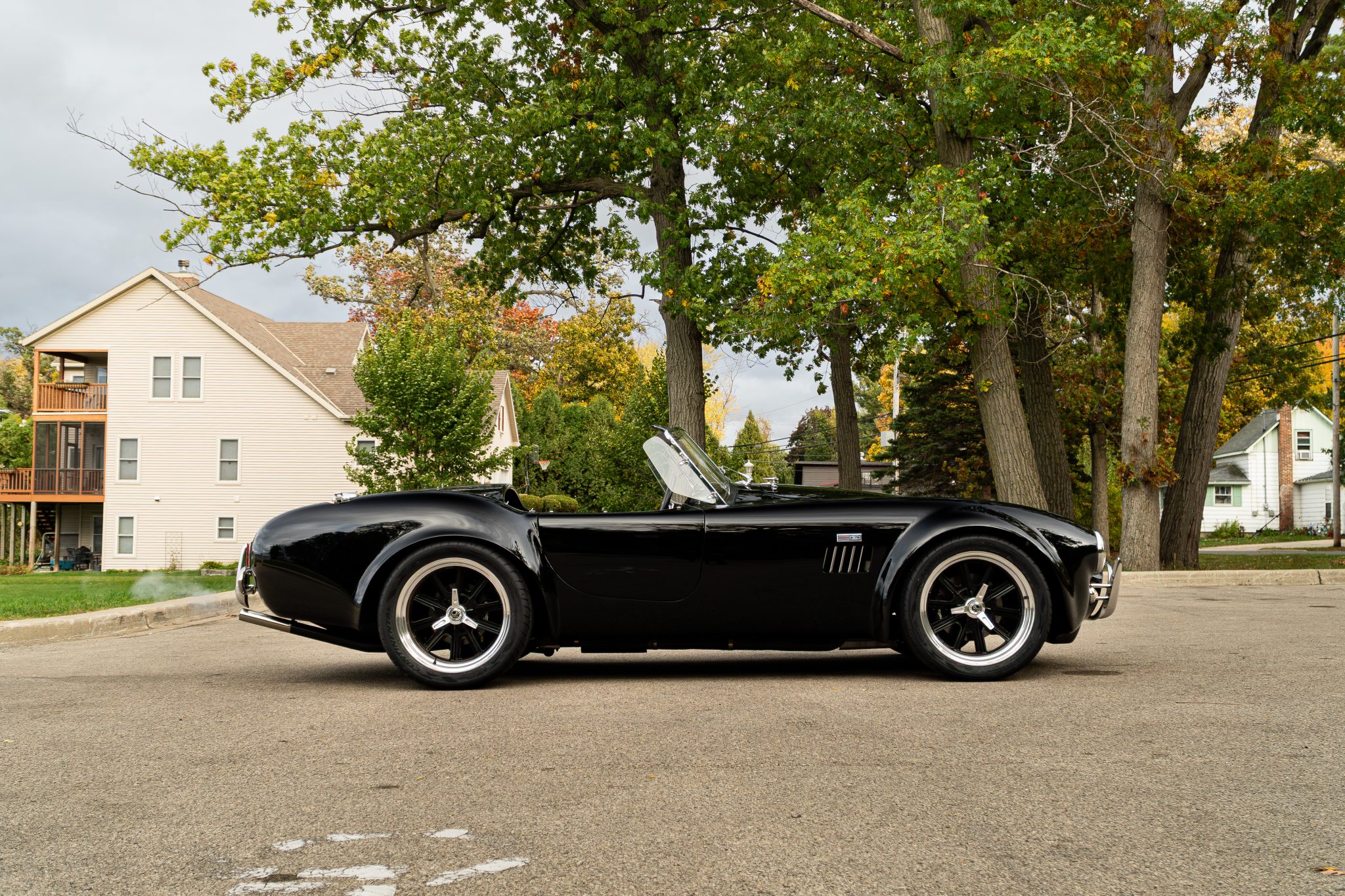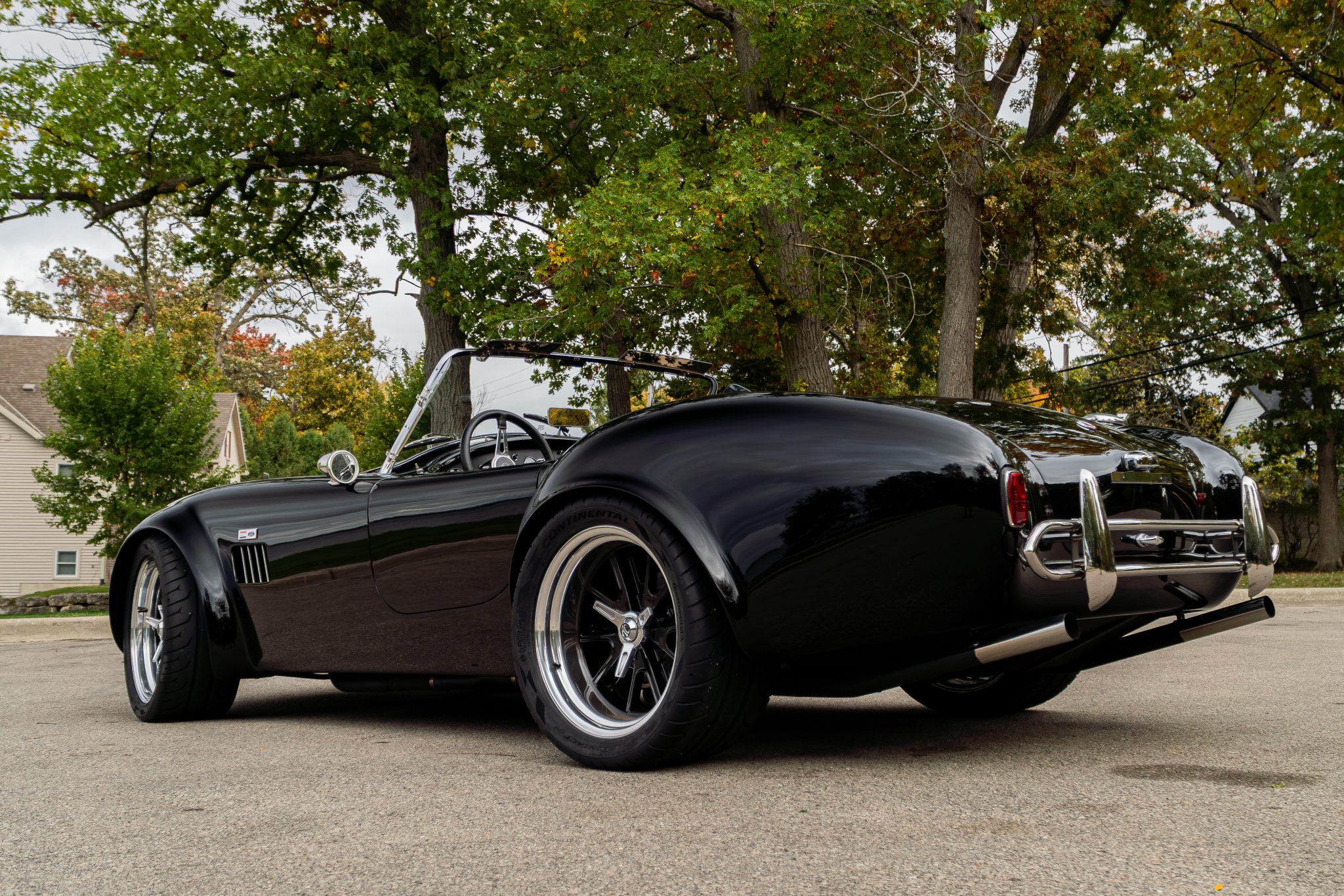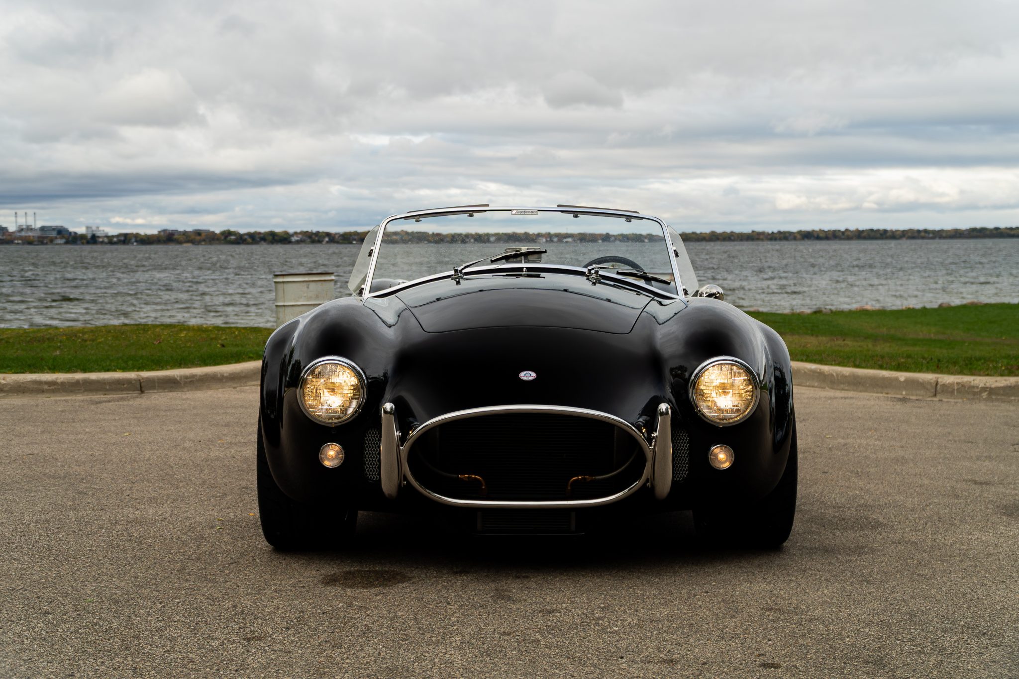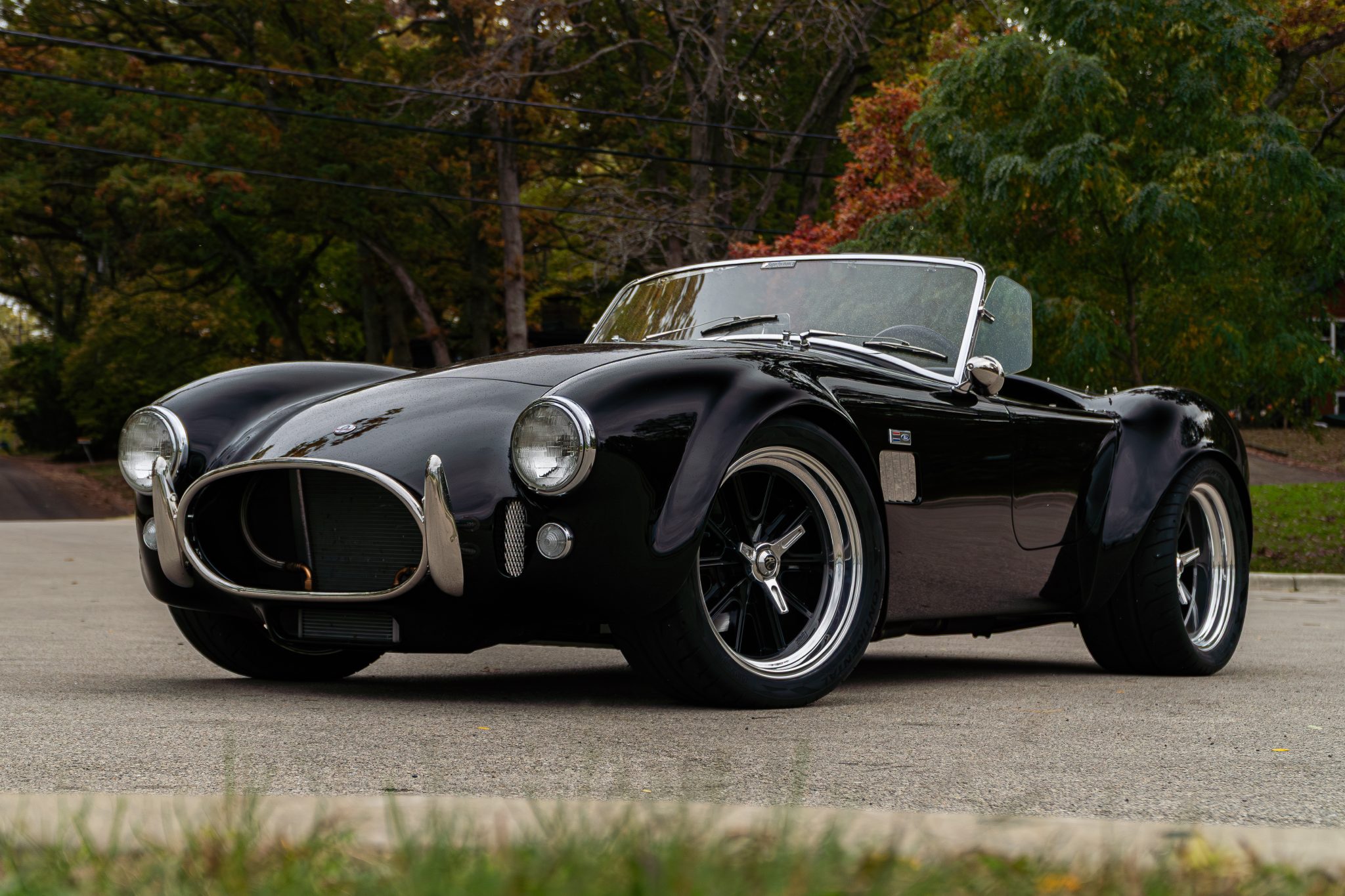 This Superformance MKIII is a black-over-black Cobra replica powered by a Roush 402SR V8 linked to a Tremec five-speed manual transmission. It has a four-wheel independent suspension, Wilwood brake calipers, and 18” Halibrand-style wheels along with a Holley carburetor and a dual exhaust system with tubular headers. Additional features include Roadster-style bumpers, translucent wind wings and sun visors, a three-spoke steering wheel, and low-back bucket seats with latch-and-link lap belts.