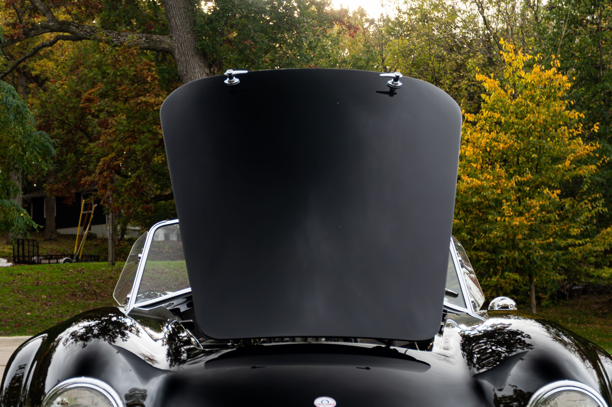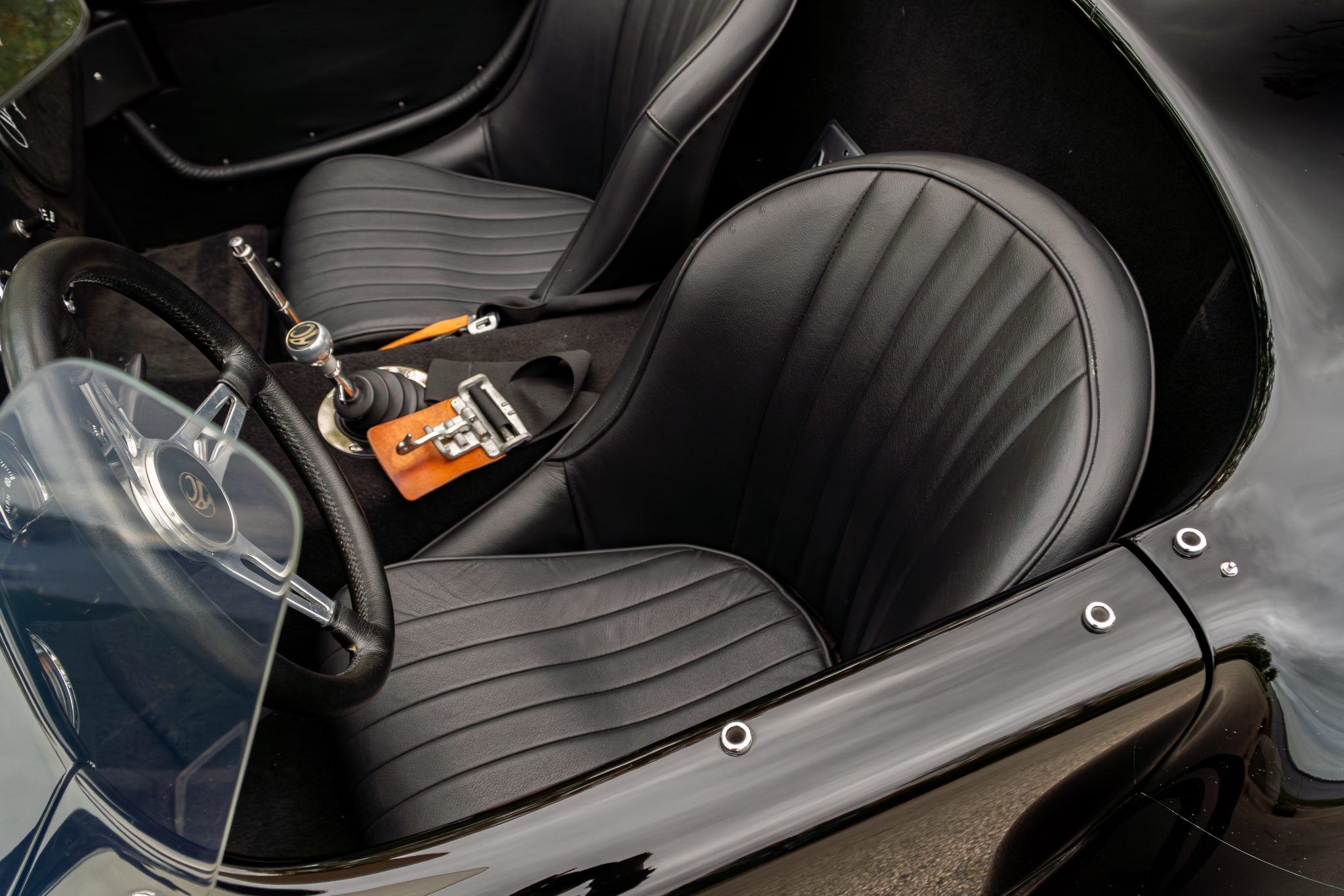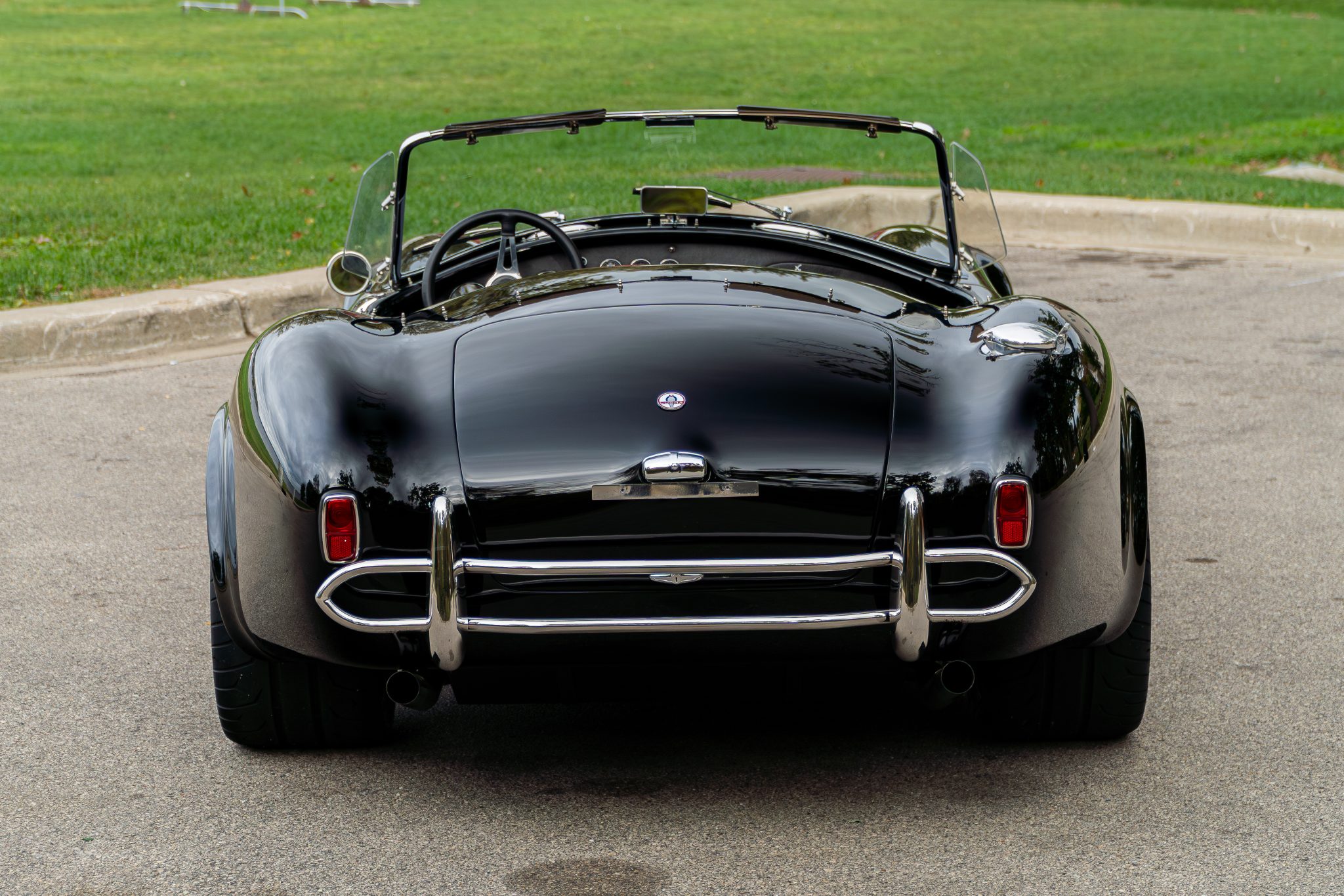 This Superformance MKIII is a black-over-black Cobra replica powered by a Roush 402SR V8 linked to a Tremec five-speed manual transmission. It has a four-wheel independent suspension, Wilwood brake calipers, and 18” Halibrand-style wheels along with a Holley carburetor and a dual exhaust system with tubular headers. Additional features include Roadster-style bumpers, translucent wind wings and sun visors, a three-spoke steering wheel, and low-back bucket seats with latch-and-link lap belts.