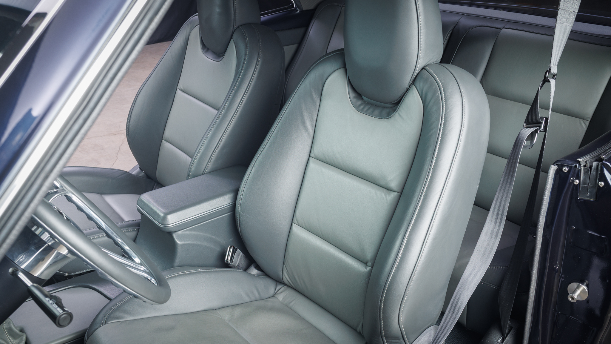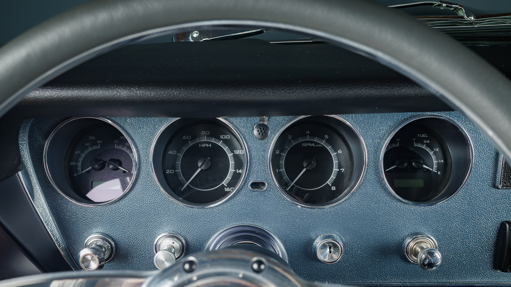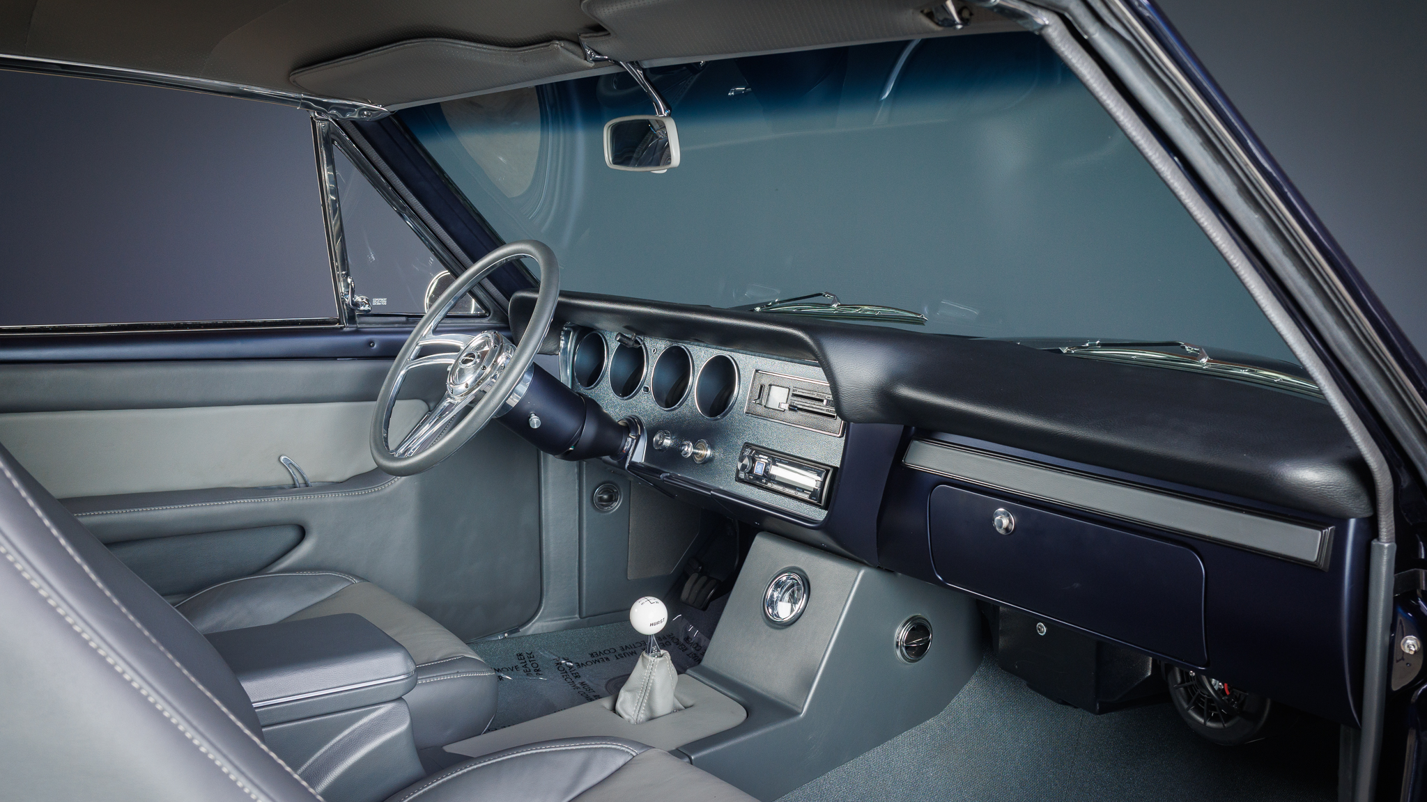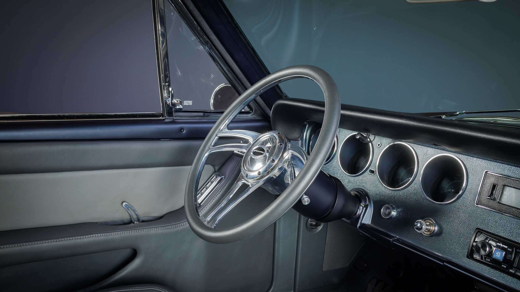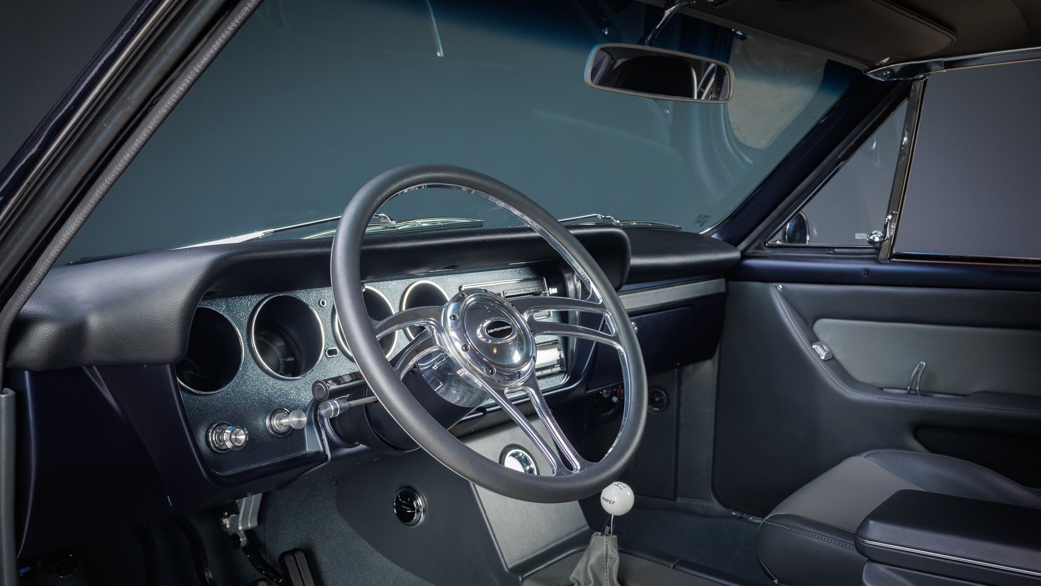 The bodywork is painted in a BMW shade of metallic blue and mounted to an Art Morrison chassis with adjustable coilovers, power rack-and-pinion steering, Wilwood four-wheel disc brakes, and a four-link rear suspension with a 9″ housing and a Yukon differential. Power is provided by a 6.2-liter LS3 V8 linked to a Tremec six-speed manual transmission, and additional equipment includes Holley EFI, a BeCool radiator, long-tube headers, an electronic parking brake, and 19″ American Racing wheels. Inside, the power front bucket seats are trimmed in gray leather and are joined by a color-keyed dashboard and carpets, air conditioning, power windows, a custom center console, and an Alpine head unit linked to JL Audio and Hertz components.