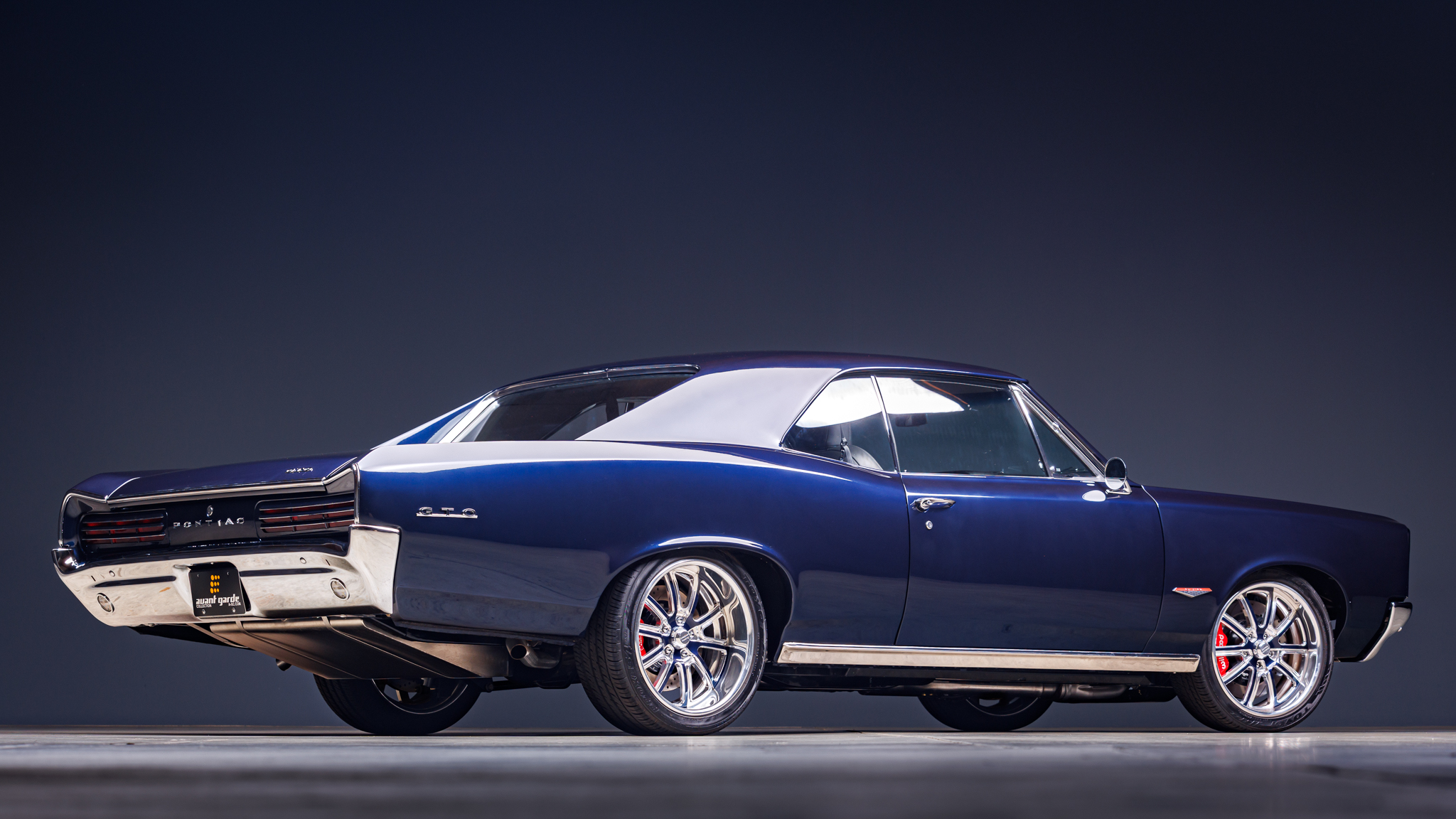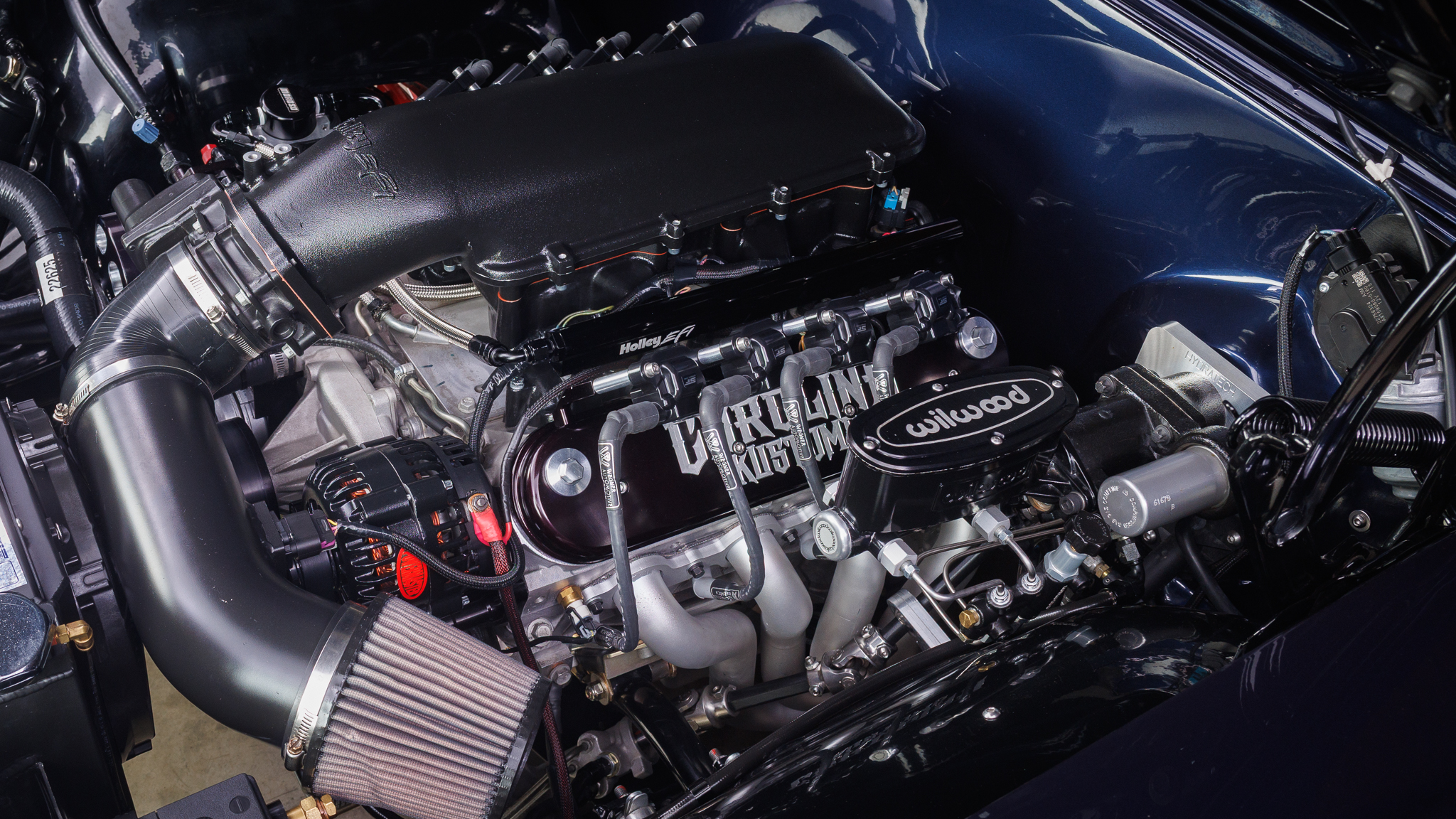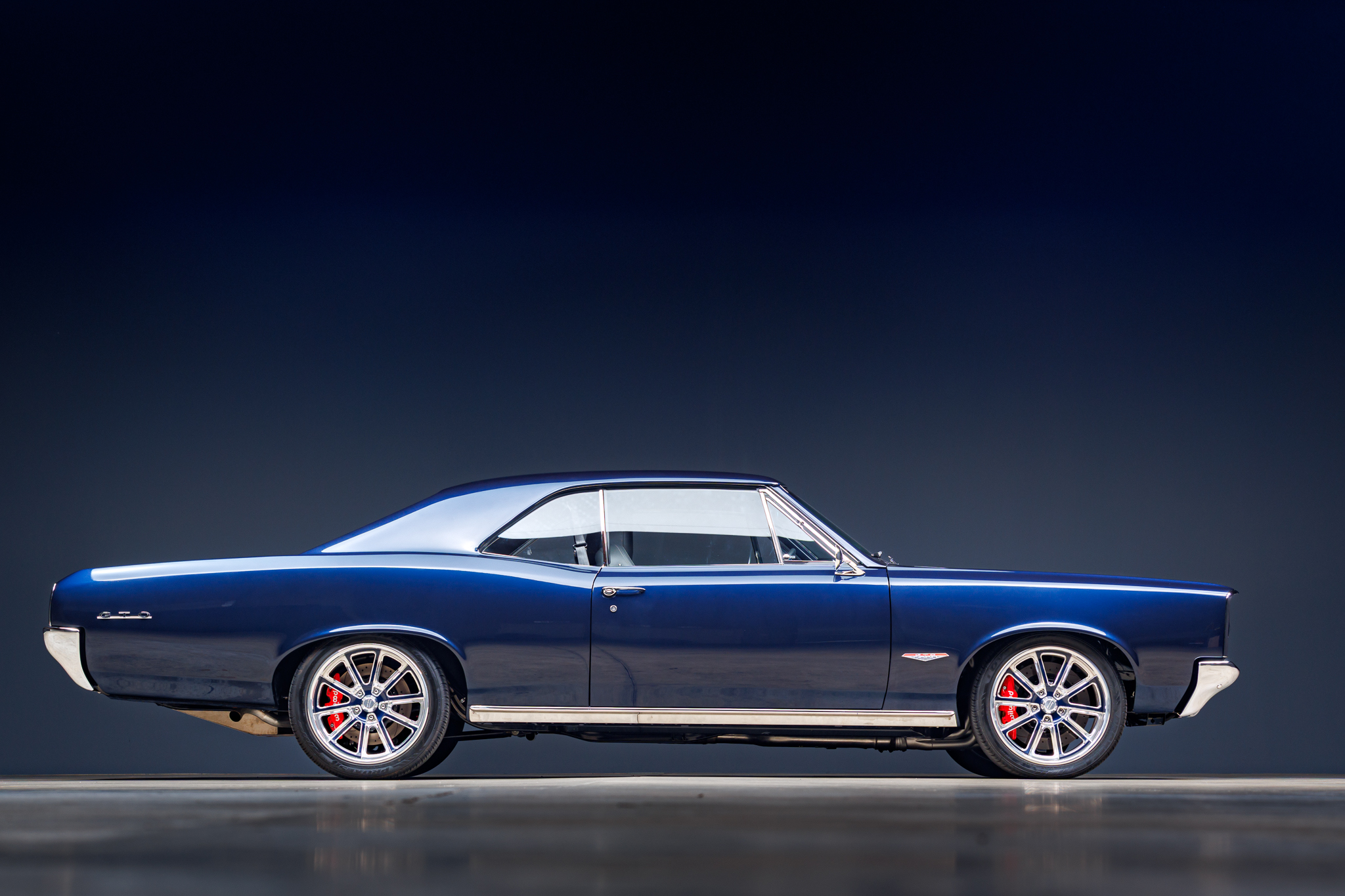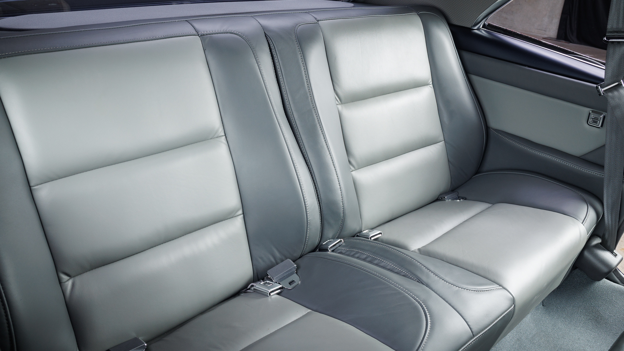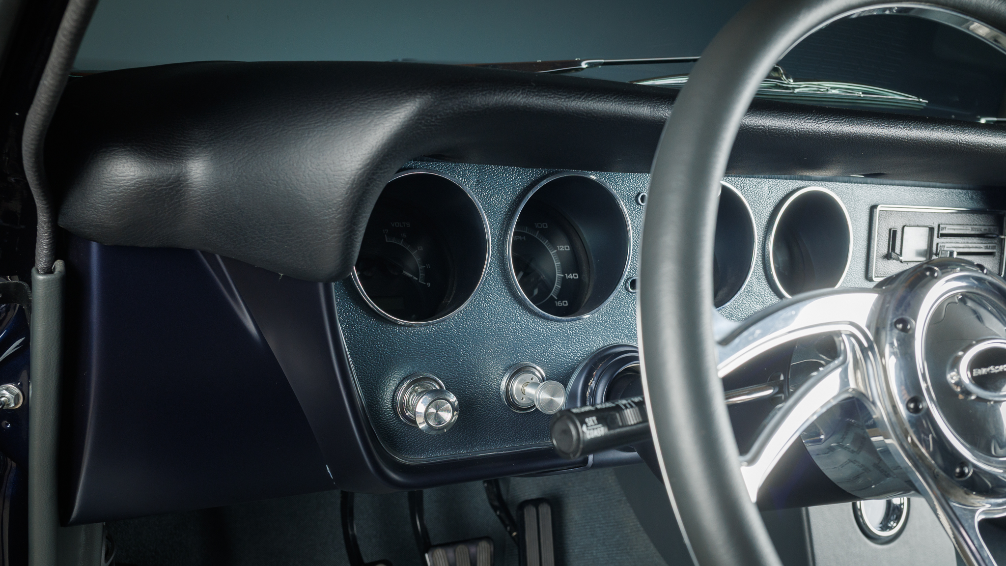 The bodywork is painted in a BMW shade of metallic blue and mounted to an Art Morrison chassis with adjustable coilovers, power rack-and-pinion steering, Wilwood four-wheel disc brakes, and a four-link rear suspension with a 9″ housing and a Yukon differential. Power is provided by a 6.2-liter LS3 V8 linked to a Tremec six-speed manual transmission, and additional equipment includes Holley EFI, a BeCool radiator, long-tube headers, an electronic parking brake, and 19″ American Racing wheels. Inside, the power front bucket seats are trimmed in gray leather and are joined by a color-keyed dashboard and carpets, air conditioning, power windows, a custom center console, and an Alpine head unit linked to JL Audio and Hertz components.