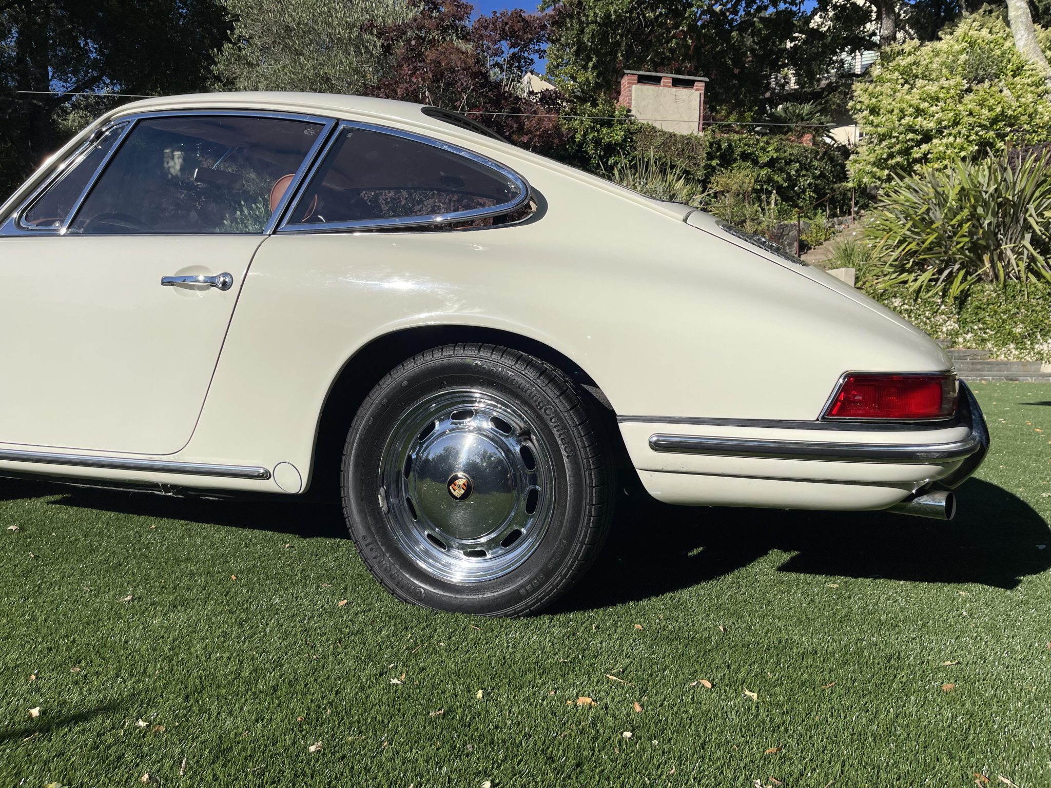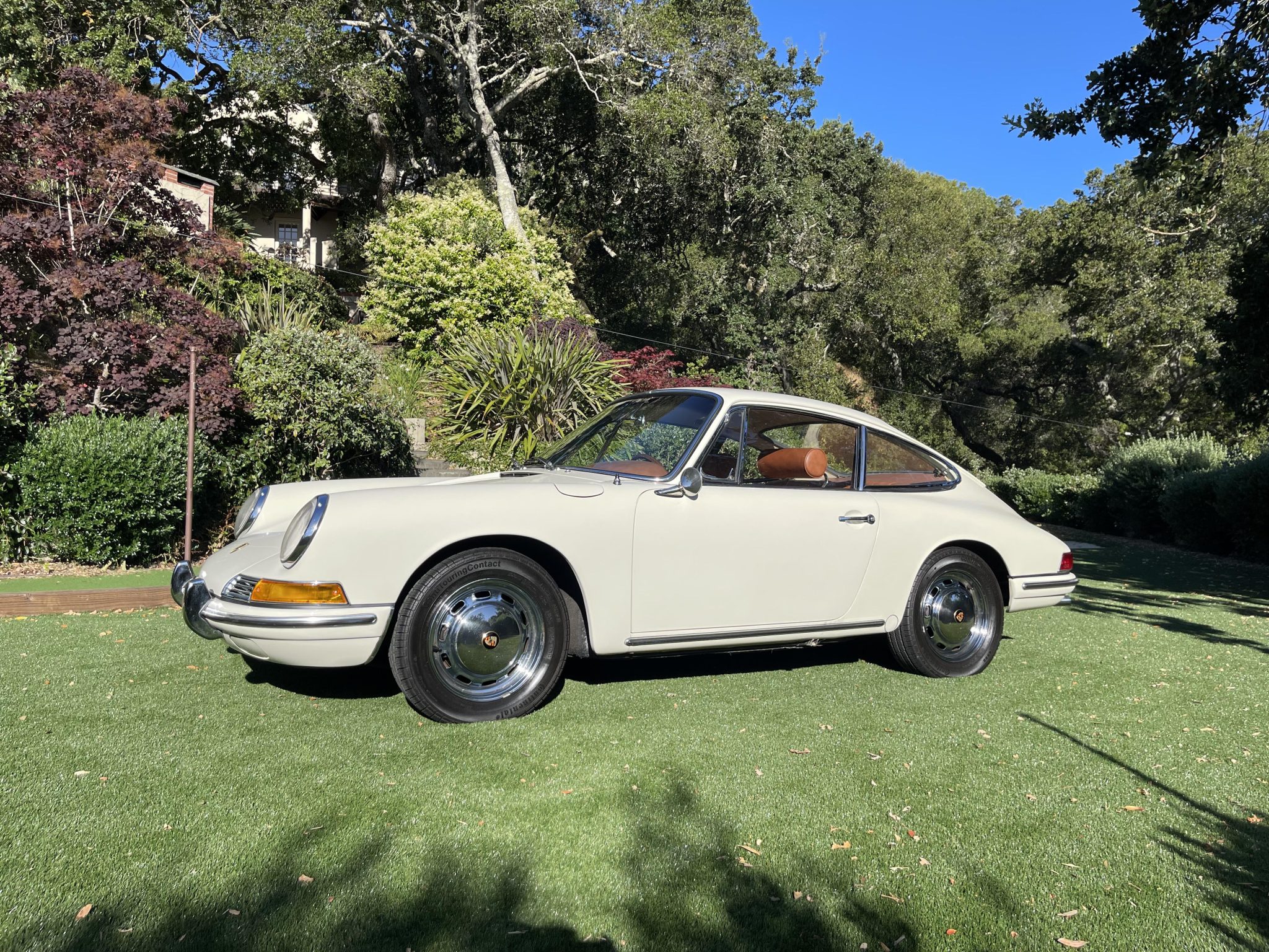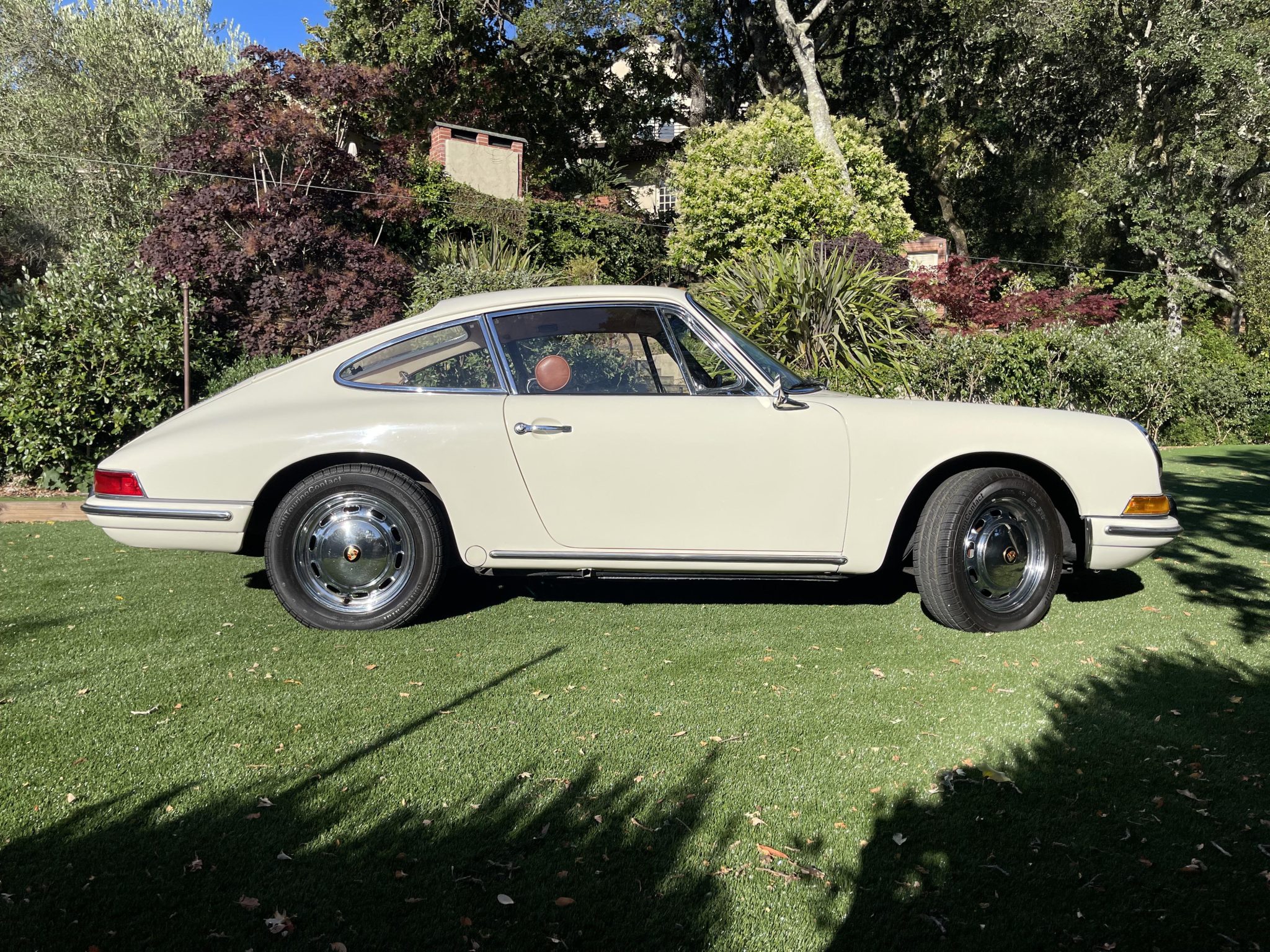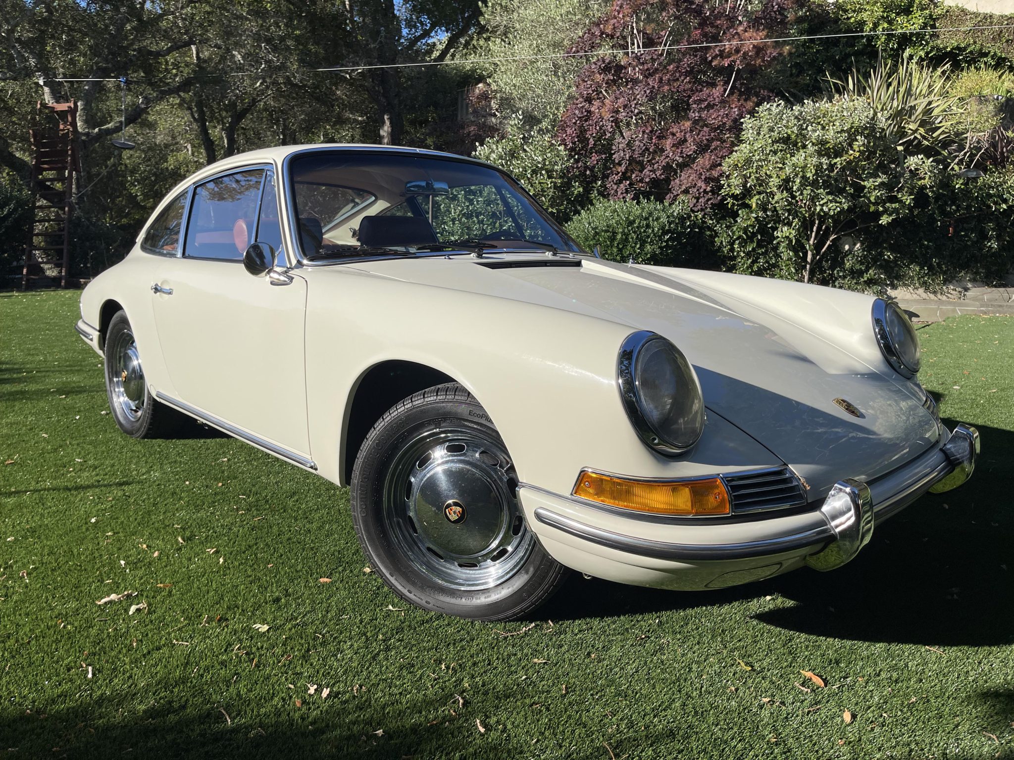 This 1966 Porsche 912 coupe is powered by a 1.6-liter flat-four mated to a five-speed manual transaxle. The car is finished in Light Ivory over brown leather upholstery and equipment includes 15″ perforated steel disc wheels, disc brakes, bright bumper guards, bucket seats, a CD stereo, and a heater.