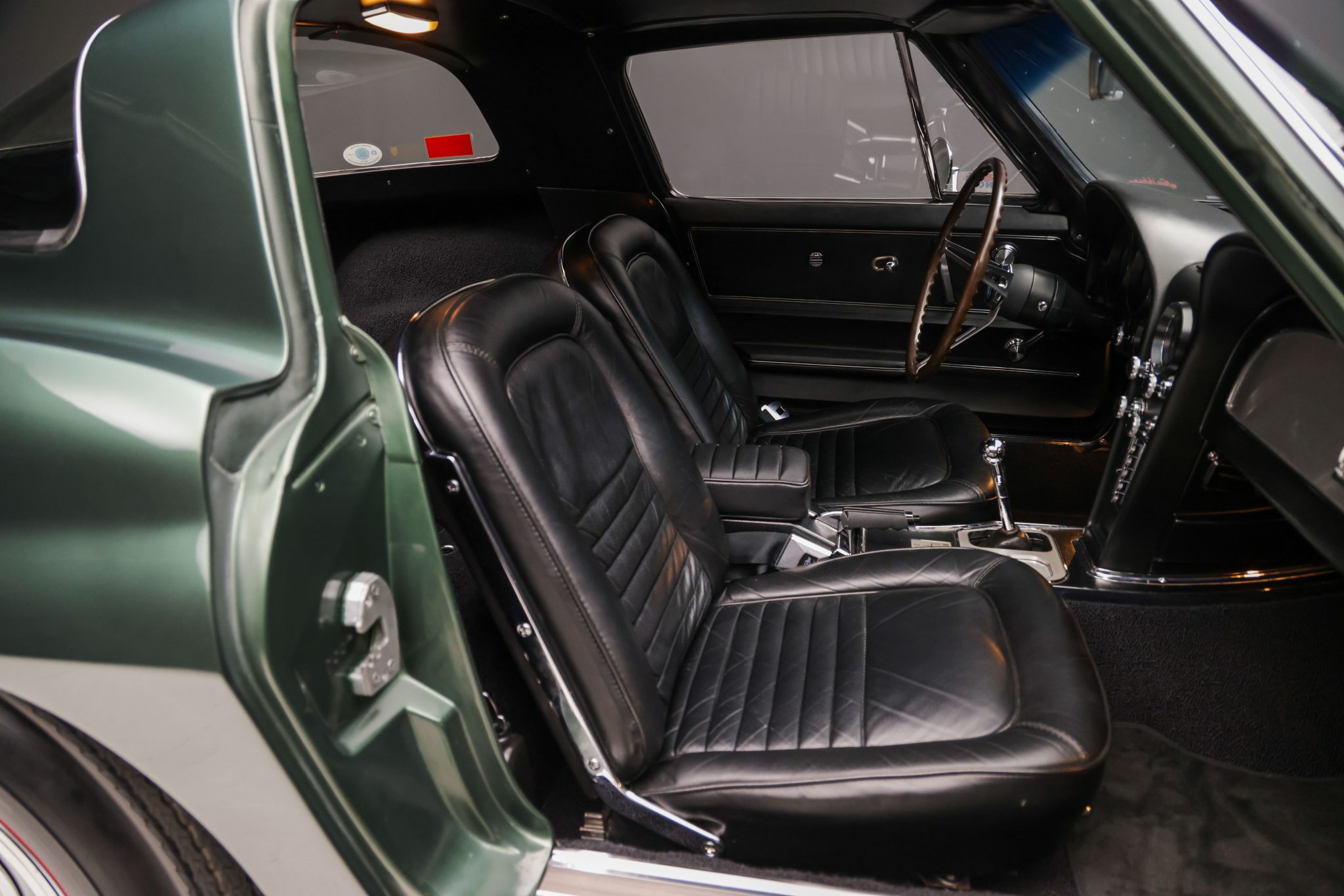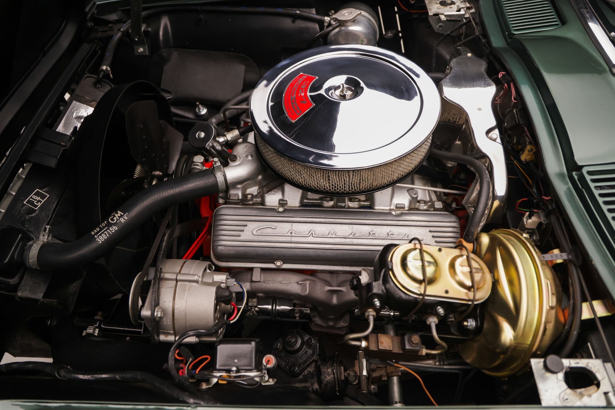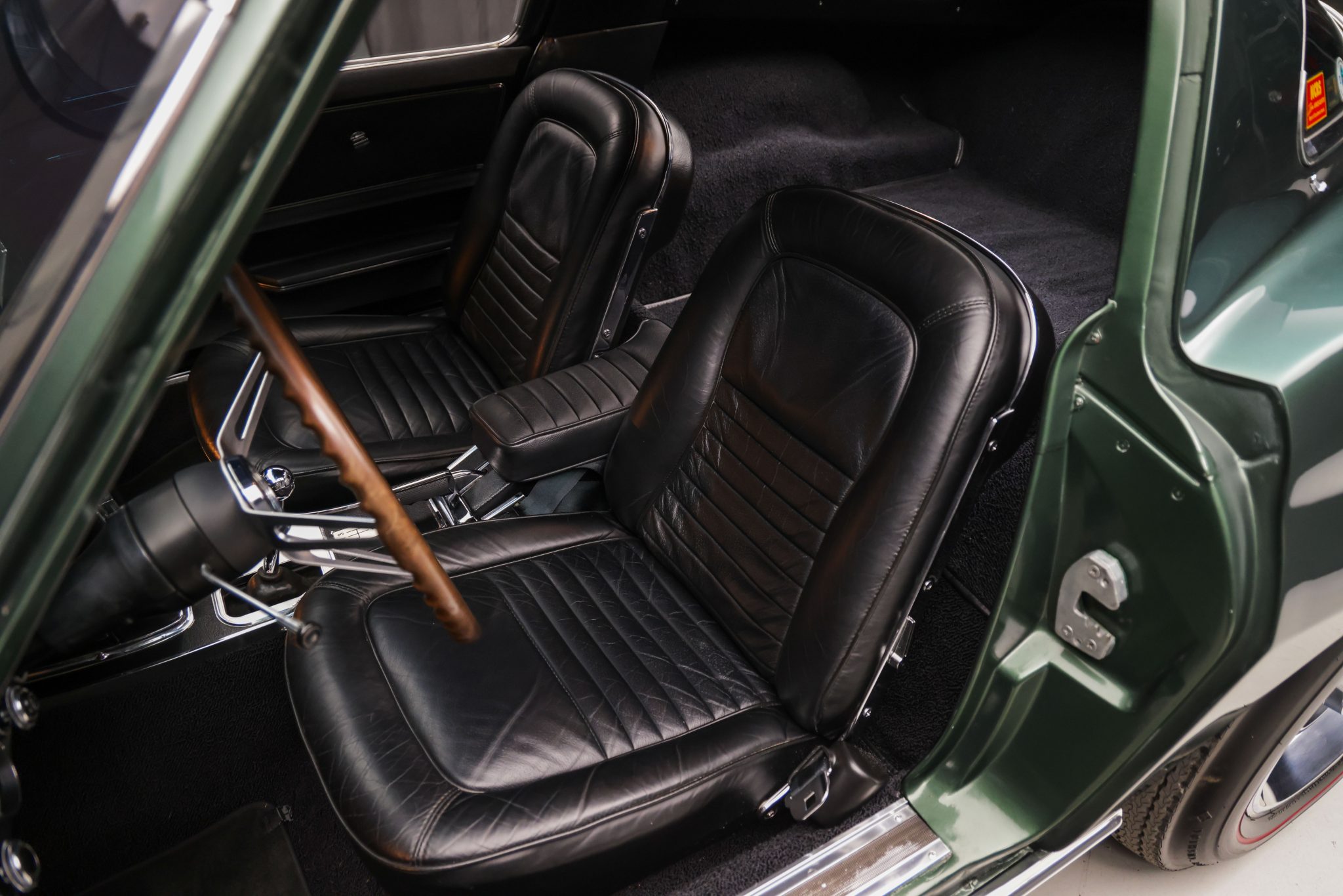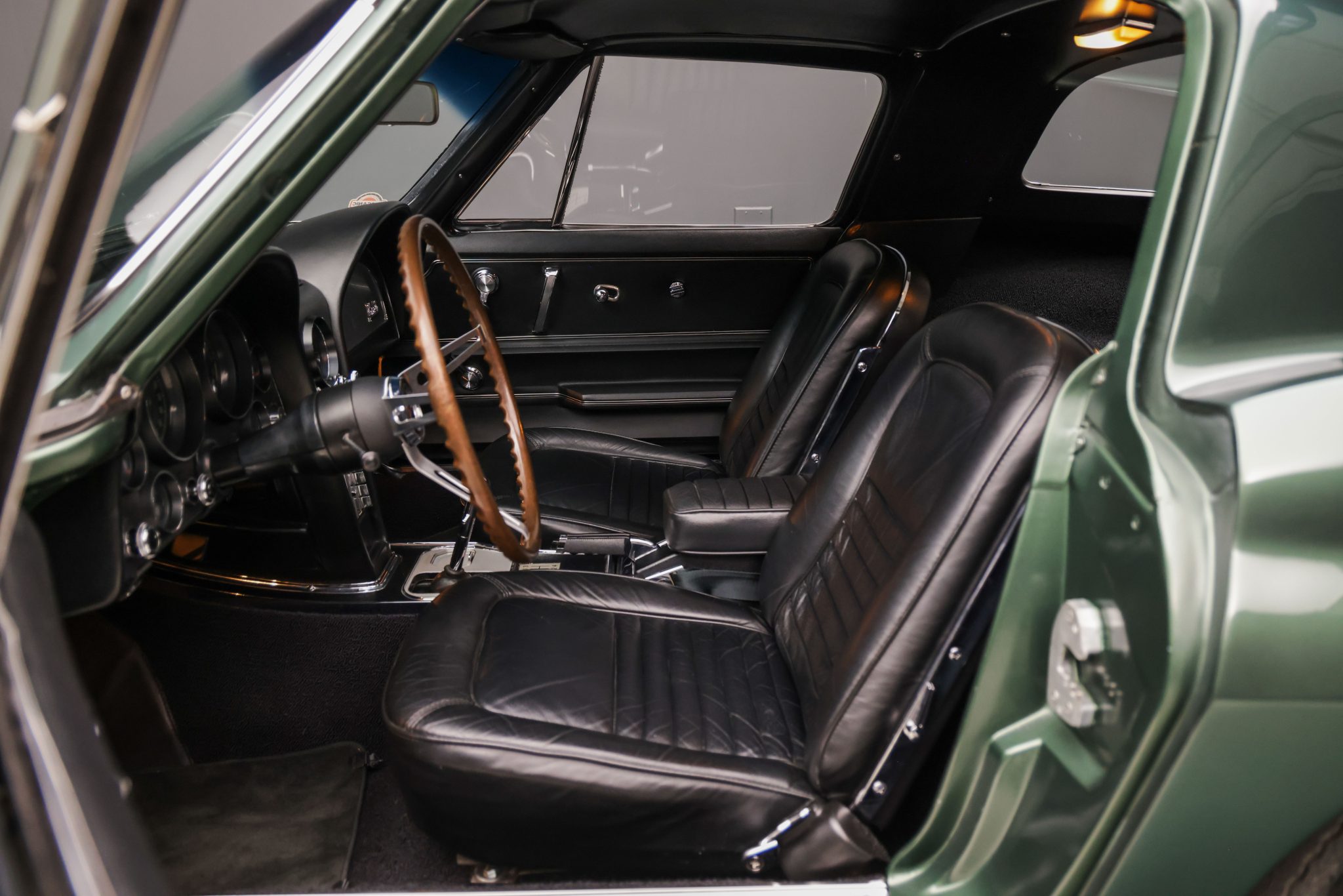 The car is powered by a 327ci L79 V8 linked with a four-speed manual transmission and a Positraction differential, and it is finished in Goodwood Green over black leather. Equipment includes 15″ Rally wheels, power-assisted four-wheel disc brakes, power steering, a cabin heater, an AM/FM radio, chrome bumpers, and retractable headlights.