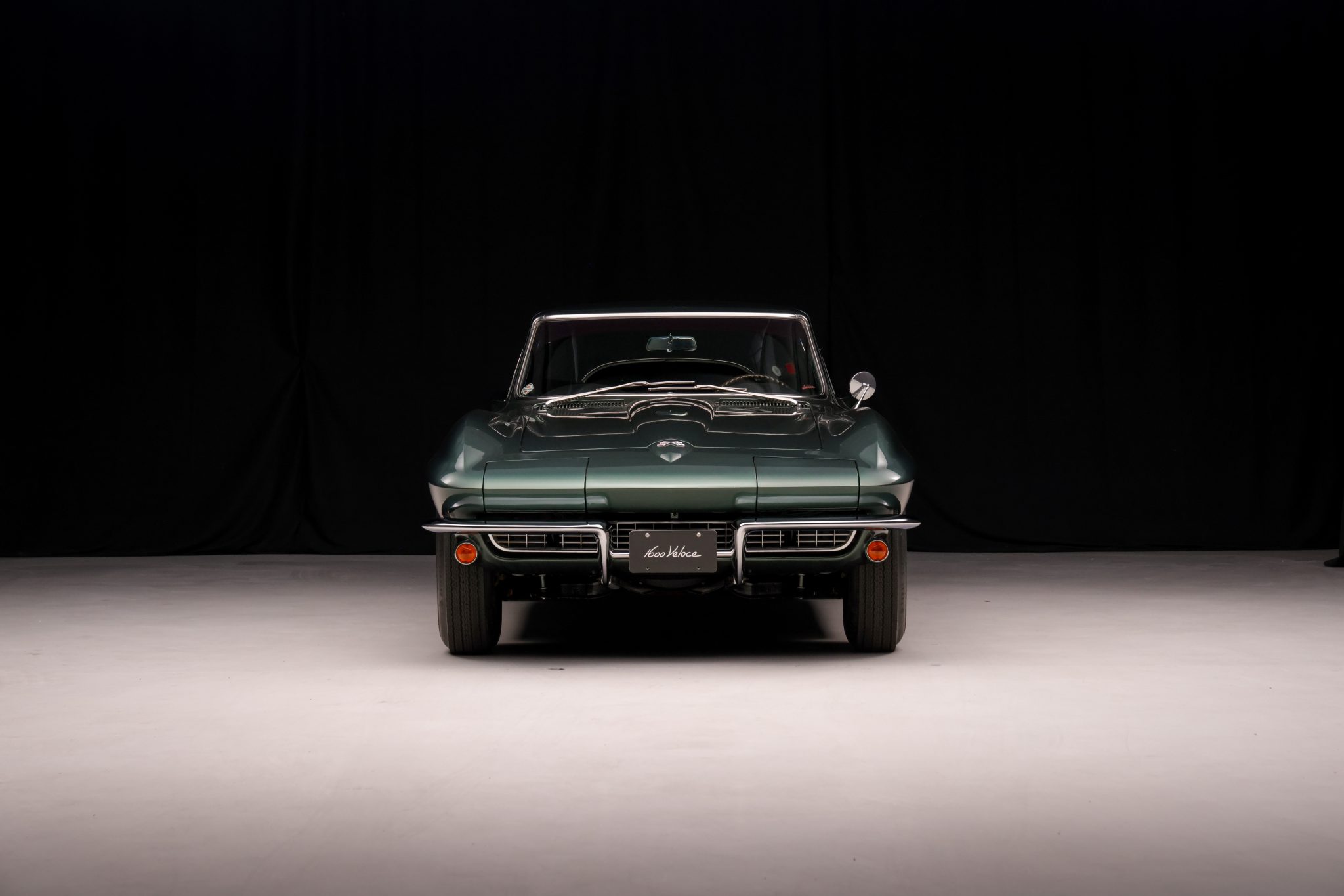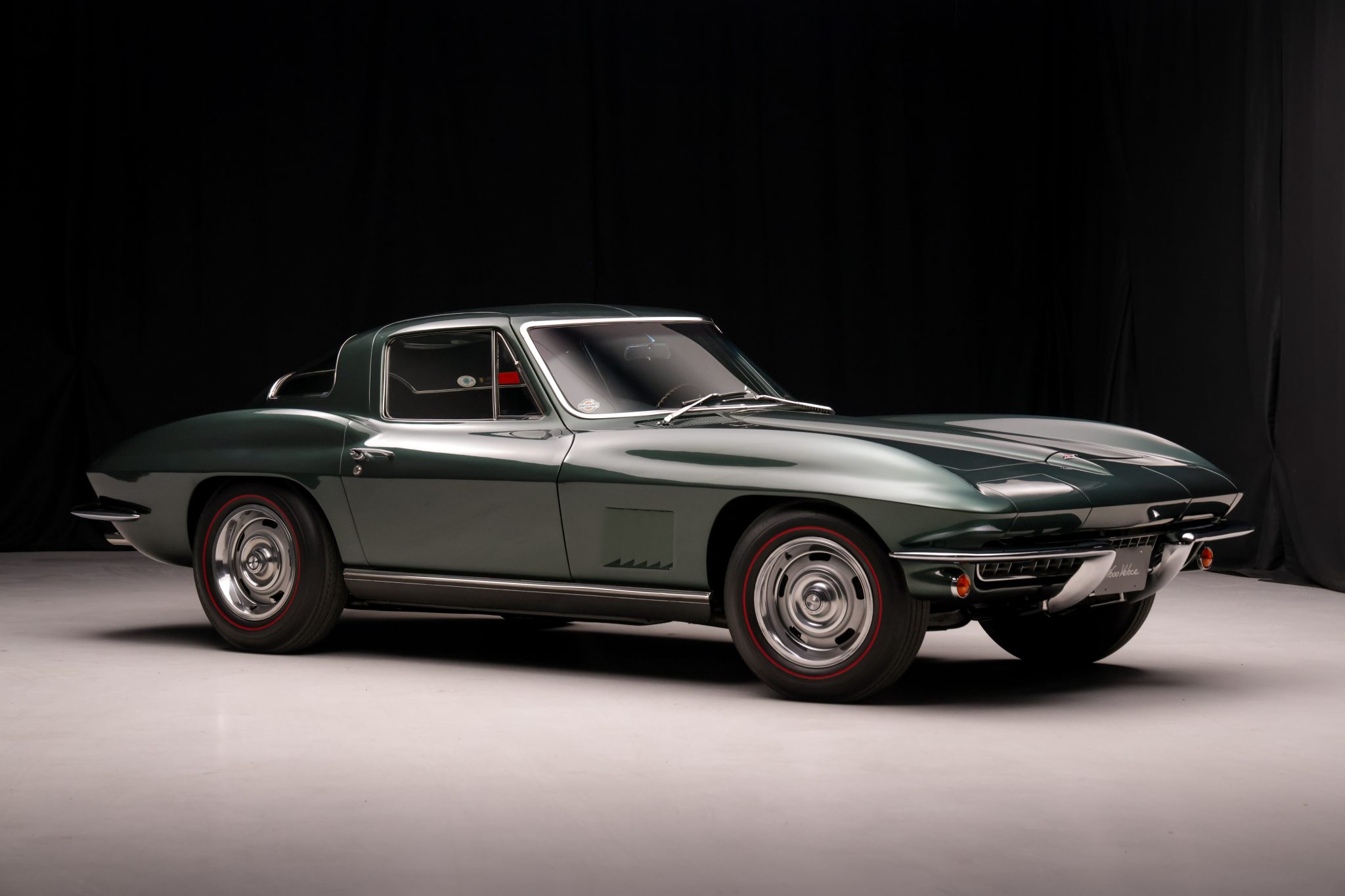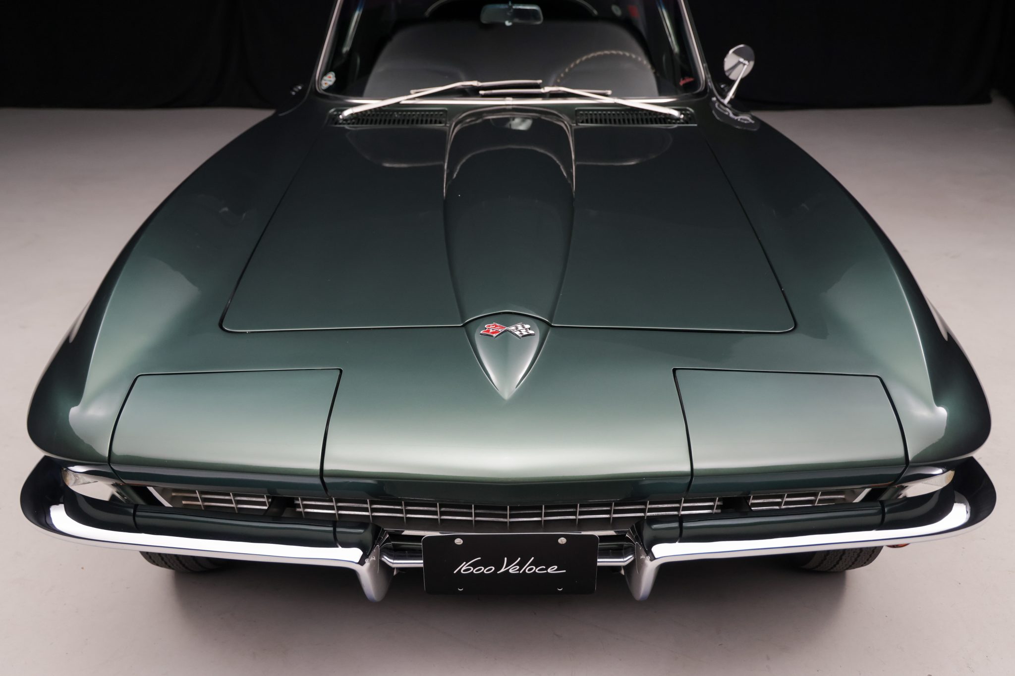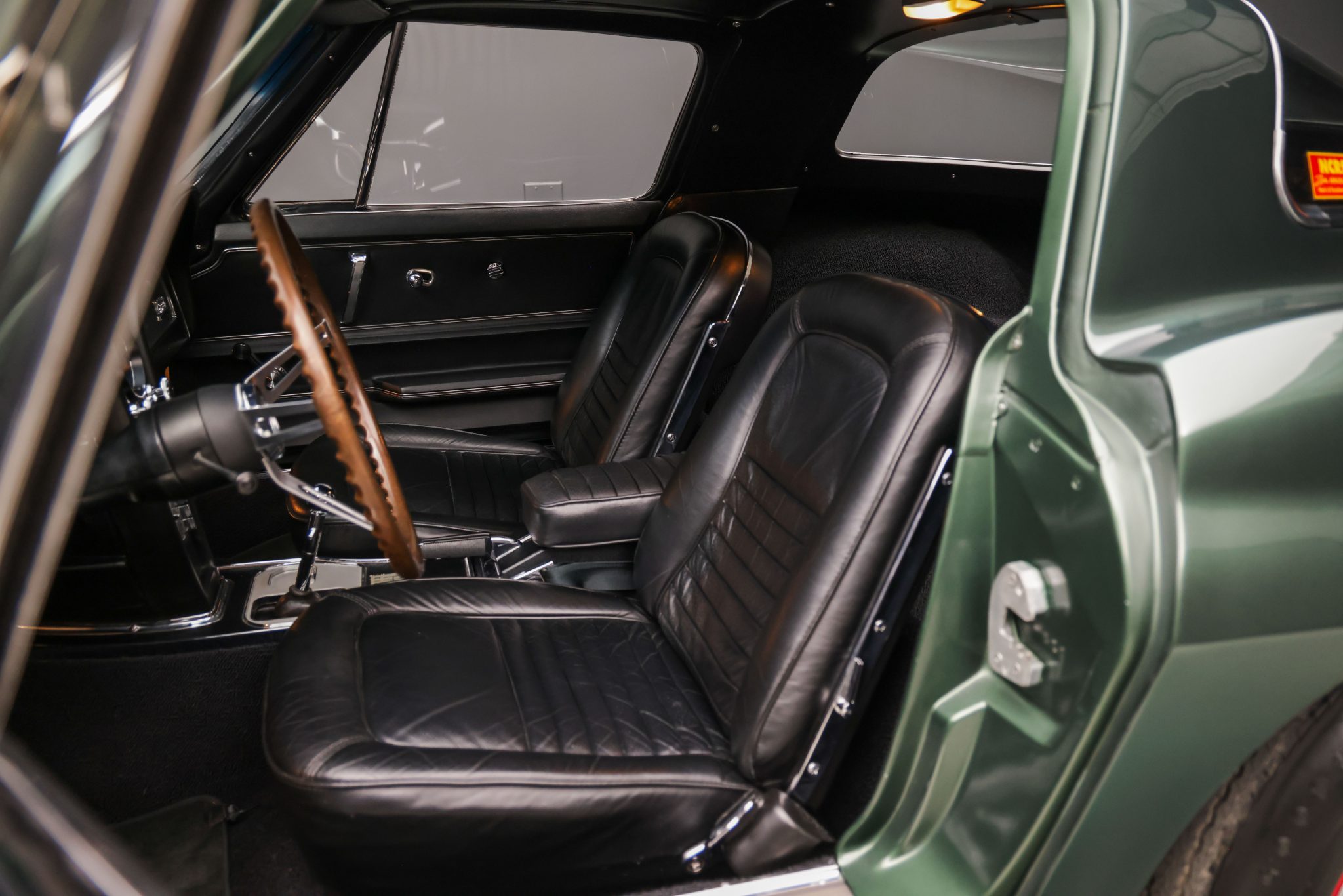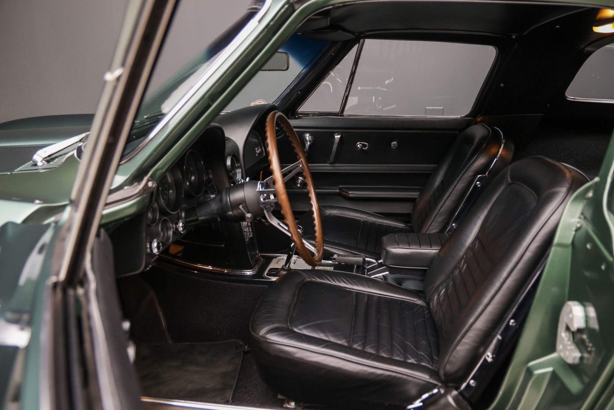 The car is powered by a 327ci L79 V8 linked with a four-speed manual transmission and a Positraction differential, and it is finished in Goodwood Green over black leather. Equipment includes 15″ Rally wheels, power-assisted four-wheel disc brakes, power steering, a cabin heater, an AM/FM radio, chrome bumpers, and retractable headlights.