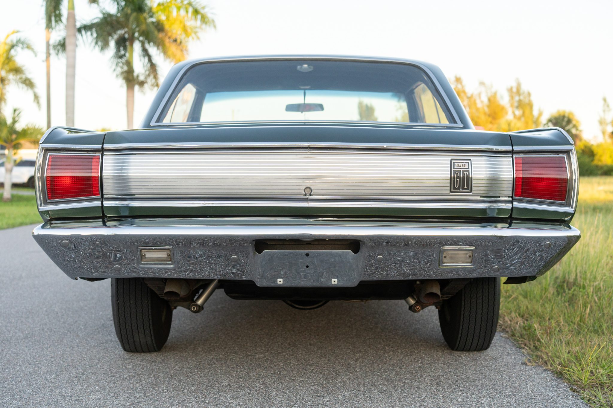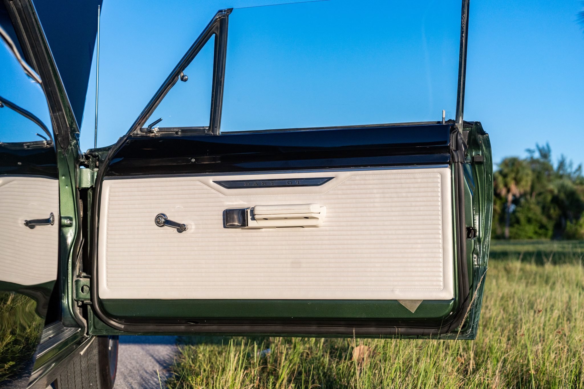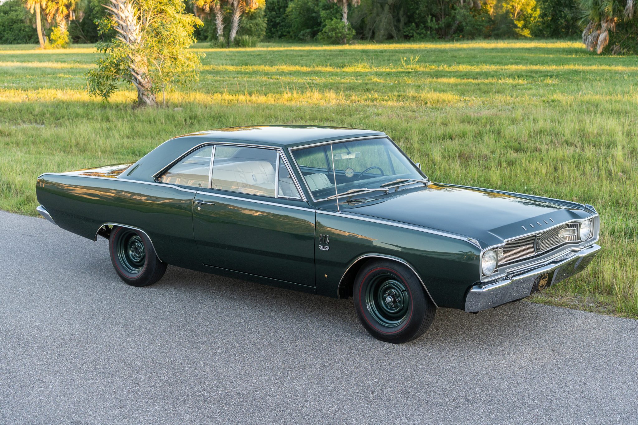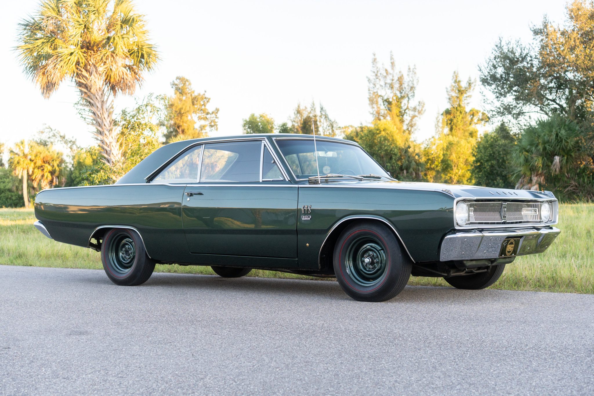 with a 383ci V8 under the hood, making it one of 457 Darts built for the model year with that engine, 229 of which came with a four-speed manual transmission. The car is painted Dark Green over white vinyl upholstery and was refurbished around 2005. Equipment includes body-color 14″ steel wheels, front disc brakes, a dual exhaust system, front bucket seats, an AM radio, and a heater.