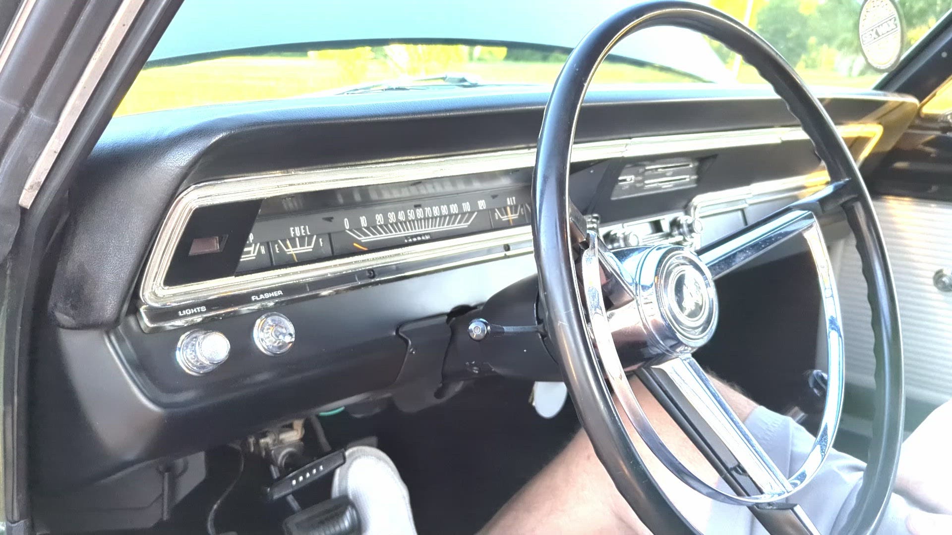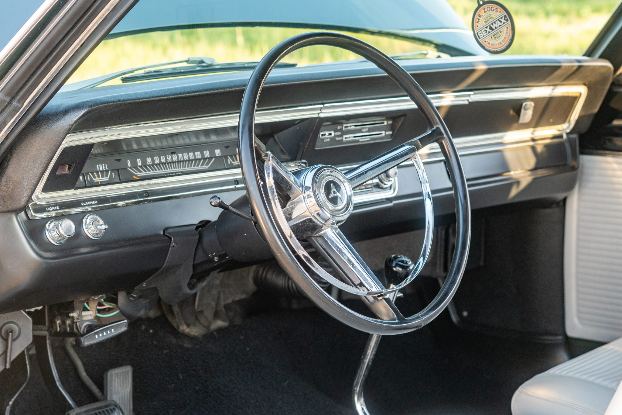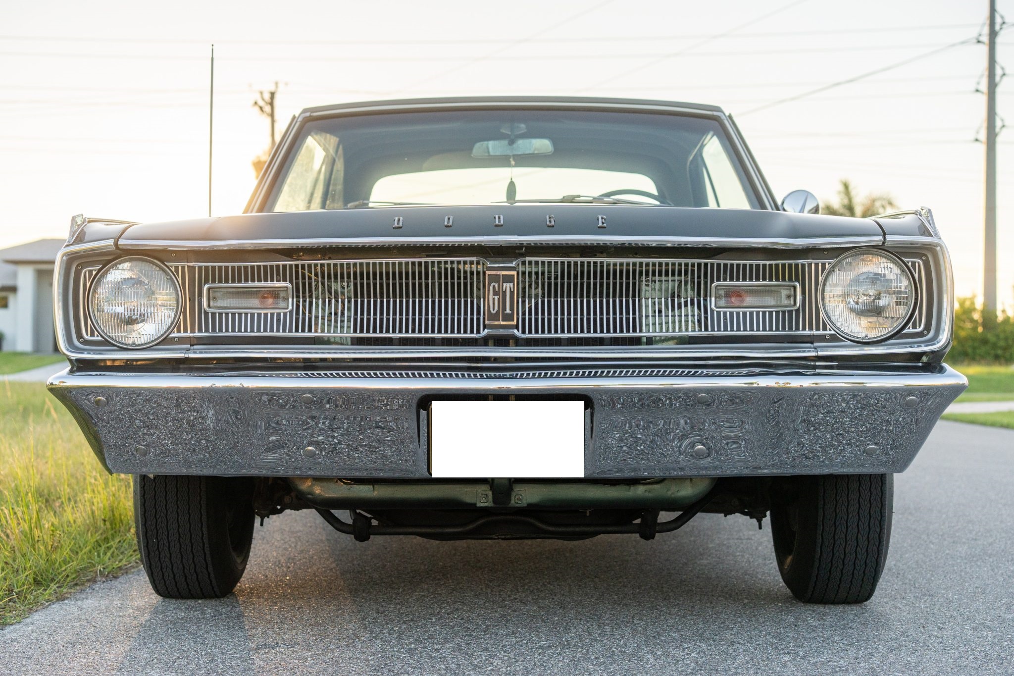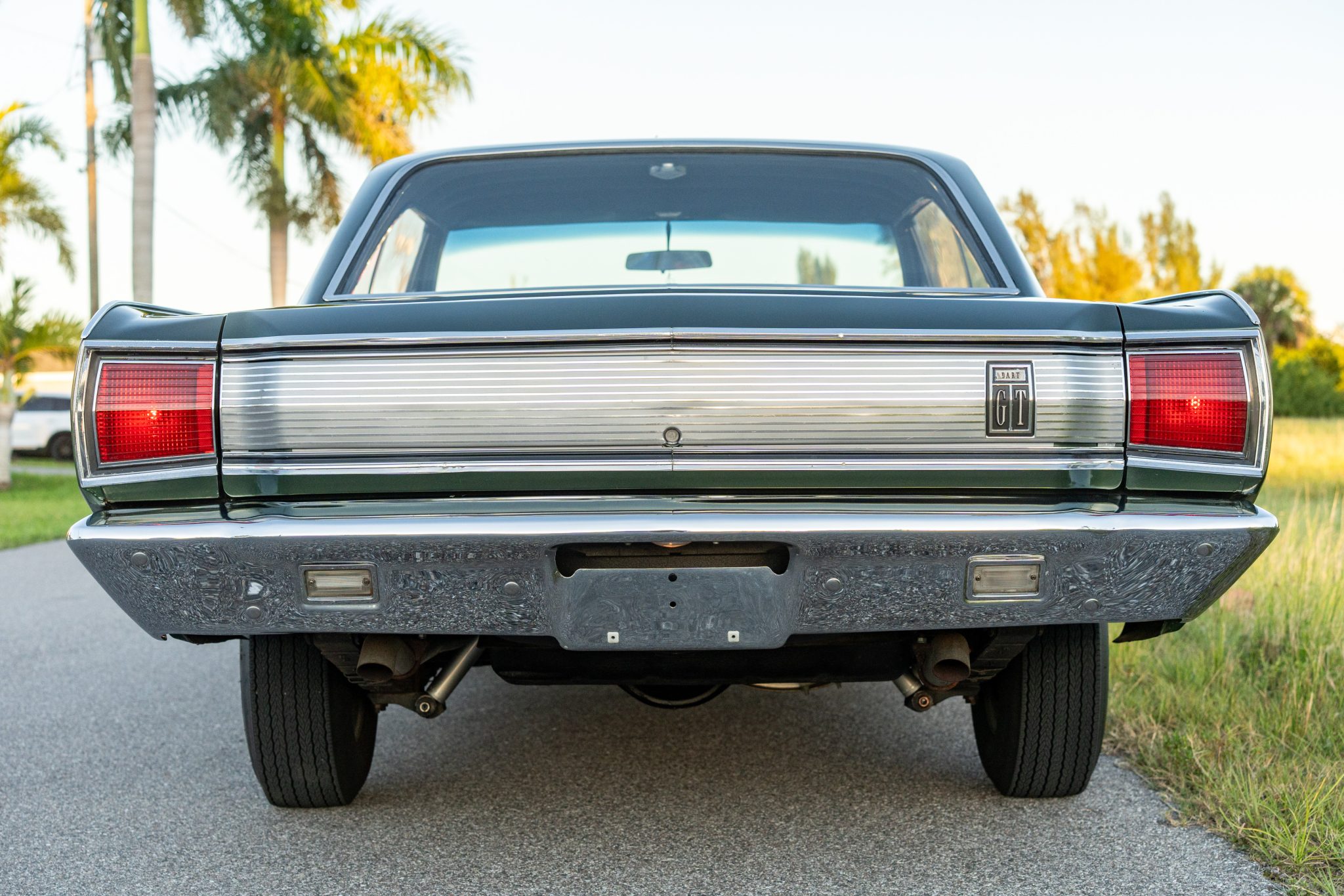 with a 383ci V8 under the hood, making it one of 457 Darts built for the model year with that engine, 229 of which came with a four-speed manual transmission. The car is painted Dark Green over white vinyl upholstery and was refurbished around 2005. Equipment includes body-color 14″ steel wheels, front disc brakes, a dual exhaust system, front bucket seats, an AM radio, and a heater.