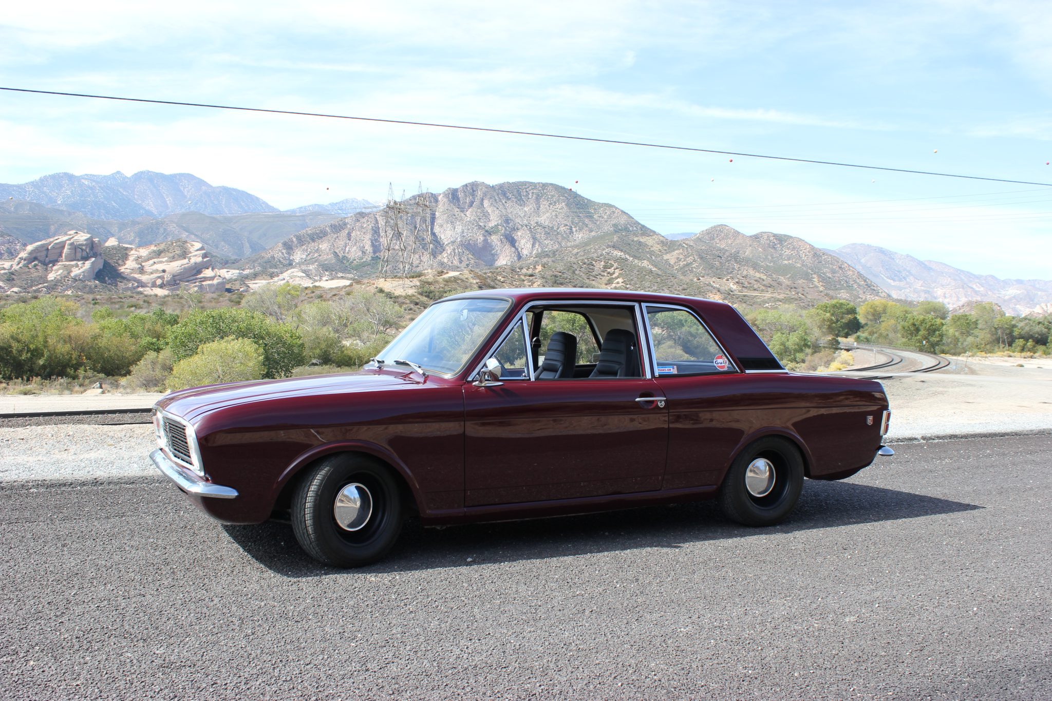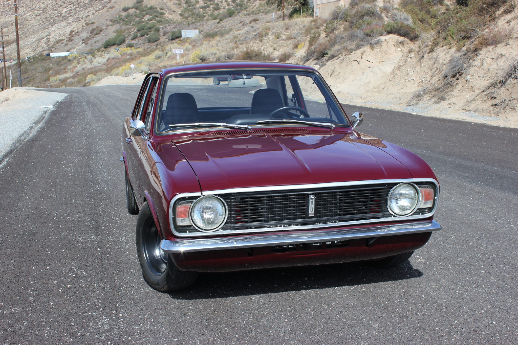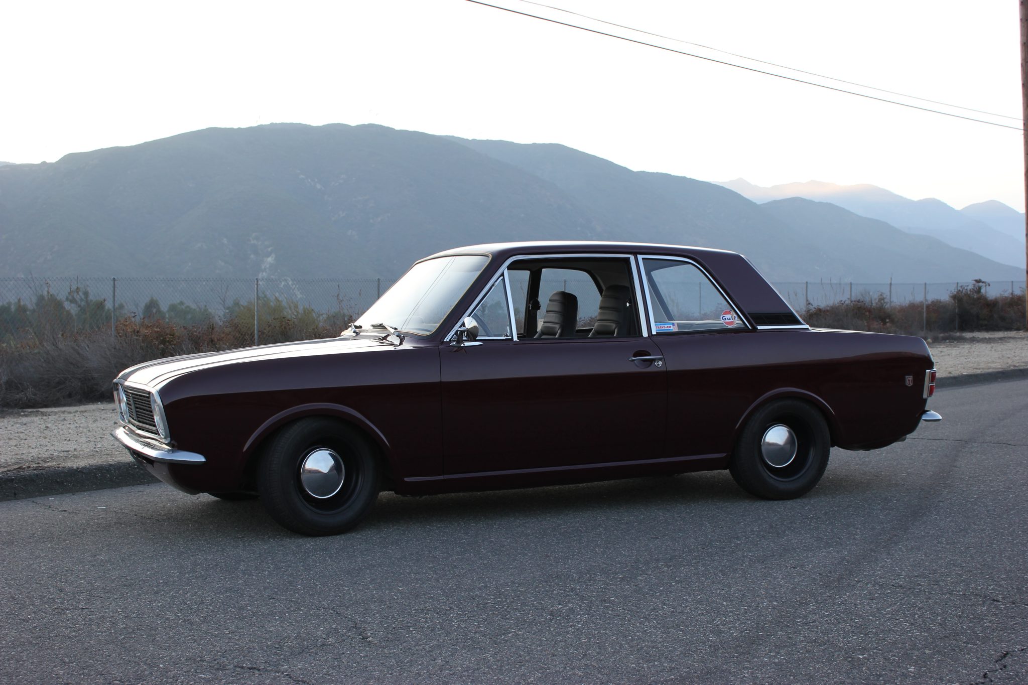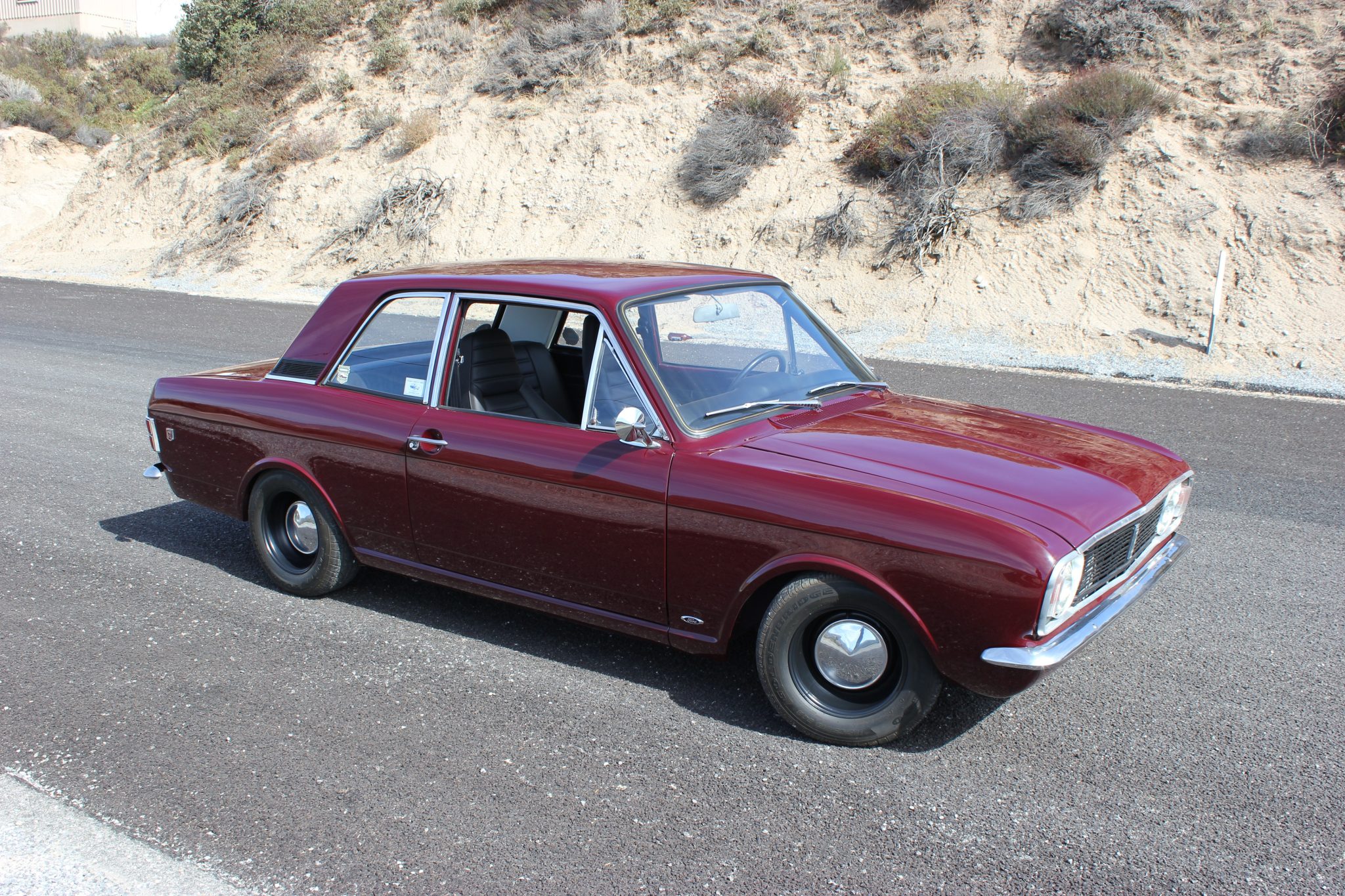 This 1967 Ford Cortina GT Mk II has been fitted with a 2.0-liter Zetec inline-four, Omex individual throttle bodies, and a T9 five-speed manual transmission. It is finished in Black Cherry over black vinyl and also features adjustable front coilovers, front disc brakes, 13″ steel wheels, tubular headers, a stainless-steel exhaust system, and an aluminum radiator.