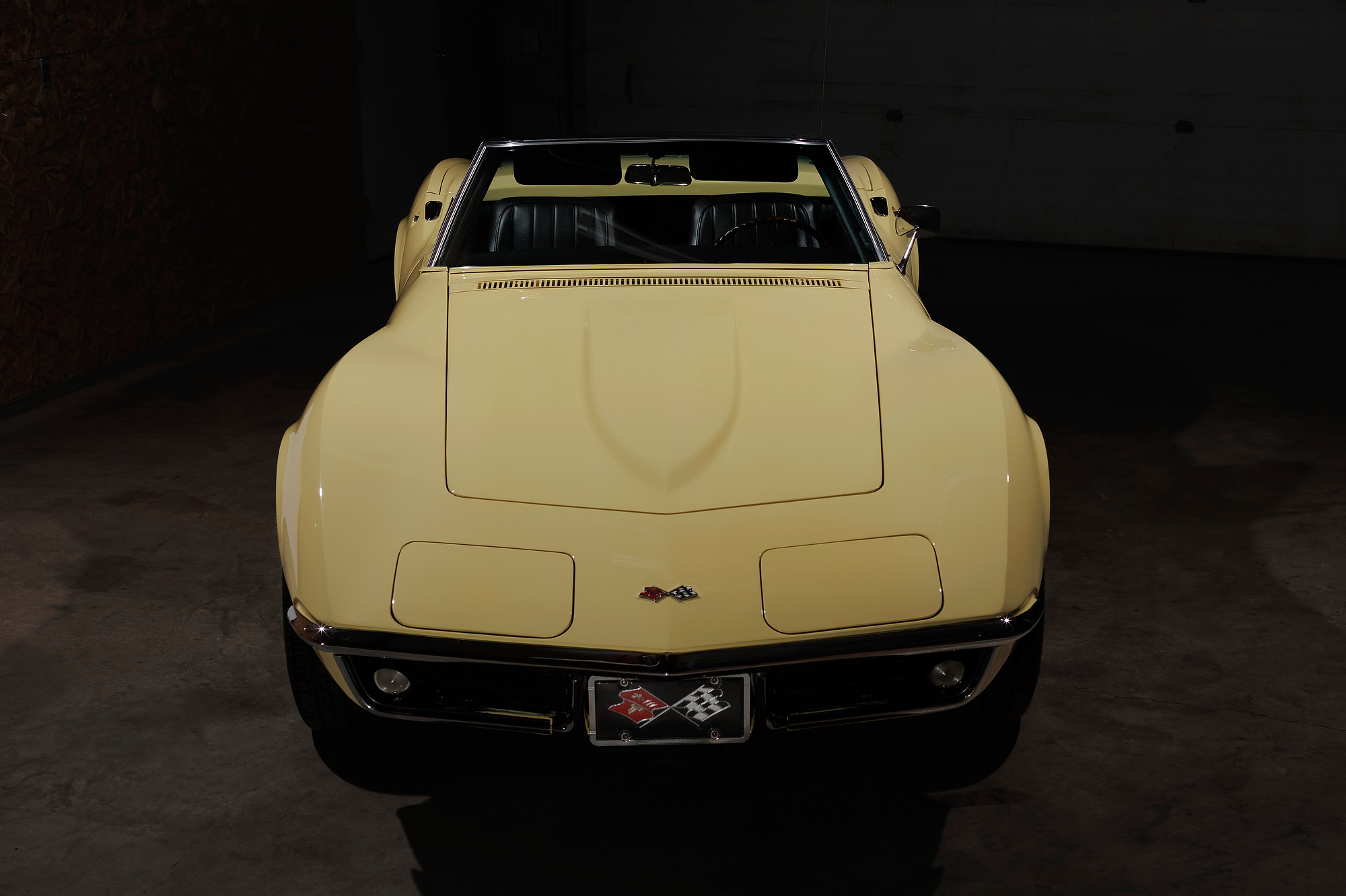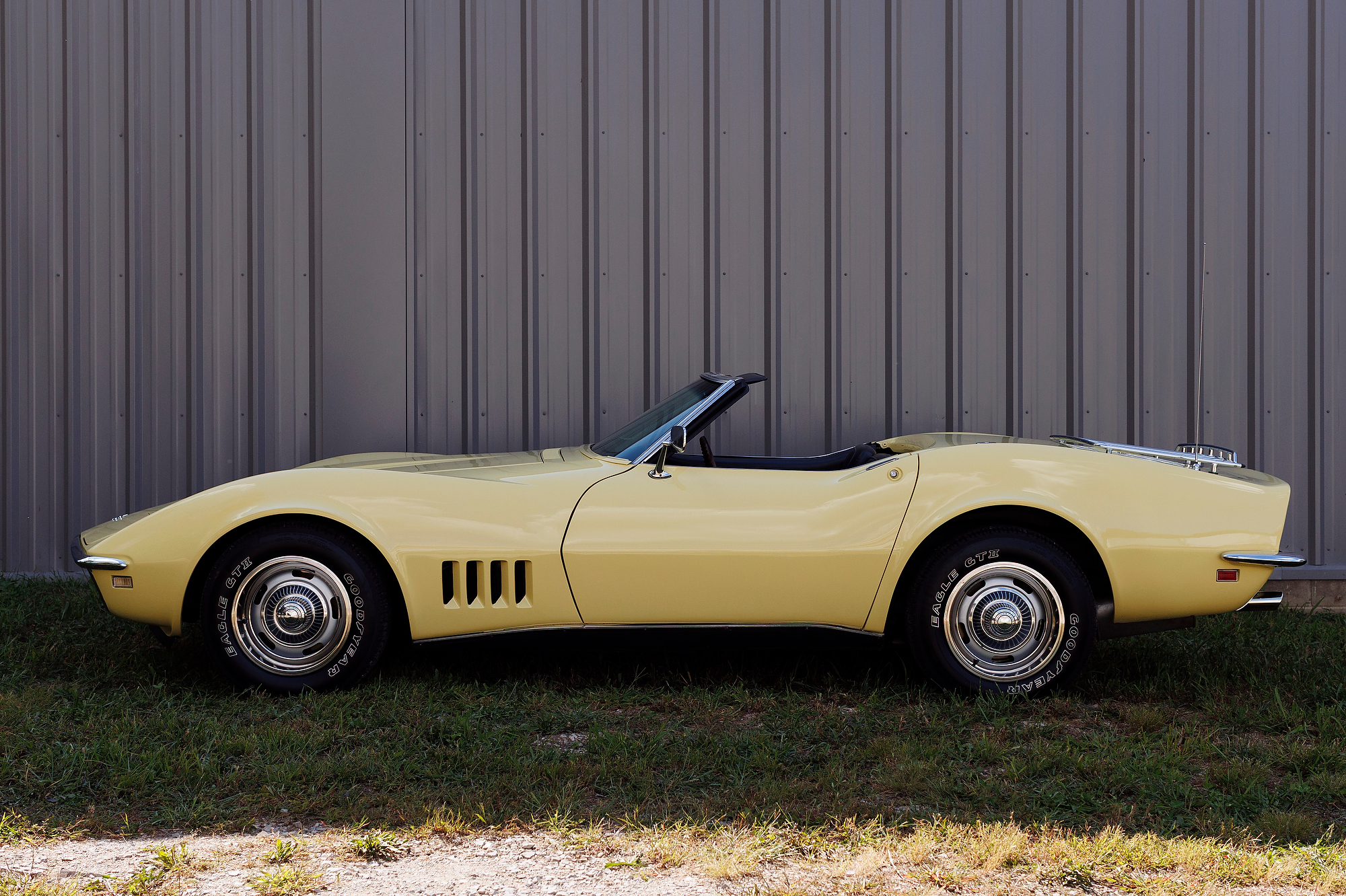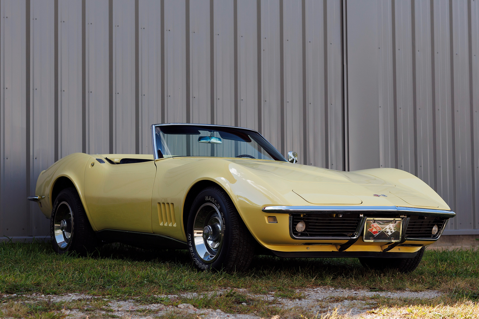 This 1968 Chevrolet Corvette convertible is finished in yellow over black vinyl upholstery and powered by a 327ci V8 mated to a four-speed manual transmission. Equipment includes a black convertible top, a chrome luggage rack, pop-up headlights, a tilt steering column, four-wheel disc brakes, 15″ Rally-style wheels, aftermarket speakers, and a Delco AM/FM stereo.