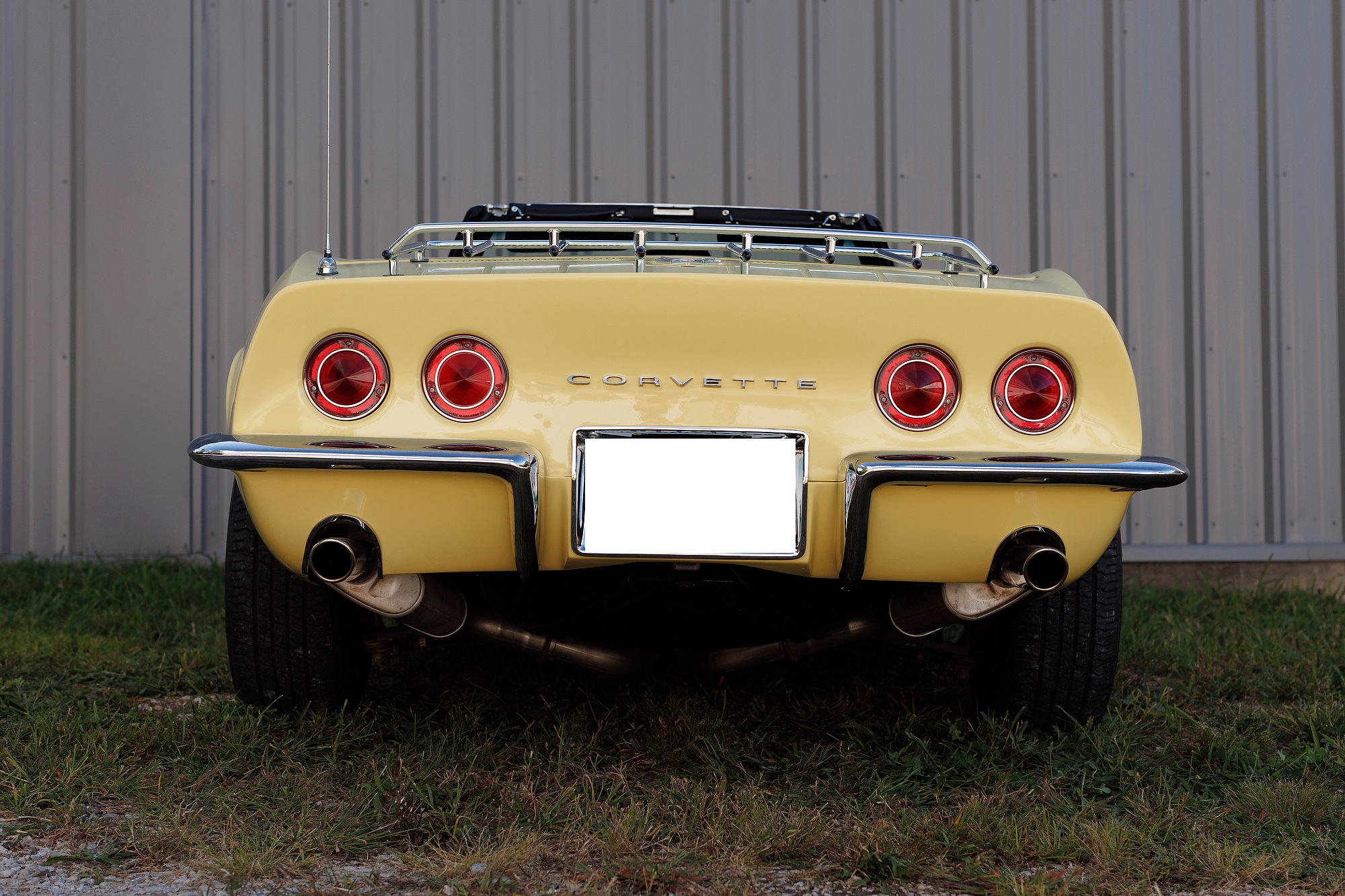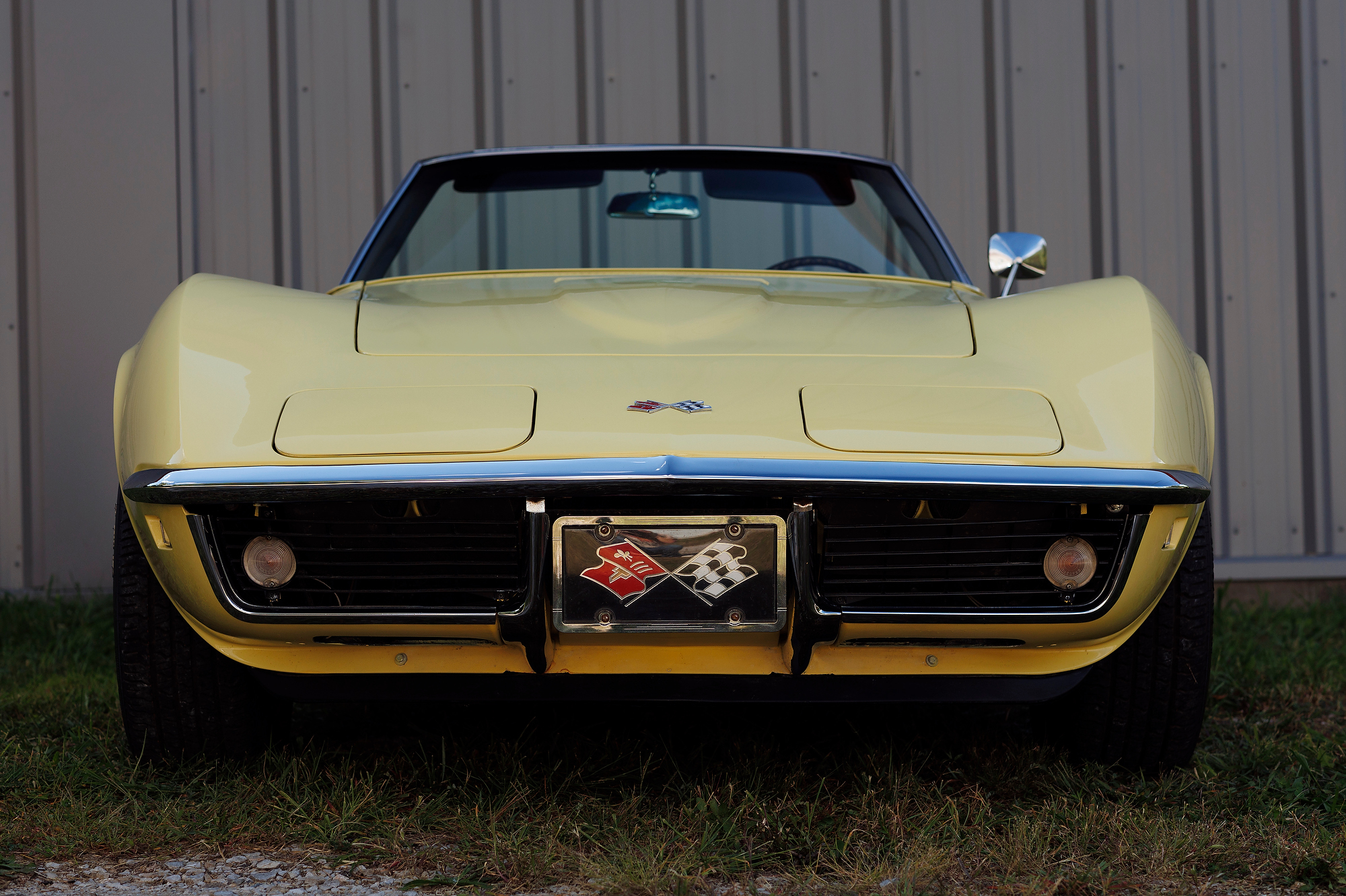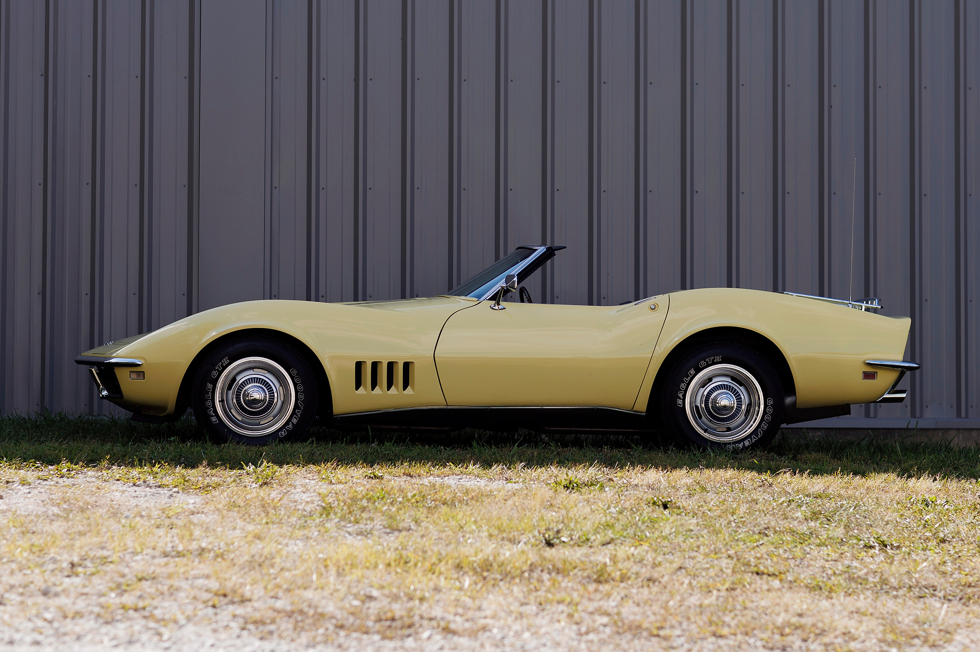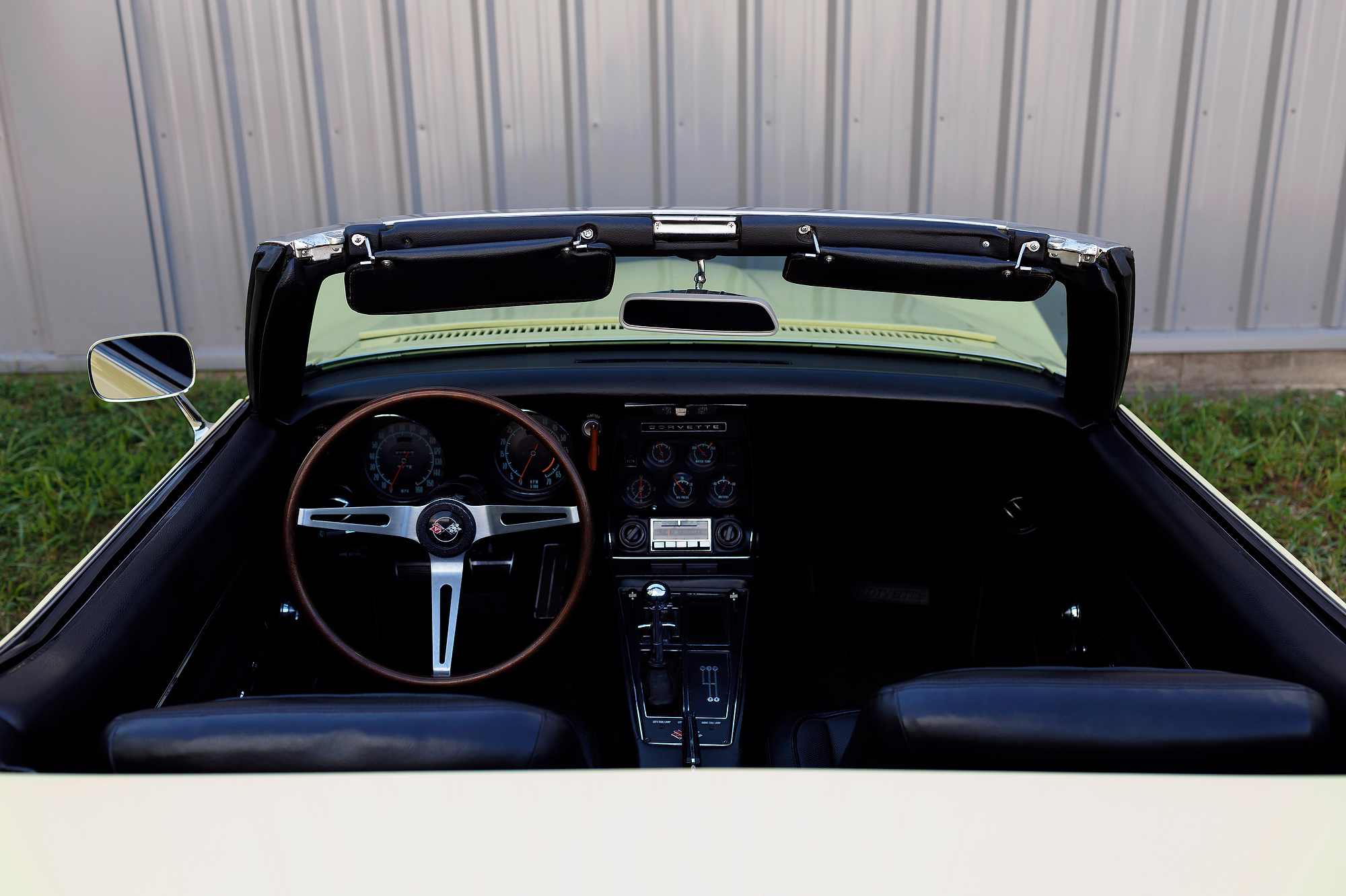 This 1968 Chevrolet Corvette convertible is finished in yellow over black vinyl upholstery and powered by a 327ci V8 mated to a four-speed manual transmission. Equipment includes a black convertible top, a chrome luggage rack, pop-up headlights, a tilt steering column, four-wheel disc brakes, 15″ Rally-style wheels, aftermarket speakers, and a Delco AM/FM stereo.