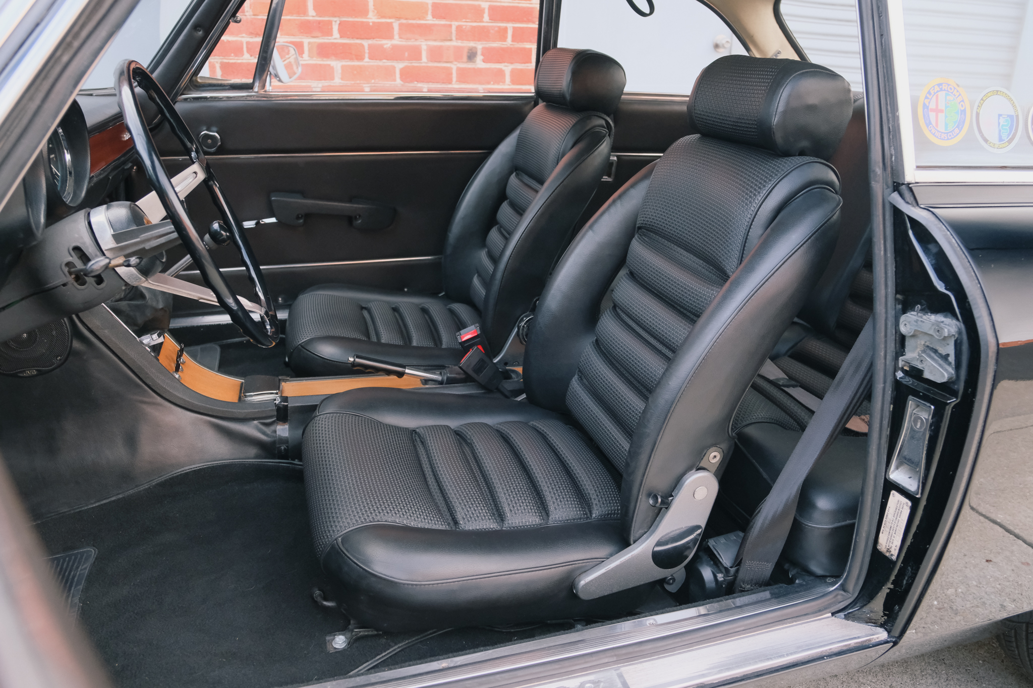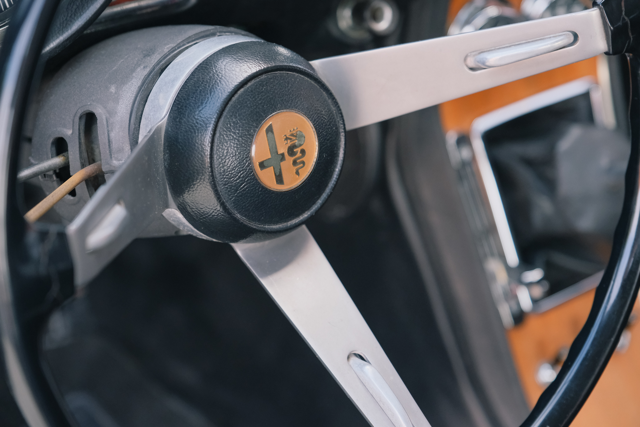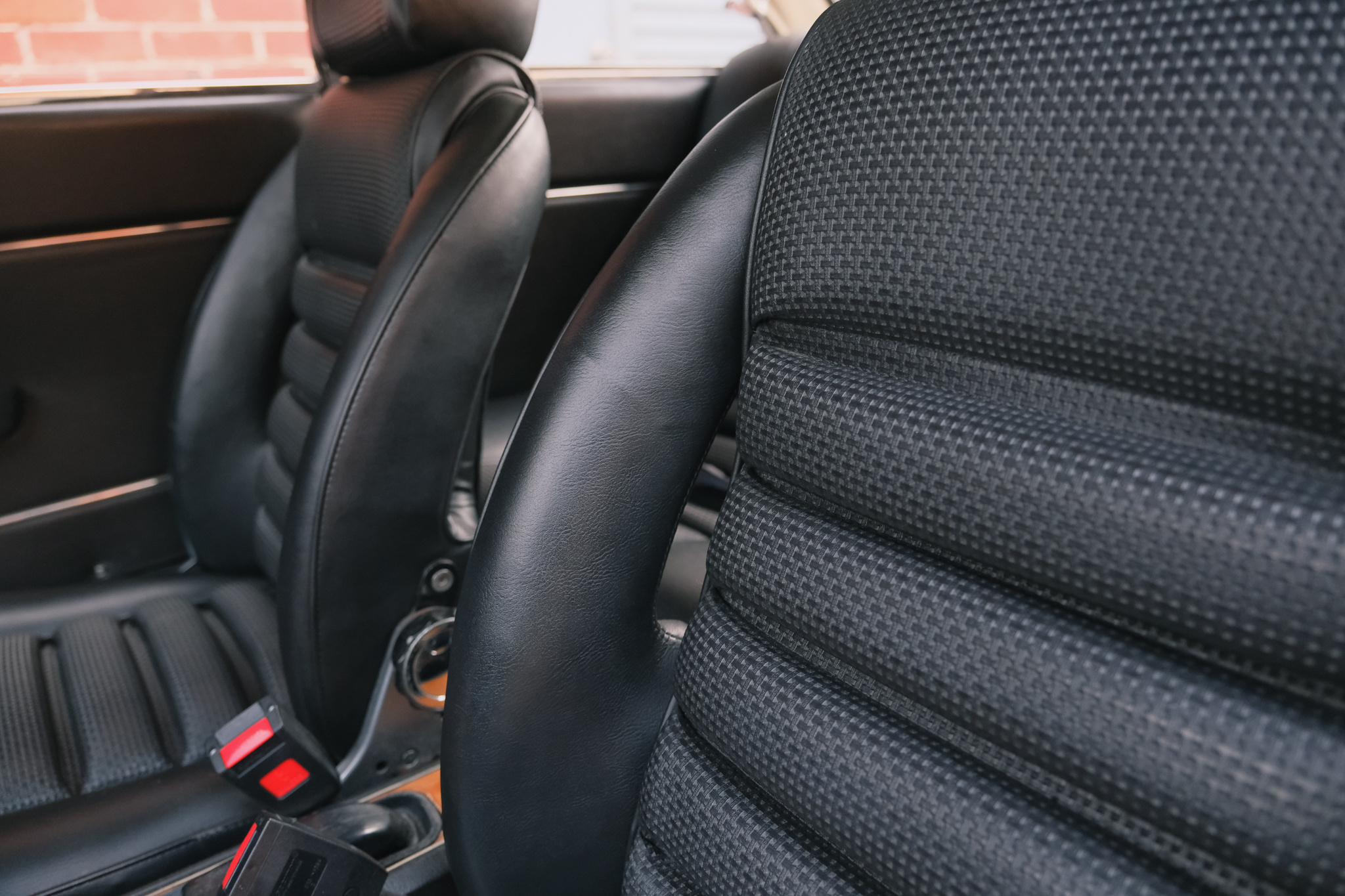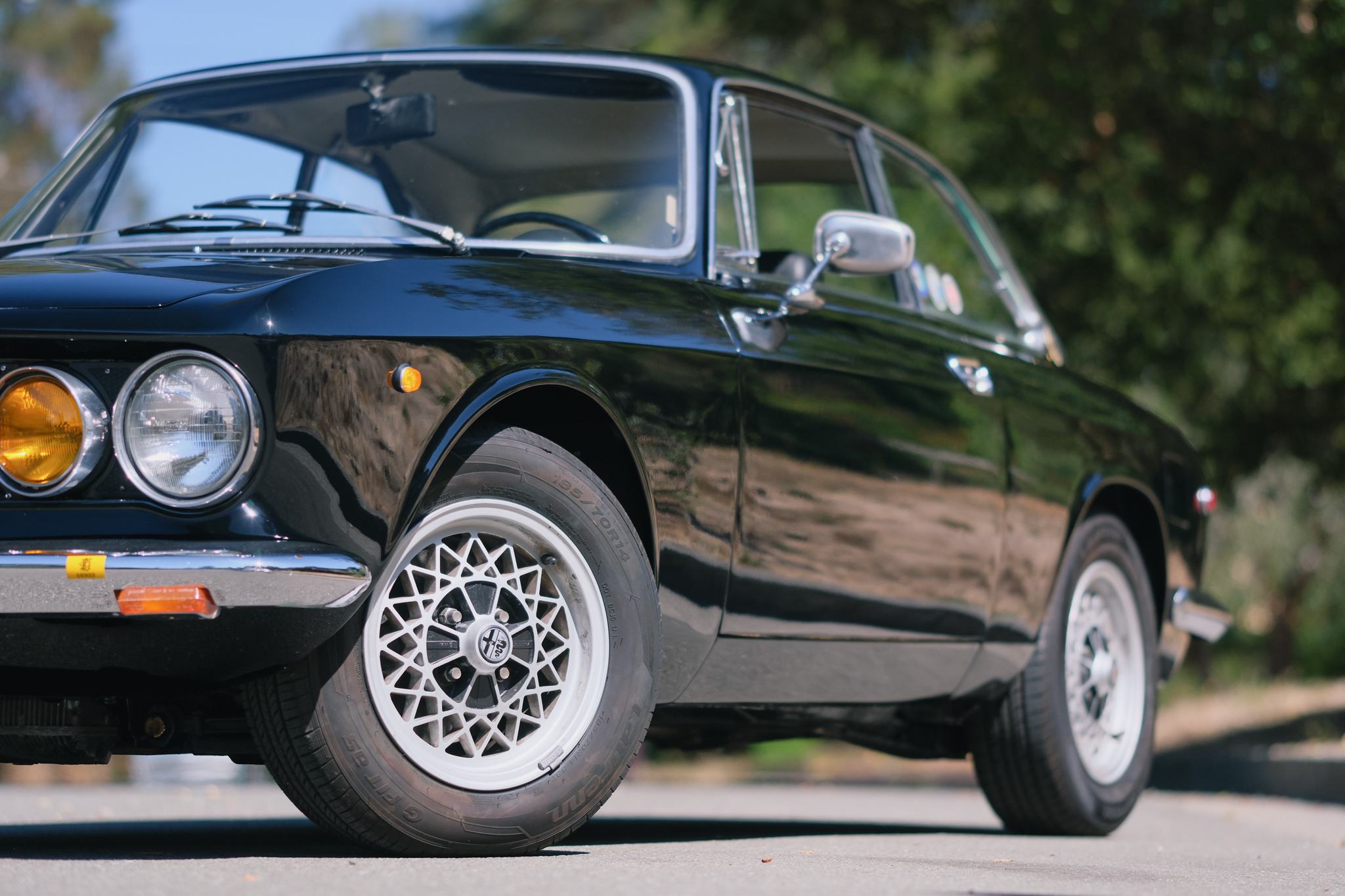 Finished in black, the car wears amber-lens fog lamps and rides on 14″ BWA basketweave wheels coupled with Koni shocks at all four corners. Inside, flying-buttress front seats trimmed in black vinyl are accompanied by woodgrain trim and Veglia Borletti instrumentation. Power is provided by a 1,779cc twin-cam inline-four equipped with SPICA mechanical fuel injection, while shifting is through a five-speed manual transmission.