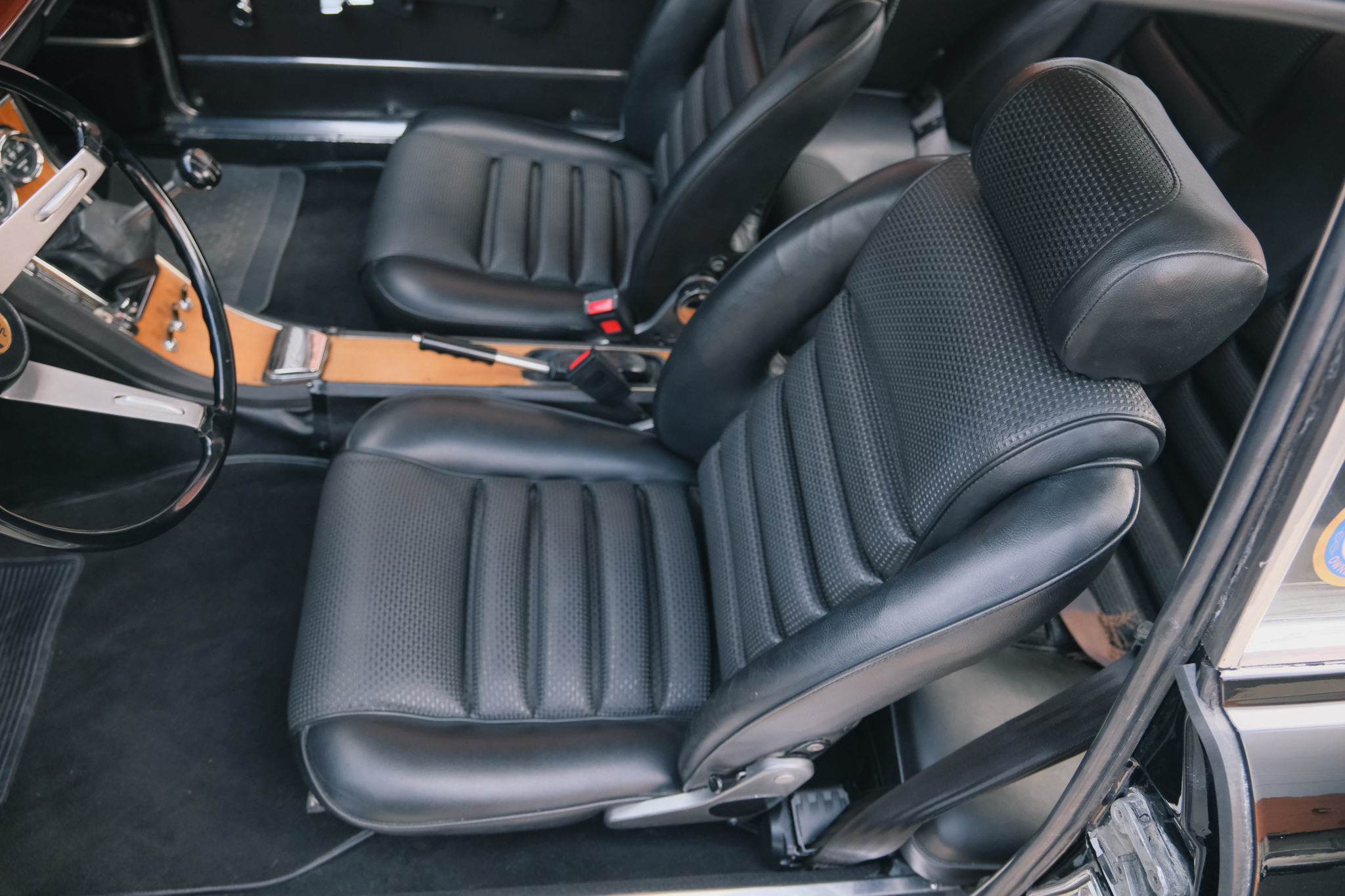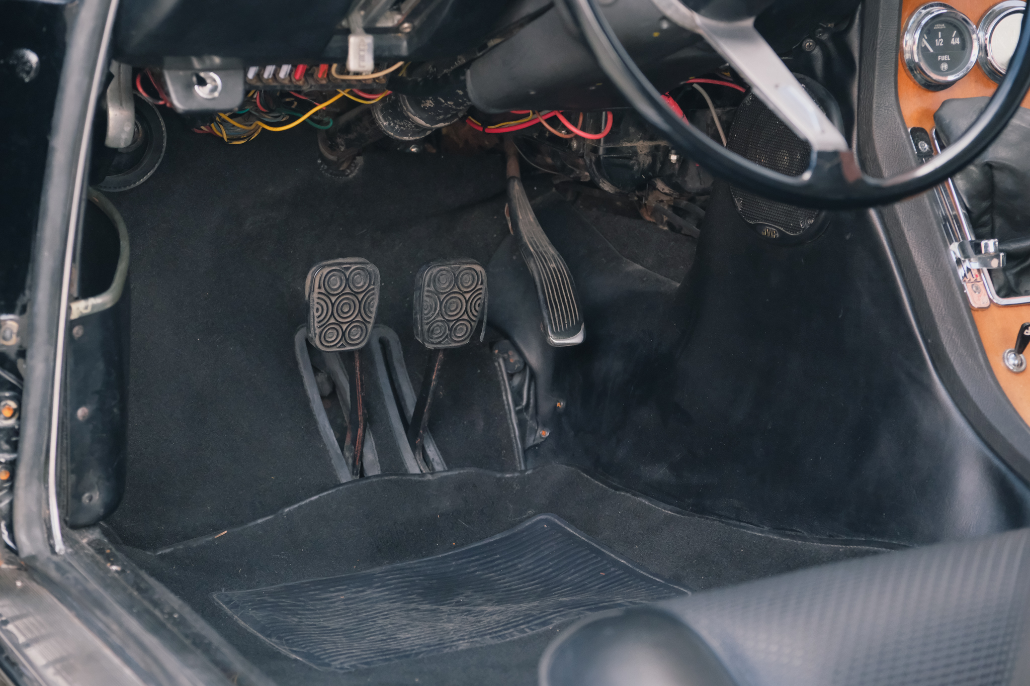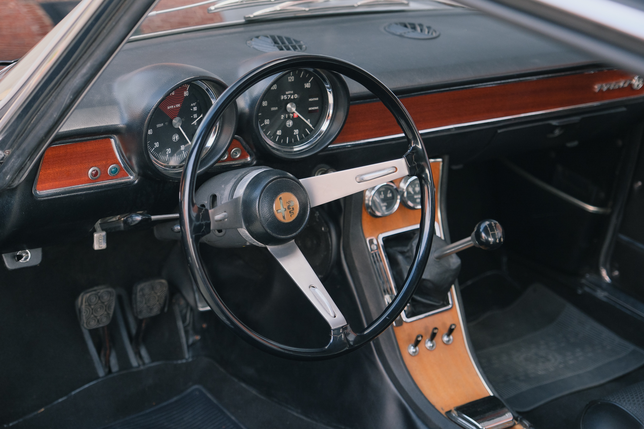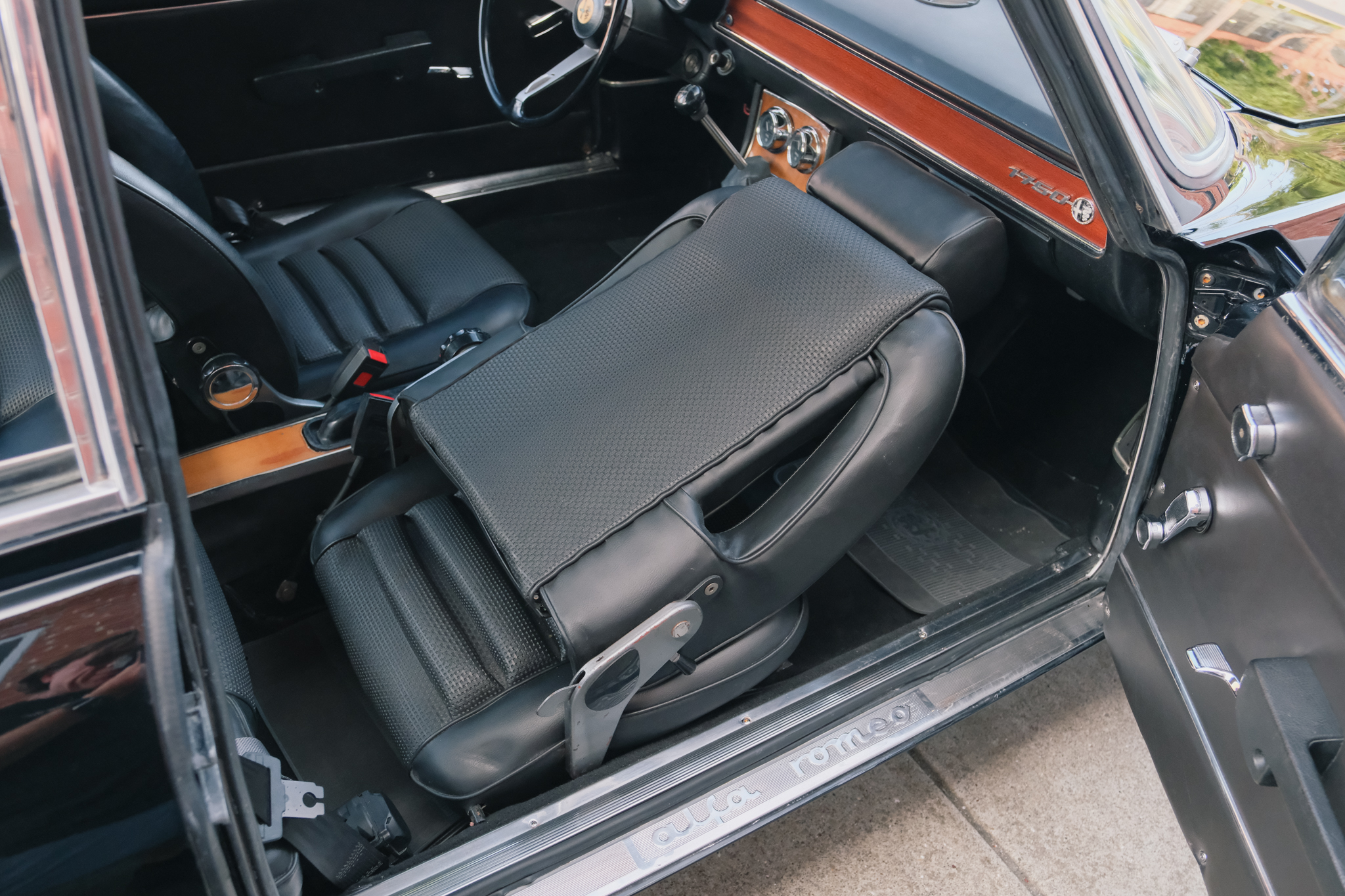 Finished in black, the car wears amber-lens fog lamps and rides on 14″ BWA basketweave wheels coupled with Koni shocks at all four corners. Inside, flying-buttress front seats trimmed in black vinyl are accompanied by woodgrain trim and Veglia Borletti instrumentation. Power is provided by a 1,779cc twin-cam inline-four equipped with SPICA mechanical fuel injection, while shifting is through a five-speed manual transmission.