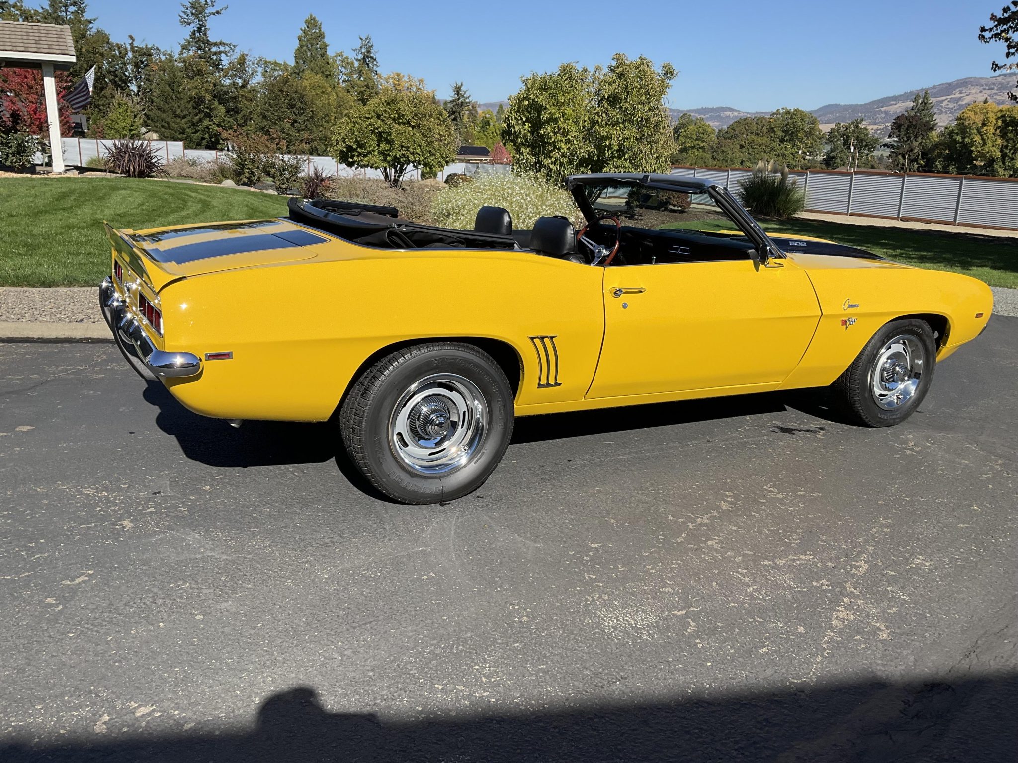 This 1969 Chevrolet Camaro convertible was refurbished circa 2015 with work that included repainting the body in yellow with black stripes as well as installing a 502ci V8 crate engine and a five-speed manual transmission. Additional modifications include an MSD Atomic electronic fuel injection system, MSD ignition, an Edelbrock aluminum intake manifold, aluminum cylinder heads, and an aluminum radiator with dual electric fans as well as power rack-and-pinion steering, hydroboost-assisted front disc brakes, and coated headers feeding into a dual exhaust system. Inside, the front bucket seats are trimmed in black vinyl and accompanied by a center console, a Custom Autosound stereo unit, and aftermarket air conditioning. The car is also equipped with a black soft top, a cowl hood, rear bumper guards, and front and rear spoilers.