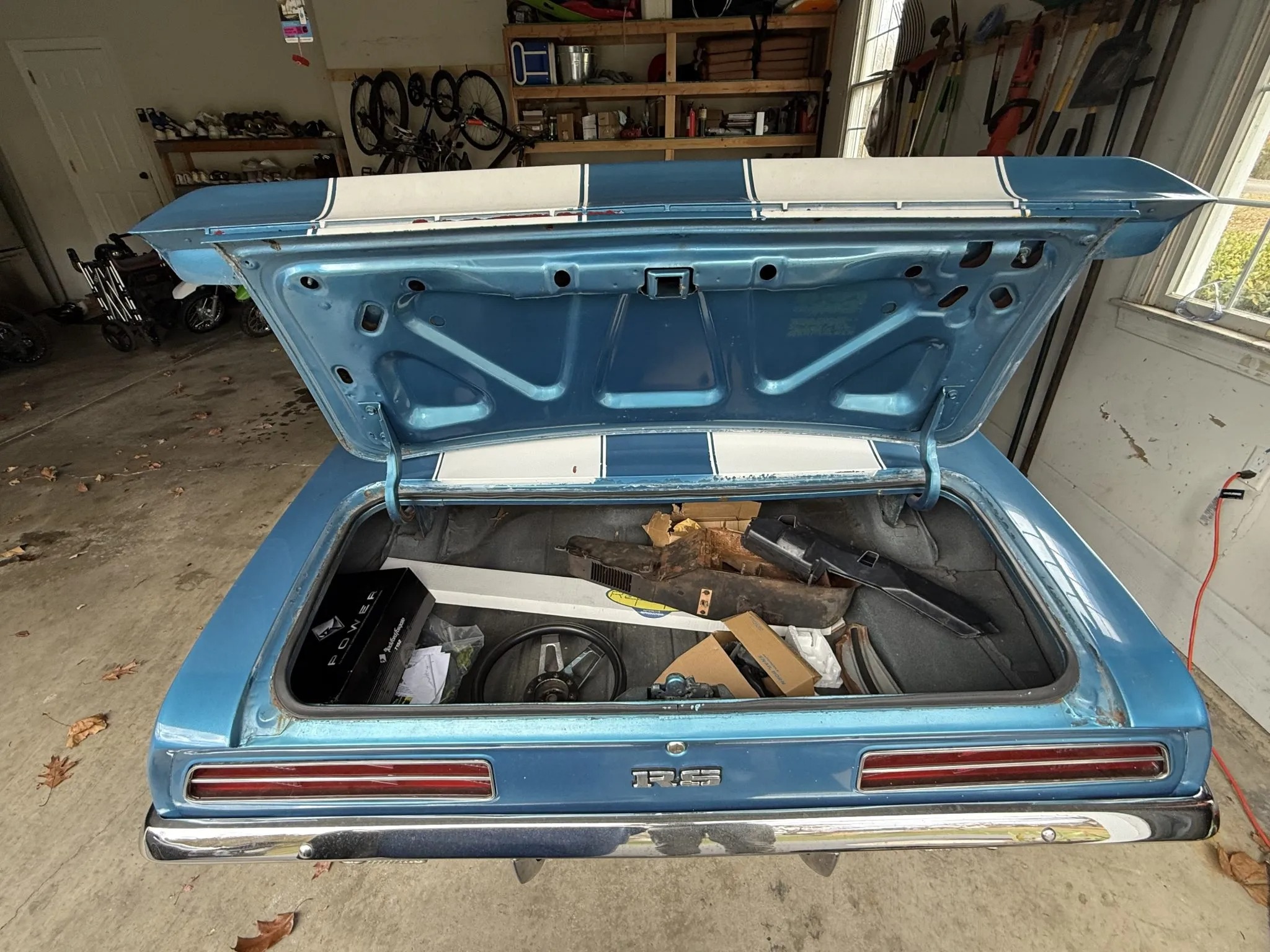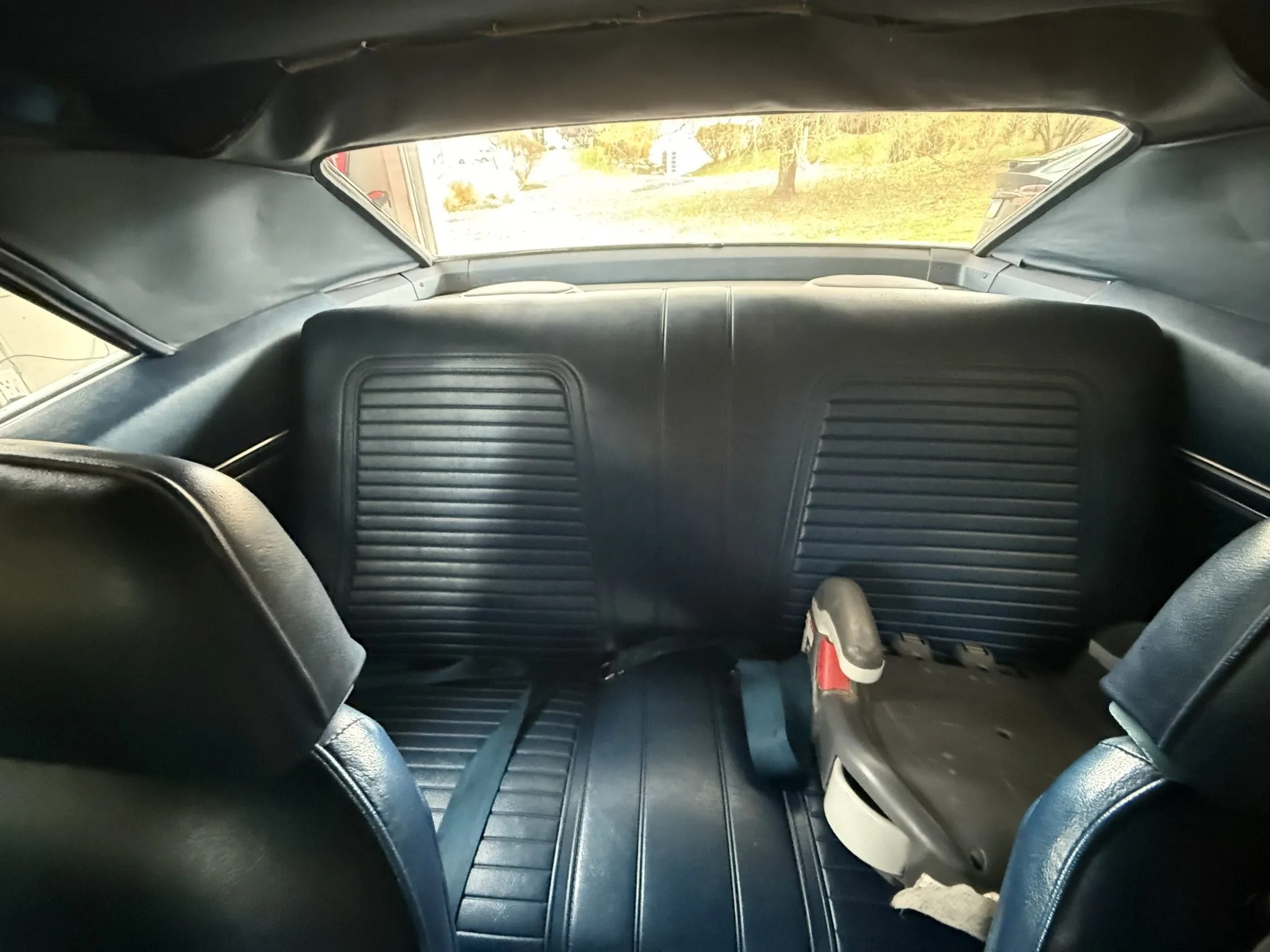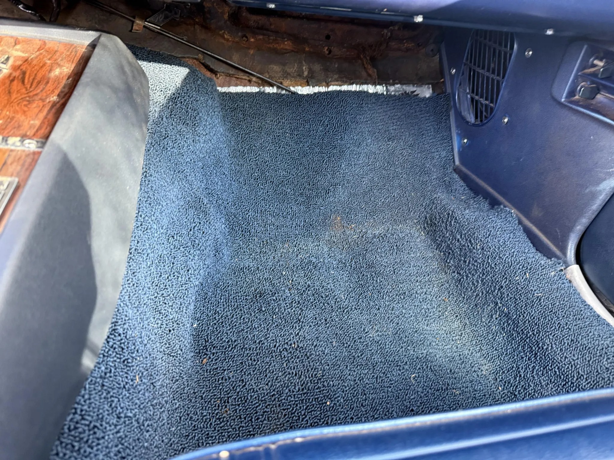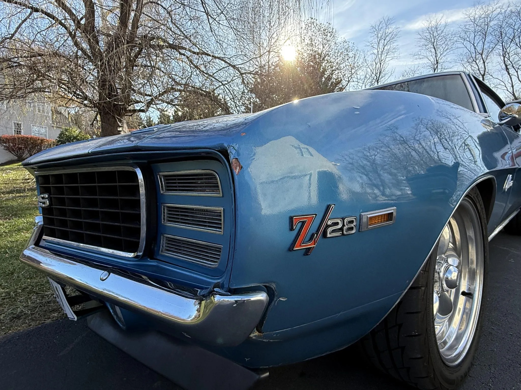 This 1969 Chevrolet Camaro coupe is powered by a 350ci V8 equipped with an Edelbrock carburetor and an HEI distributor and linked to a four-speed manual transmission. The body is finished in blue with white stripes and features a cowl hood, front and rear spoilers, and an RS-style front grille with electric hideaway headlight doors. Inside, the front bucket seats and rear bench are trimmed in dark blue vinyl and accompanied by a center console, a Hurst shifter, a Kenwood stereo, and AutoMeter Cobalt gauges. Ridetech suspension components have been installed along with Wilwood drilled and slotted front disc brakes and polished 17″ American Racing Torq Thrust wheels.