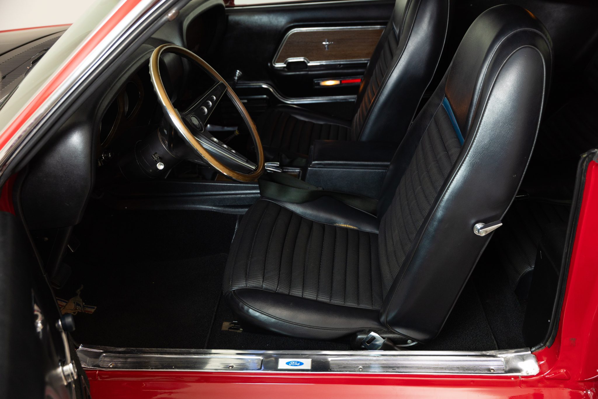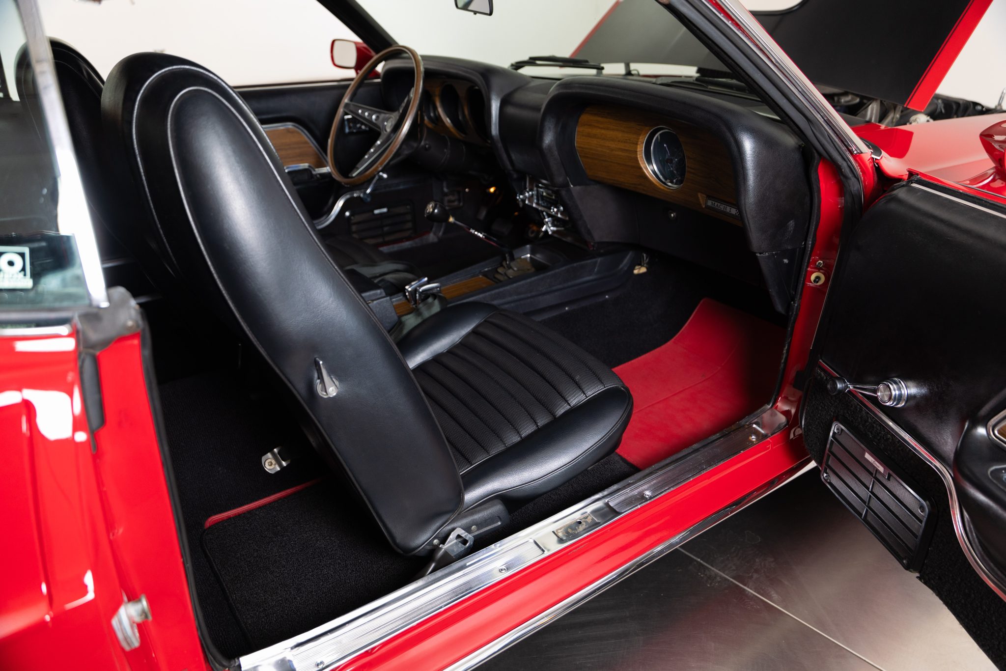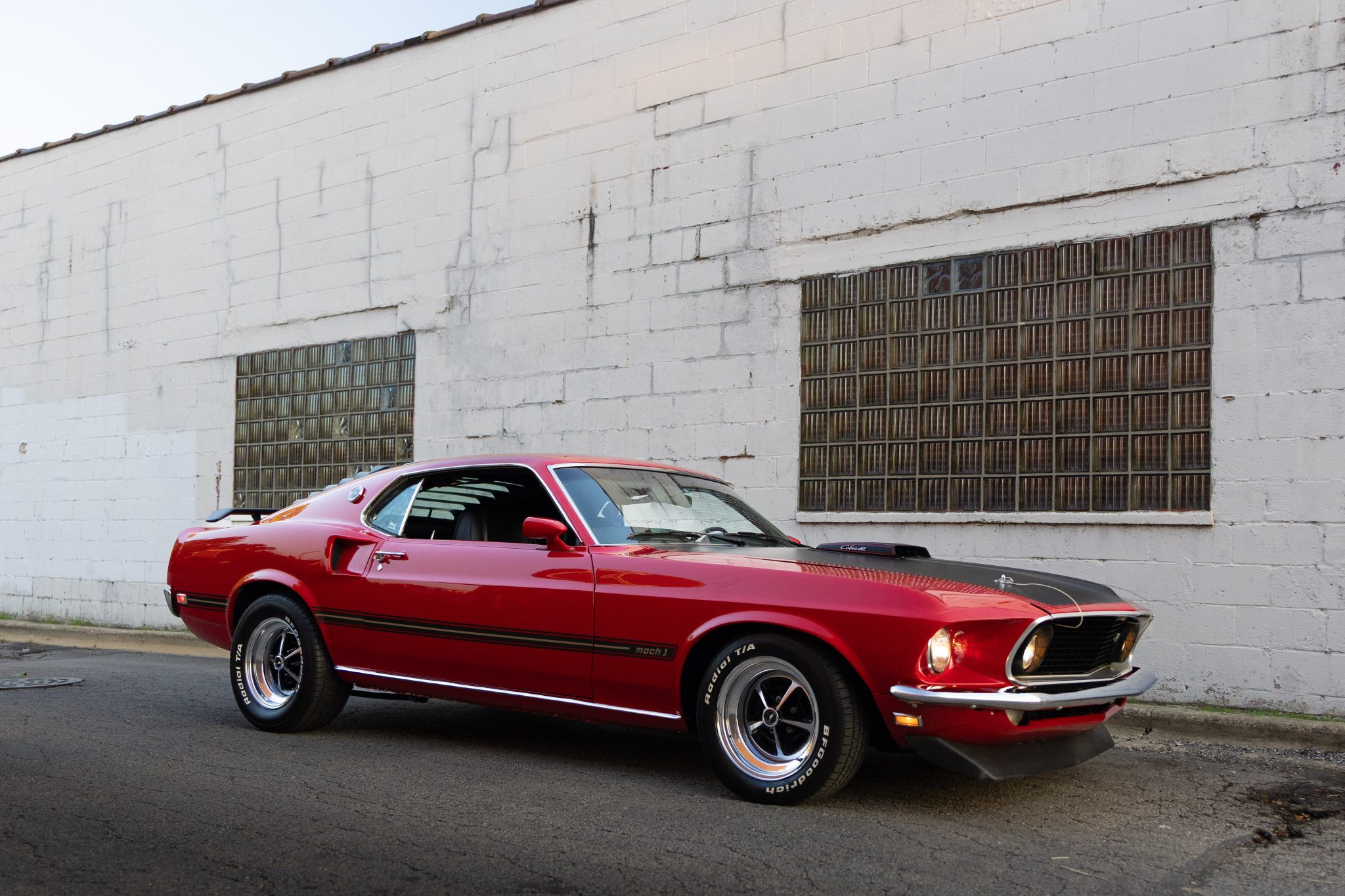 This 1969 Ford Mustang Mach 1 was specified with a 428ci Cobra Jet Ram-Air V8 linked to a four-speed close-ratio manual transmission and an optional 3.91 Traction-Lok differential, the latter of which added the later-optional Drag Pack equipment. The car was further ordered with Candyapple Red paintwork, a black interior, a Sport Deck rear seat, power-assisted front disc brakes and power steering, a tilt-away wheel, deluxe belts, and tinted glass.