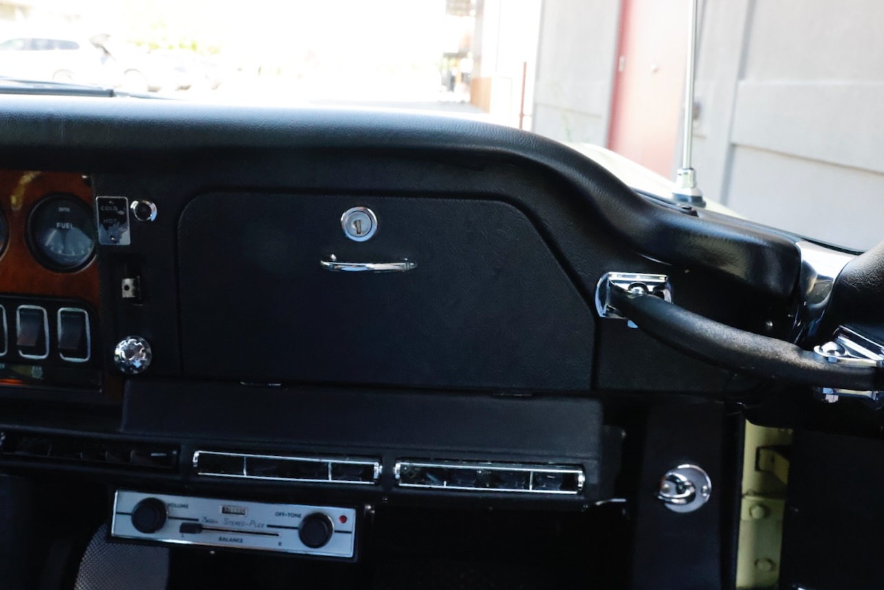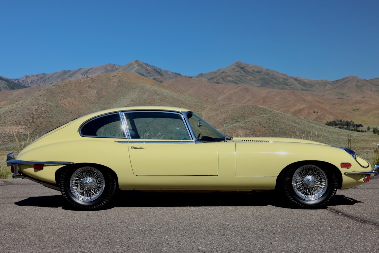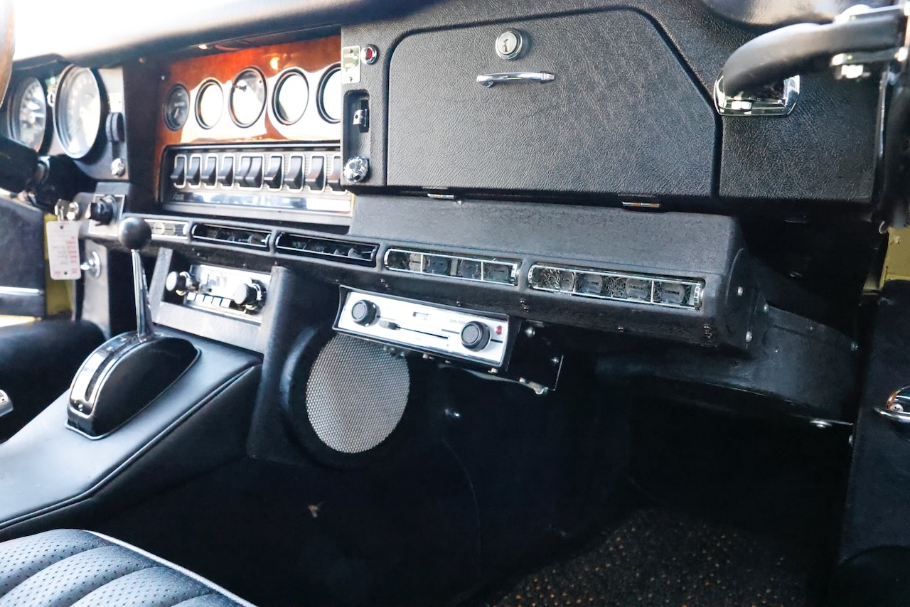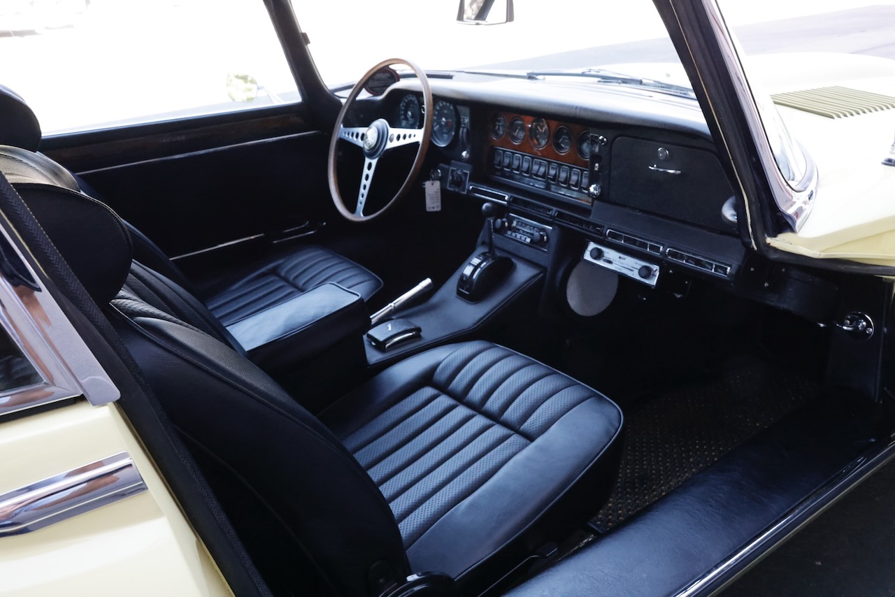 This 1969 Jaguar XKE Series II 2+2 is finished in Pale Primrose over black and is powered by a 4.2-liter inline-six linked with a three-speed automatic transmission and a limited-slip differential. Equipment includes a louvered clamshell hood, four-wheel disc brakes, 15″ wire wheels, a wood-rimmed steering wheel, an AM/FM radio, and air conditioning.