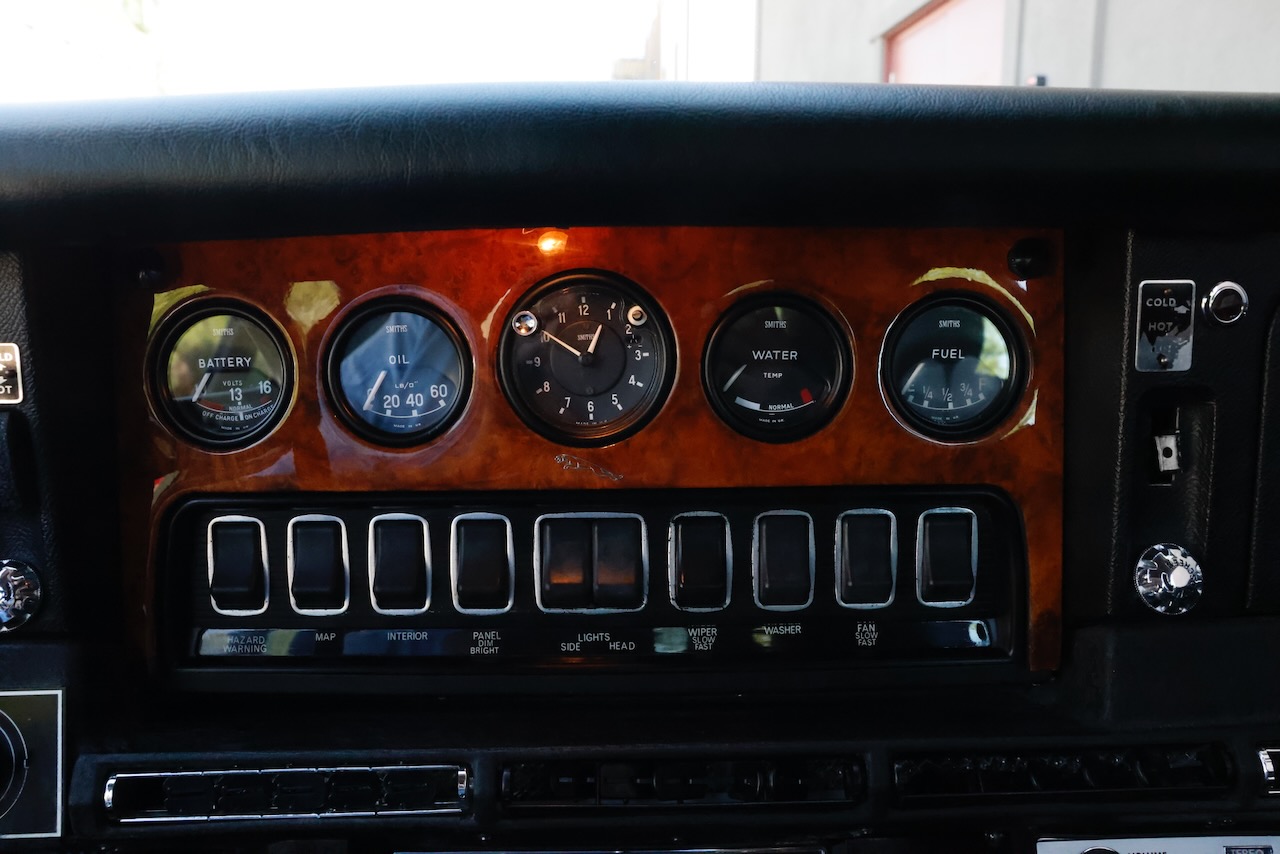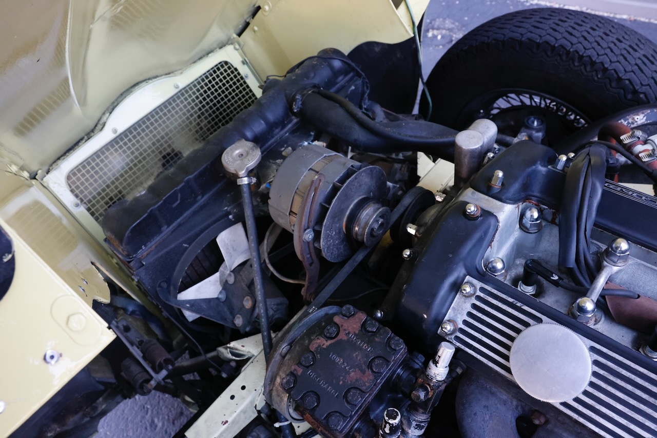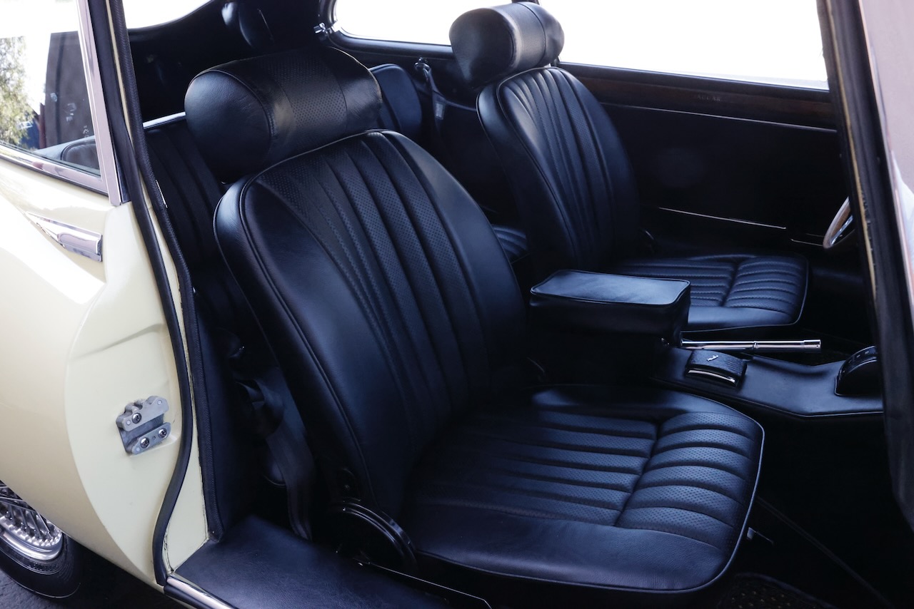 This 1969 Jaguar XKE Series II 2+2 is finished in Pale Primrose over black and is powered by a 4.2-liter inline-six linked with a three-speed automatic transmission and a limited-slip differential. Equipment includes a louvered clamshell hood, four-wheel disc brakes, 15″ wire wheels, a wood-rimmed steering wheel, an AM/FM radio, and air conditioning.
