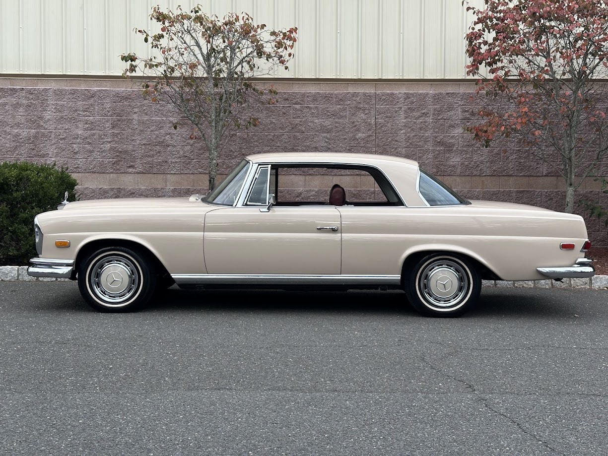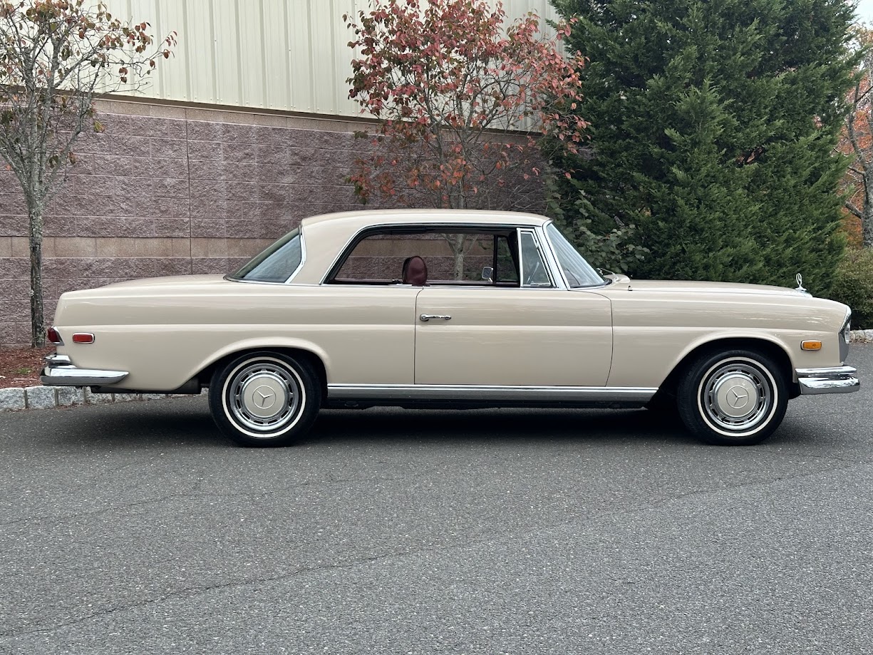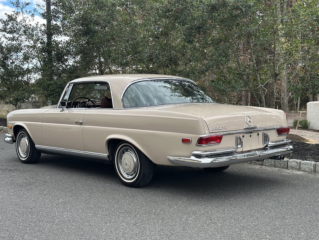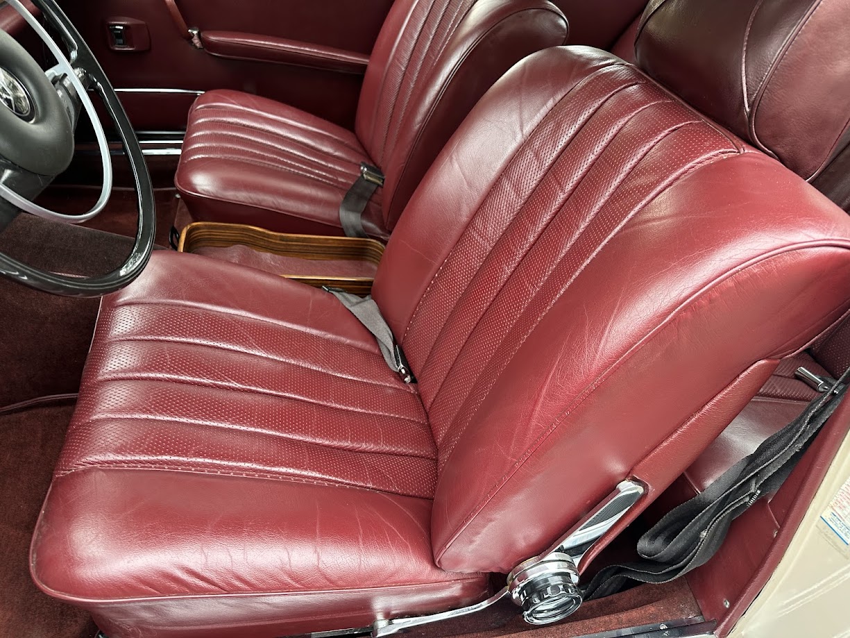 The car is finished in Light Beige over a red interior, and it is powered by a 2.8-liter inline-six paired with a four-speed automatic transmission. Additional equipment includes 14″ steel wheels with covers, disc brakes, US-specification headlights, power windows, and an aftermarket cassette stereo. This W111 coupe