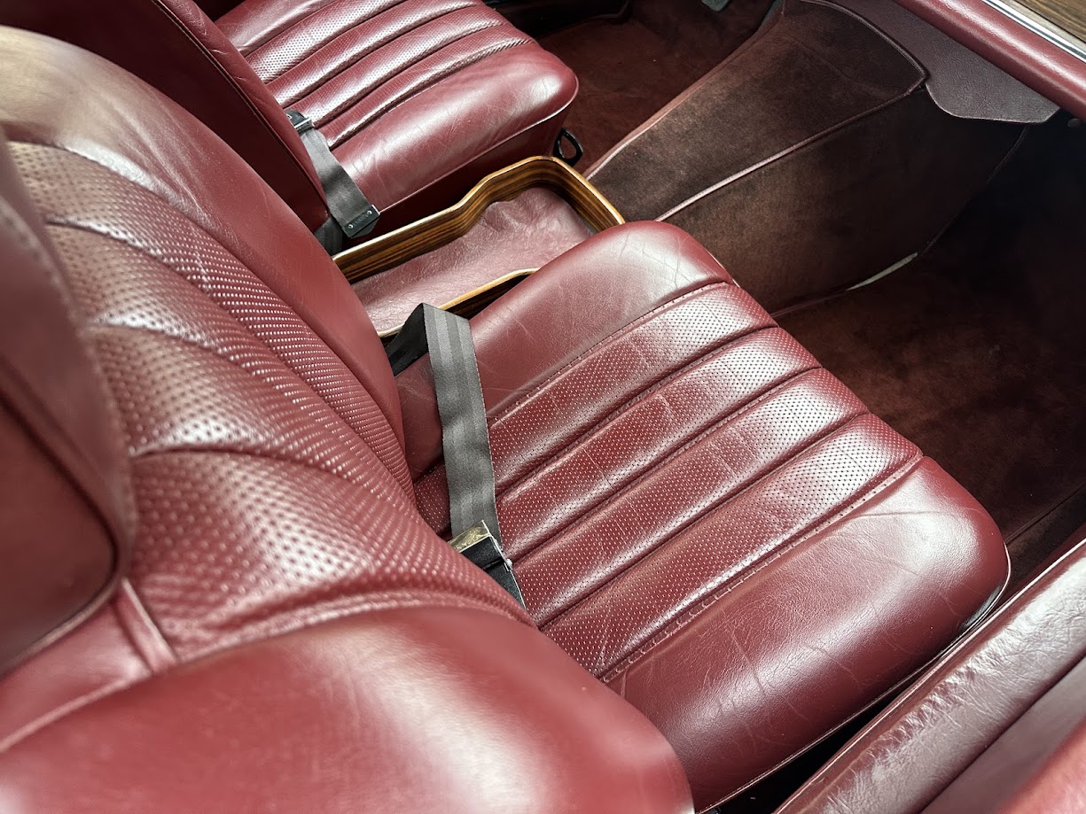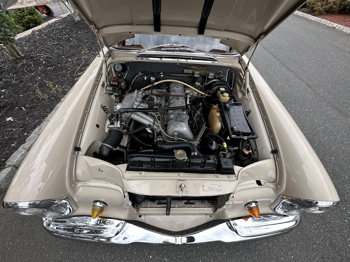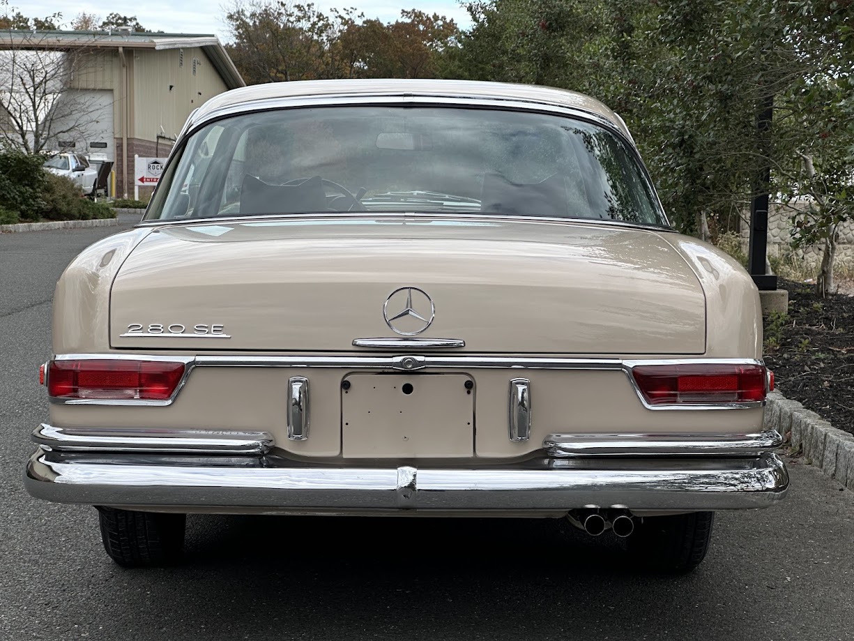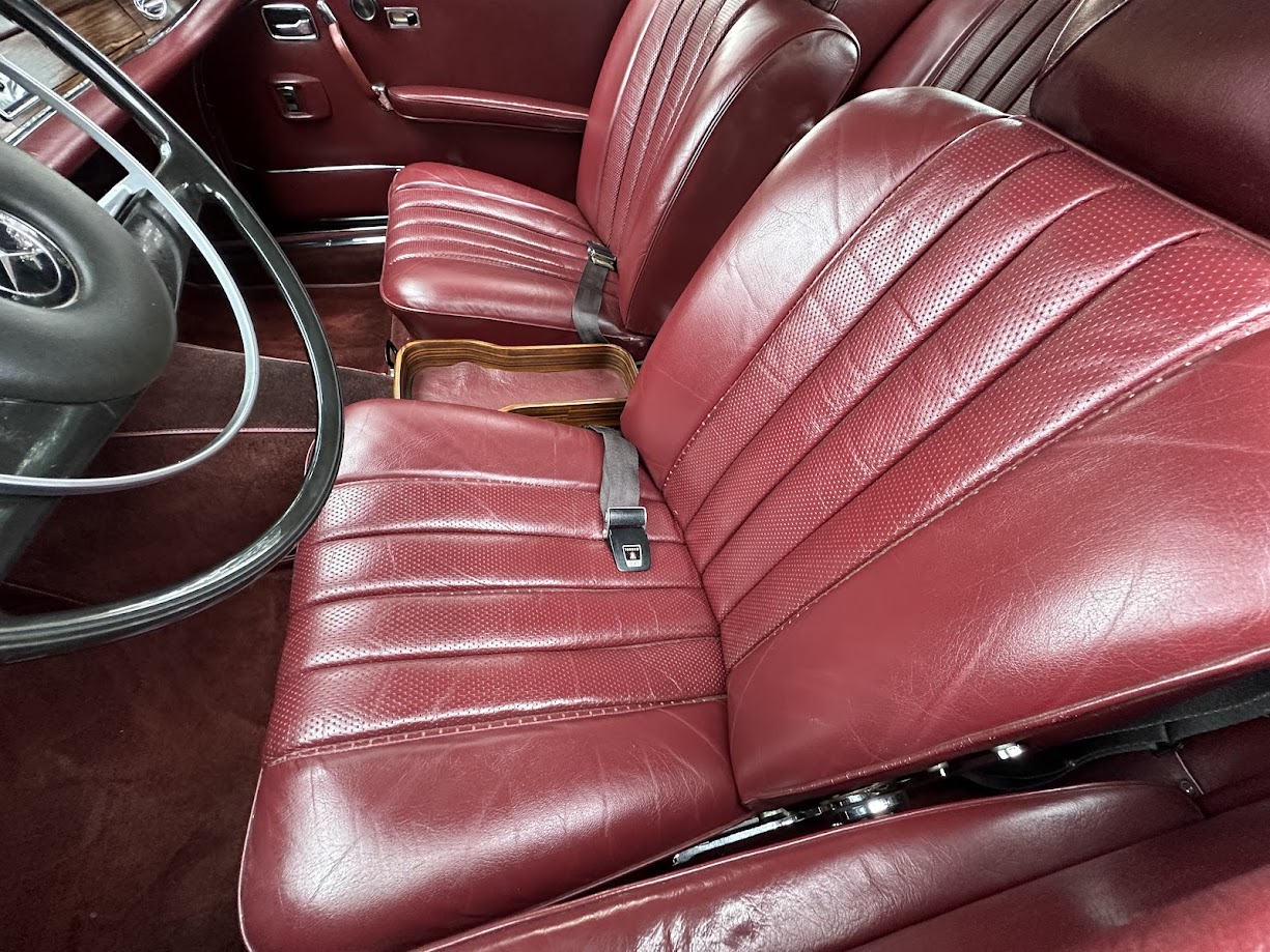 The car is finished in Light Beige over a red interior, and it is powered by a 2.8-liter inline-six paired with a four-speed automatic transmission. Additional equipment includes 14″ steel wheels with covers, disc brakes, US-specification headlights, power windows, and an aftermarket cassette stereo. This W111 coupe