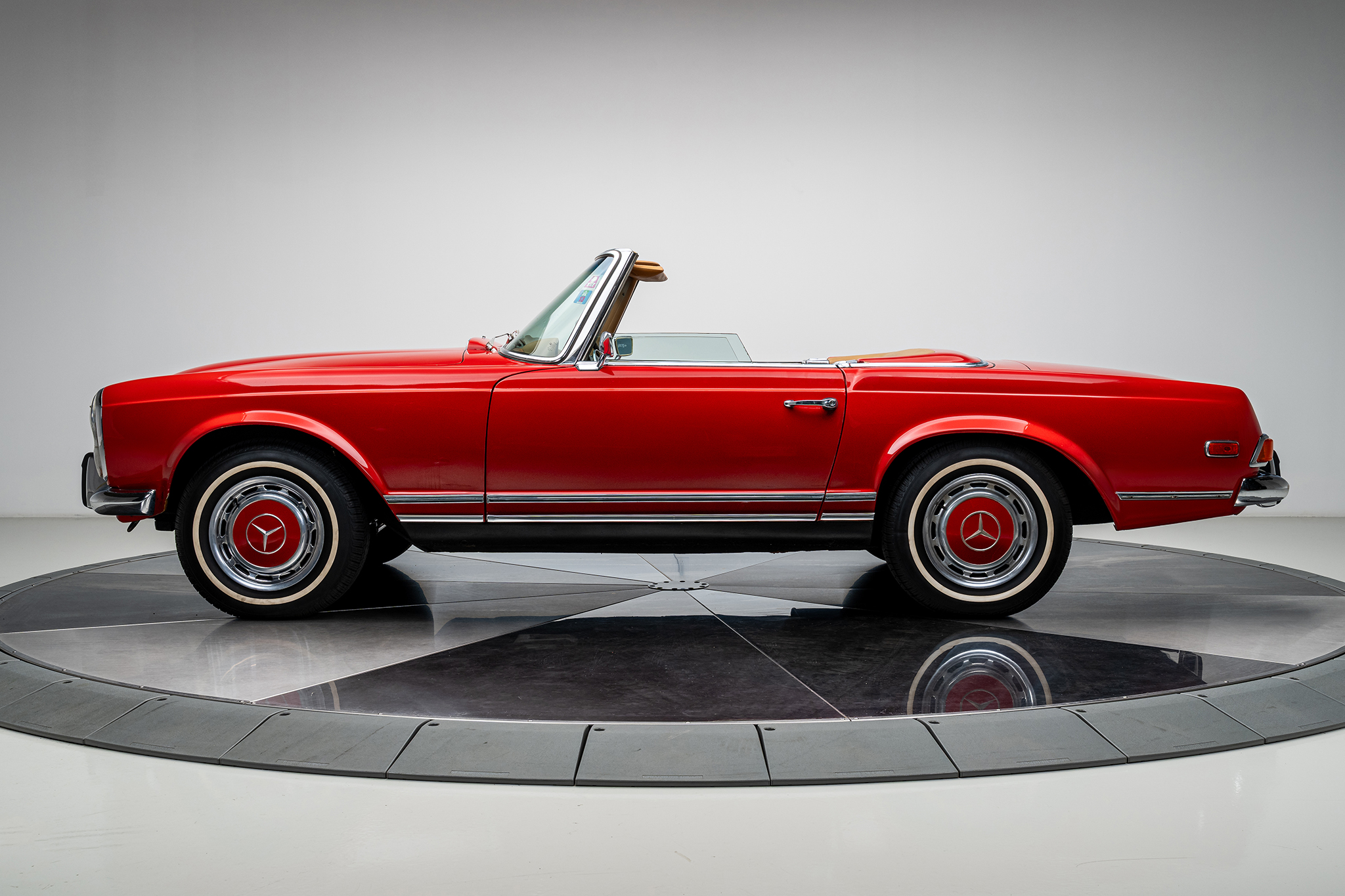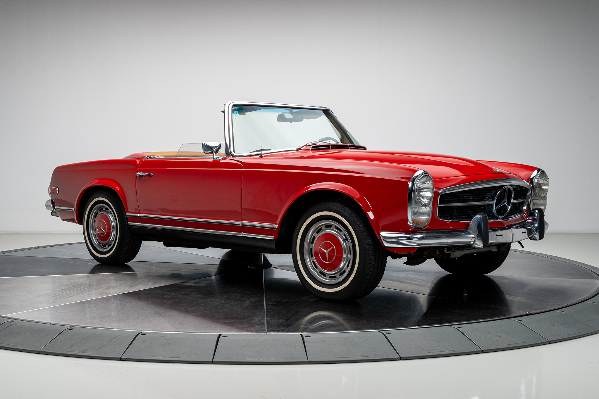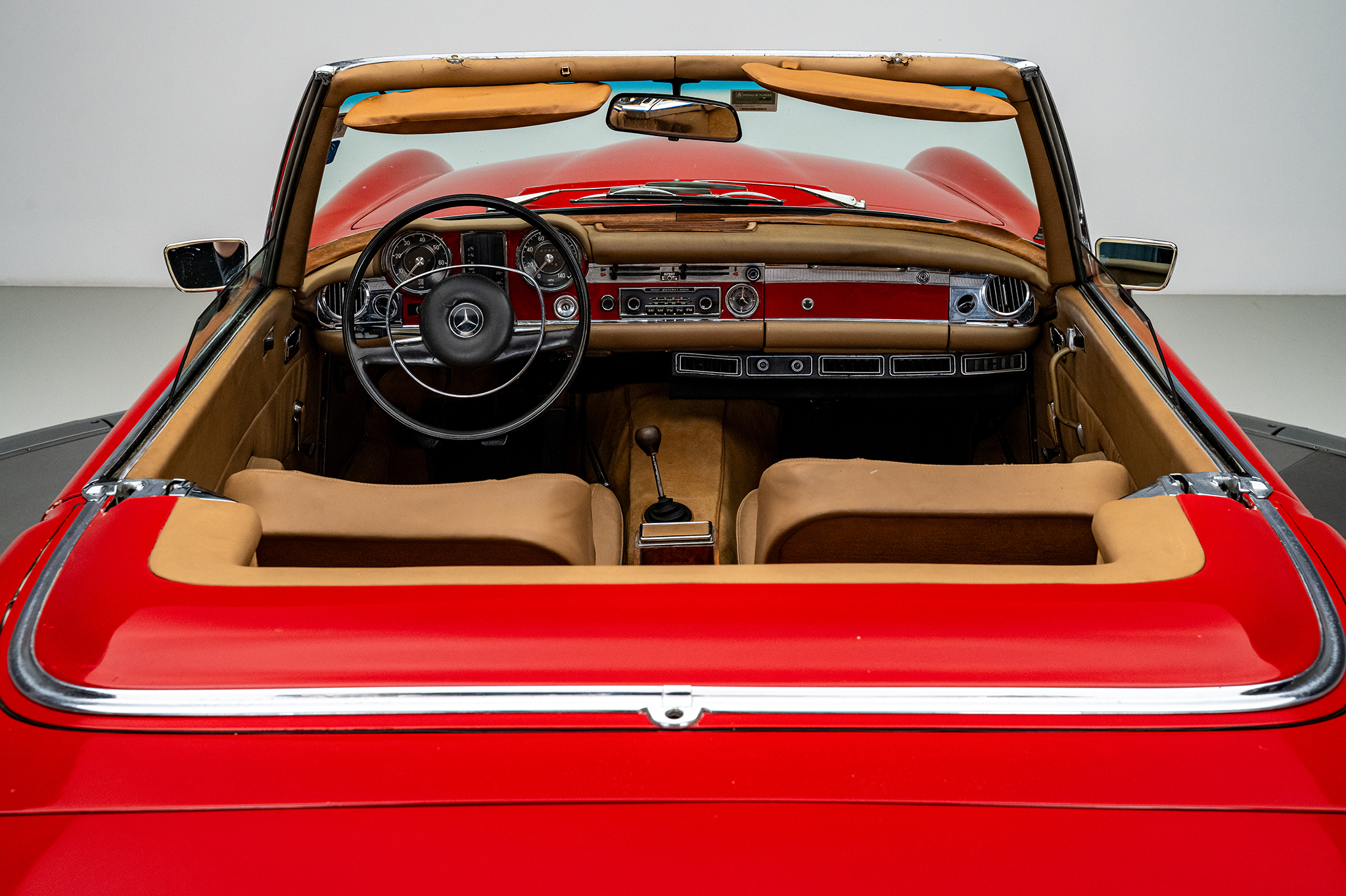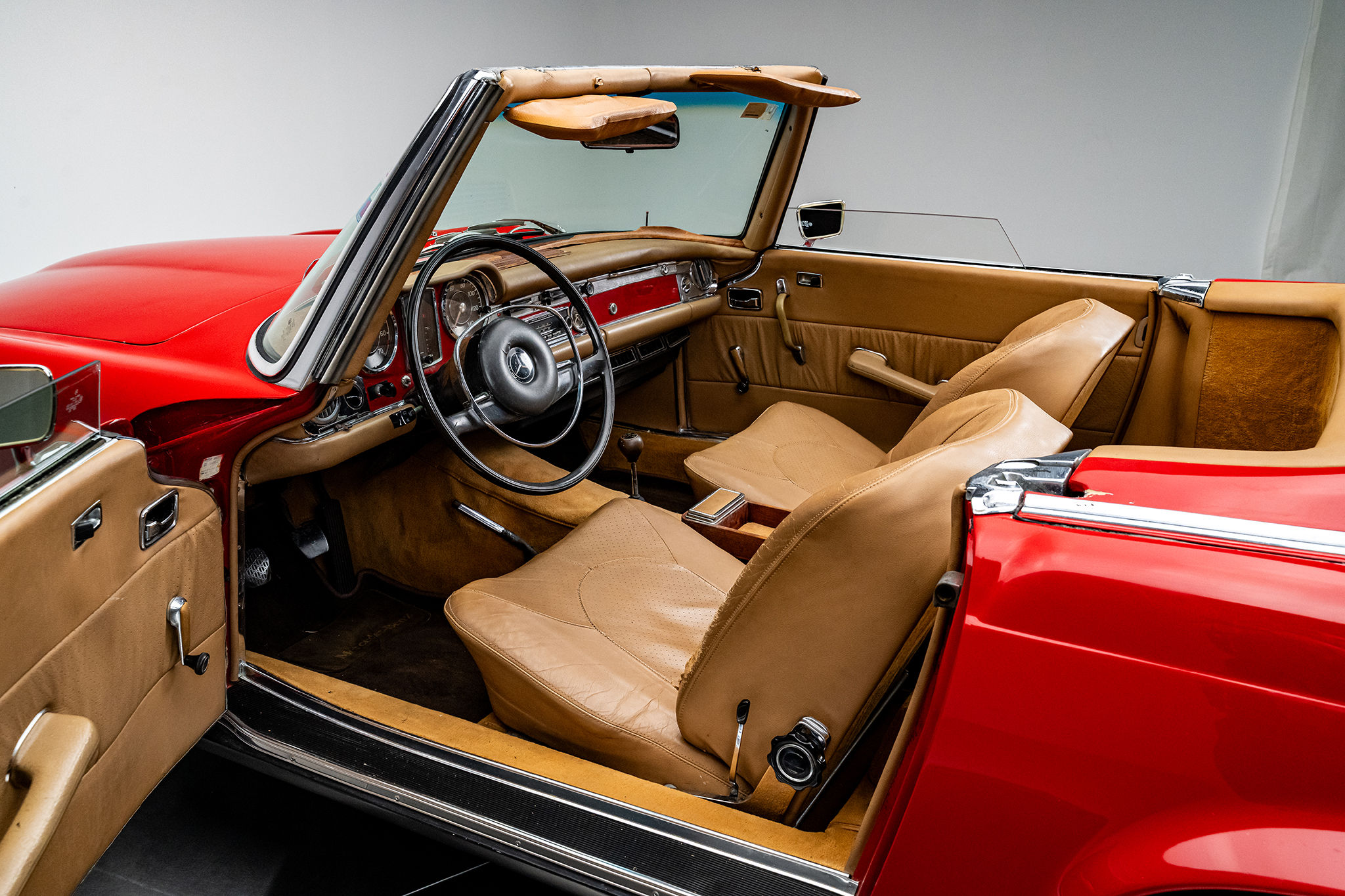 This 1969 Mercedes-Benz 280SL is powered by a 2.8-liter inline-six paired with a four-speed manual transmission and is finished in red over beige leather. It is equipped with a replacement black convertible top, a removable hardtop, power steering, and 14″ steel wheels.