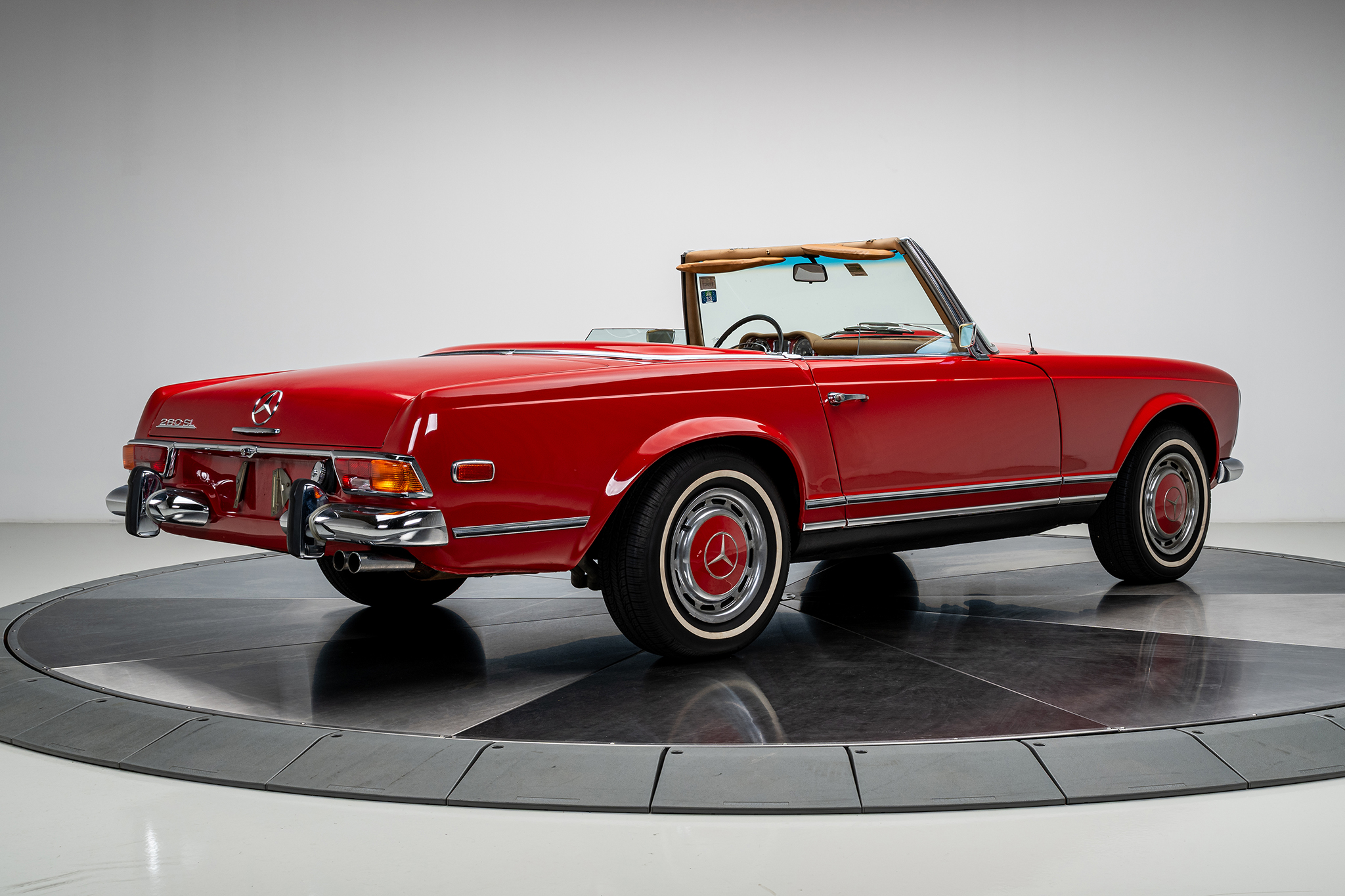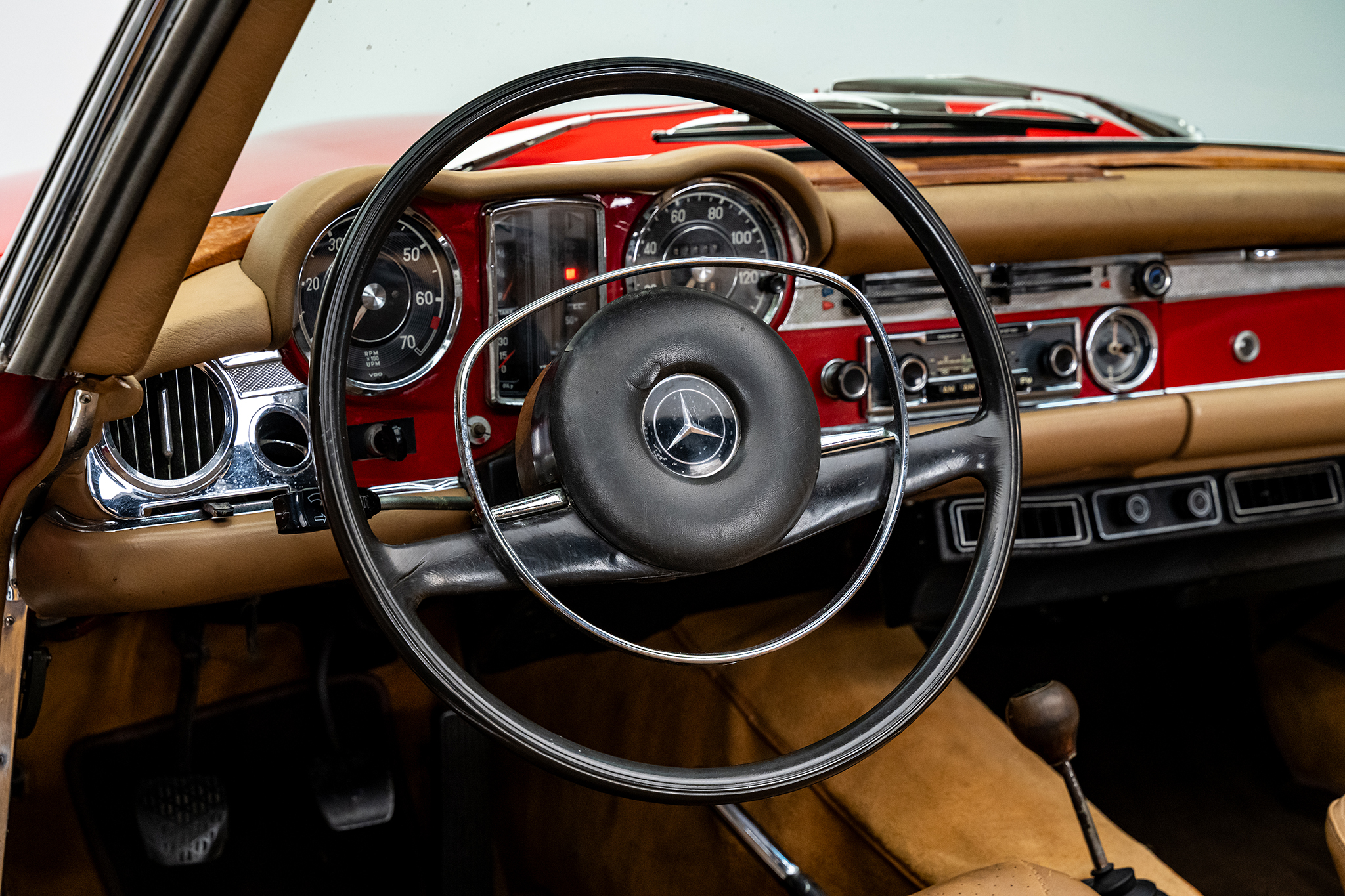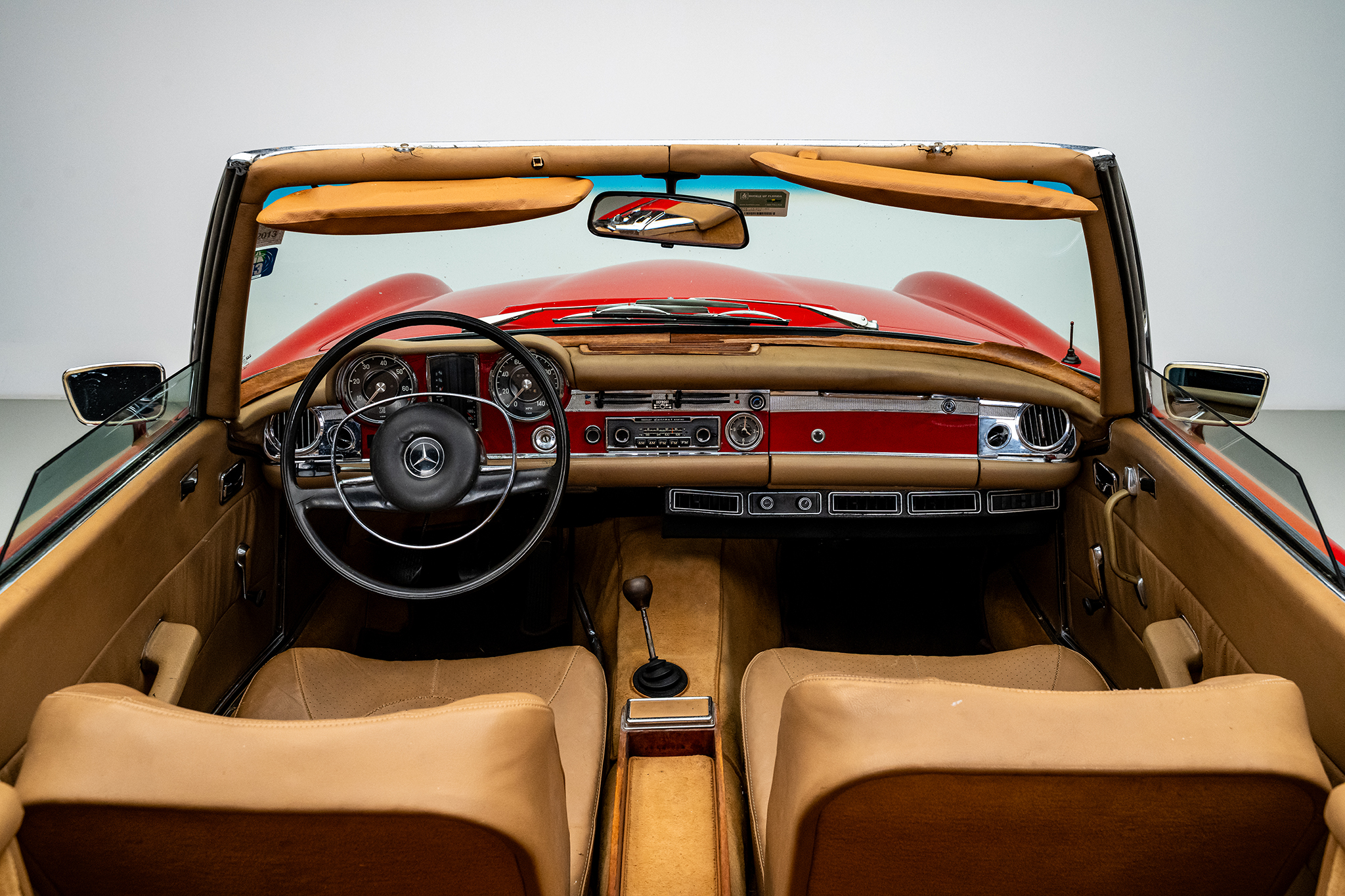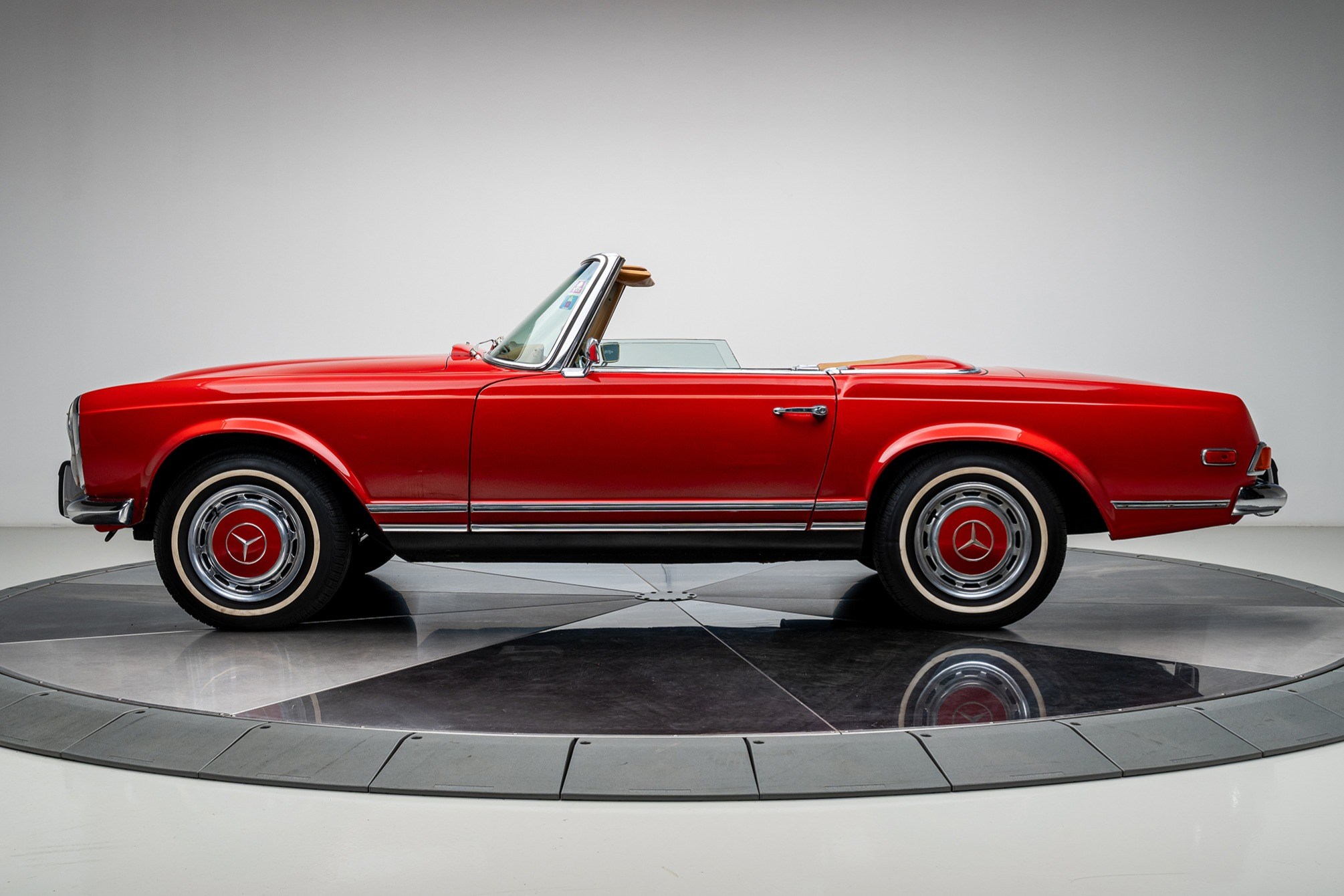 This 1969 Mercedes-Benz 280SL is powered by a 2.8-liter inline-six paired with a four-speed manual transmission and is finished in red over beige leather. It is equipped with a replacement black convertible top, a removable hardtop, power steering, and 14″ steel wheels.