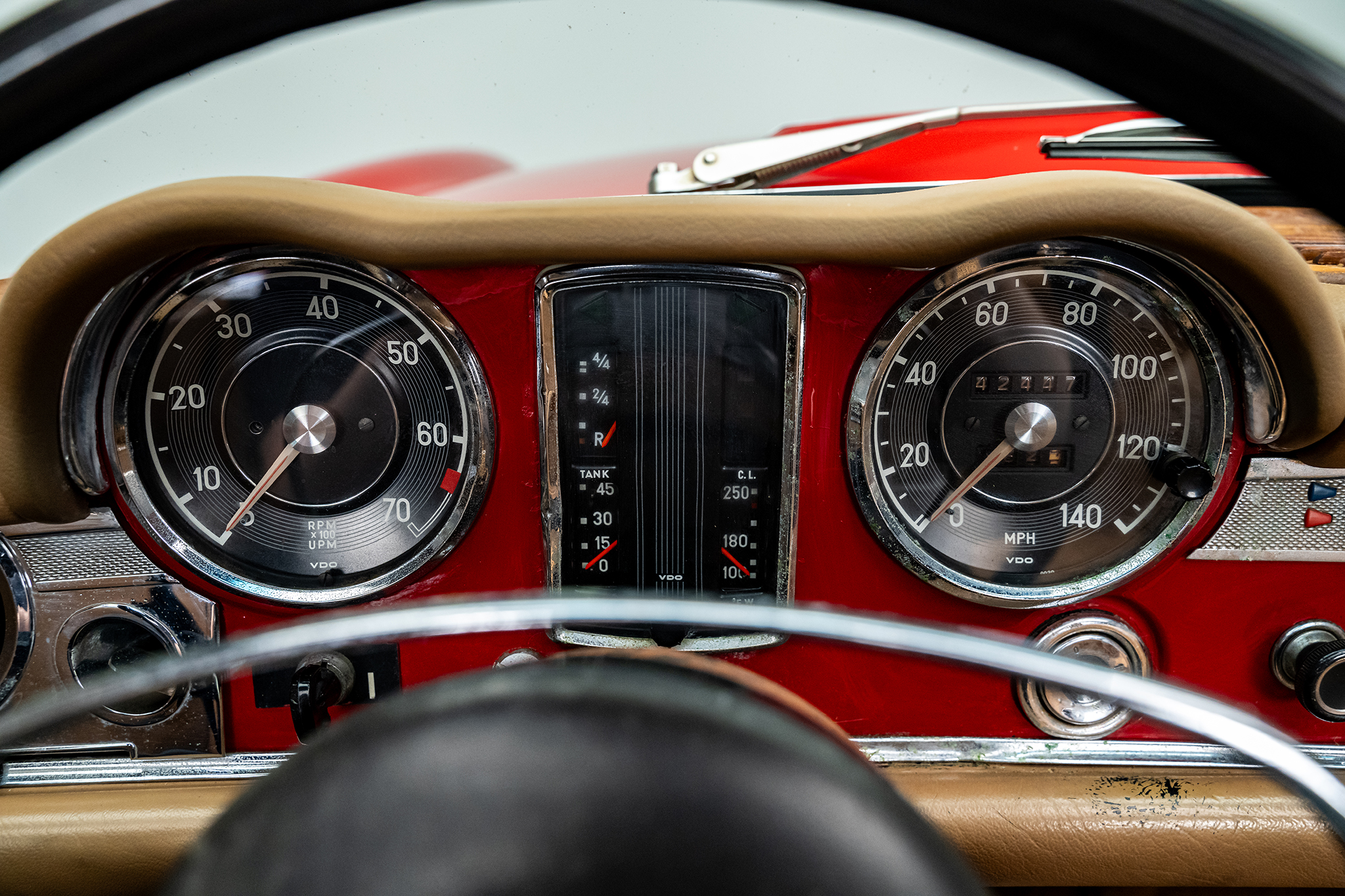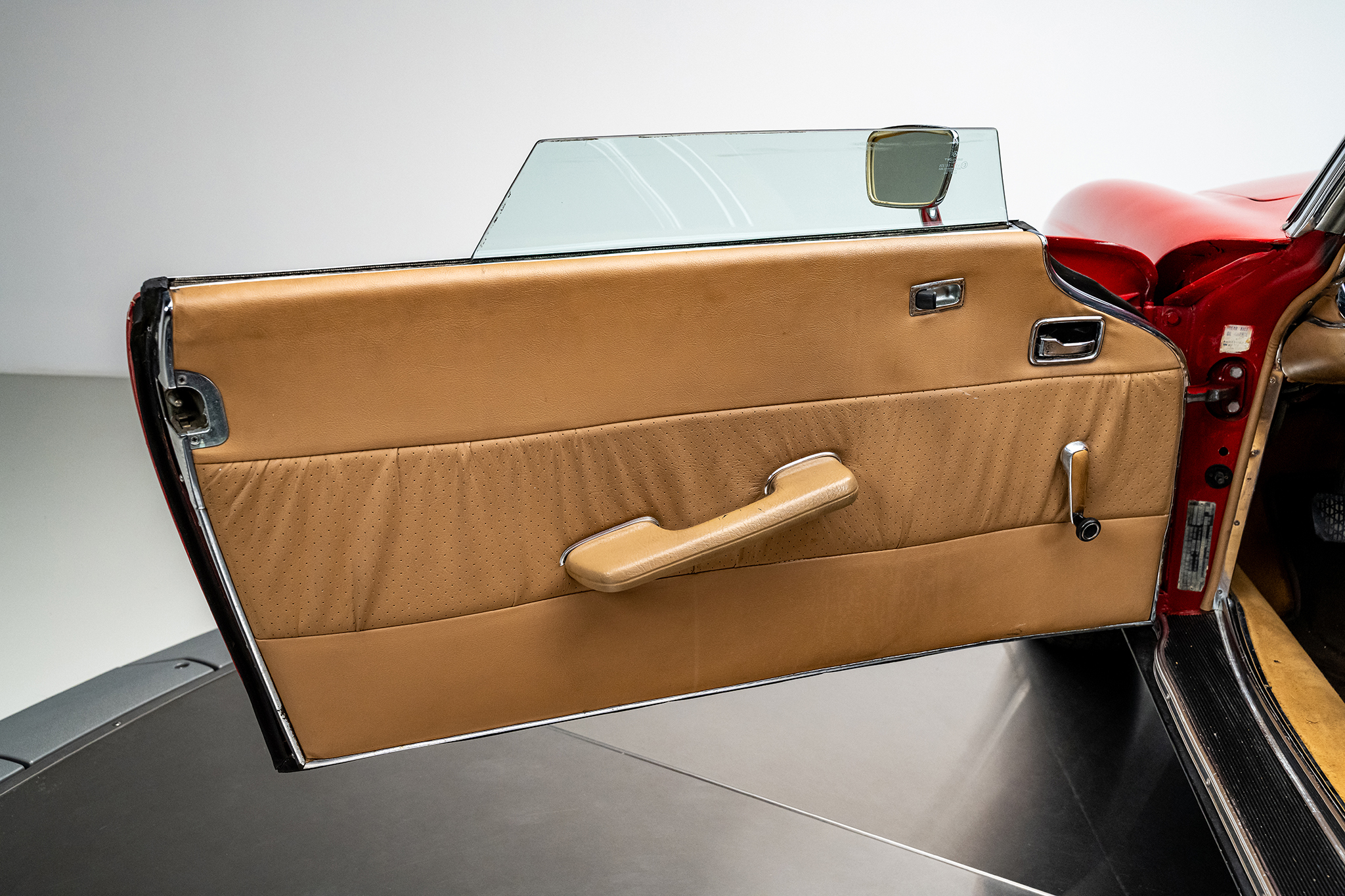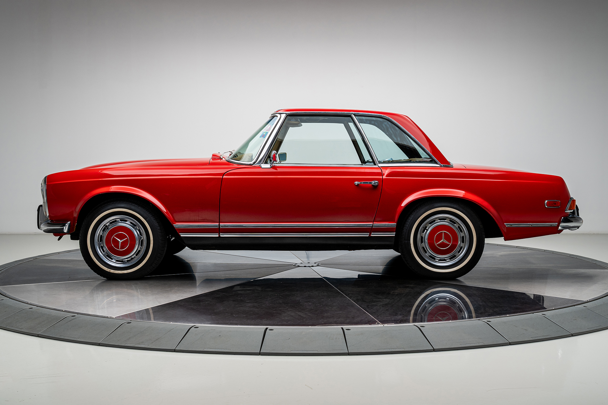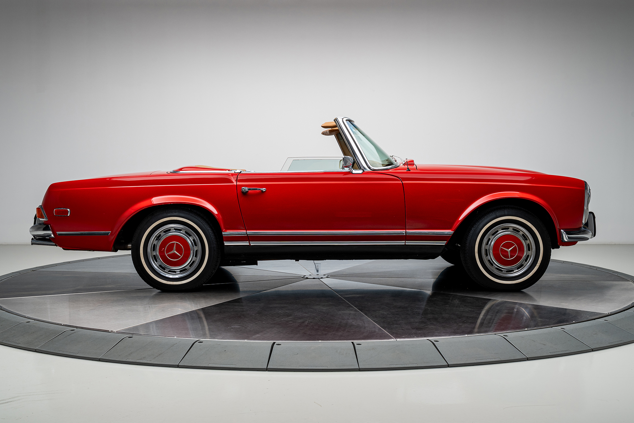 This 1969 Mercedes-Benz 280SL is powered by a 2.8-liter inline-six paired with a four-speed manual transmission and is finished in red over beige leather. It is equipped with a replacement black convertible top, a removable hardtop, power steering, and 14″ steel wheels.