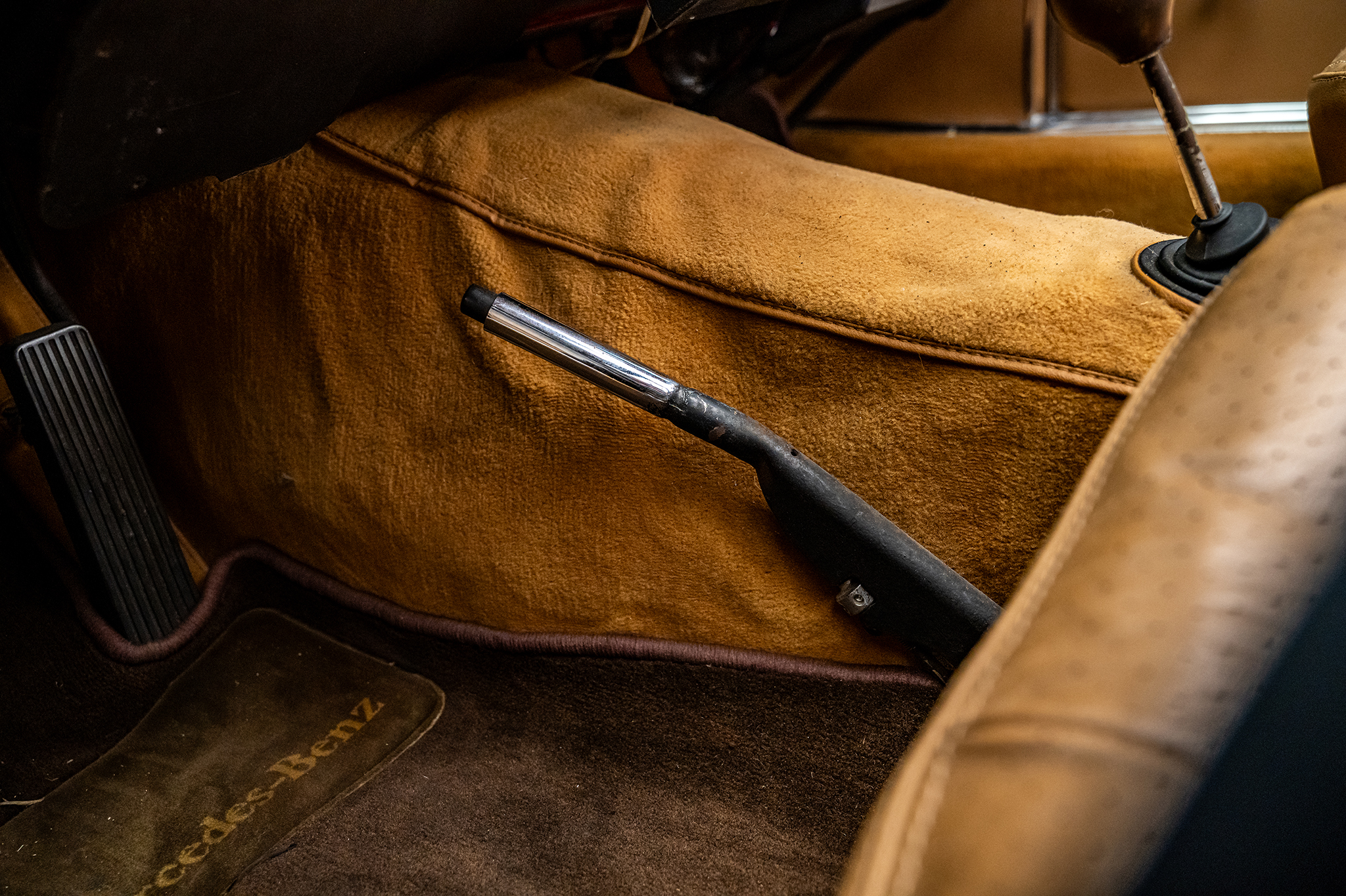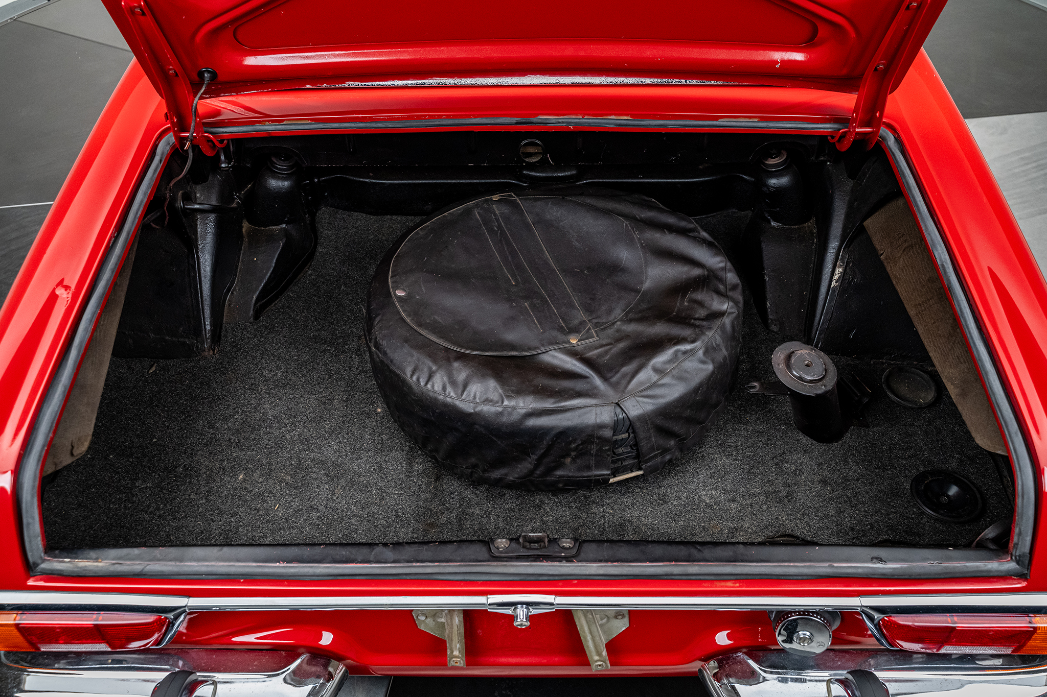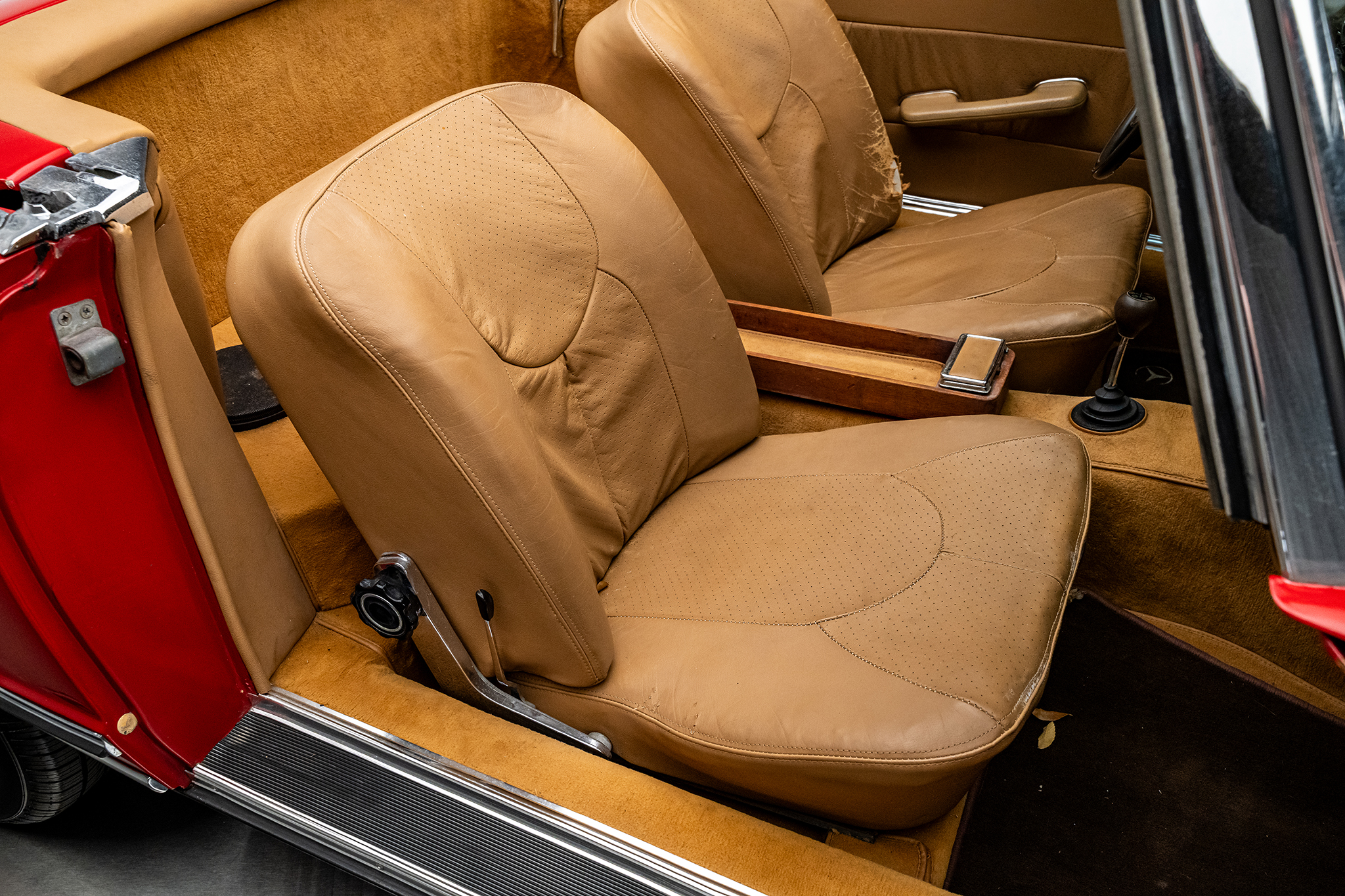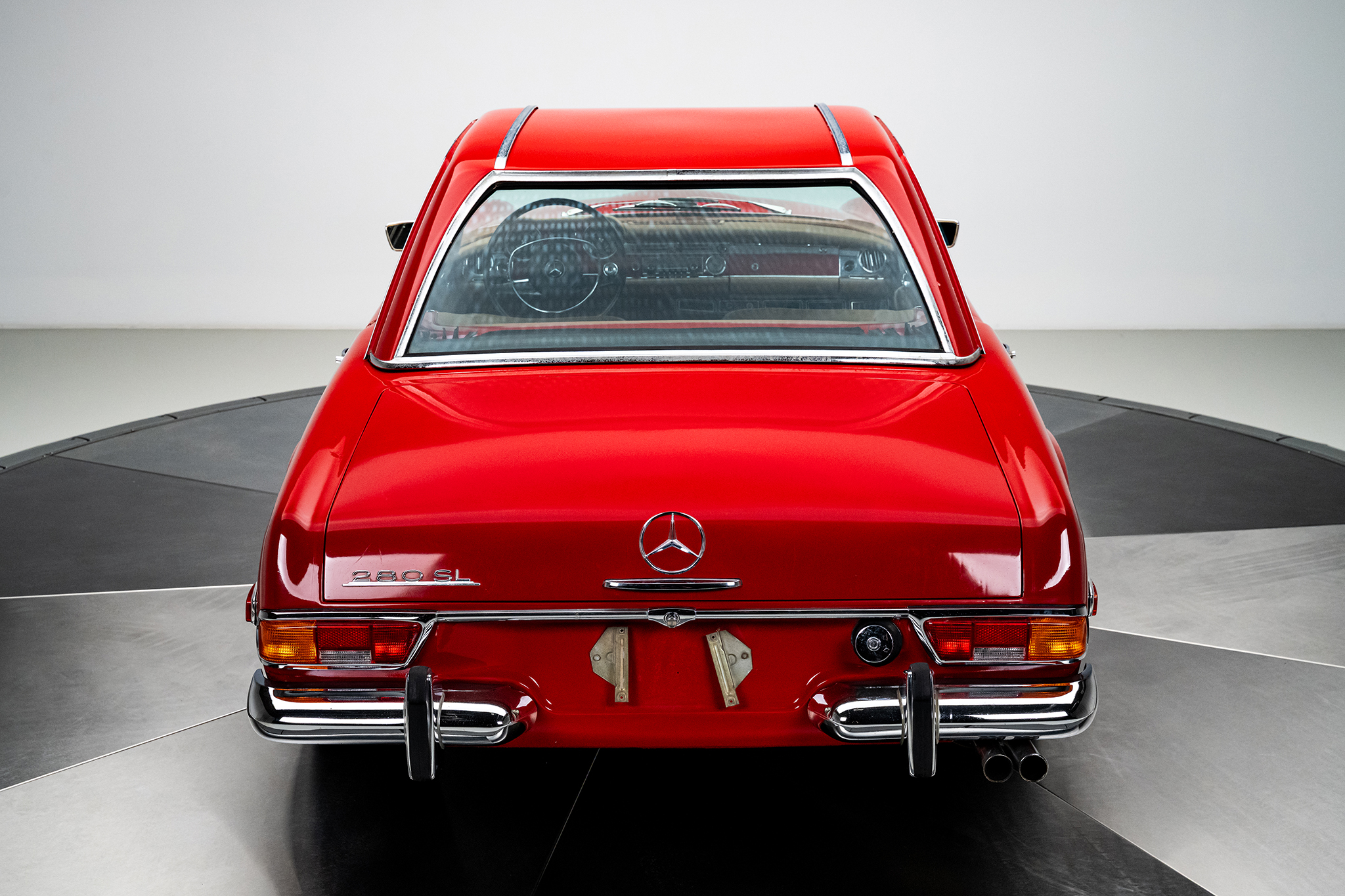 This 1969 Mercedes-Benz 280SL is powered by a 2.8-liter inline-six paired with a four-speed manual transmission and is finished in red over beige leather. It is equipped with a replacement black convertible top, a removable hardtop, power steering, and 14″ steel wheels.
