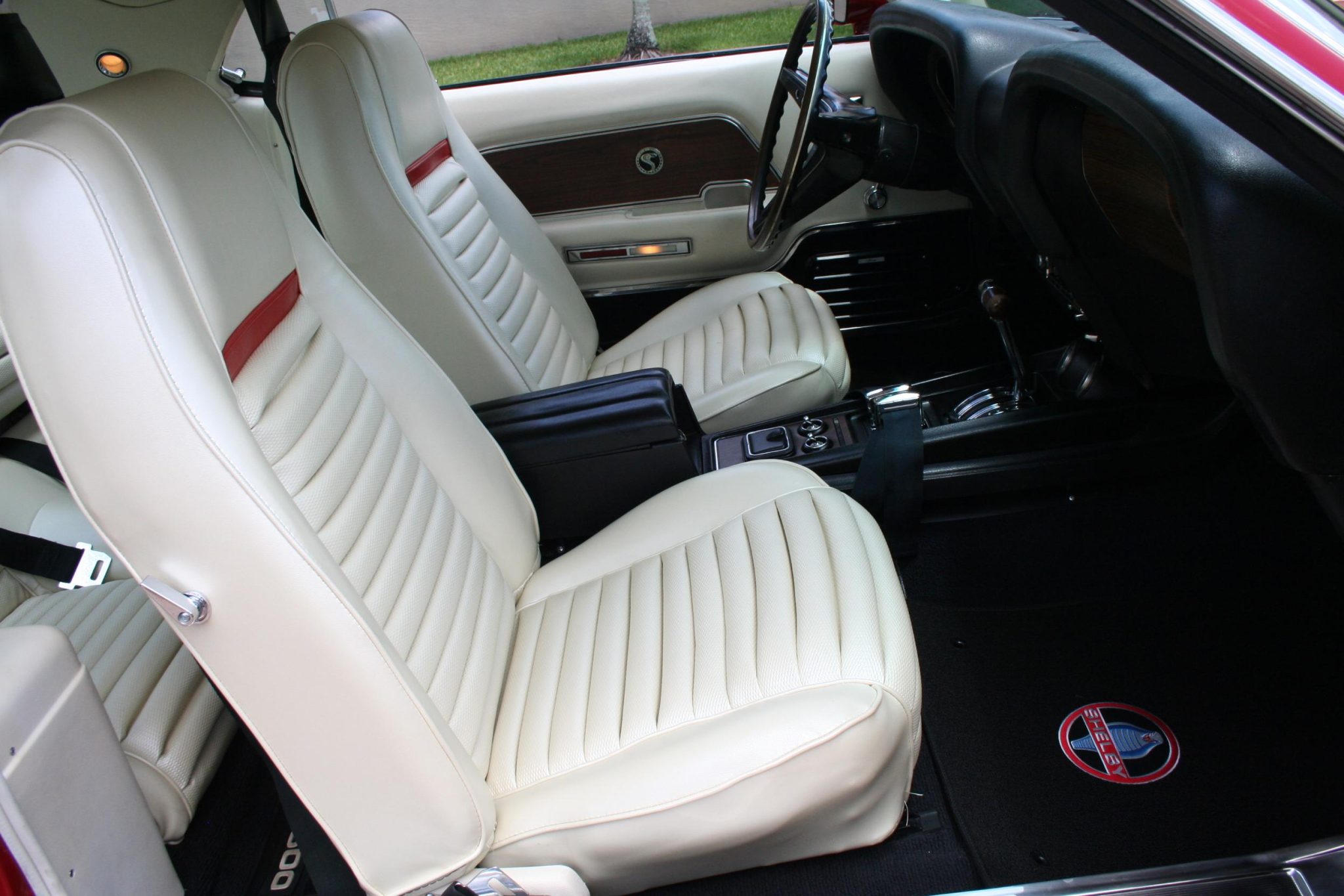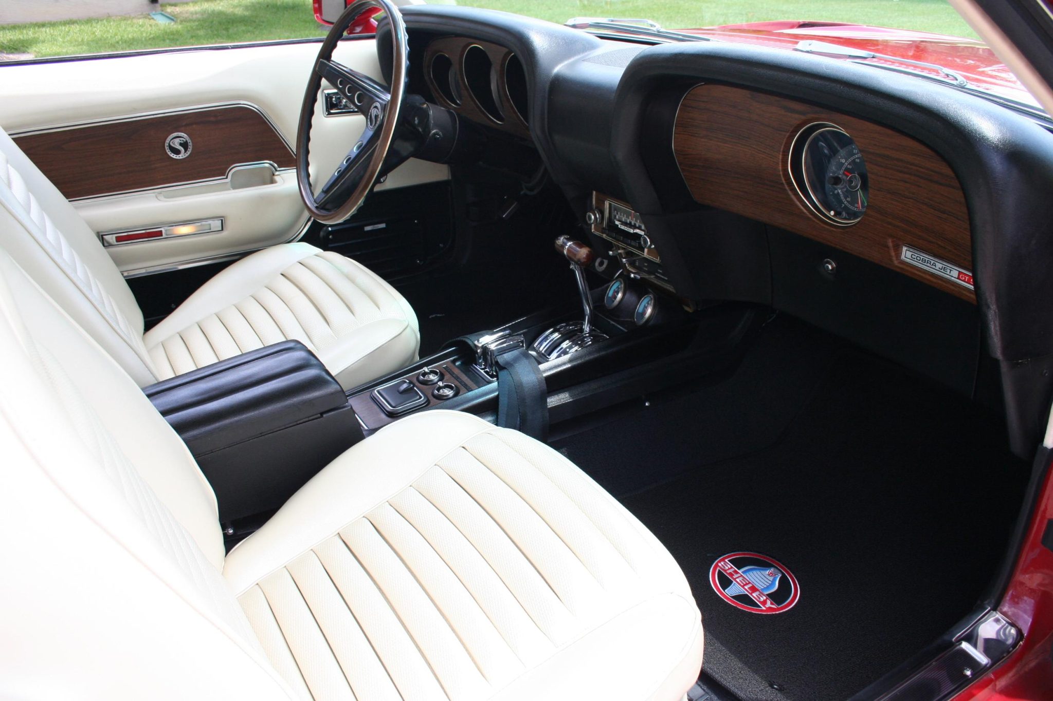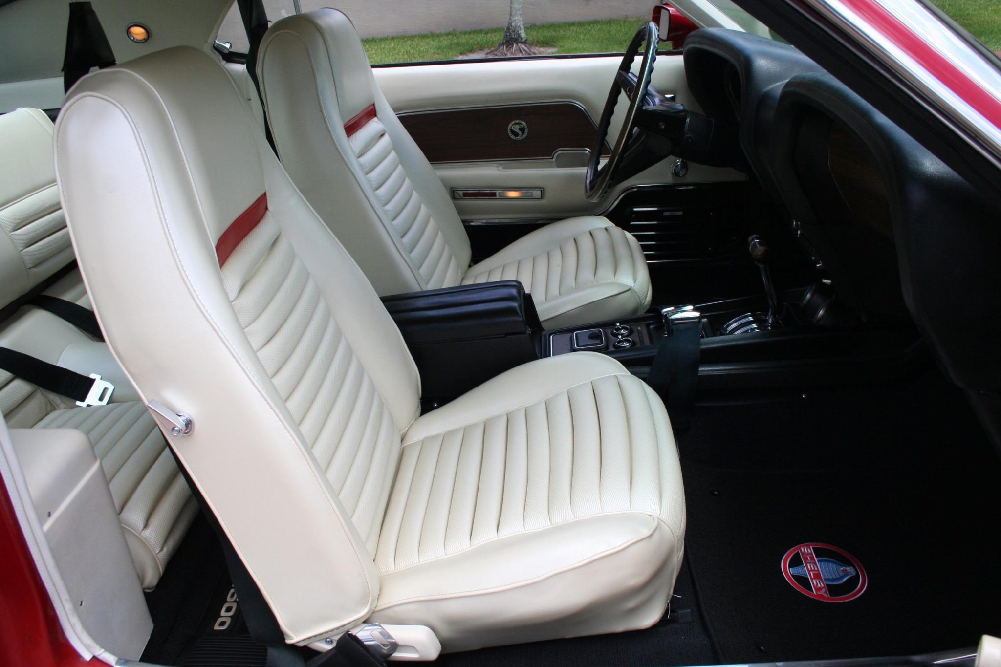 This 1969 Shelby GT500 is one of 1,157 fastbacks produced for the model year. It was originally specified with Candy Apple Red paintwork, a white interior, a Sport Deck rear seat, a Traction-Lok differential, power steering and power-assisted front disc brakes, an AM/FM radio, Deluxe belts, and a tachometer and trip odometer. Work included buffing the exterior, reupholstering the interior, re-chroming the 15″ wheels, replacing suspension and brake components, and overhauling the 428ci Cobra Jet V8. T