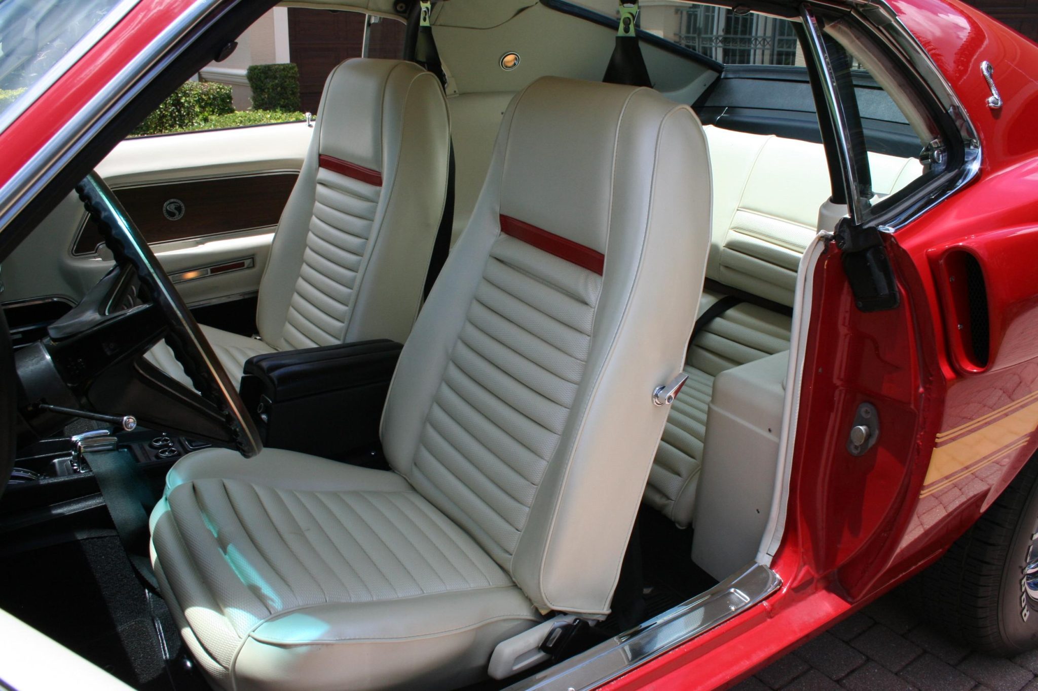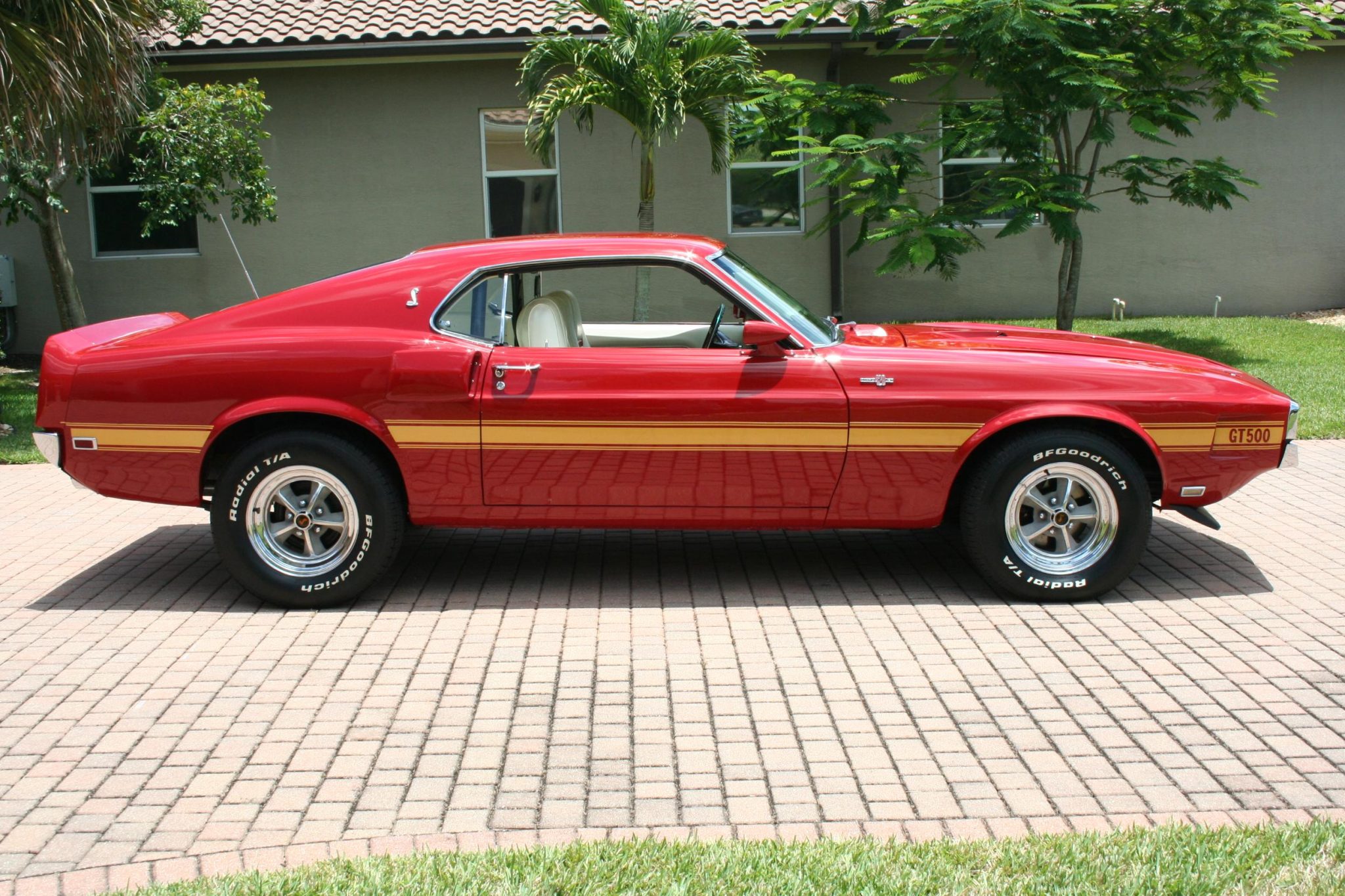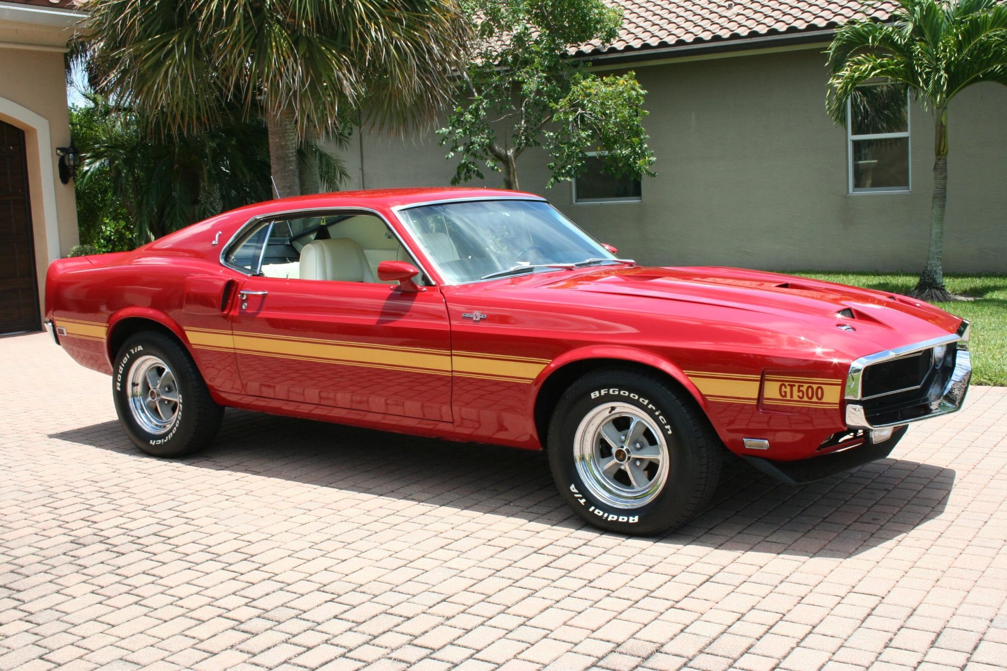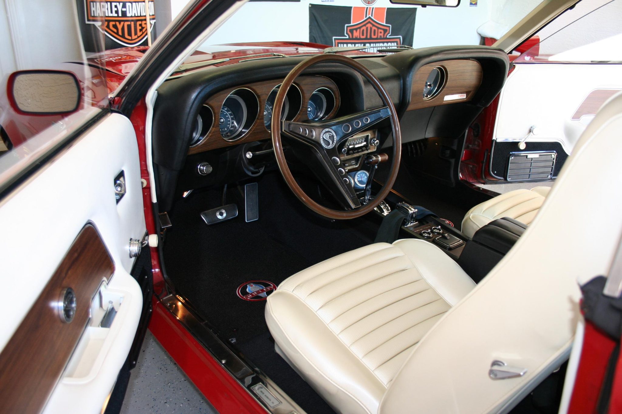 This 1969 Shelby GT500 is one of 1,157 fastbacks produced for the model year. It was originally specified with Candy Apple Red paintwork, a white interior, a Sport Deck rear seat, a Traction-Lok differential, power steering and power-assisted front disc brakes, an AM/FM radio, Deluxe belts, and a tachometer and trip odometer. Work included buffing the exterior, reupholstering the interior, re-chroming the 15″ wheels, replacing suspension and brake components, and overhauling the 428ci Cobra Jet V8. T