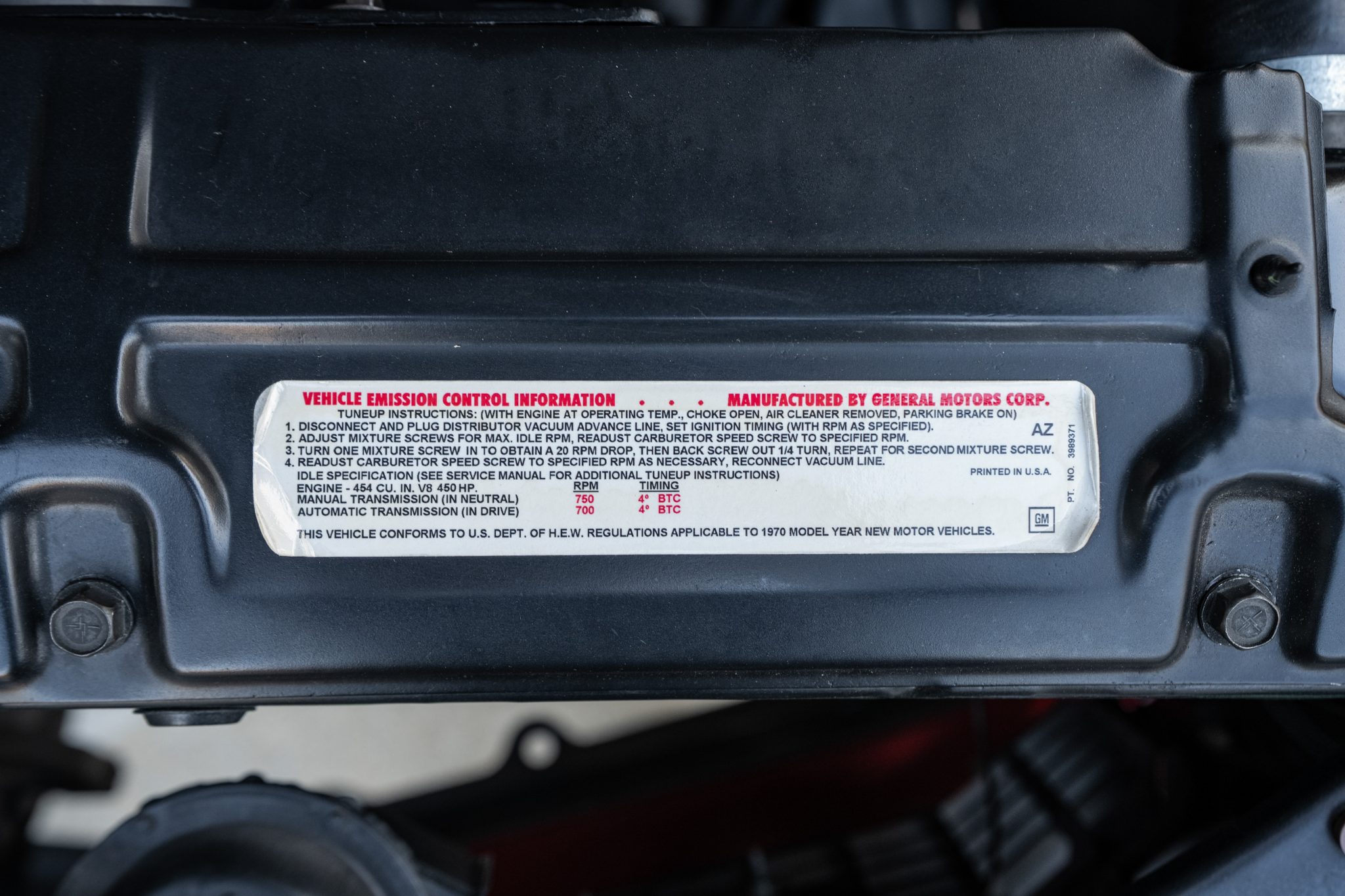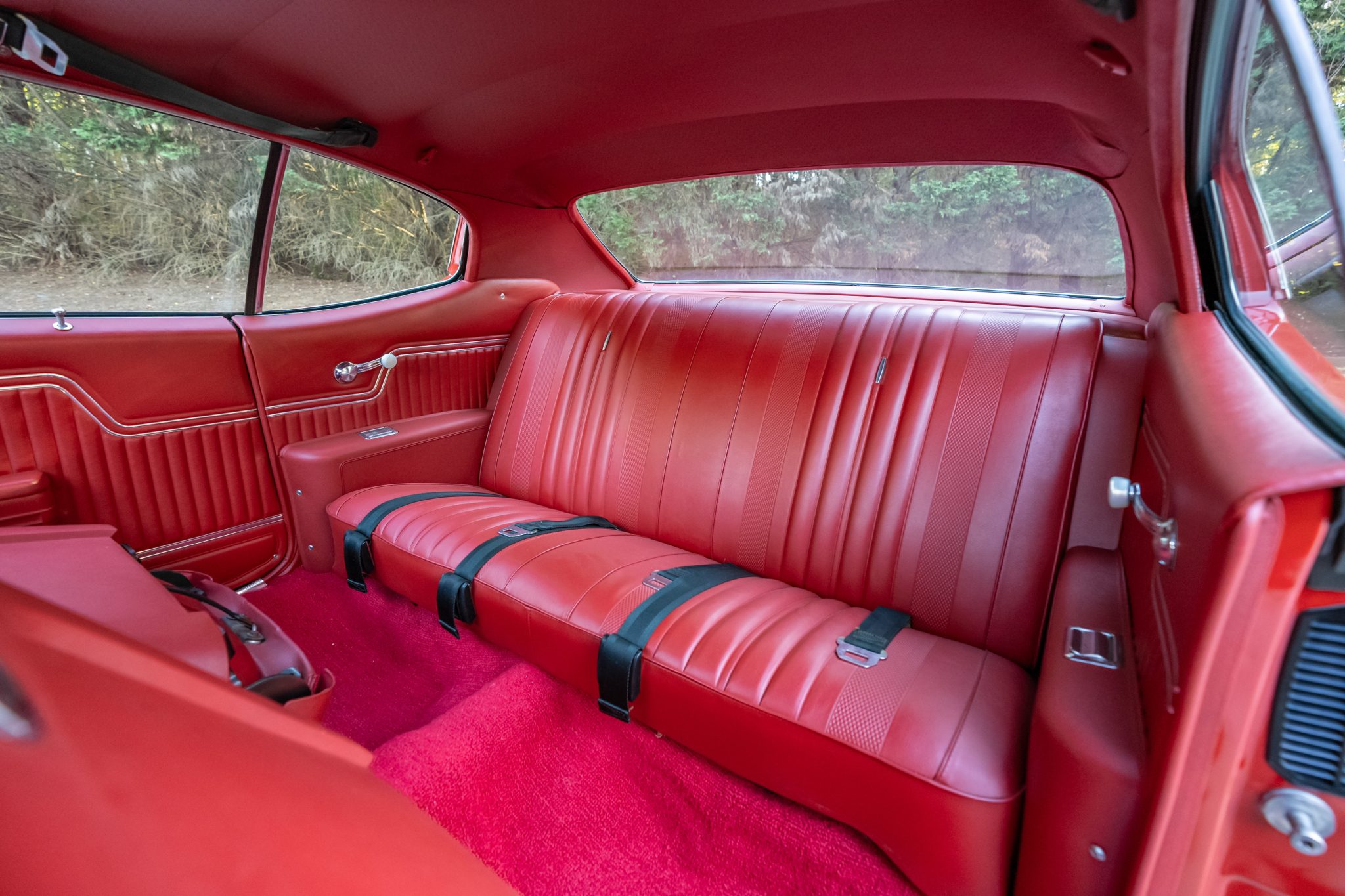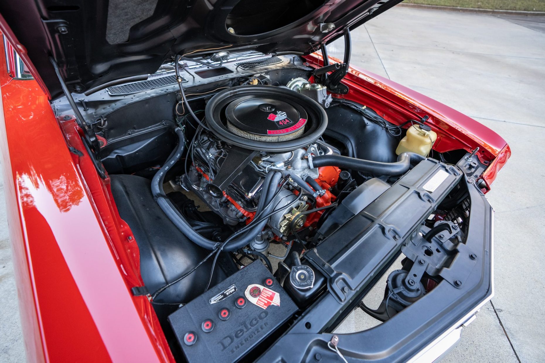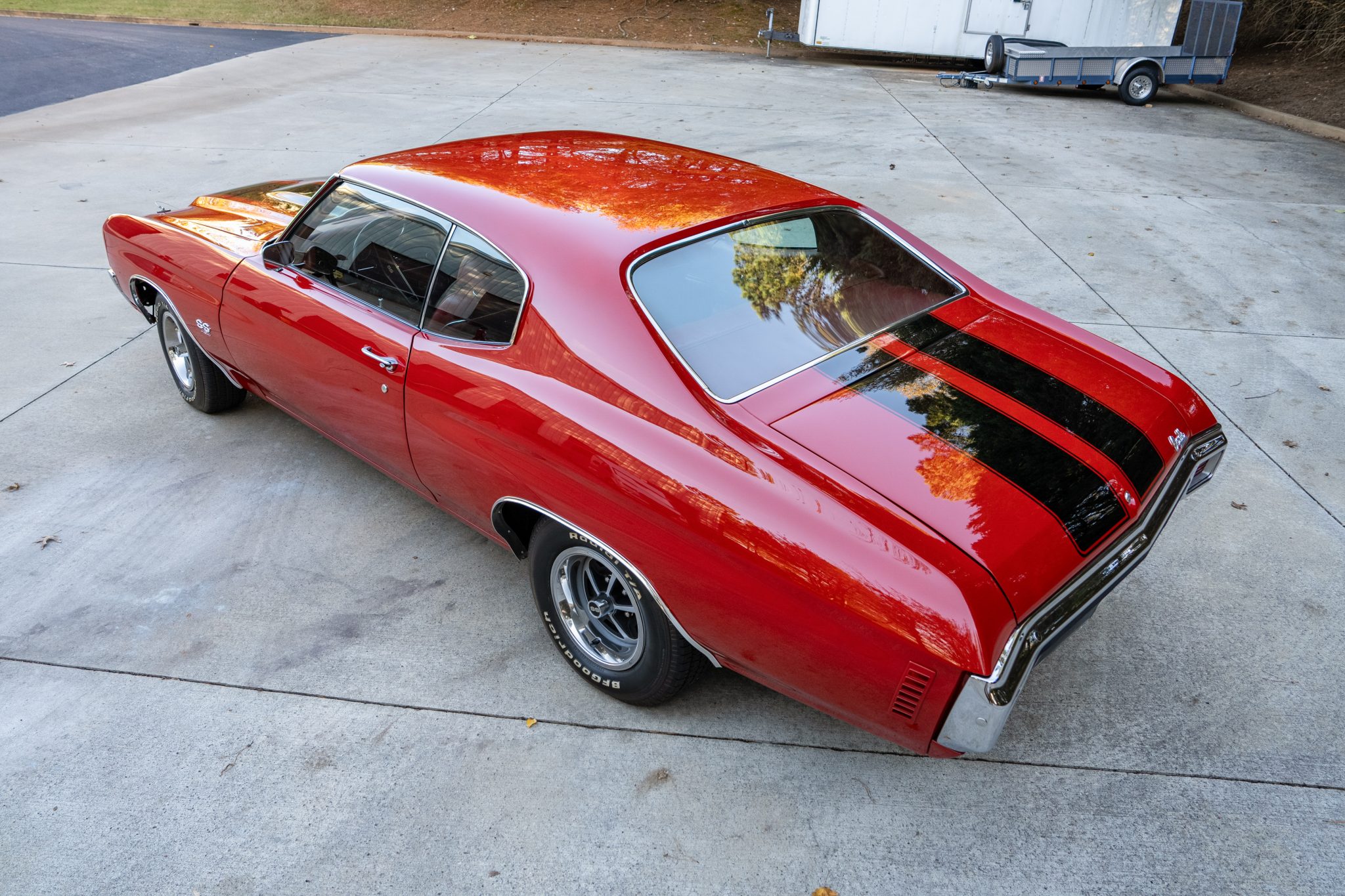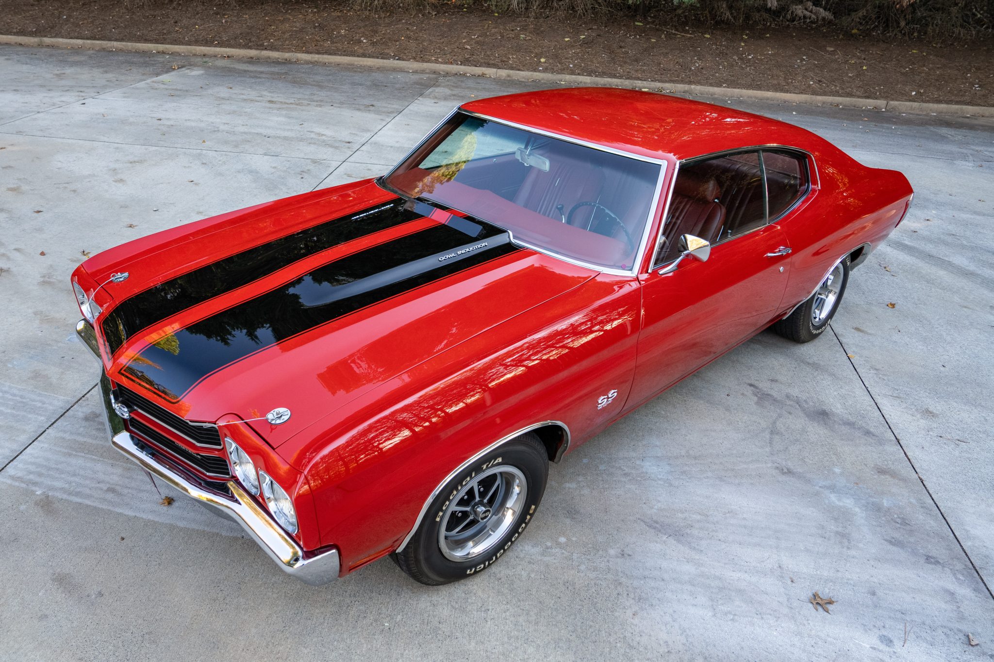 This 1970 Chevrolet Chevelle Malibu SS Sport Coupe is one of a reported 4,475 Chevelle examples produced for the model year with a 454ci LS6 V8 The 454ci V8 is linked to a TH400 three-speed automatic transmission and a 12-bolt rear end with a limited-slip differential, and the car is equipped with power steering, power-assisted front disc brakes, and 14″ Sport wheels. Inside, the front bucket seats and rear bench are trimmed in red vinyl and accompanied by an AM radio and front shoulder belts.