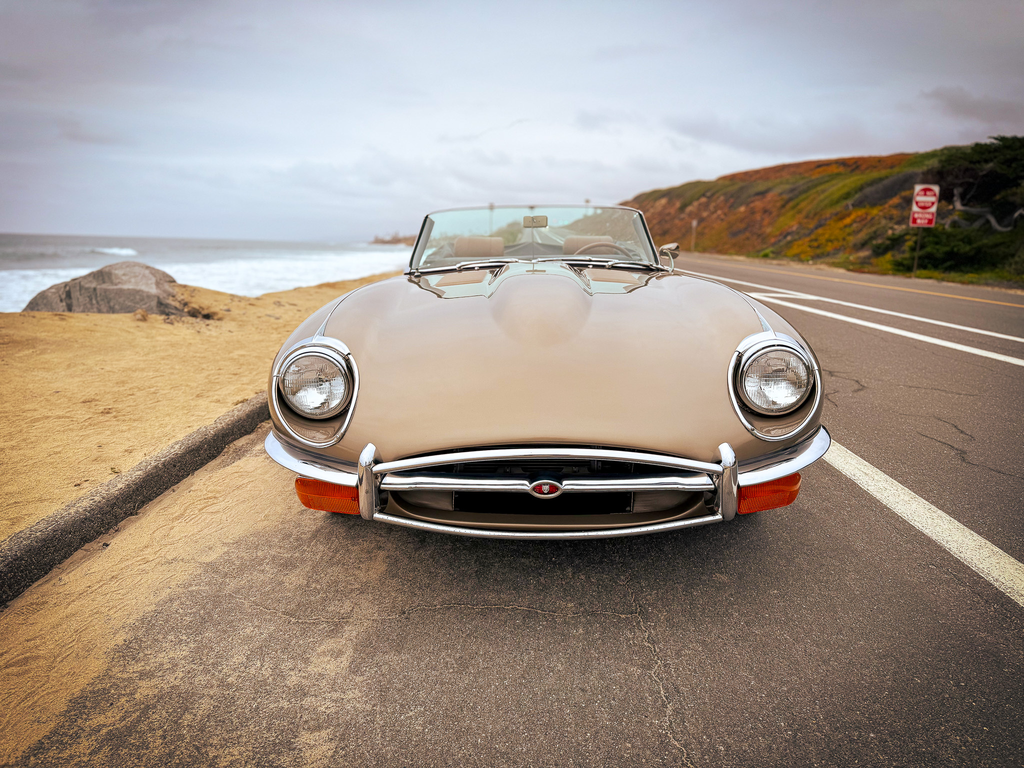 This 1970 Jaguar XKE Series II roadster was subsequently refurbished, including a repaint in Golden Sand. the 4.2-liter inline-six was rebuilt three years later. Suspension bushings were replaced in 2021, while more recent work in 2024 consisted of replacing the battery, clutch slave cylinder, and exhaust manifold gaskets. It is equipped with a four-speed manual transmission, a limited-slip differential, a black soft top, four-wheel disc brakes, 15″ wire wheels, a wood-rimmed steering wheel, and air conditioning.
