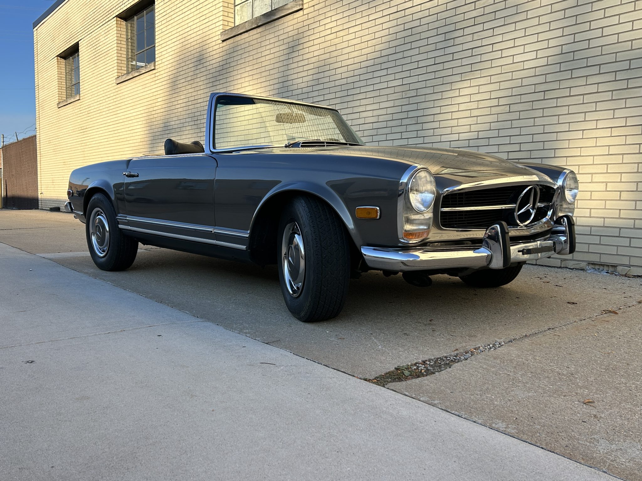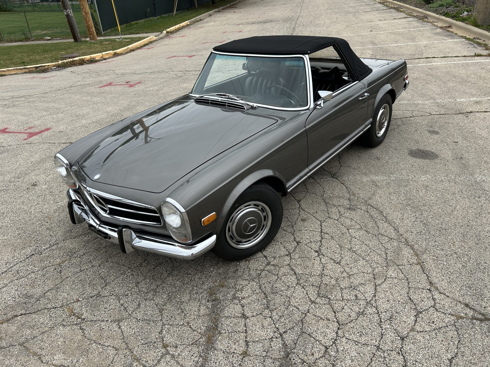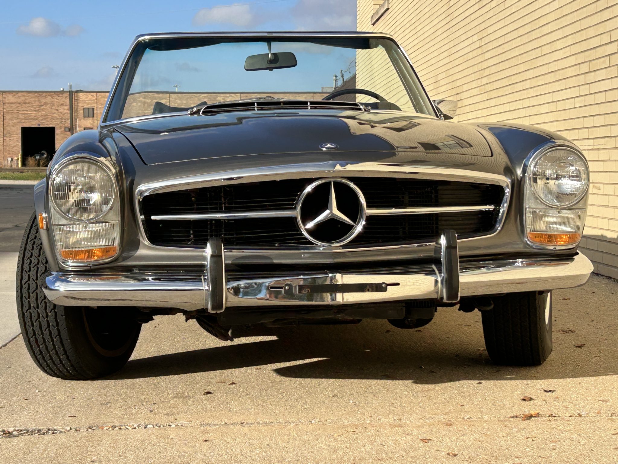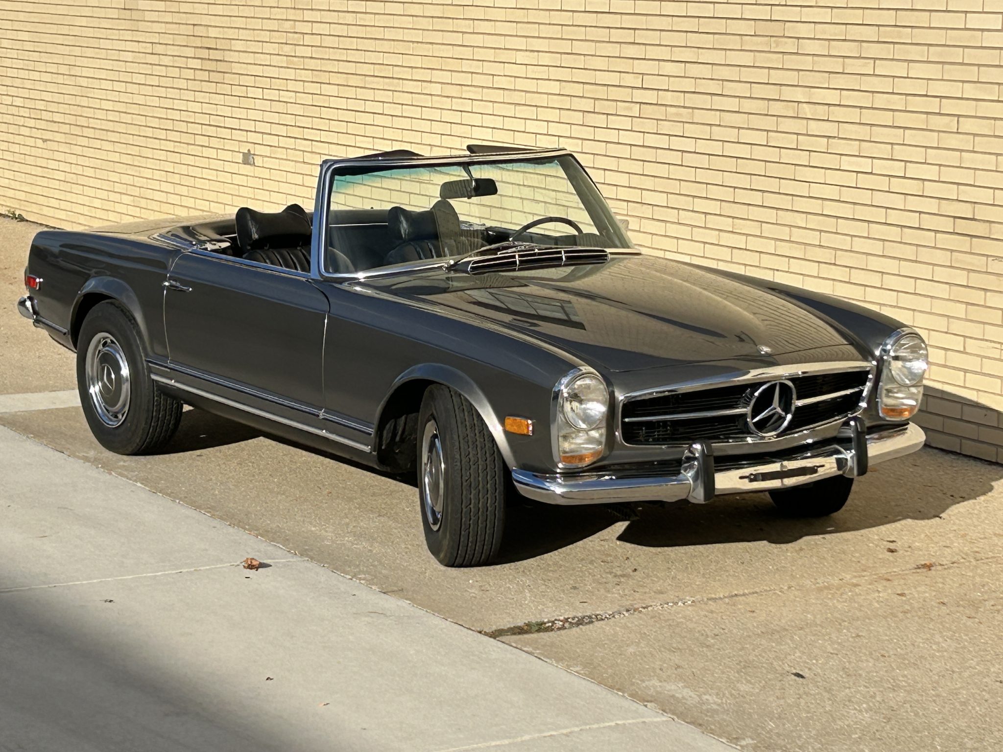 This 1970 Mercedes-Benz 280SL is powered by a 2.8-liter inline-six paired with a four-speed automatic transmission and is finished in Anthracite Gray Metallic over black leather. Equipment includes a black convertible top, a removable hardtop, power steering, 14″ steel wheels with painted covers, and a Becker Europa radio.