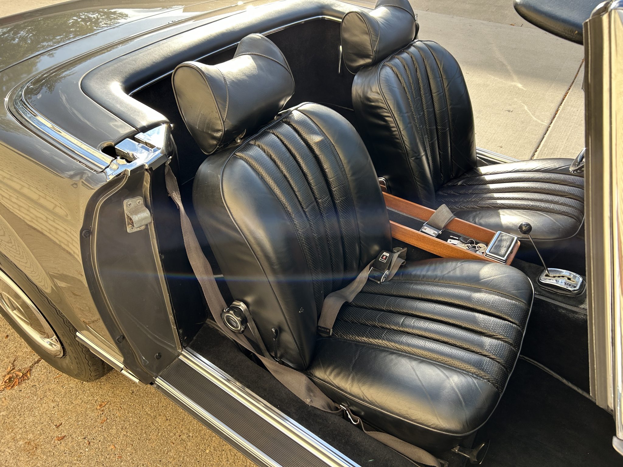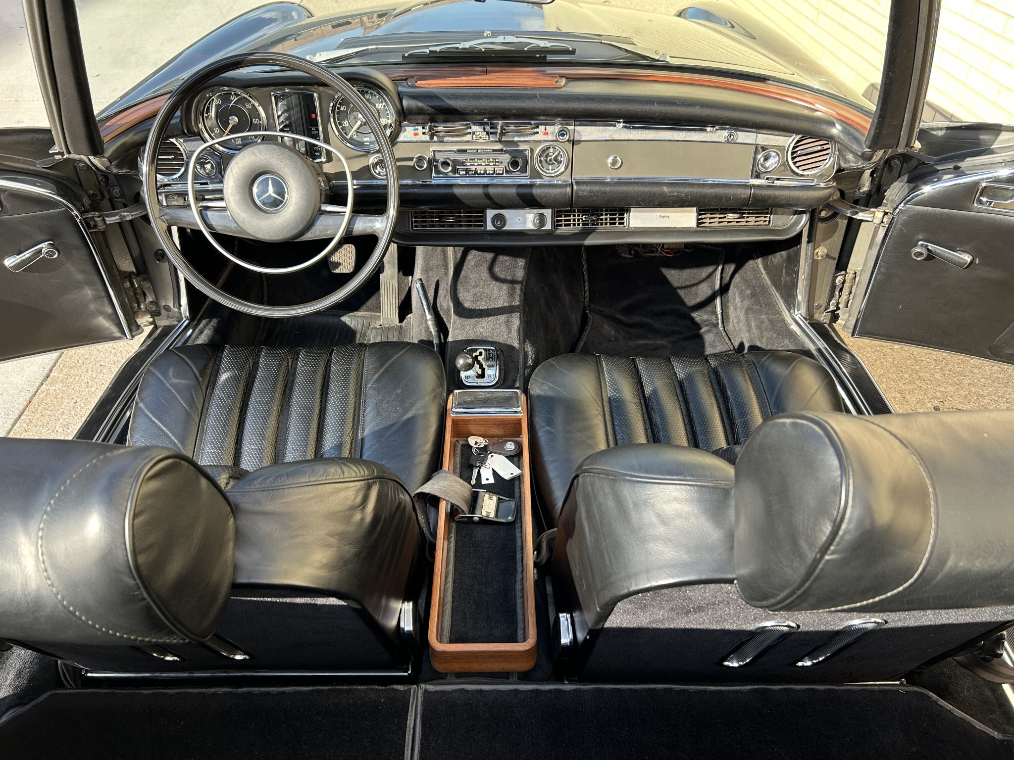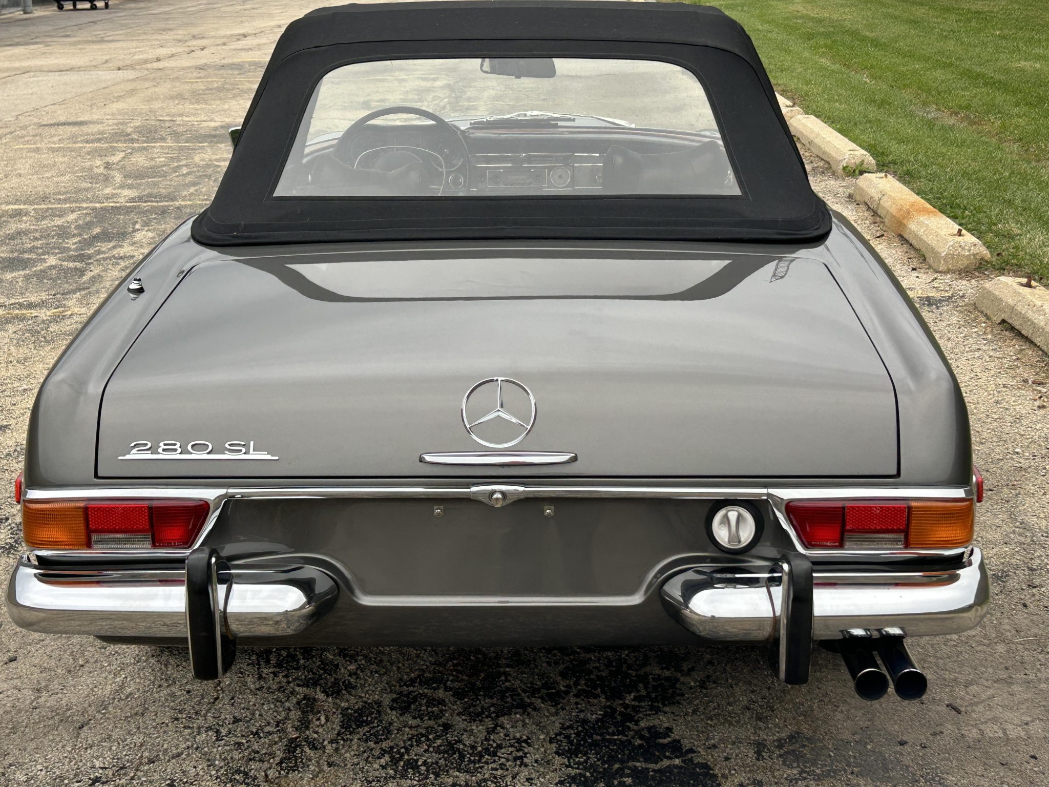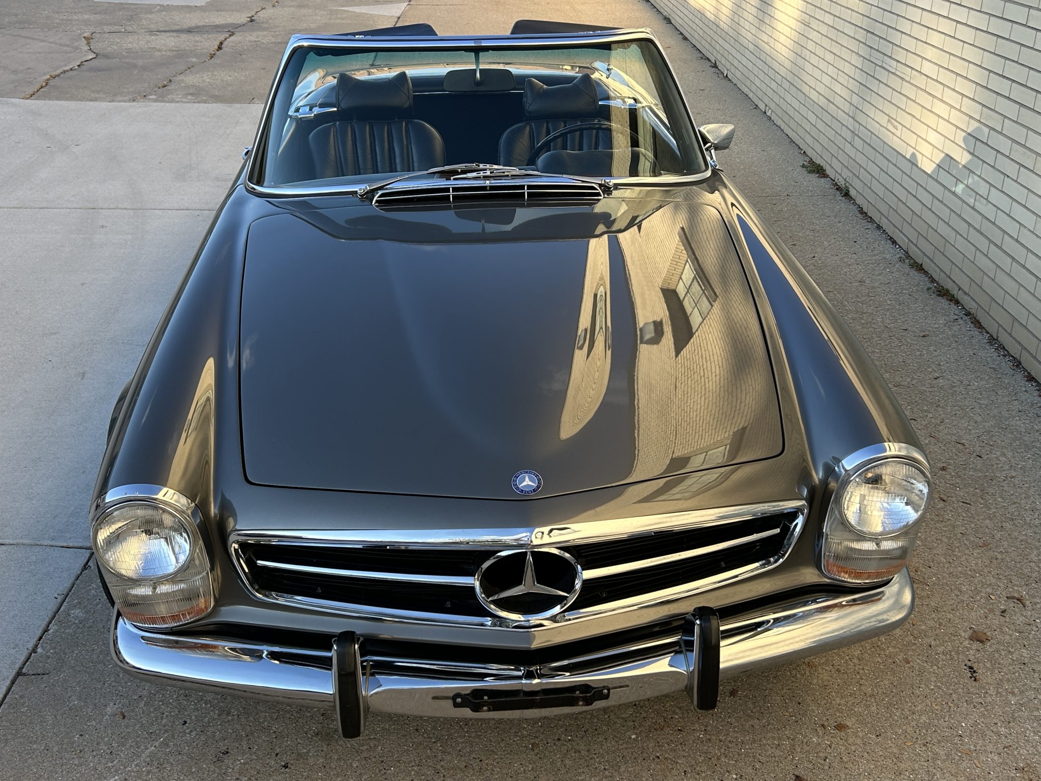This 1970 Mercedes-Benz 280SL is powered by a 2.8-liter inline-six paired with a four-speed automatic transmission and is finished in Anthracite Gray Metallic over black leather. Equipment includes a black convertible top, a removable hardtop, power steering, 14″ steel wheels with painted covers, and a Becker Europa radio.
