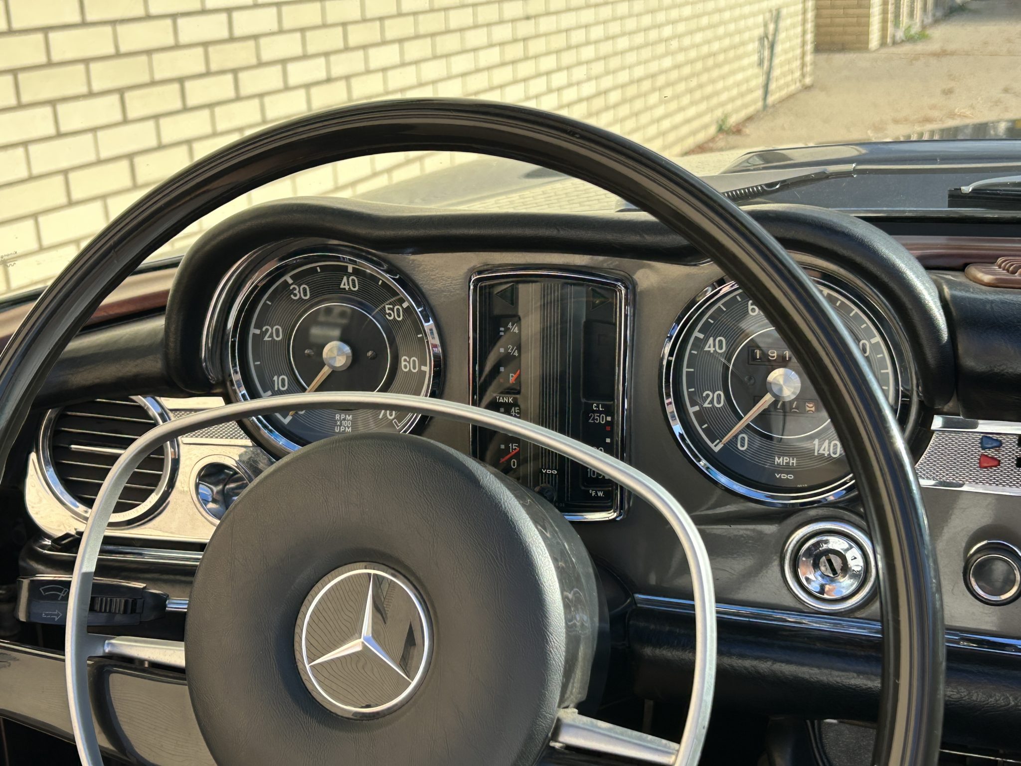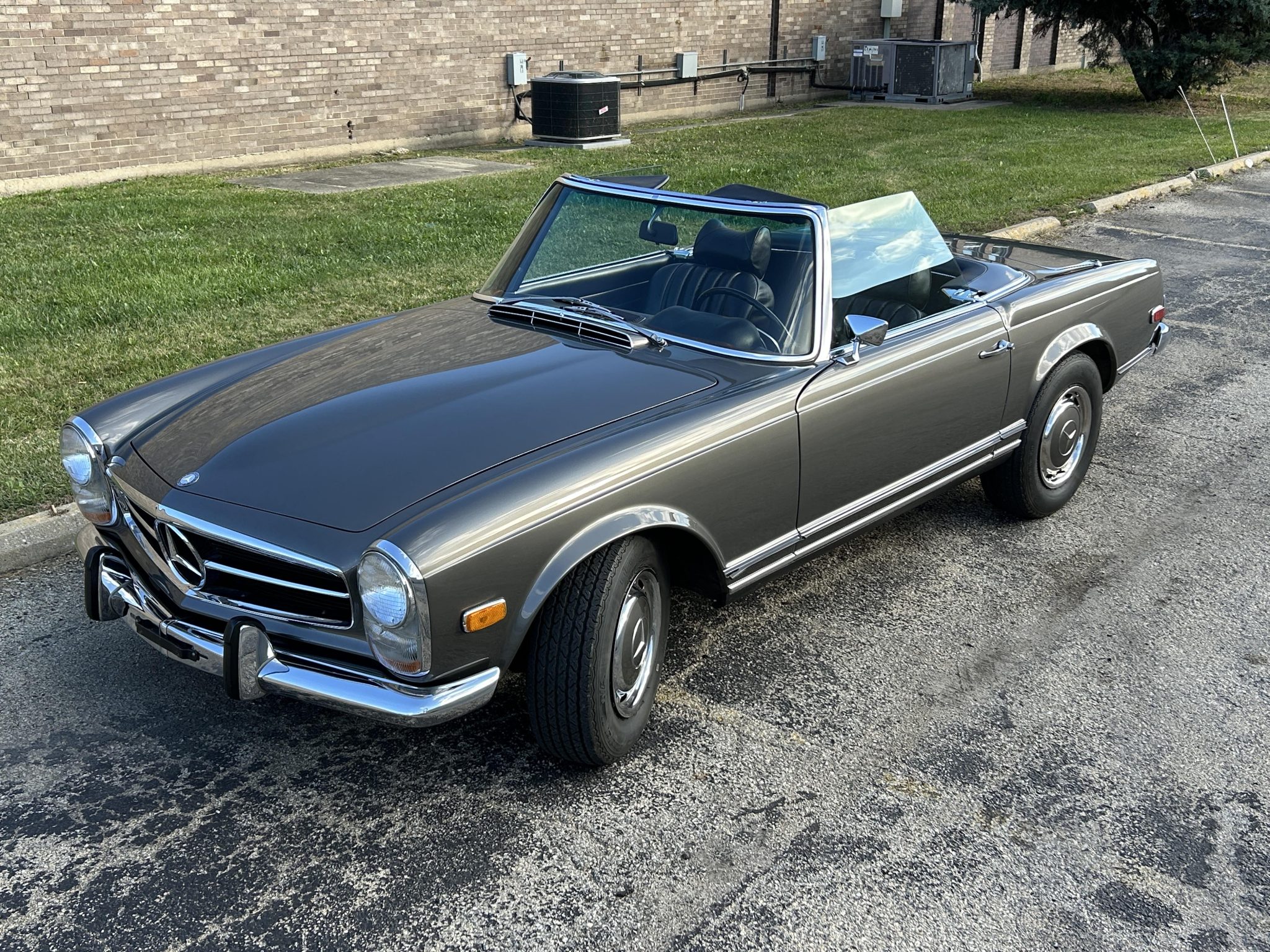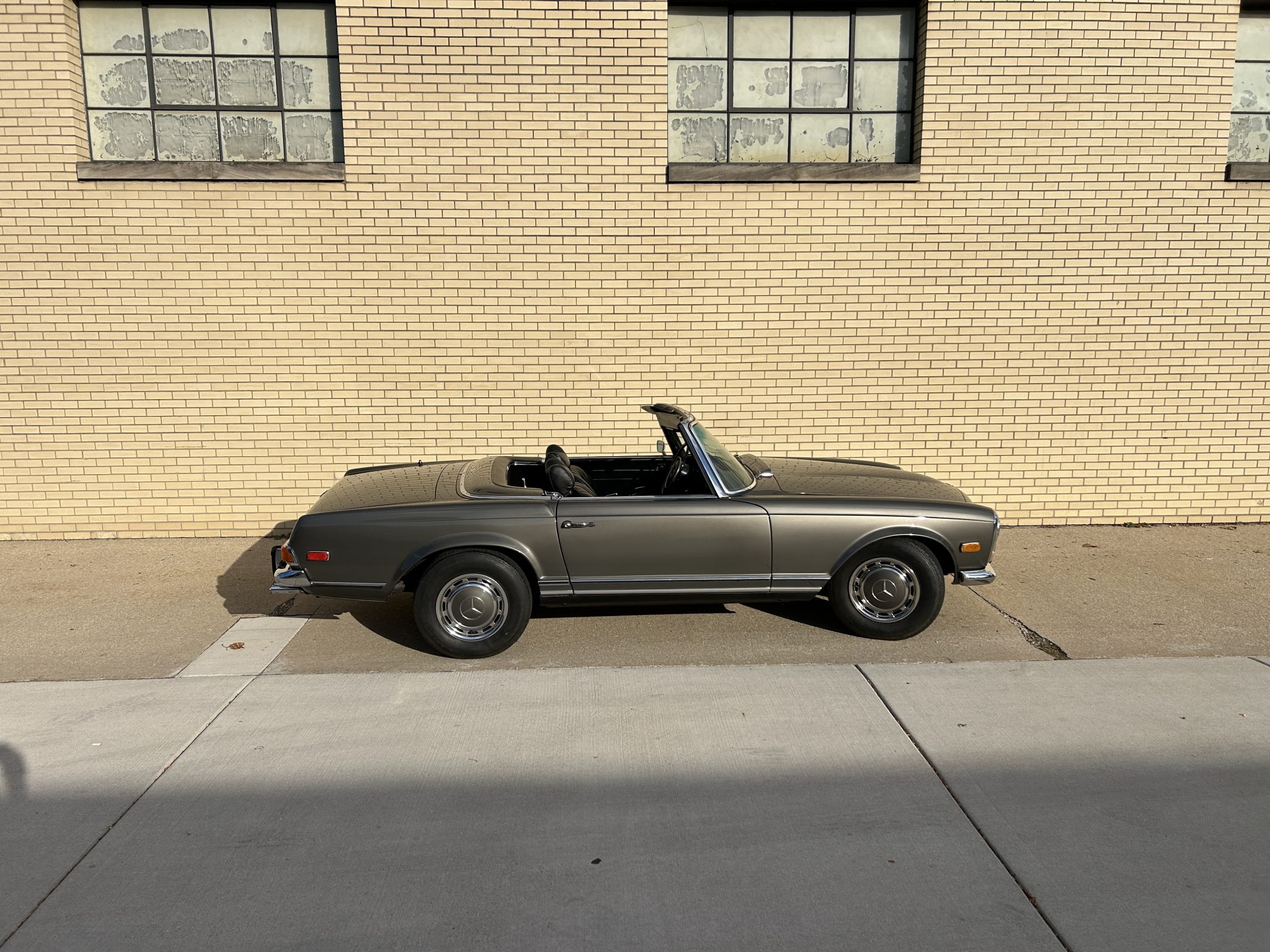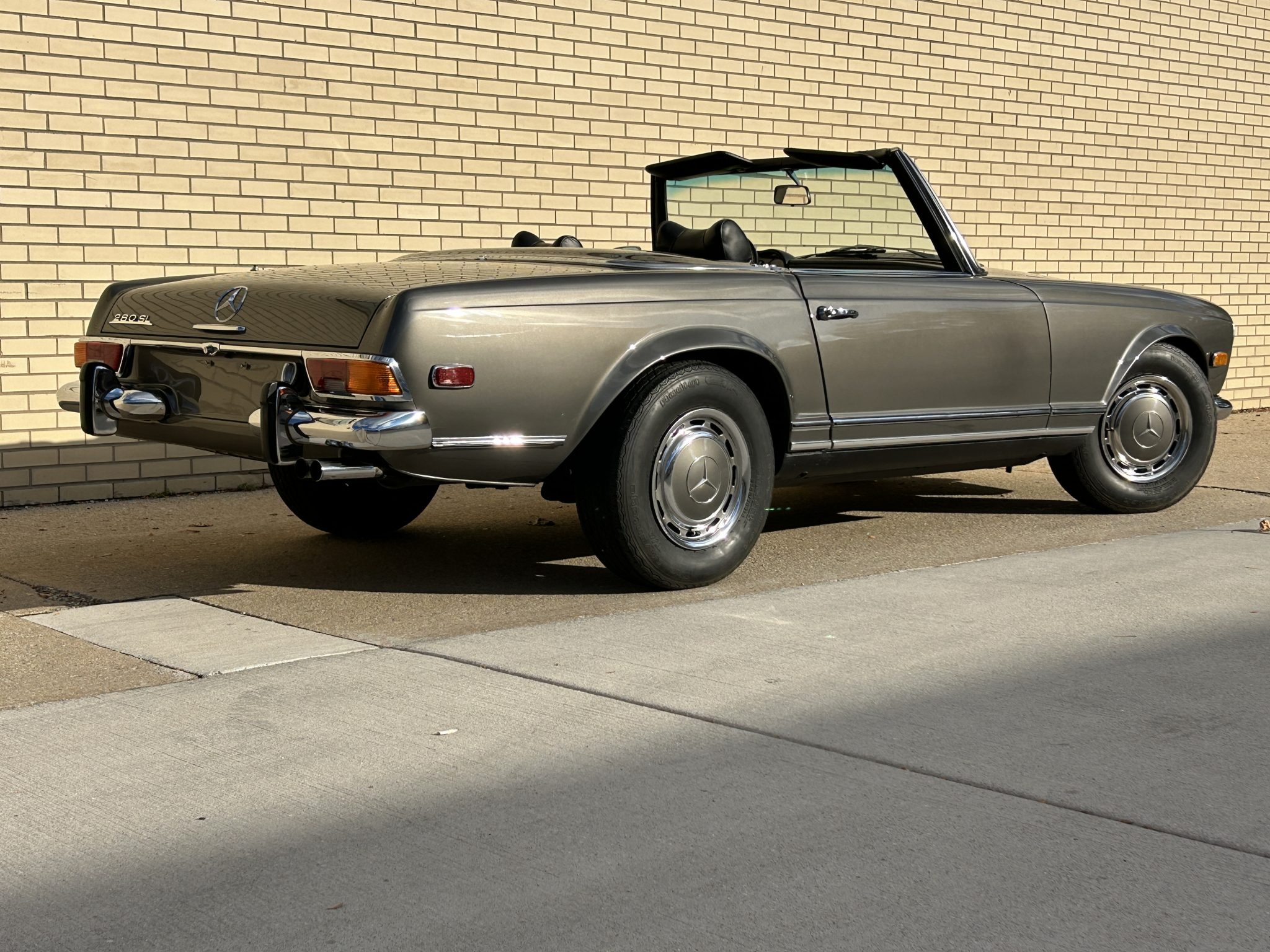 This 1970 Mercedes-Benz 280SL is powered by a 2.8-liter inline-six paired with a four-speed automatic transmission and is finished in Anthracite Gray Metallic over black leather. Equipment includes a black convertible top, a removable hardtop, power steering, 14″ steel wheels with painted covers, and a Becker Europa radio.