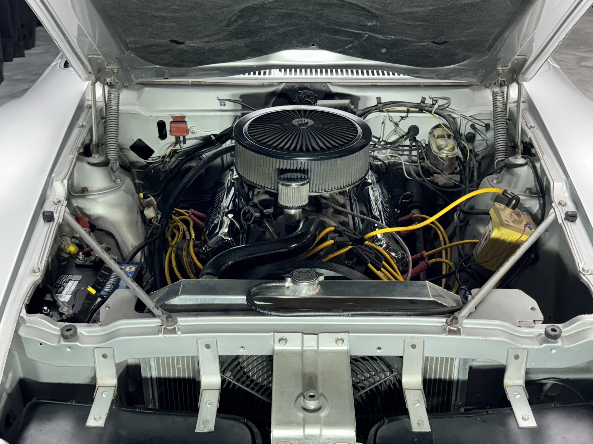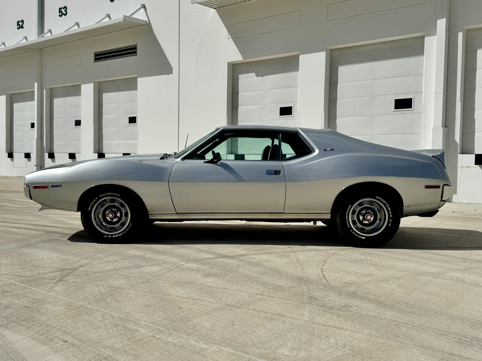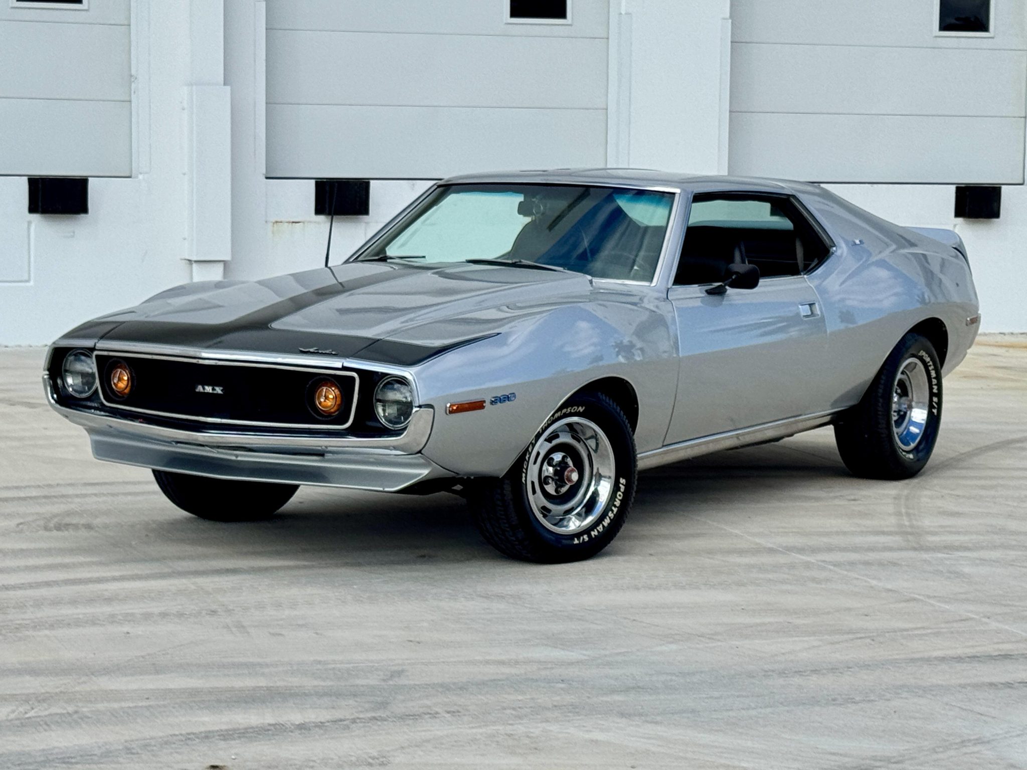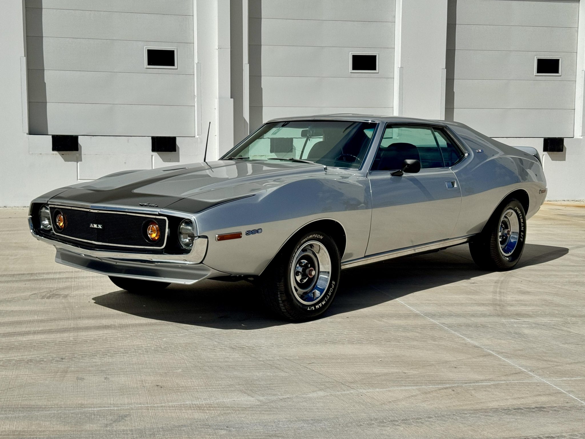 This 1971 AMC Javelin AMX was refurbished with work that involved repainting the body in silver, refreshing the black interior, installing a Tremec five-speed manual transmission, and equipping the 360ci V8 with an Edelbrock intake manifold, an Edelbrock 650-cfm carburetor, and an aluminum radiator with an auxiliary electric cooling fan. Additional equipment includes a cowl-induction hood, a black “T” stripe, front and rear spoilers, LED headlights, 15″ wheels, front disc brakes, a Hurst shifter, AutoMeter secondary gauges, and a RetroSound stereo.