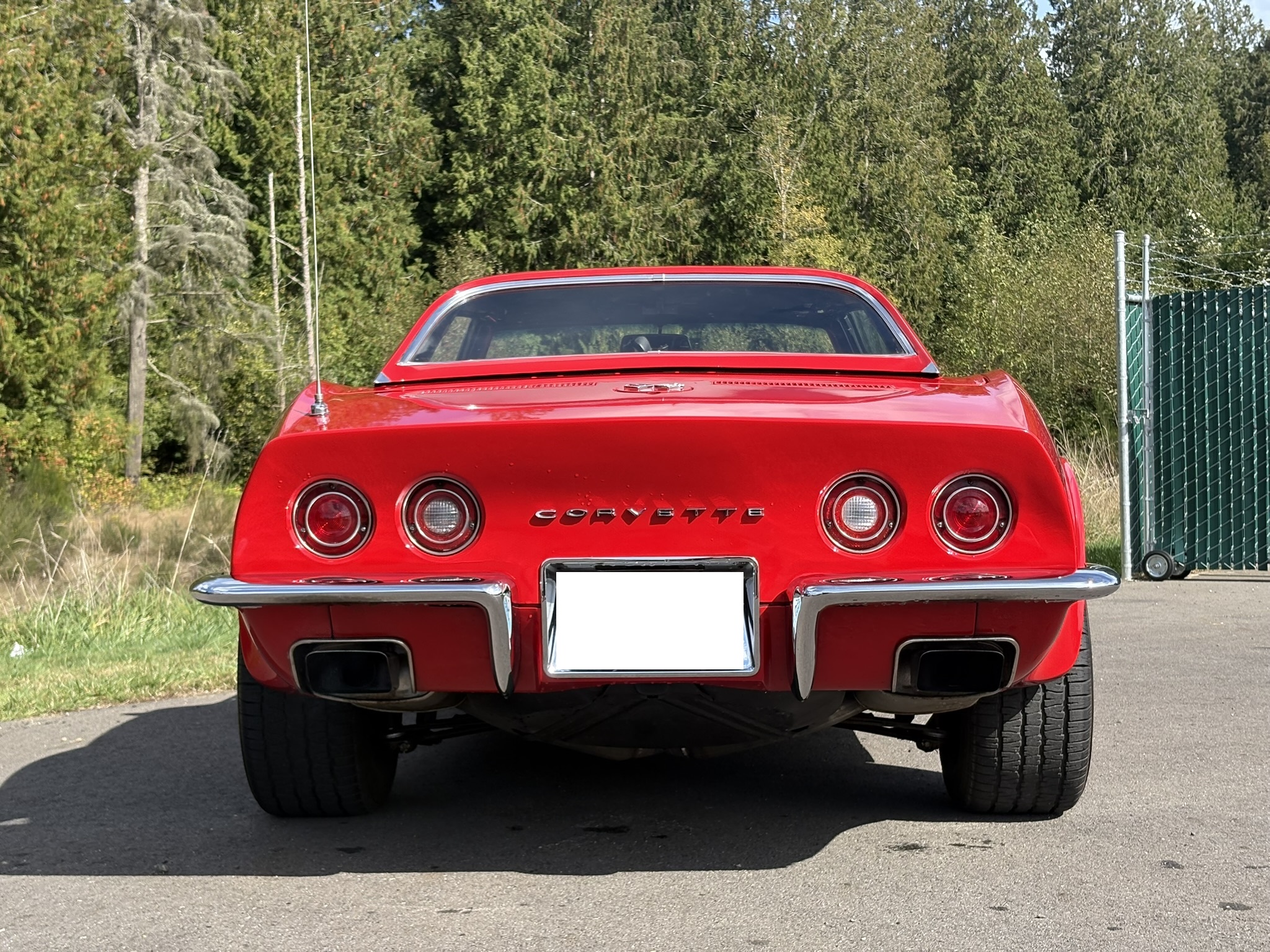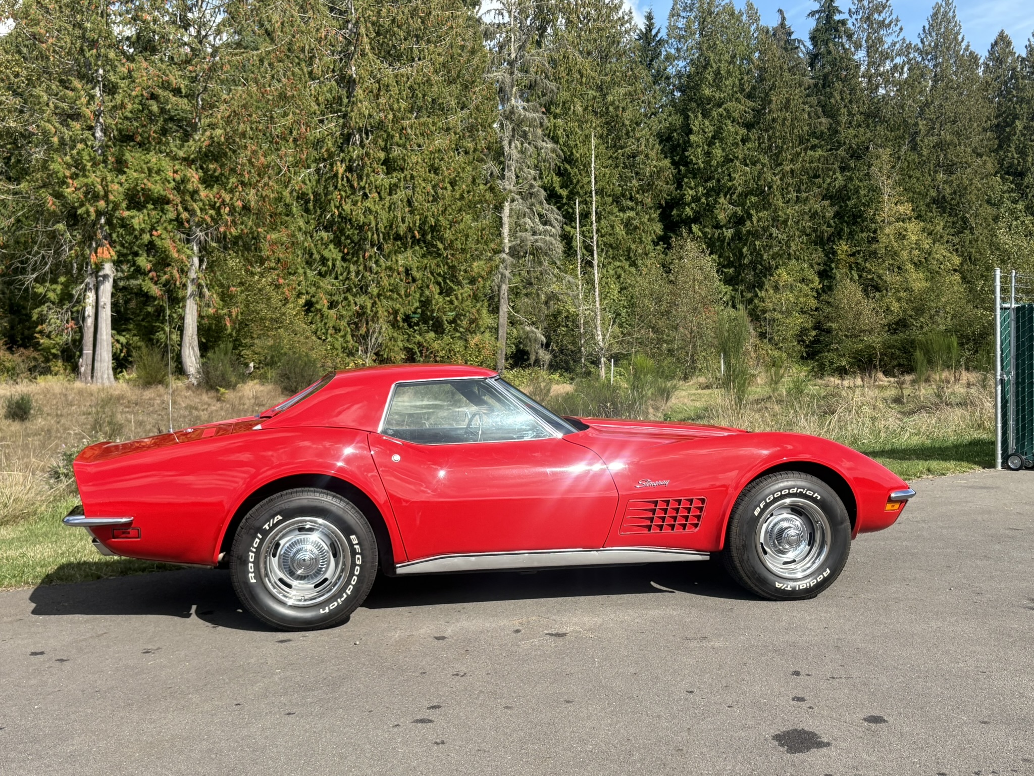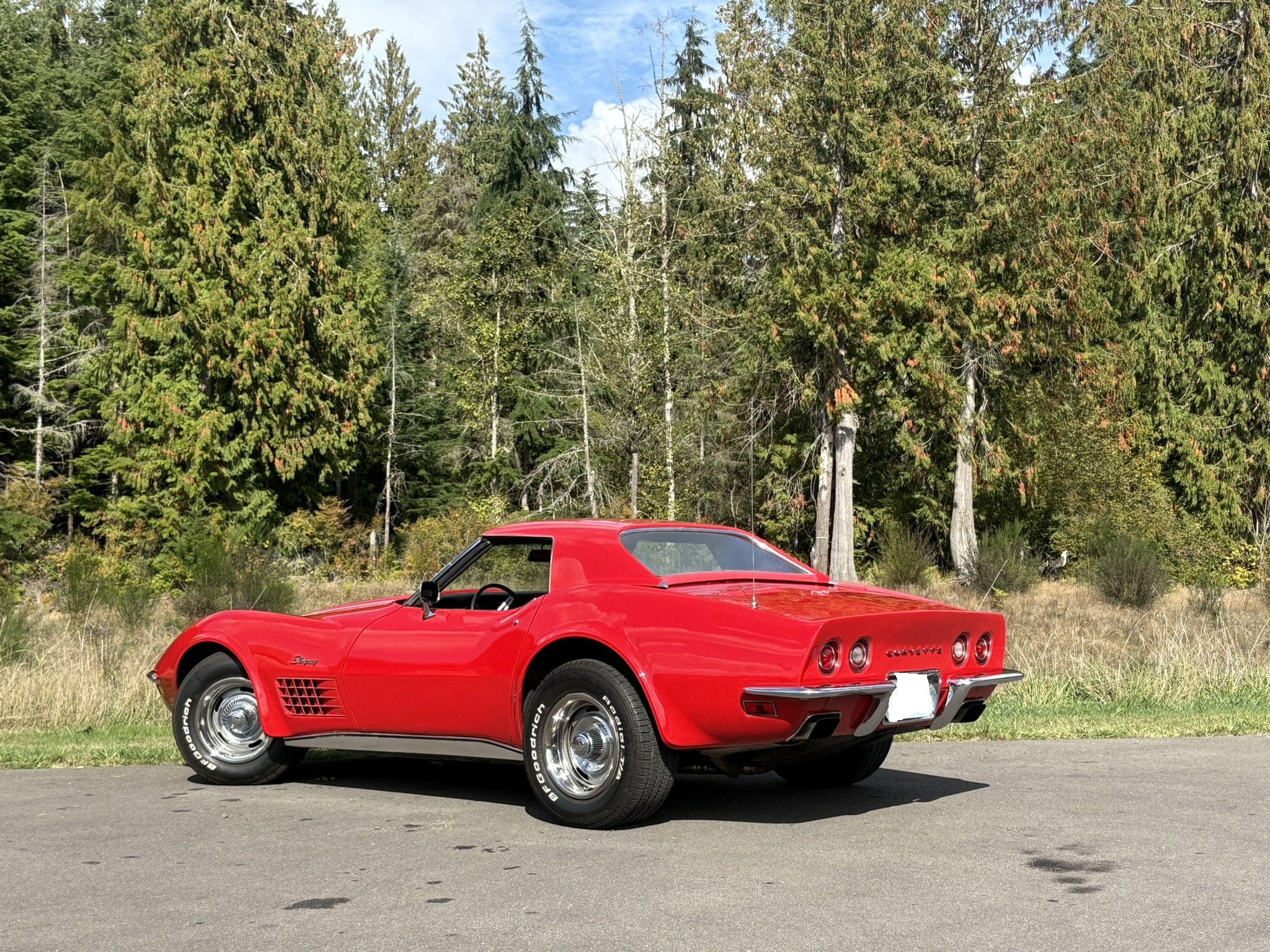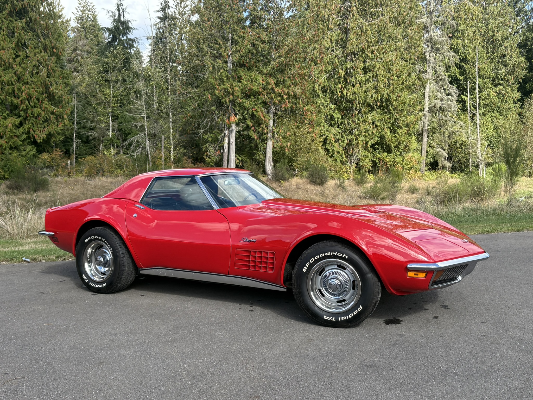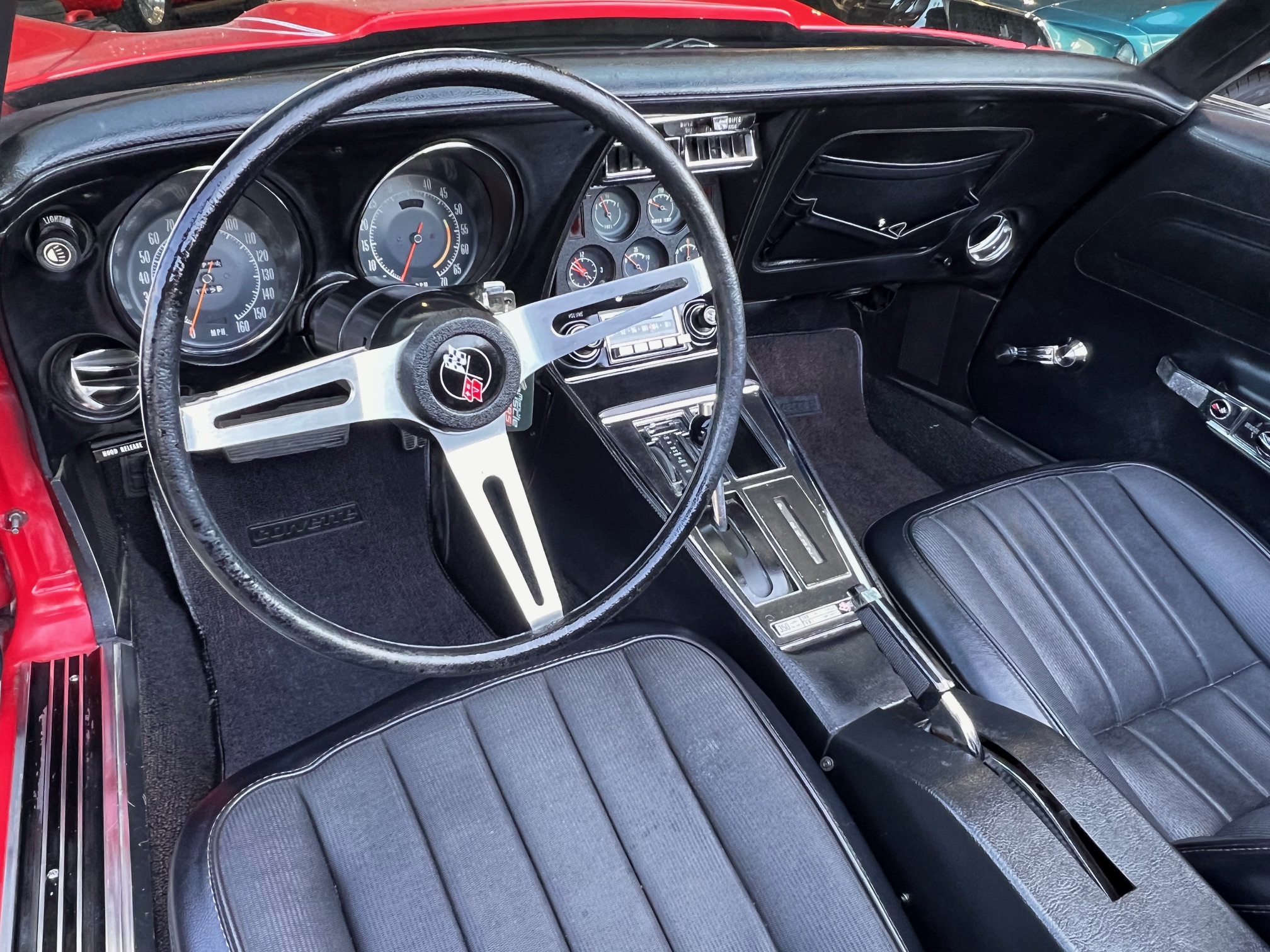 This 1972 Chevrolet Corvette convertible is finished in red over black and is powered by a 350ci V8 paired with a three-speed automatic transmission. Features include a Positraction limited-slip differential, a black convertible top, a removable hardtop, 15″ Rally wheels, a performance camshaft, an aluminum intake manifold, long-tube headers, MSD ignition, power-assisted disc brakes, power steering, retractable headlights, and an AM/FM stereo.