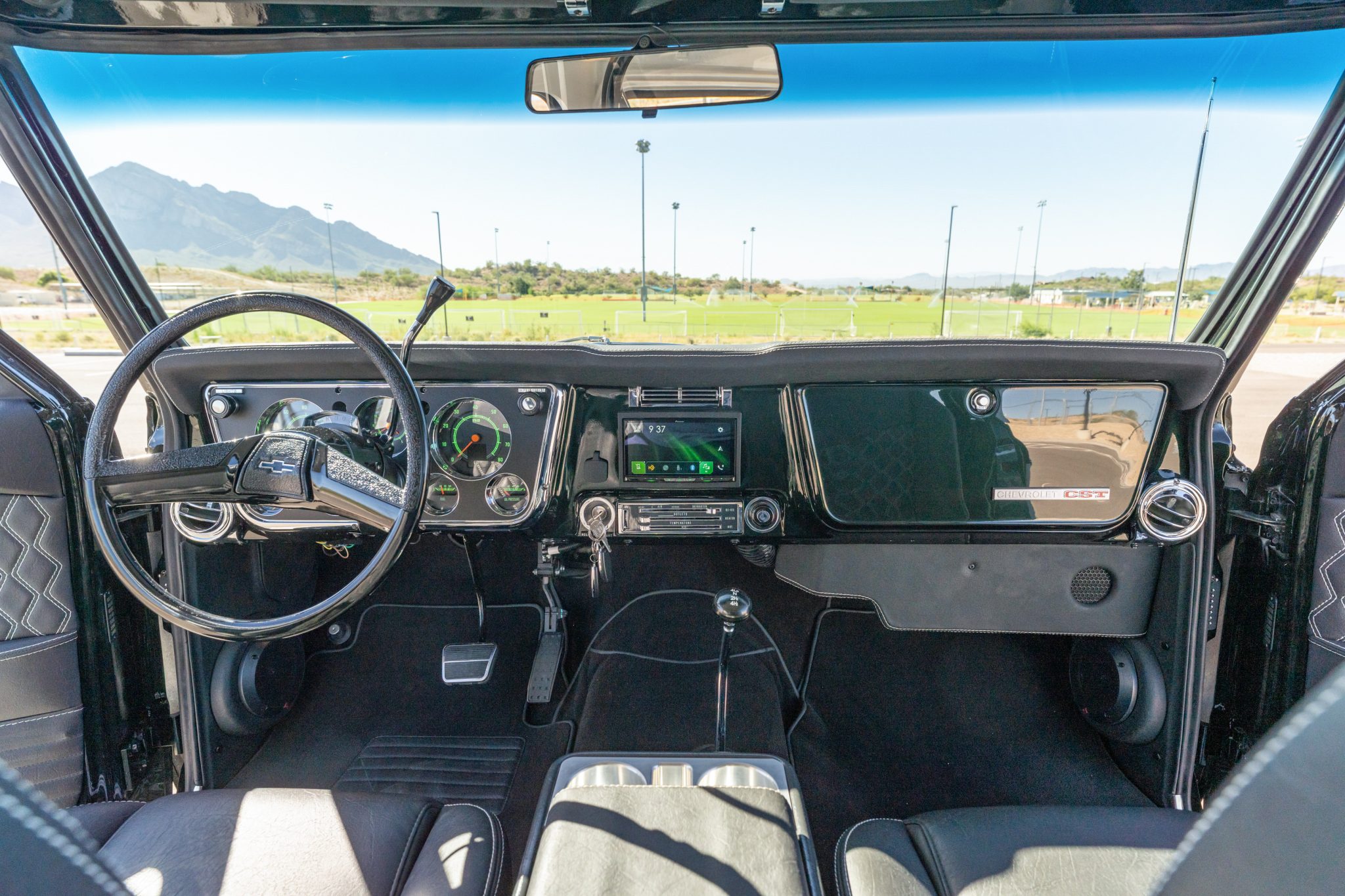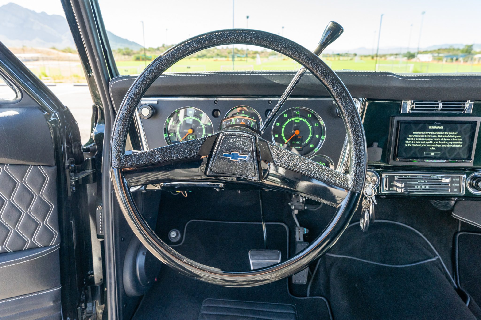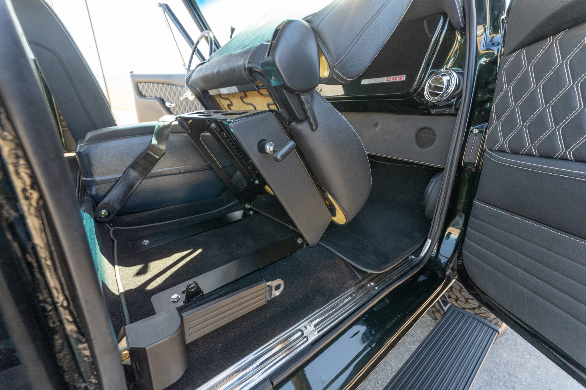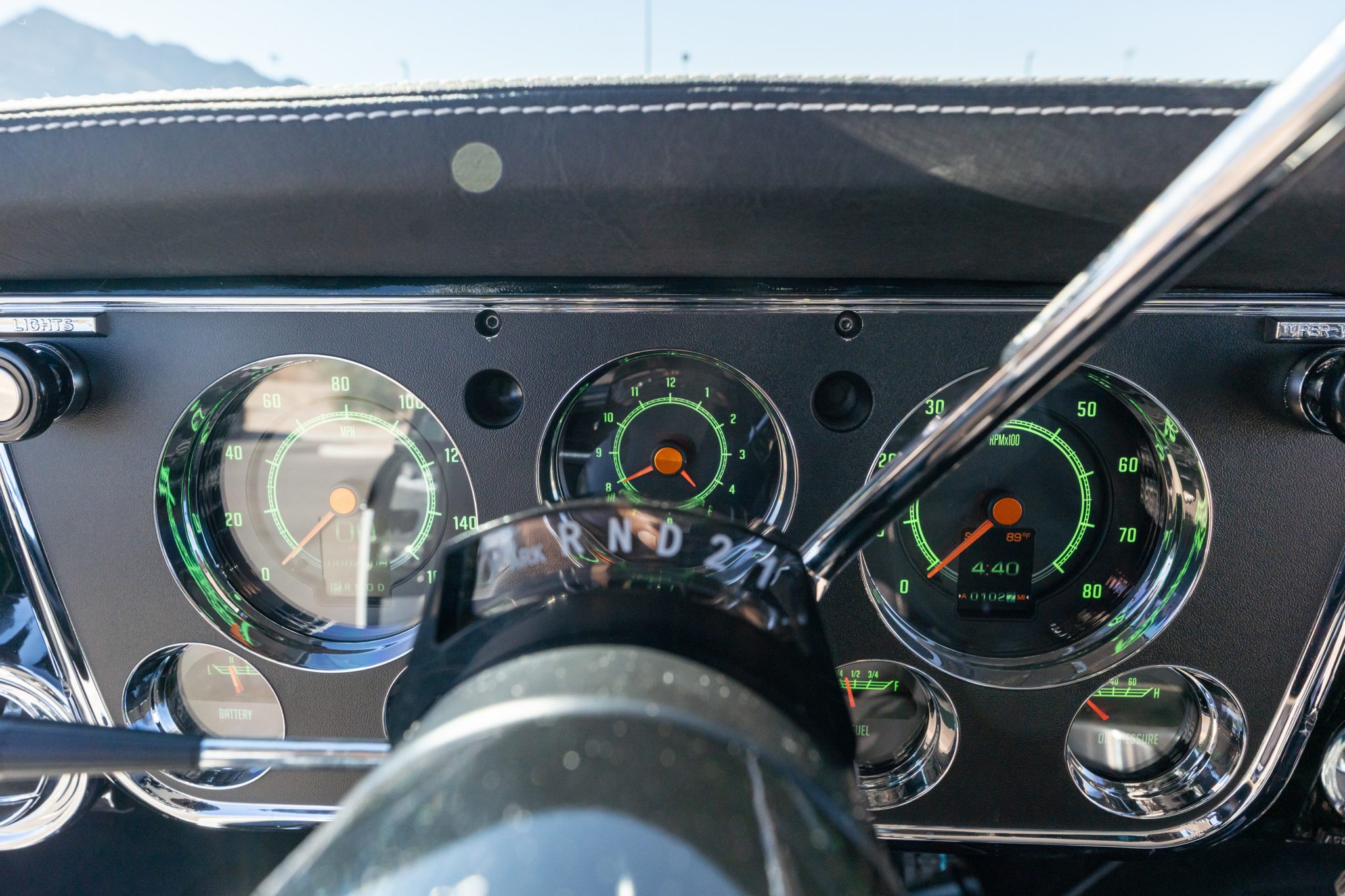 This 1972 Chevrolet K5 Blazer 4×4 was custom build completed in January 2025 involved the installation of a 6.2-liter LS3 V8 crate engine linked to a 4L60E four-speed automatic transmission, a dual-range transfer case, a Dana 44 front axle, and a 12-bolt rear end with Strange Engineering axle shafts. The body was refinished in metallic green and white, and the texture was removed from the hardtop before it was painted white. The chassis was powder coated and modified with a 4″ suspension lift, Fox remote-reservoir shocks, and hydroboost-assisted four-wheel disc brakes with drilled and slotted rotors. Inside, a four-point roll bar is installed along with TMI seats trimmed in black with white diamond-stitching, a custom center console, Vintage Air climate control, Dakota Digital gauges, and a Pioneer touchscreen stereo unit linked to an aftermarket amplifier, subwoofer, and speakers. Additional details include manually locking front hubs, power windows and locks, LED lighting, halo-style headlamps, a hidden fuel filler behind the left taillight, and a dual exhaust system with coated headers and MagnaFlow mufflers.