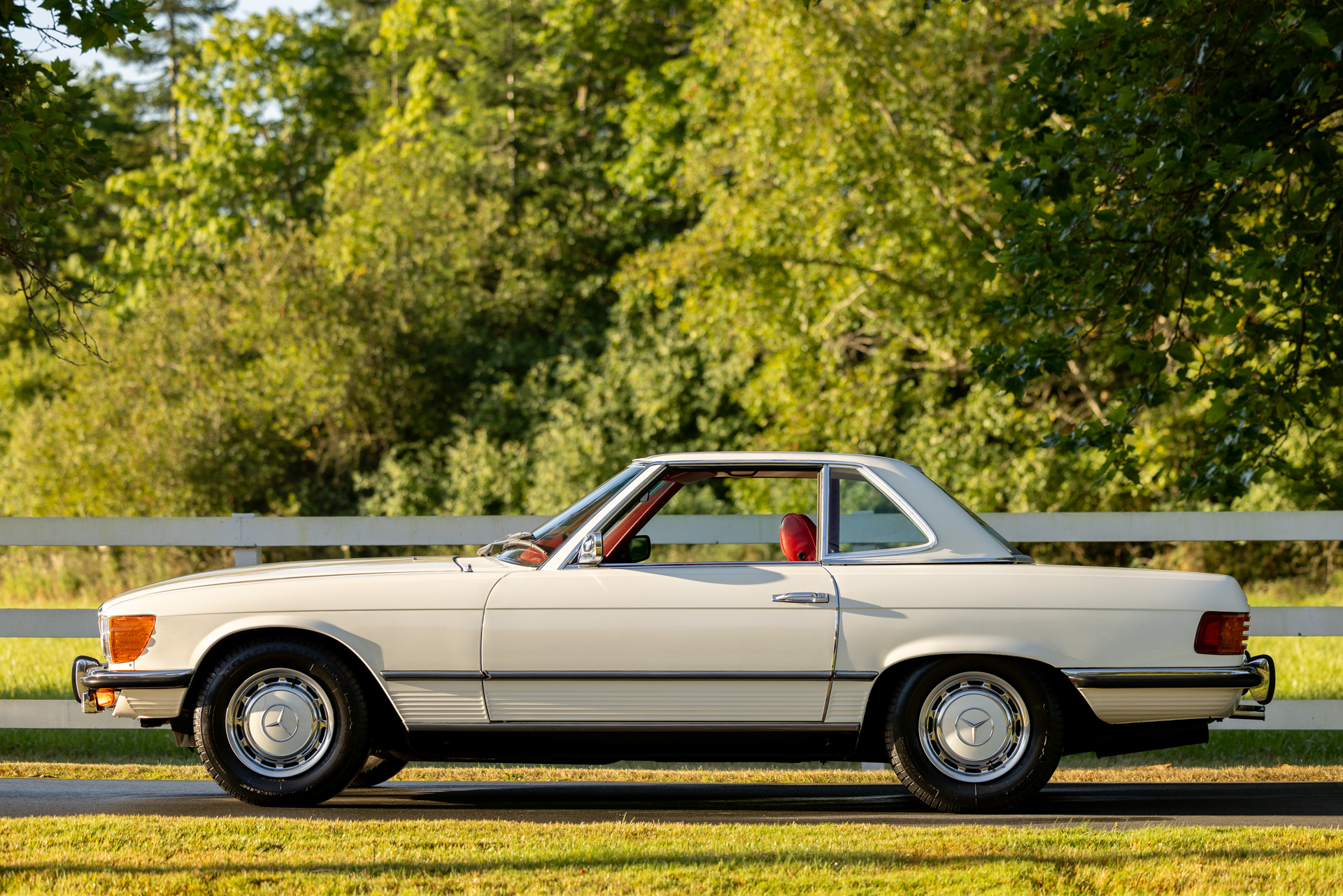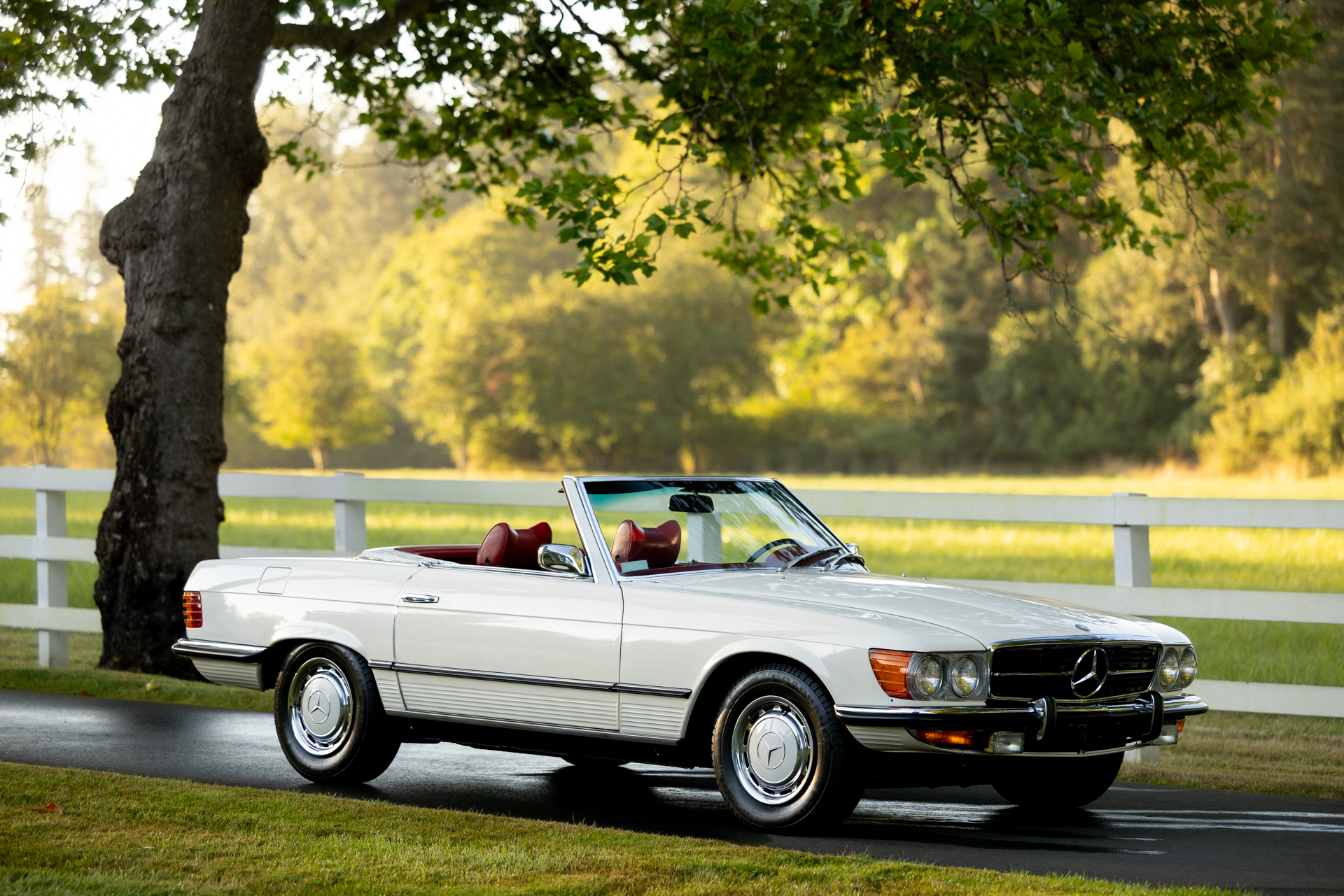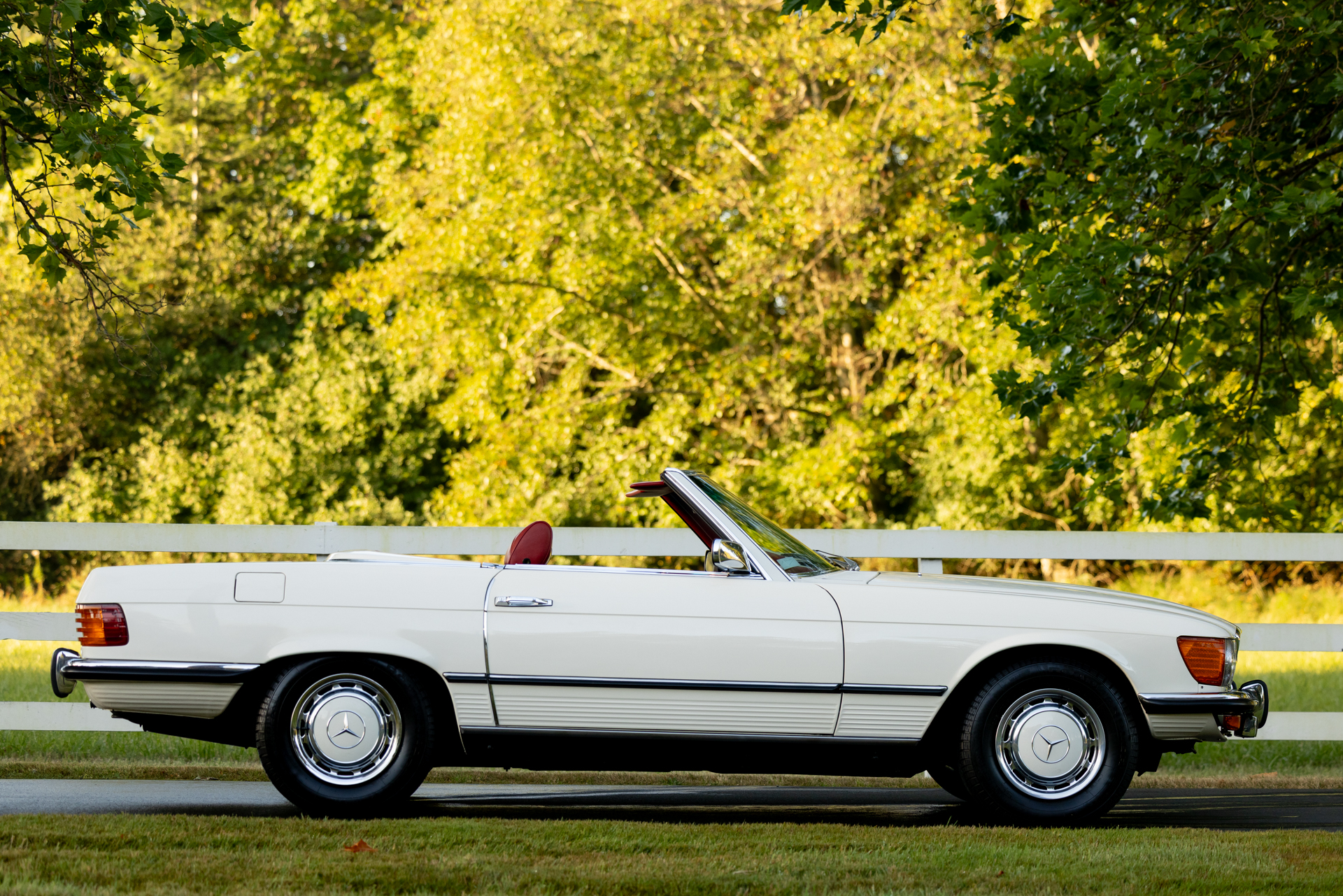 This 1972 Mercedes-Benz 350SL is finished in white over red leather, and it shows just 13k miles. The car is powered by a 4.5-liter V8 paired with a three-speed automatic transmission, and it has early-style bumpers in addition to 14″ steel wheels with covers. Its interior has manual windows, air conditioning, and a Becker Europa push-button radio
