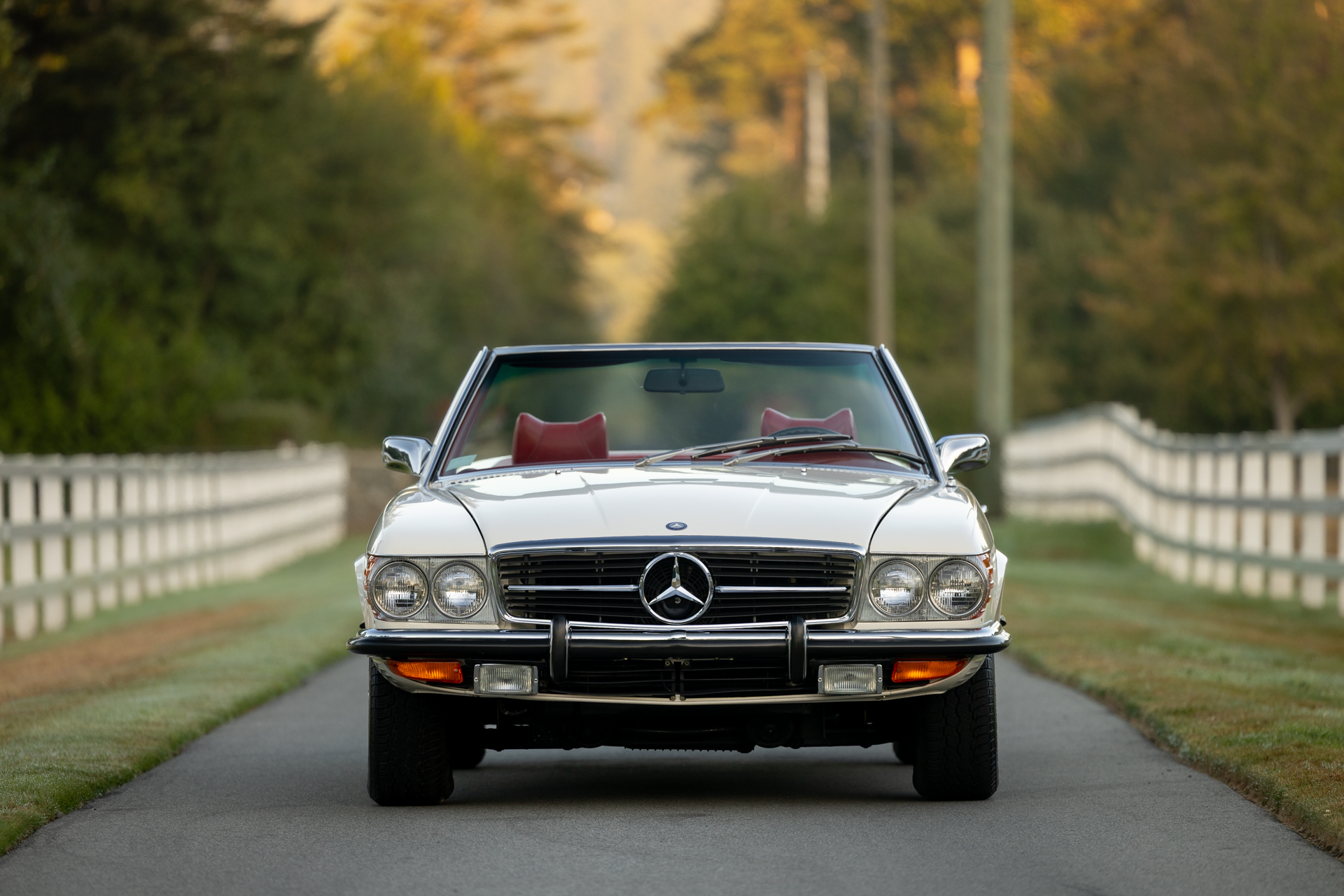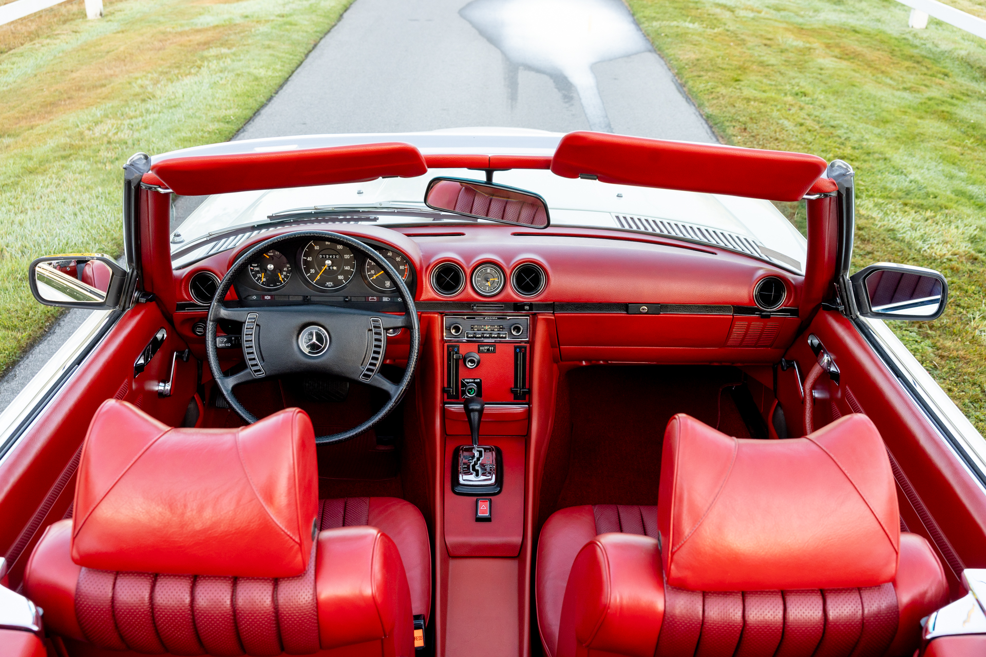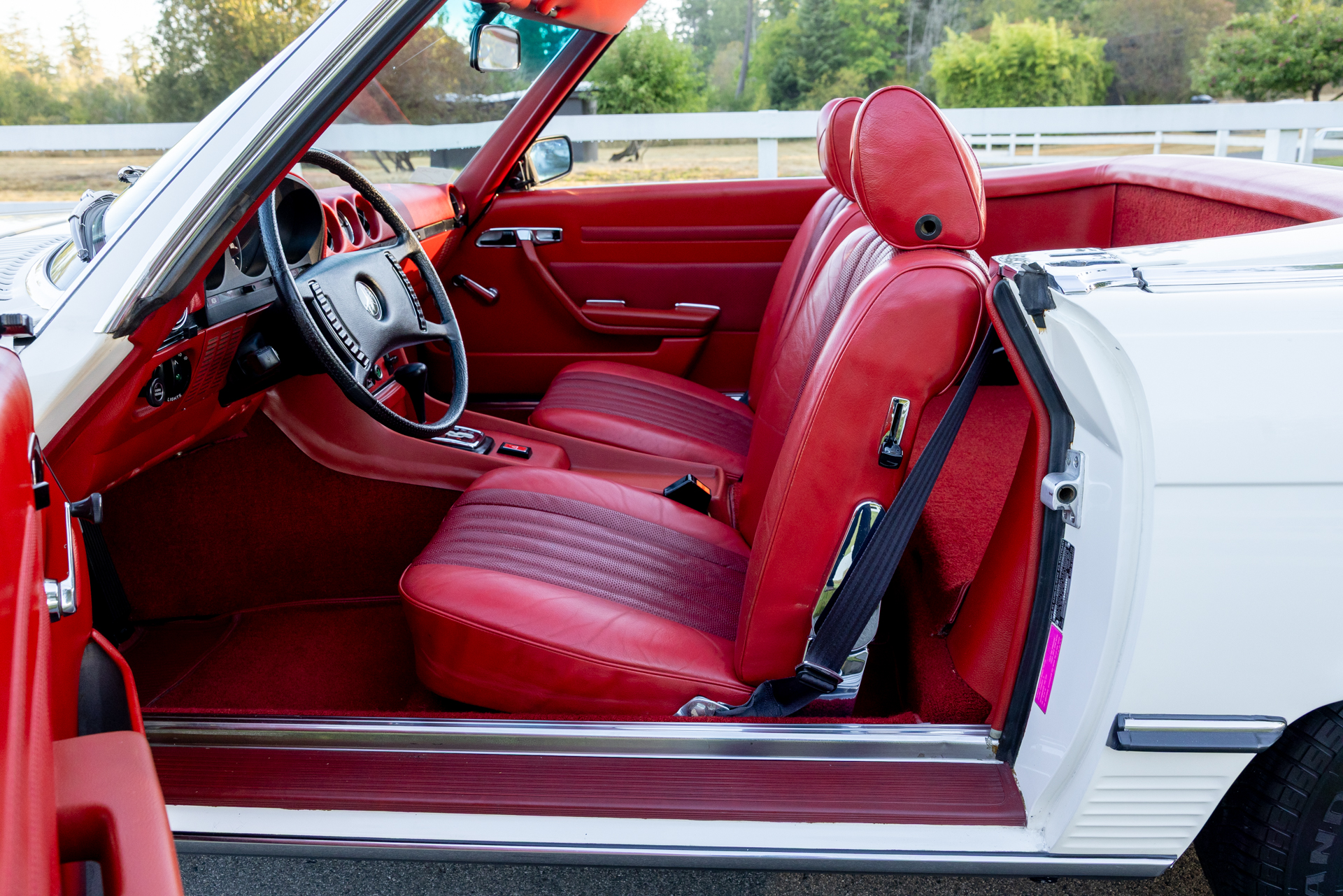 This 1972 Mercedes-Benz 350SL is finished in white over red leather, and it shows just 13k miles. The car is powered by a 4.5-liter V8 paired with a three-speed automatic transmission, and it has early-style bumpers in addition to 14″ steel wheels with covers. Its interior has manual windows, air conditioning, and a Becker Europa push-button radio