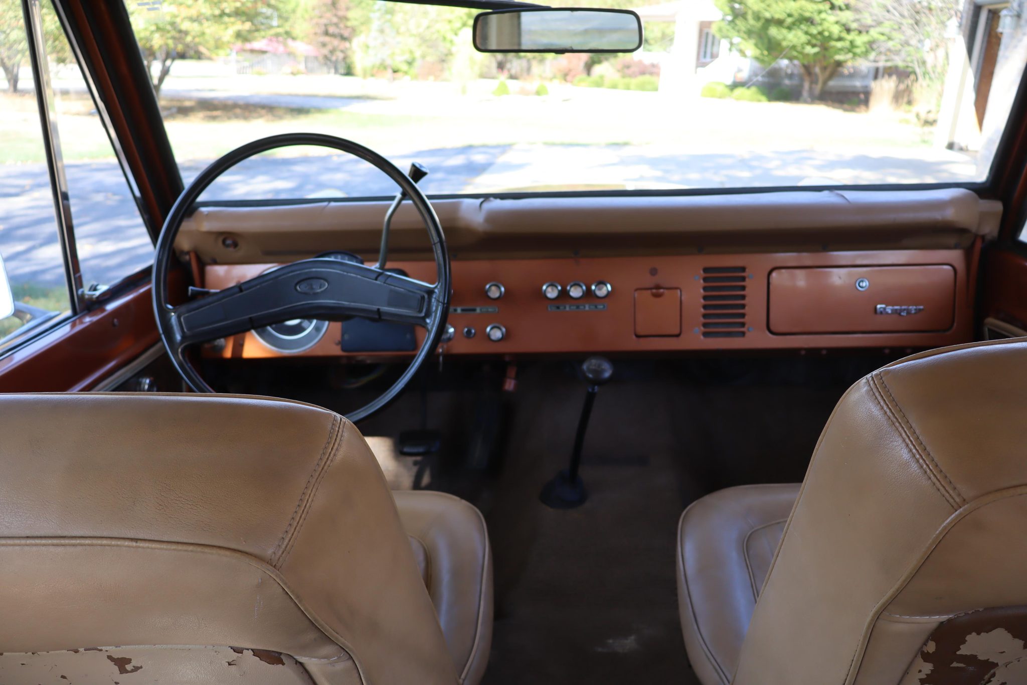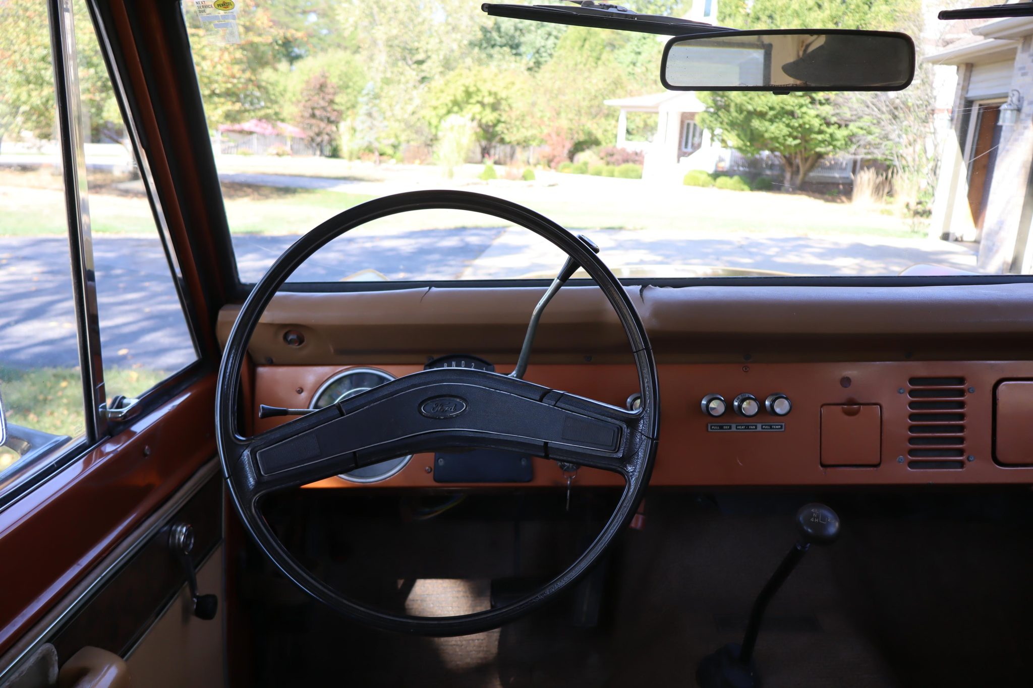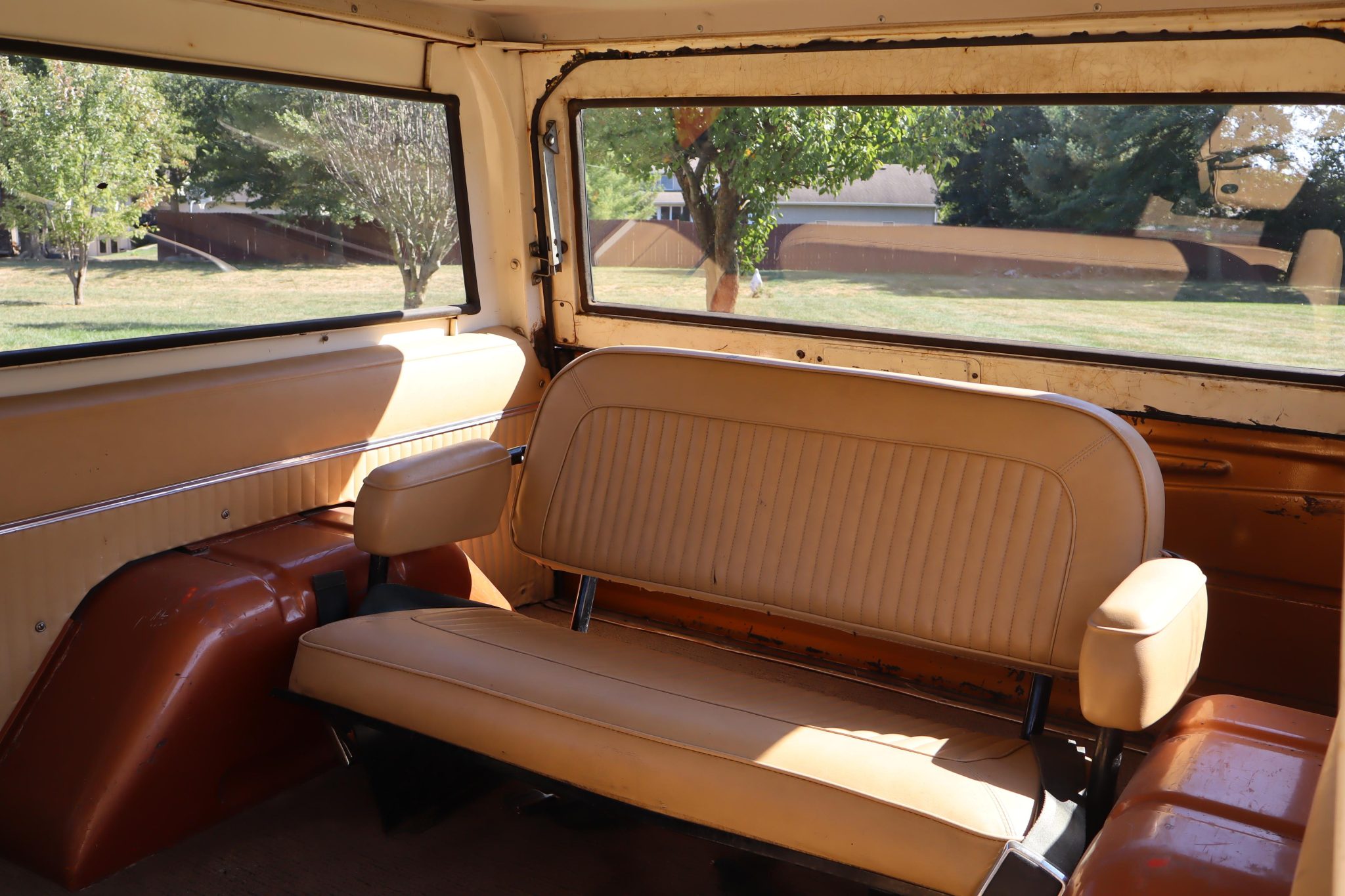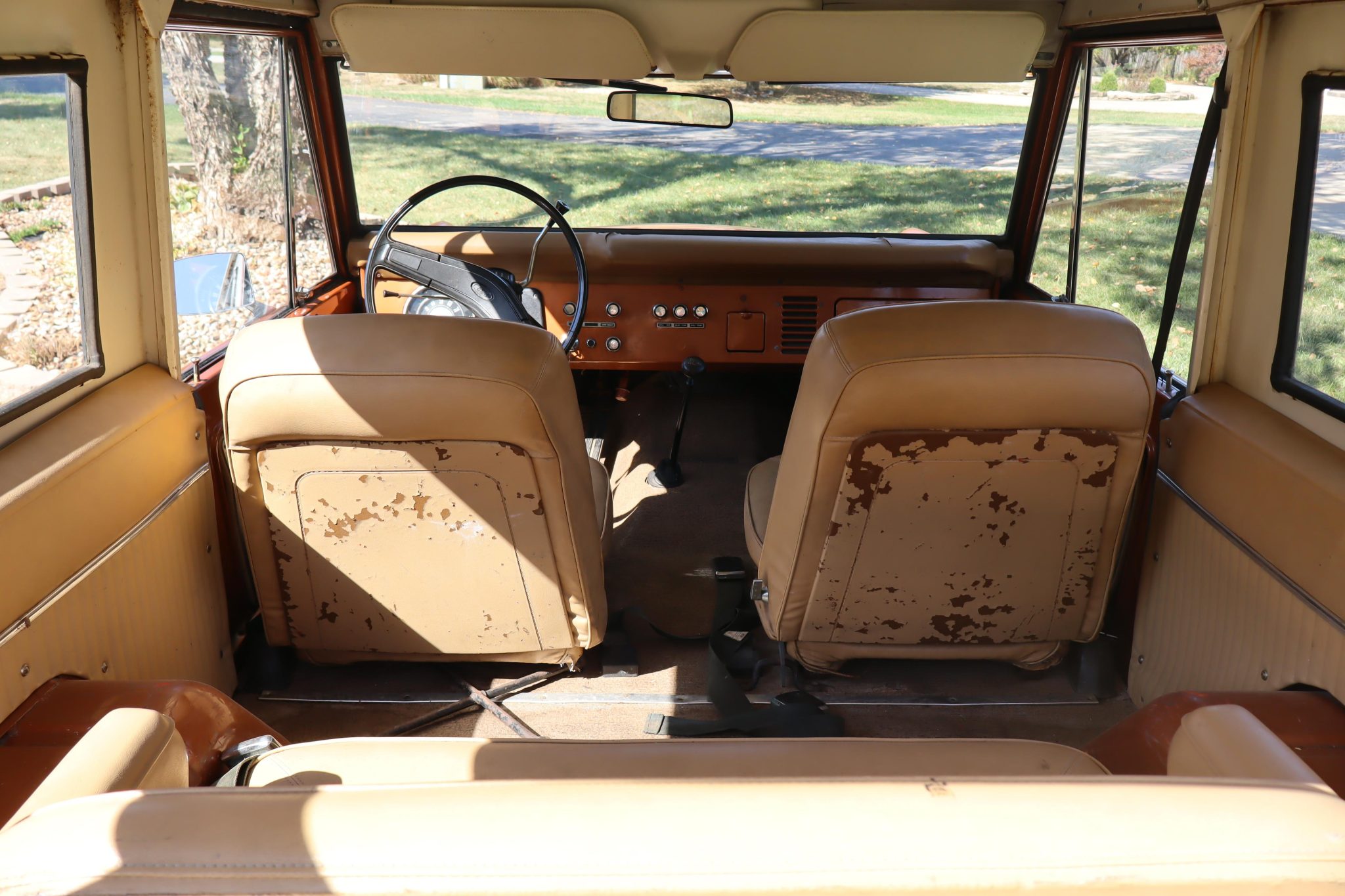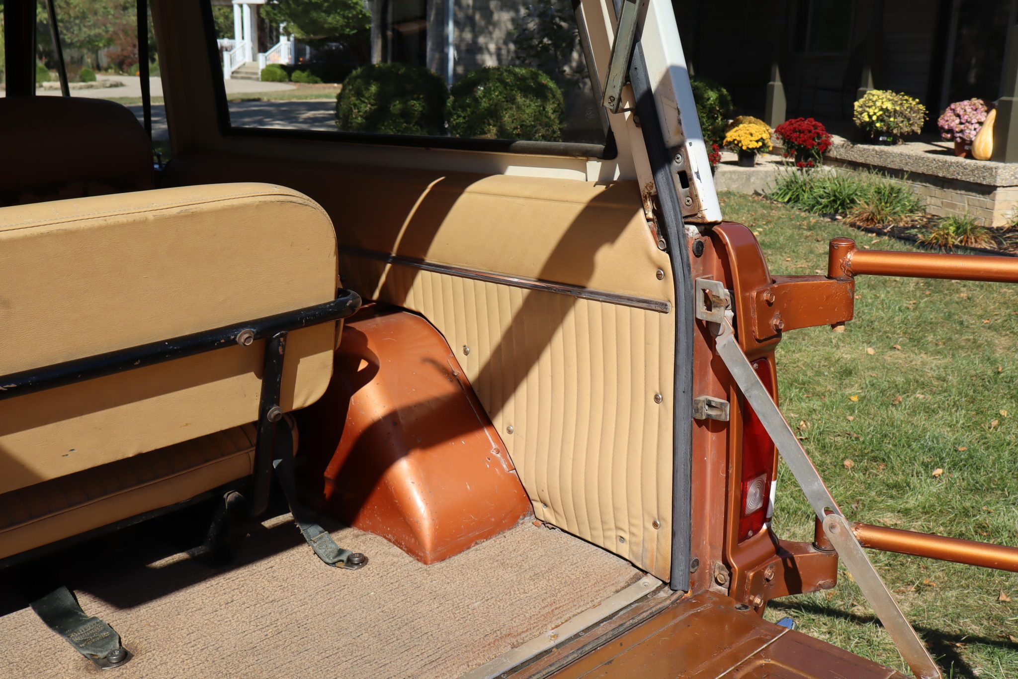 Subsequent refurbishment work included a reseal of the engine and transmission, and a refresh of the fuel, ignition, steering, and suspension systems. The water pump, alternator, timing assembly, engine wiring harness, and exhaust components were also replaced. The truck wears an older repaint in metallic orange over a beige vinyl interior, and it is powered by a 302ci V8 linked to a three-speed automatic transmission, a dual-range transfer case, and limited-slip front and rear differentials. Equipment includes an aluminum radiator, an auxiliary fuel tank, 15″ steel wheels, locking center hubs, power steering, a removable hardtop, a chrome front bumper, a tow ball, front bucket seats, and a rear bench.