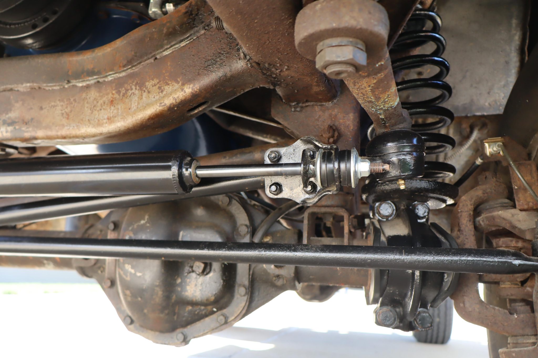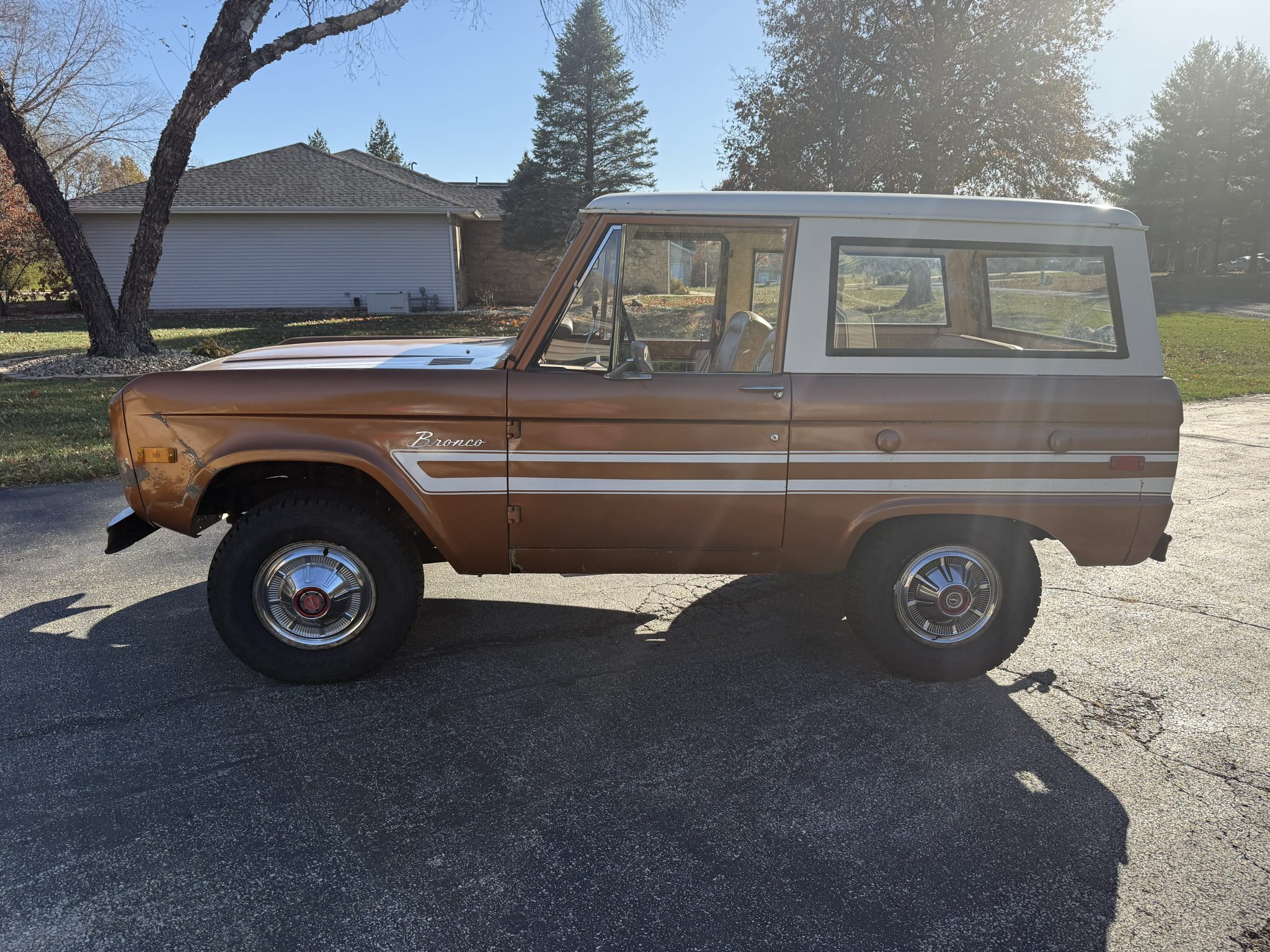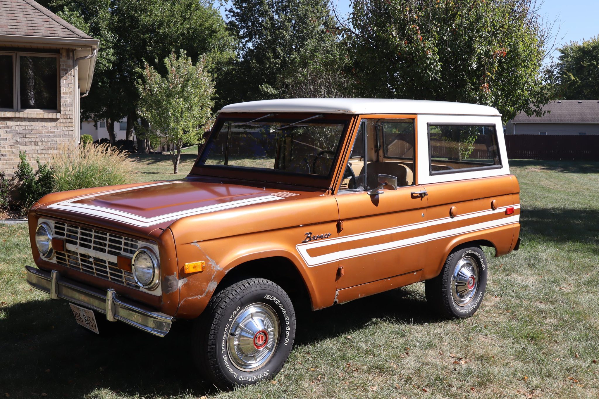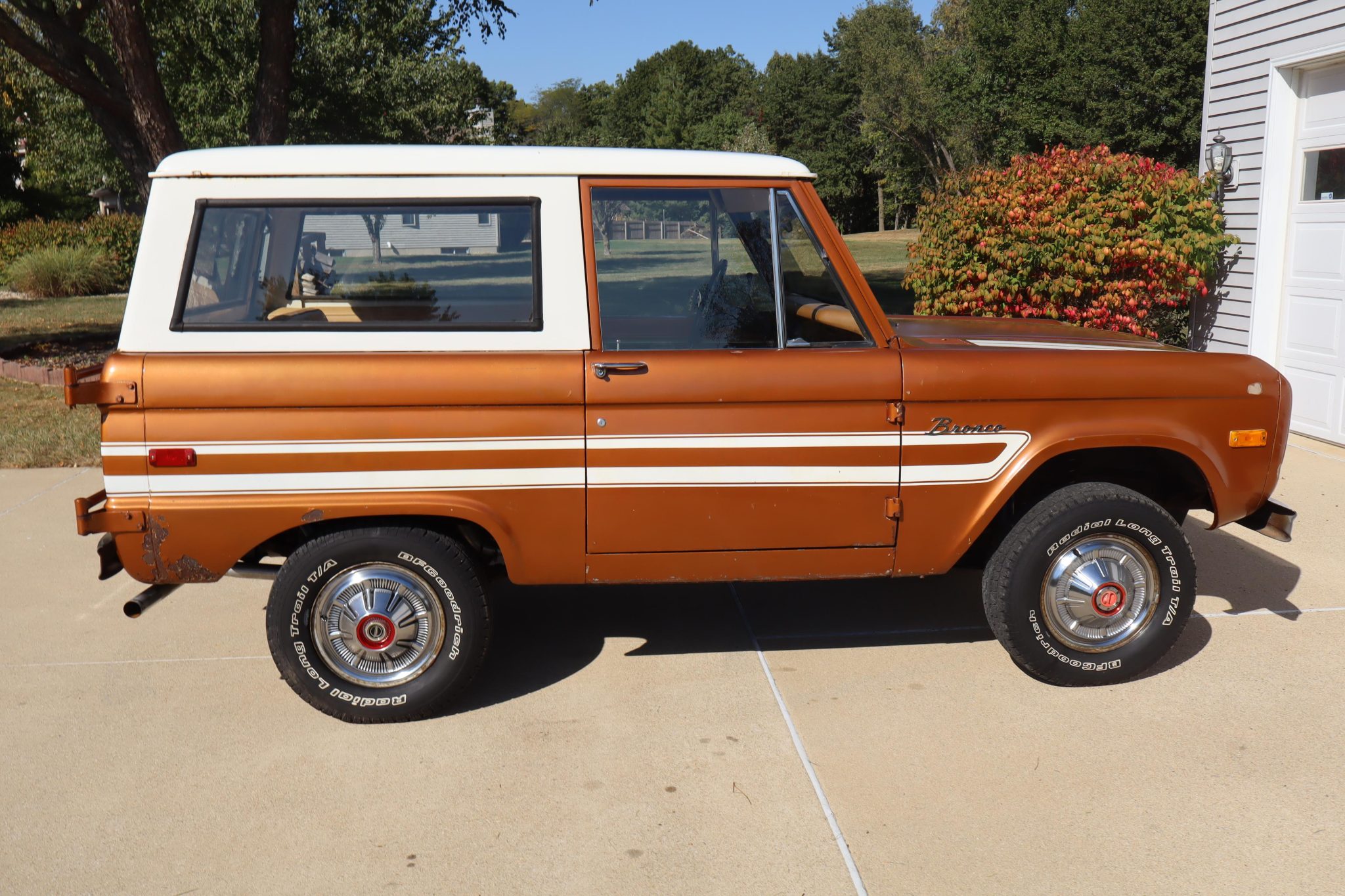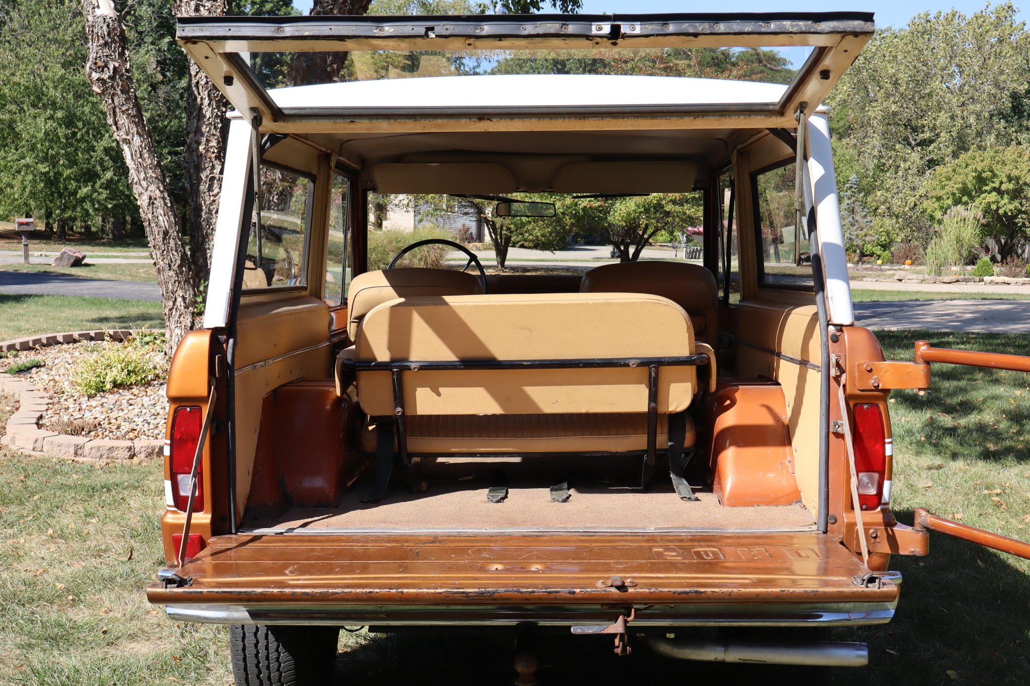 Subsequent refurbishment work included a reseal of the engine and transmission, and a refresh of the fuel, ignition, steering, and suspension systems. The water pump, alternator, timing assembly, engine wiring harness, and exhaust components were also replaced. The truck wears an older repaint in metallic orange over a beige vinyl interior, and it is powered by a 302ci V8 linked to a three-speed automatic transmission, a dual-range transfer case, and limited-slip front and rear differentials. Equipment includes an aluminum radiator, an auxiliary fuel tank, 15″ steel wheels, locking center hubs, power steering, a removable hardtop, a chrome front bumper, a tow ball, front bucket seats, and a rear bench.