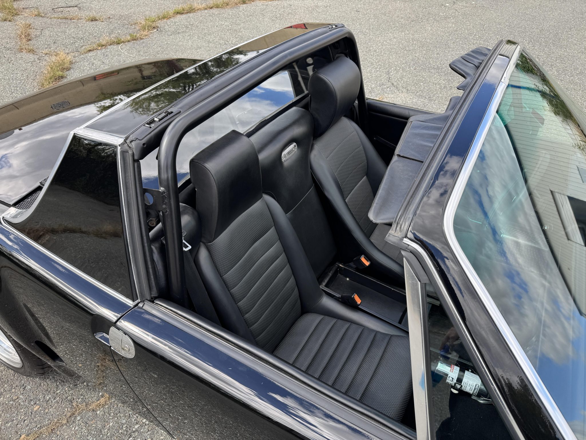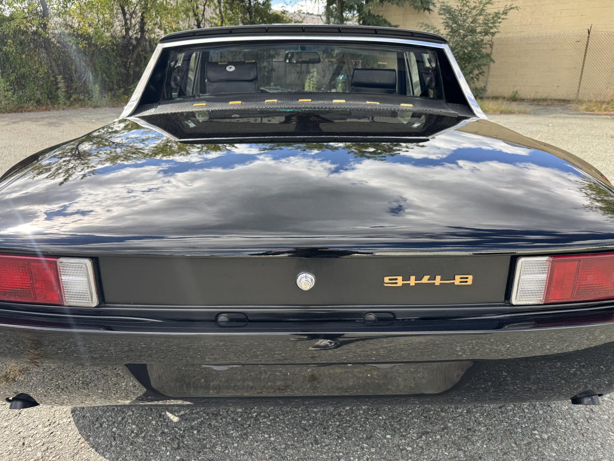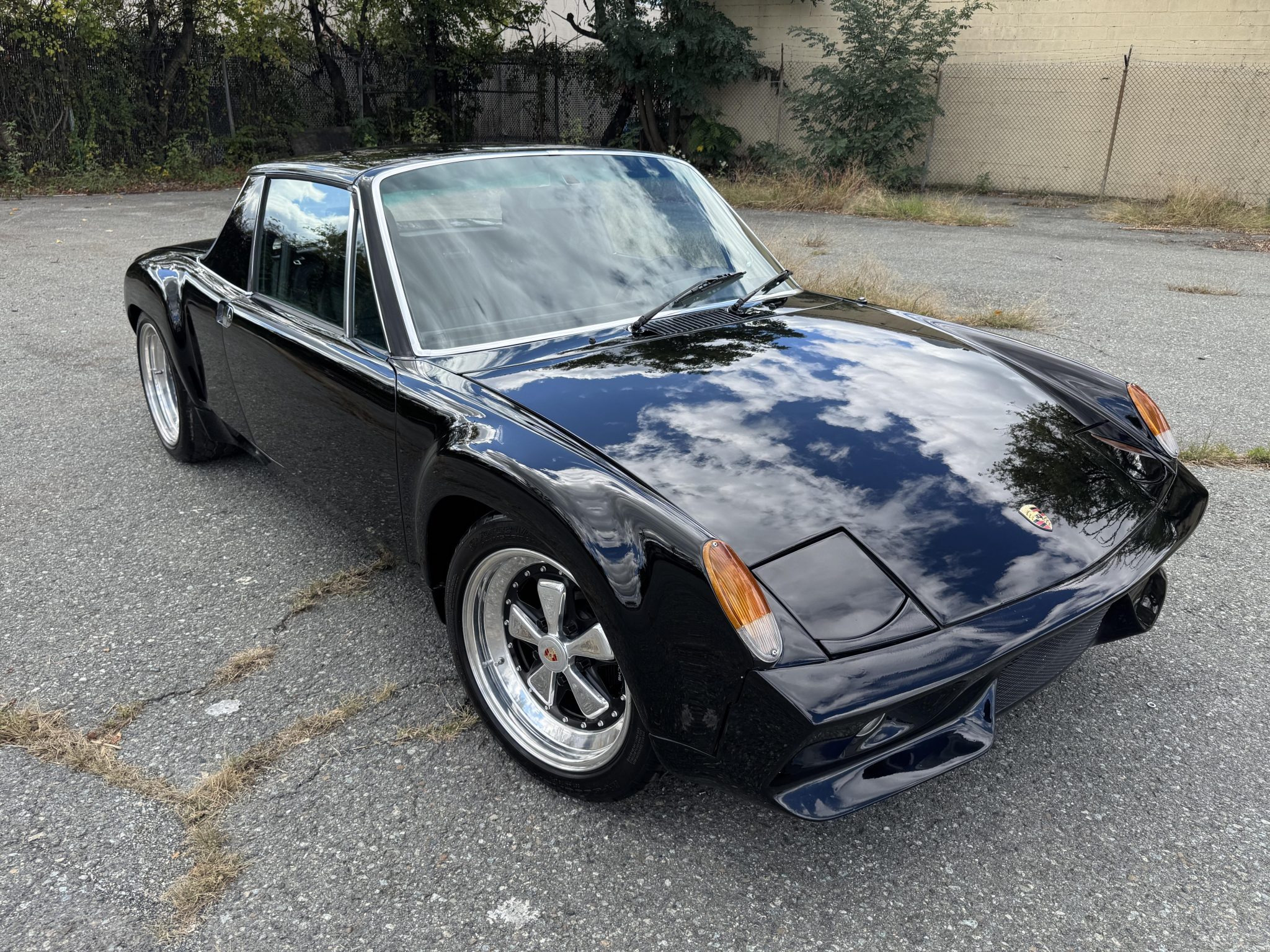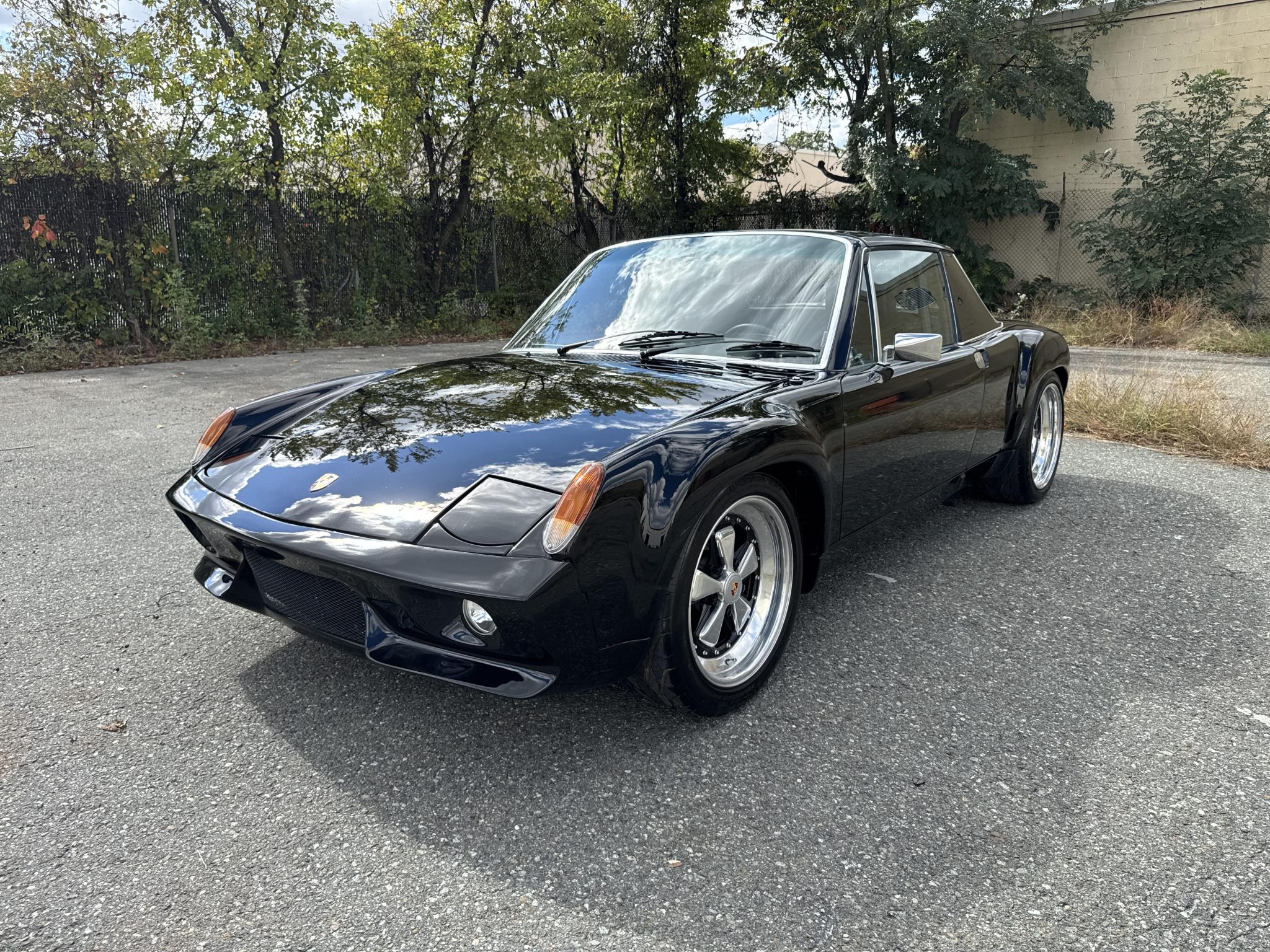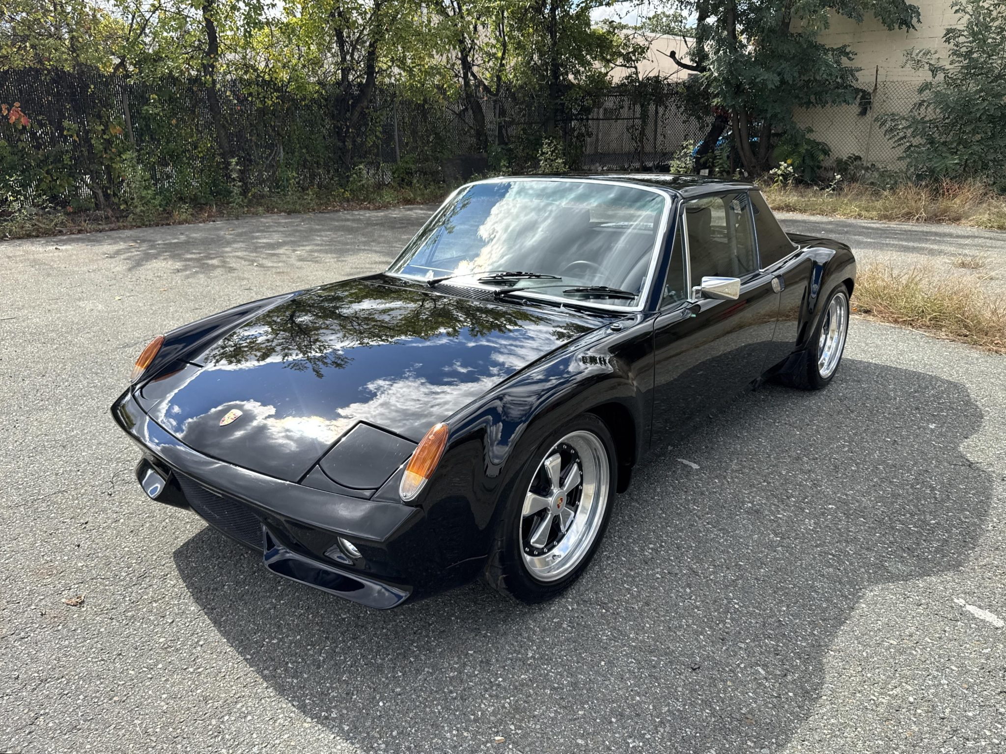 This 1974 Porsche 914 is powered by a 350ci General Motors V8 paired with a five-speed manual transaxle and is finished in Black over Black vinyl. Equipment includes multi-piece 17″ Fuchs-style wheels, a fiberglass 914/6 GT body kit, a removable Targa top, fog lights, a fixed-back BF Torino driver’s seat, a custom roll bar, and air conditioning.