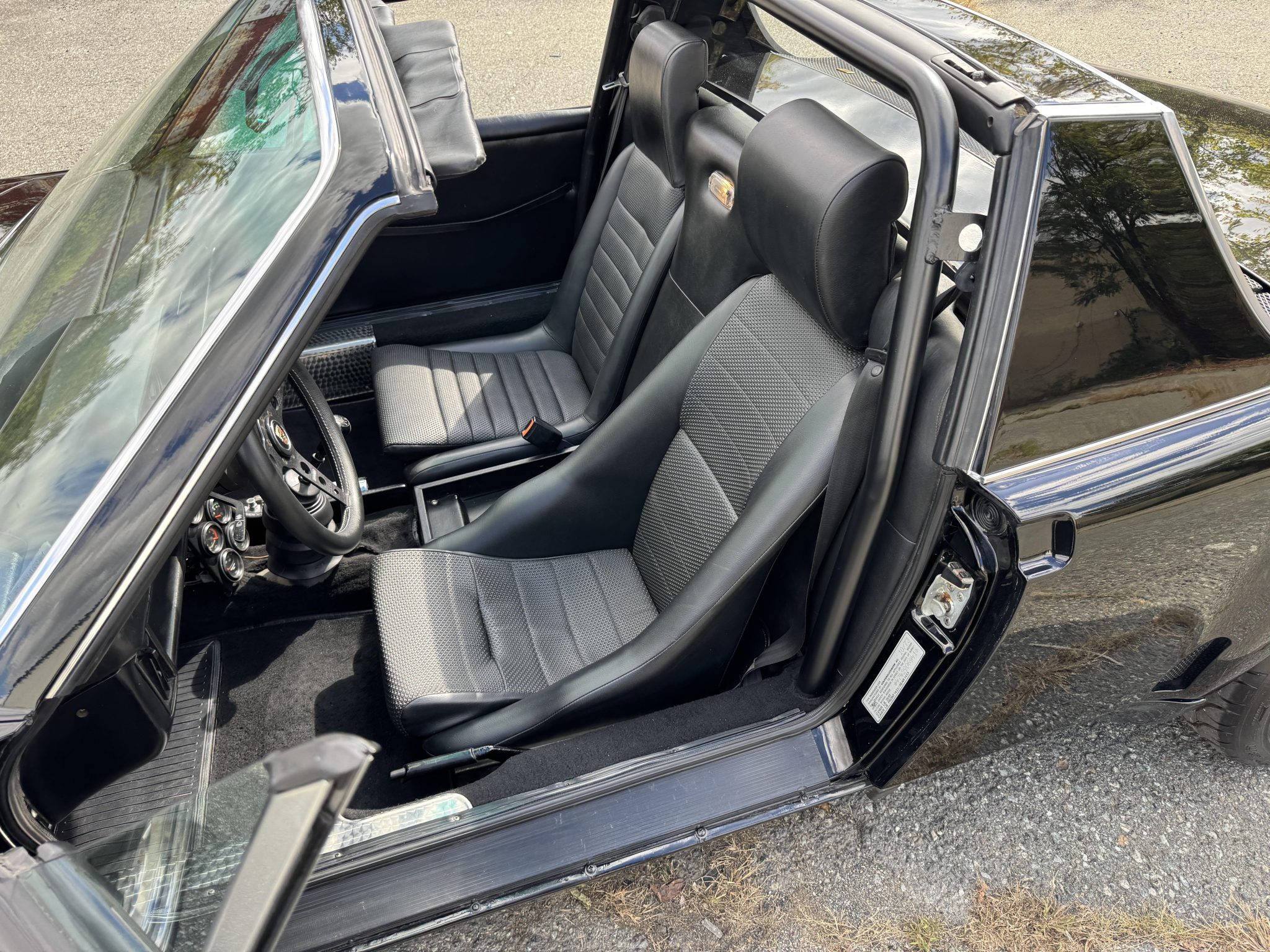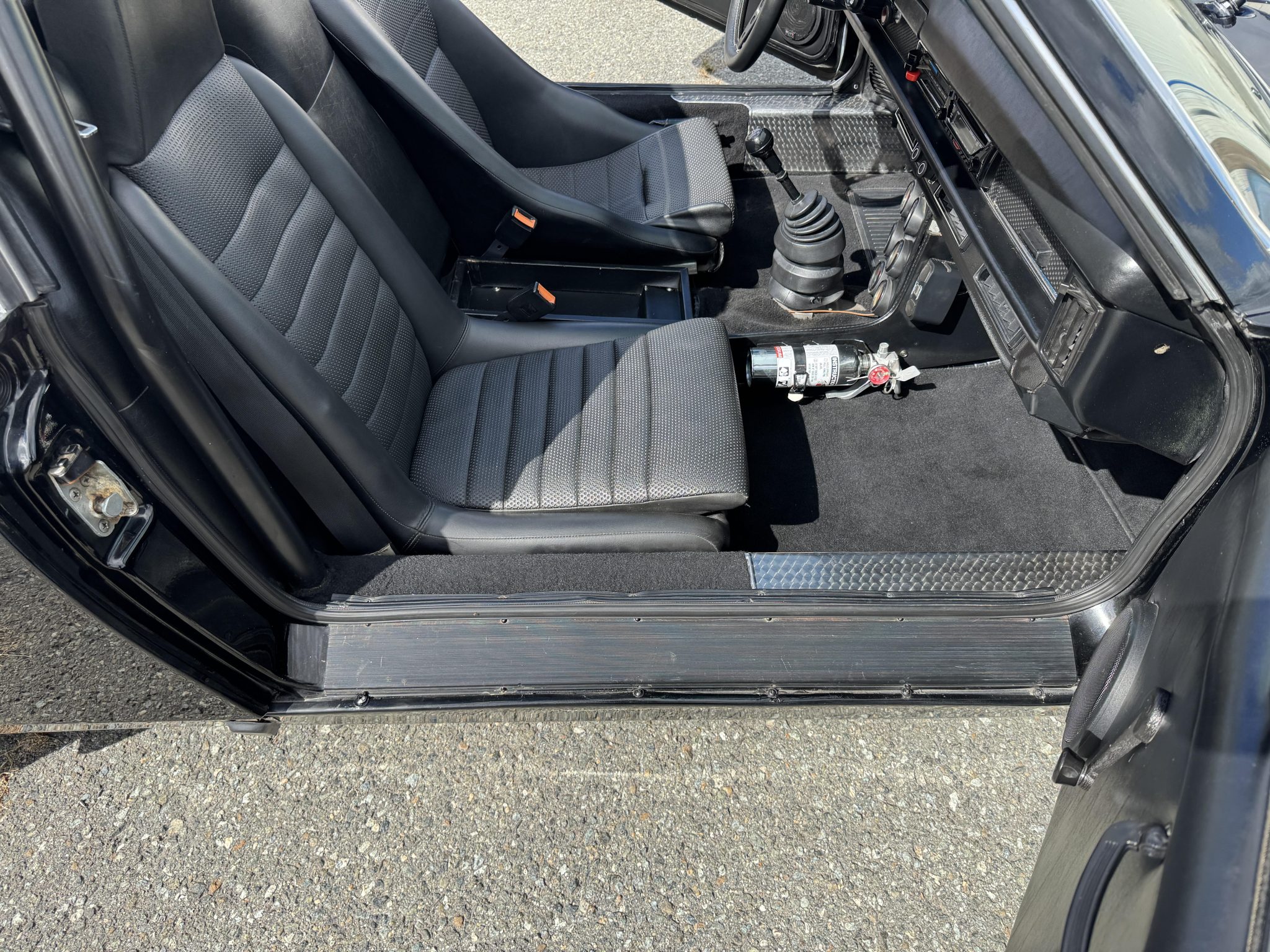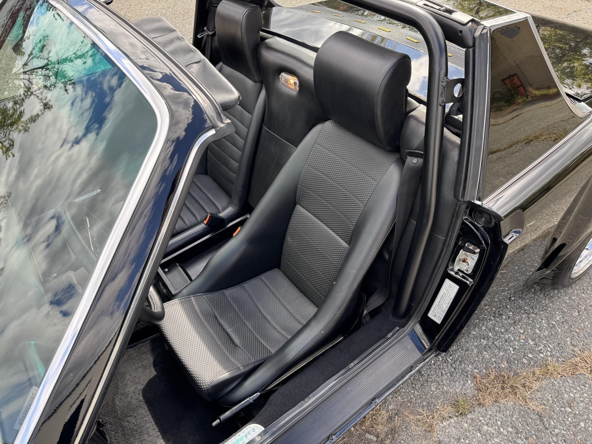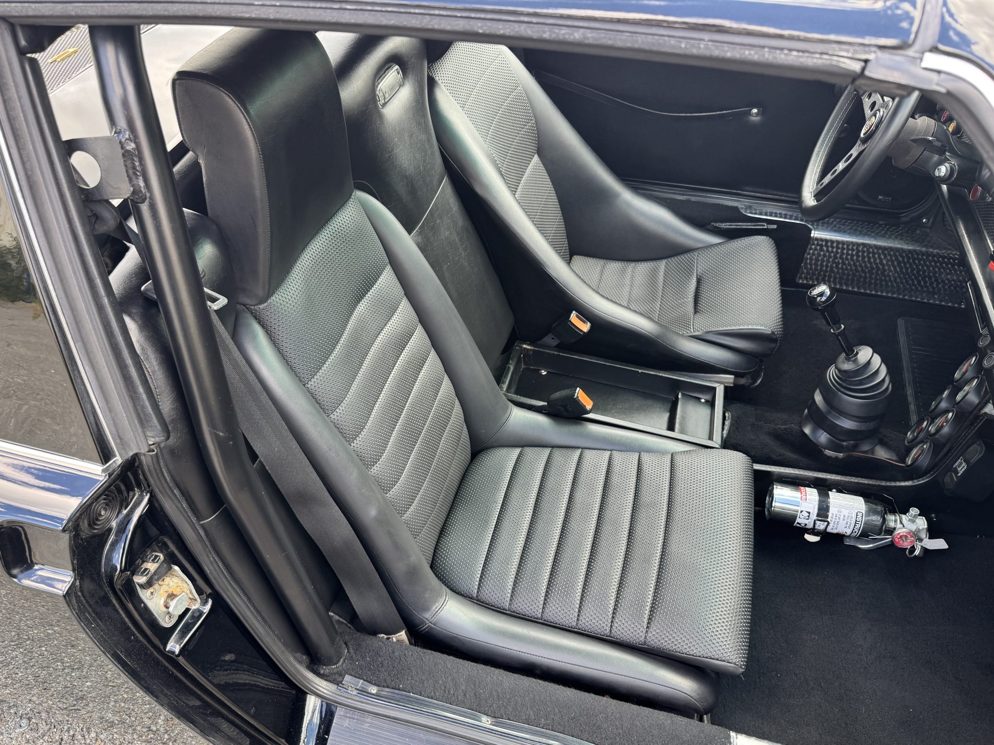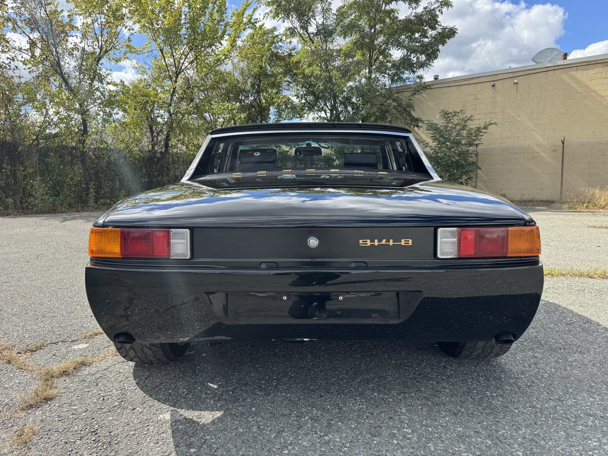 This 1974 Porsche 914 is powered by a 350ci General Motors V8 paired with a five-speed manual transaxle and is finished in Black over Black vinyl. Equipment includes multi-piece 17″ Fuchs-style wheels, a fiberglass 914/6 GT body kit, a removable Targa top, fog lights, a fixed-back BF Torino driver’s seat, a custom roll bar, and air conditioning.