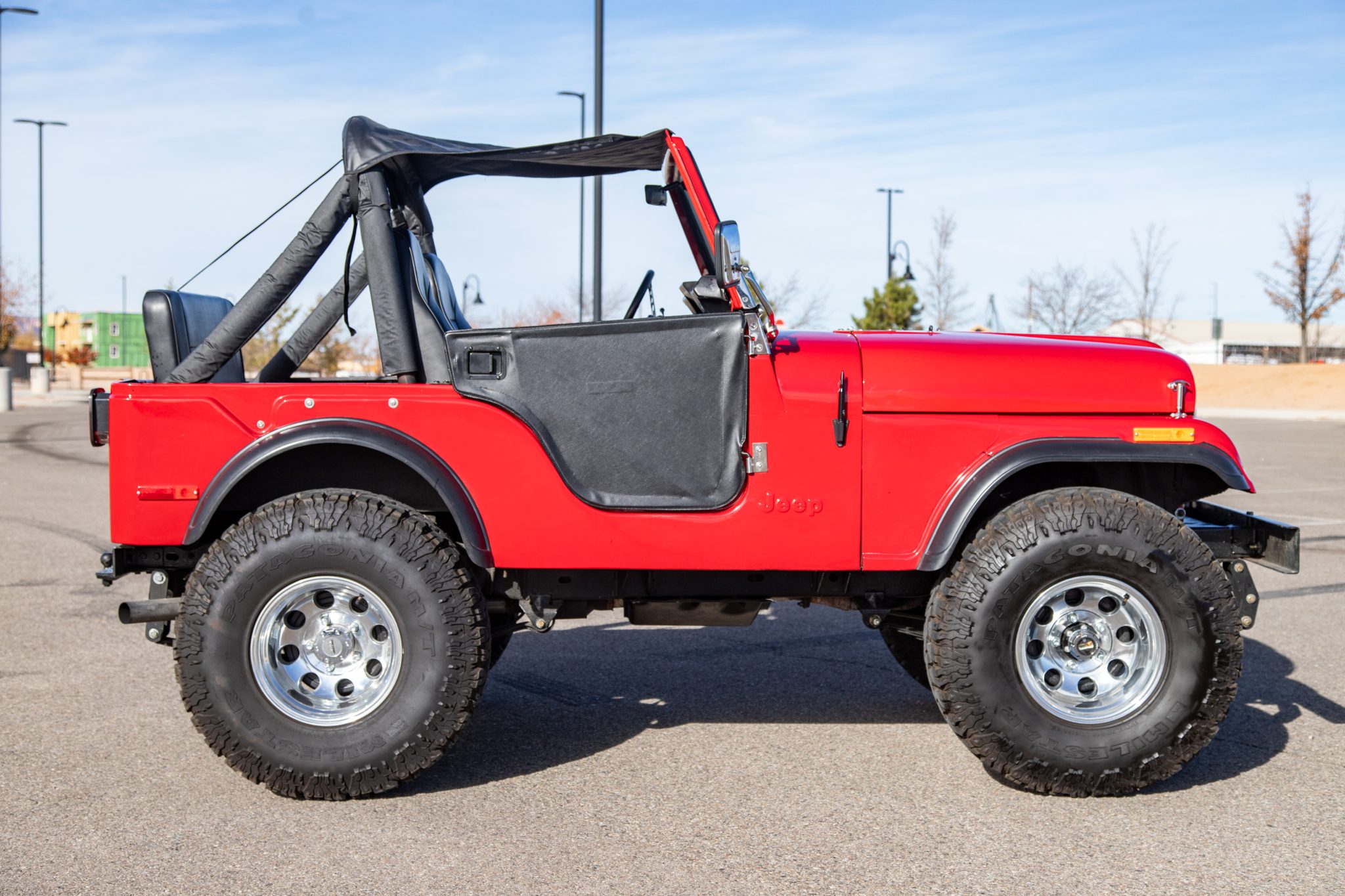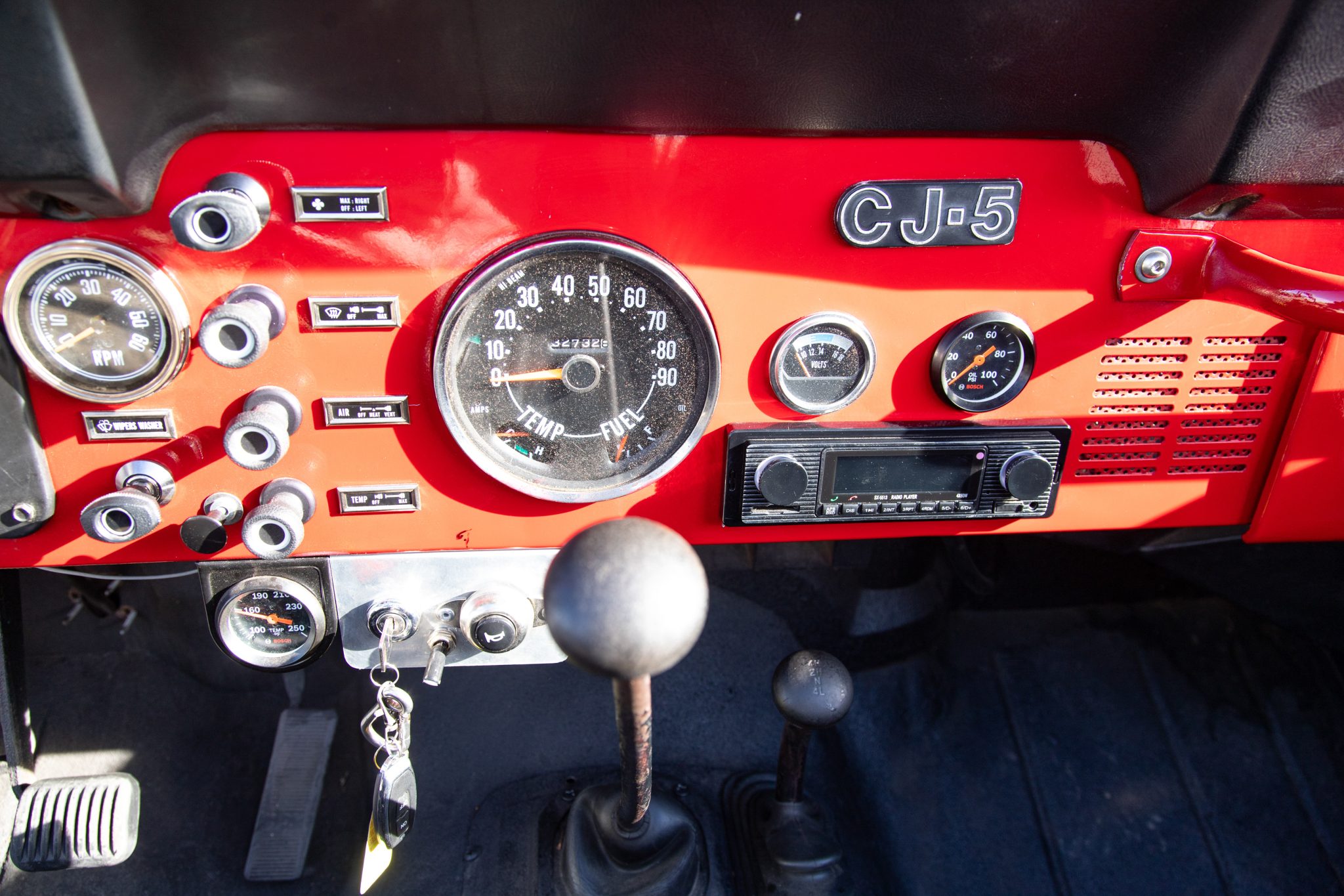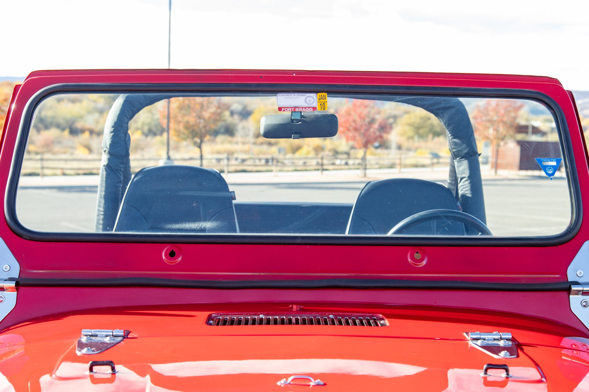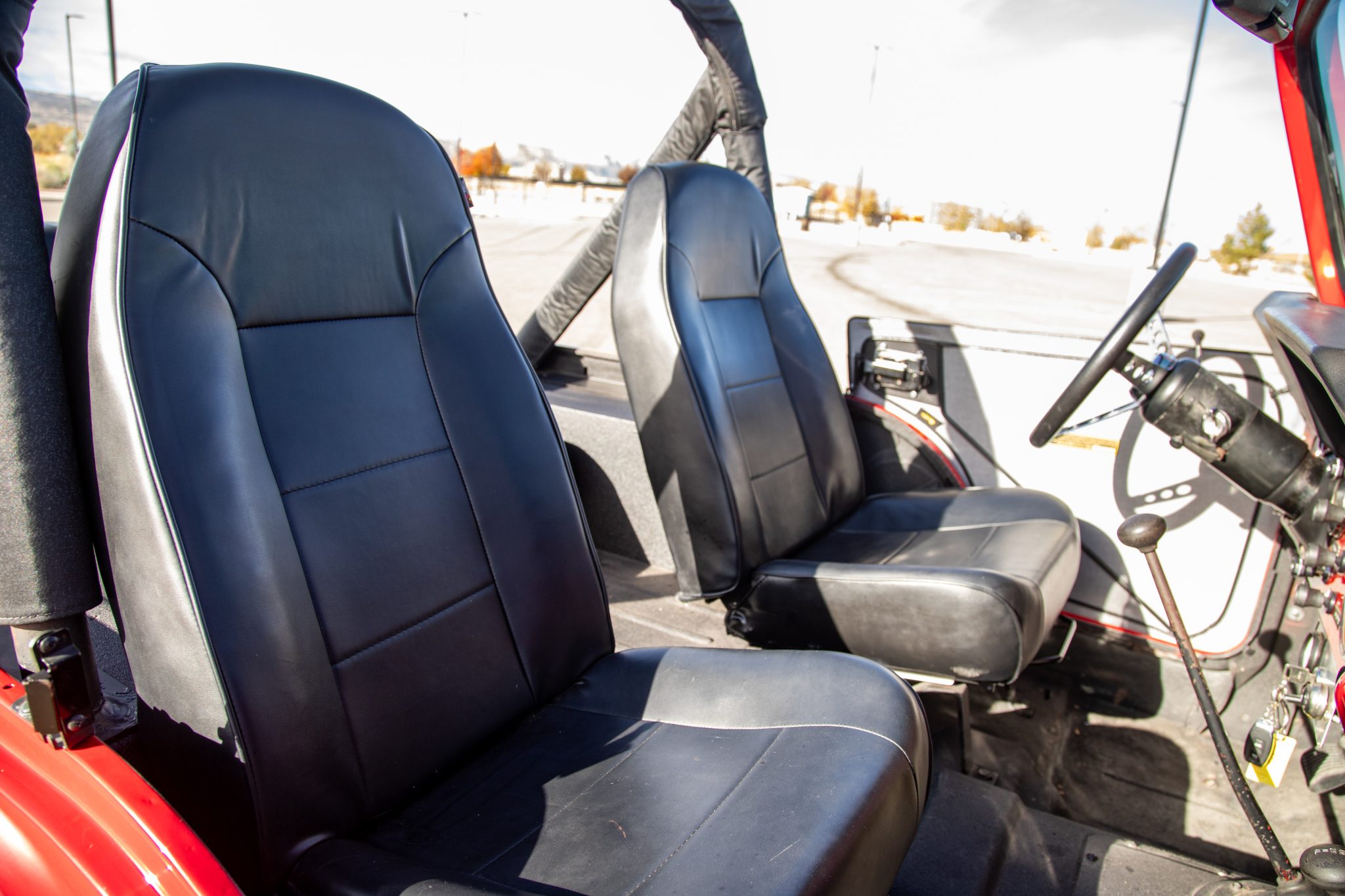 Work since then has involved changing the fluids, installing an Edelbrock carburetor, and replacing the windshield frame, wiper motor, alternator, battery, engine cooling fan controller, and oil pan gasket. Finished in red over black vinyl, the truck is powered by a rebuilt 304ci V8 linked to a three-speed manual transmission and a dual-range transfer case. It rolls on 15″ Pro Comp wheels wrapped in 35″ tires and is further equipped with a suspension lift, Rugged Ridge manually locking front hubs, power steering and brakes, a Bestop bikini-style top, removable vinyl doors, LED taillights, a padded roll bar, a Bluetooth-capable head unit, and a custom exhaust system.