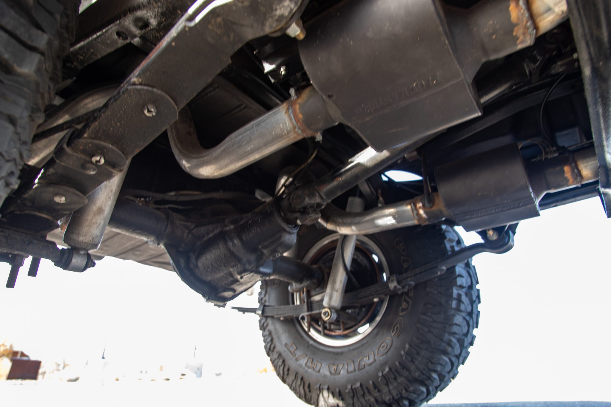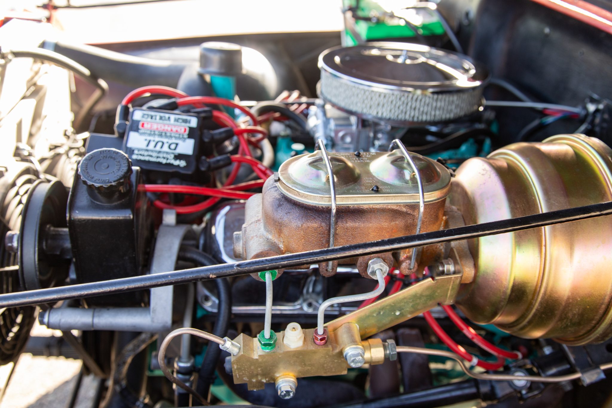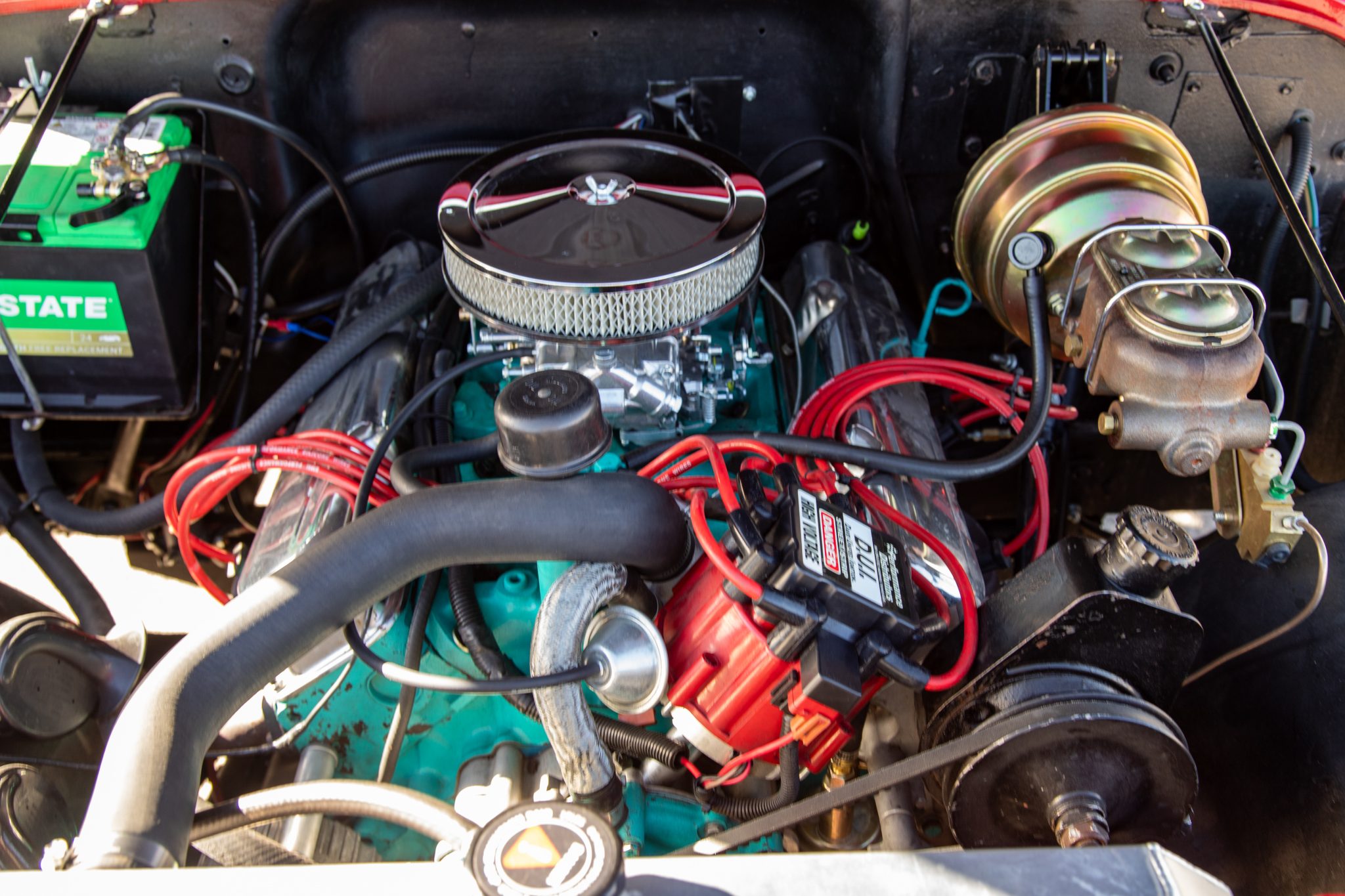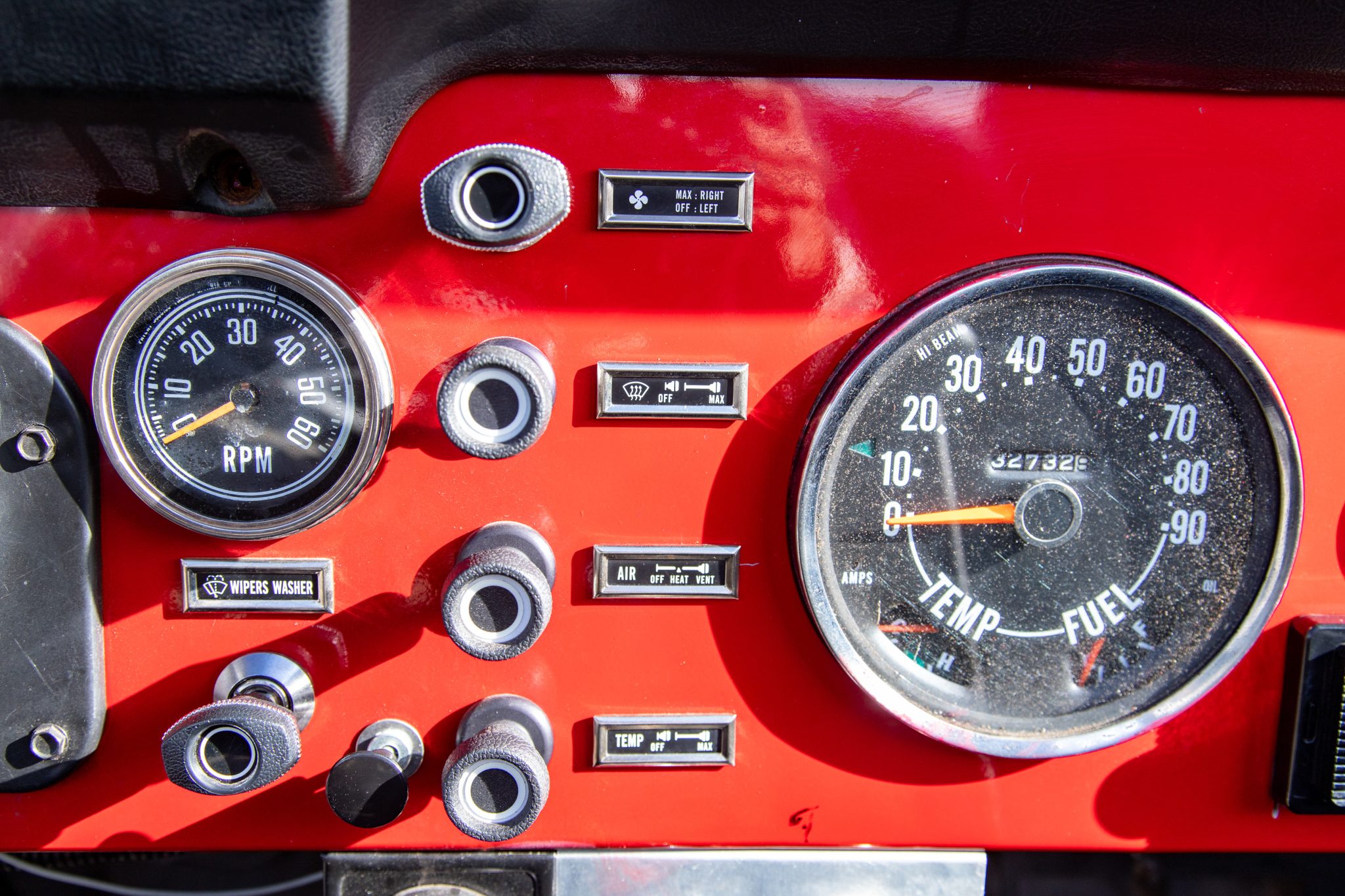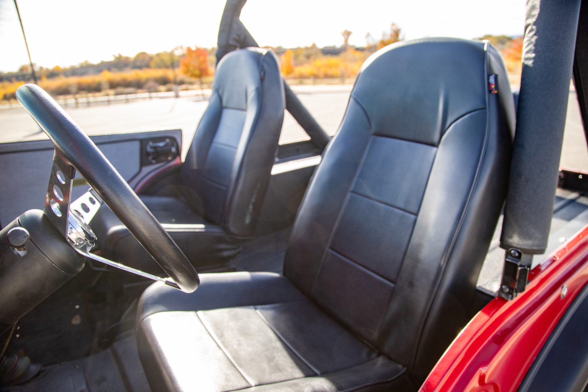 Work since then has involved changing the fluids, installing an Edelbrock carburetor, and replacing the windshield frame, wiper motor, alternator, battery, engine cooling fan controller, and oil pan gasket. Finished in red over black vinyl, the truck is powered by a rebuilt 304ci V8 linked to a three-speed manual transmission and a dual-range transfer case. It rolls on 15″ Pro Comp wheels wrapped in 35″ tires and is further equipped with a suspension lift, Rugged Ridge manually locking front hubs, power steering and brakes, a Bestop bikini-style top, removable vinyl doors, LED taillights, a padded roll bar, a Bluetooth-capable head unit, and a custom exhaust system.