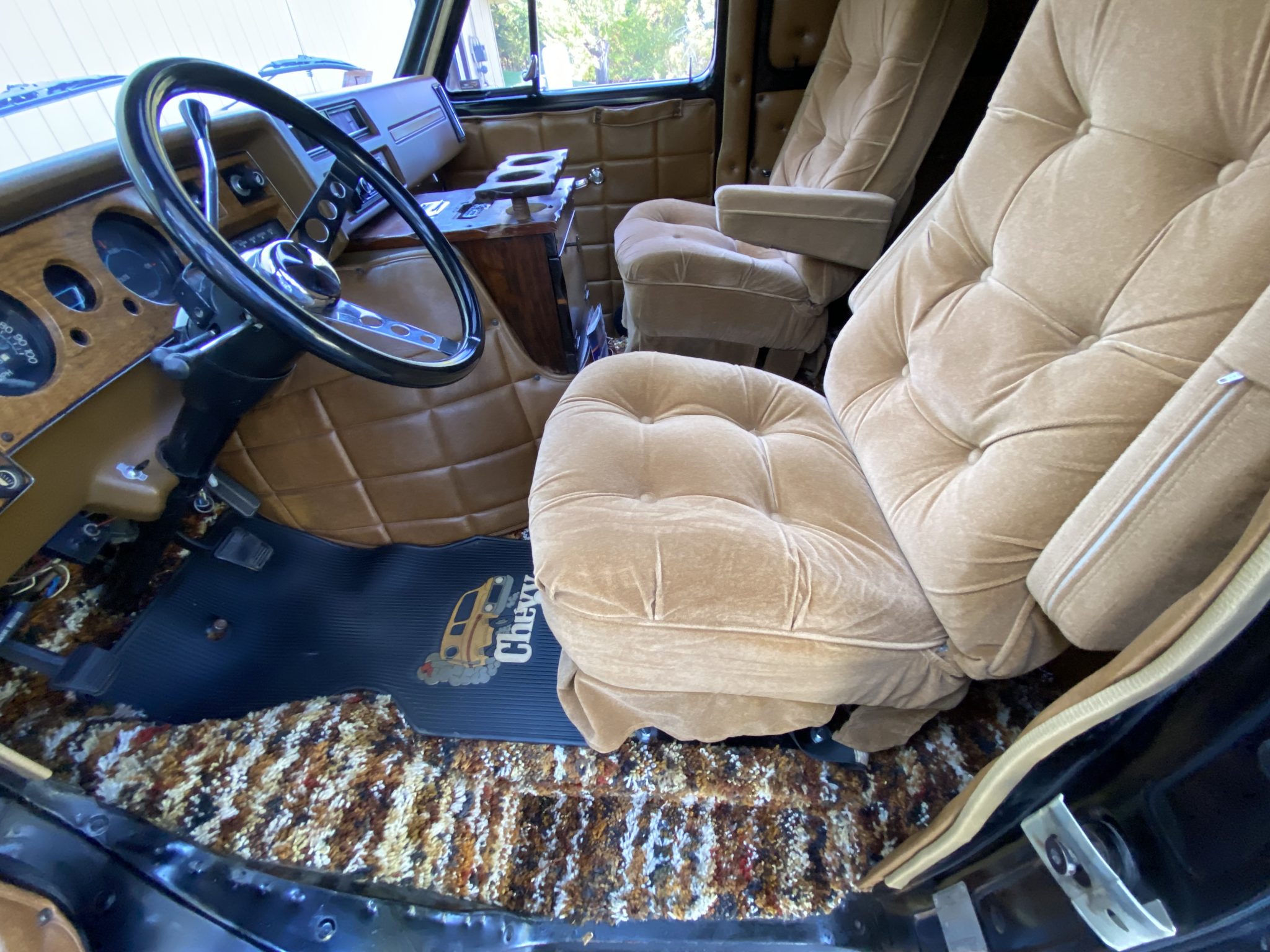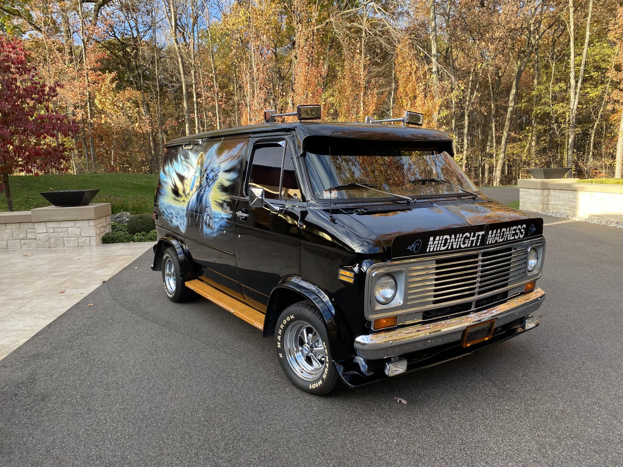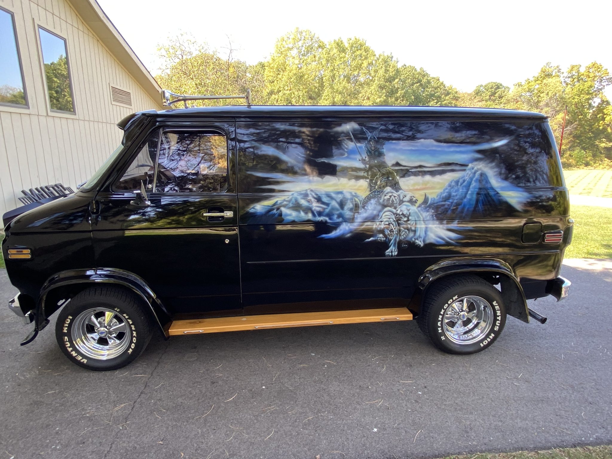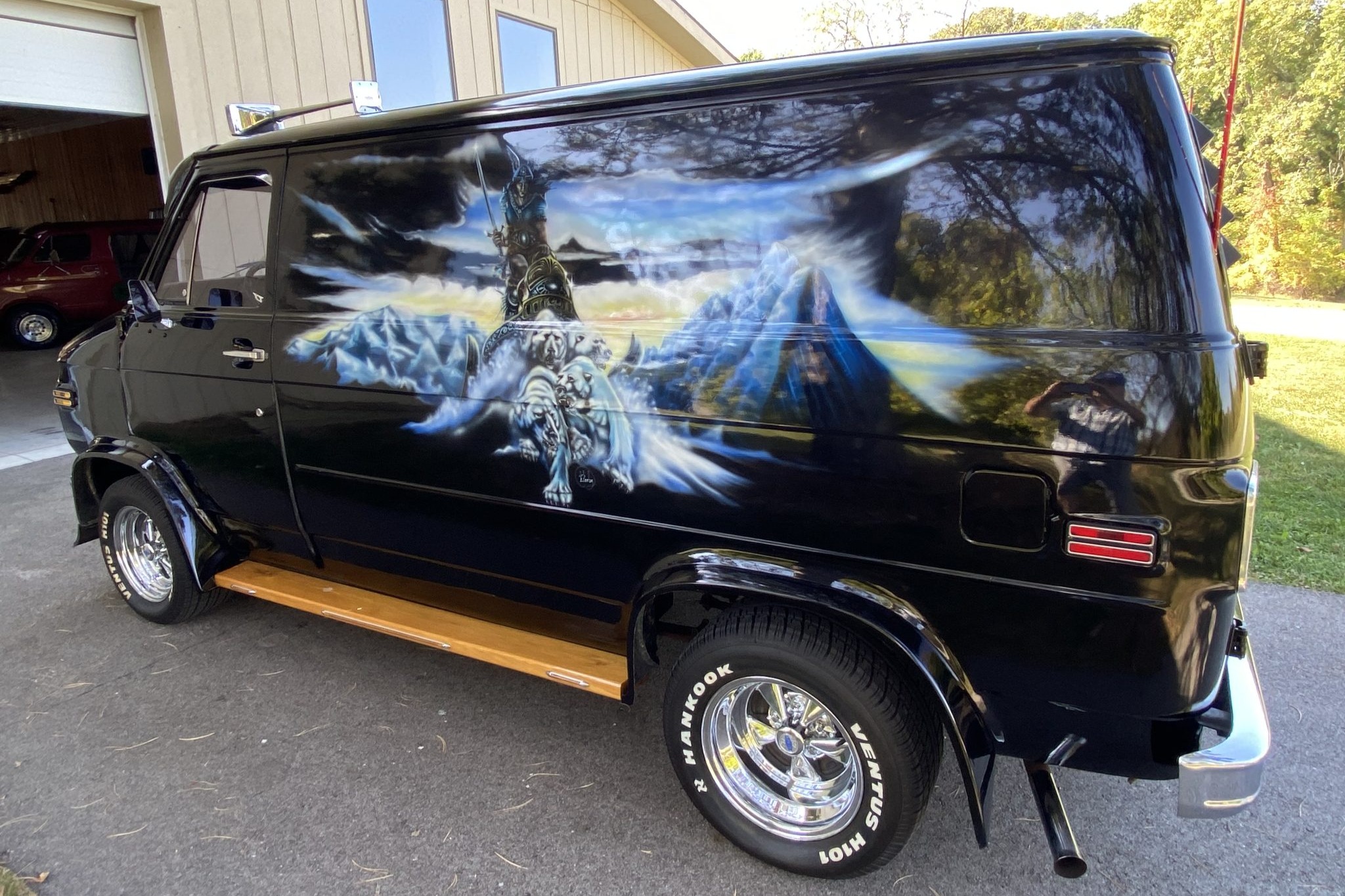 This 1977 Chevrolet G20 van was subsequently customized with airbrushed fantasy-themed murals that depict polar bears and mythical warriors. Additional work under current ownership also included installing a 350ci V8, an Edelbrock carburetor, 15″ Cragar wheels, as well as outfitting the interior with shag carpeting and aftermarket stereo components. Additional features include wood running boards, a front lip spoiler, a windshield visor, swing-out rear double-doors, captain’s chairs, wraparound bench seating, a table, and a refrigerator.